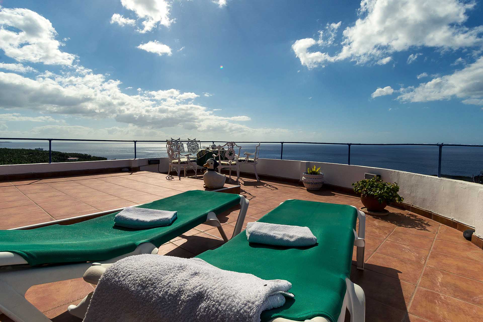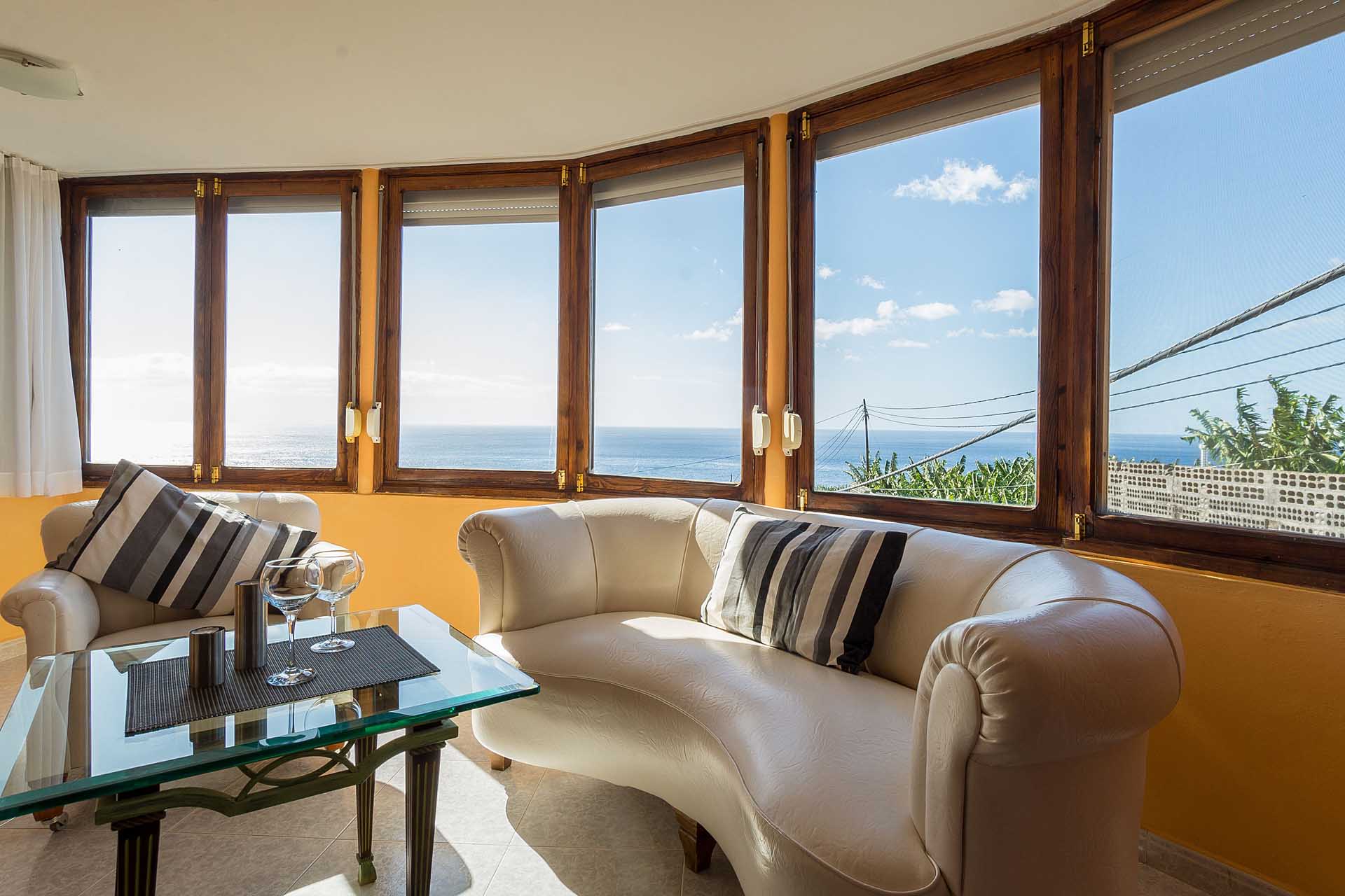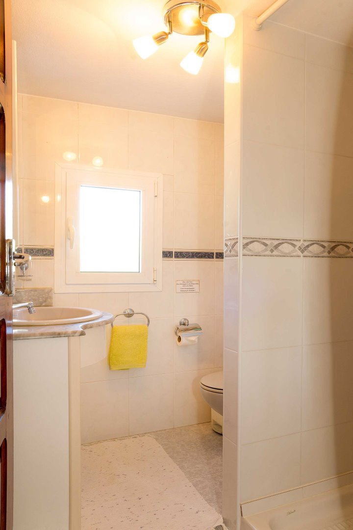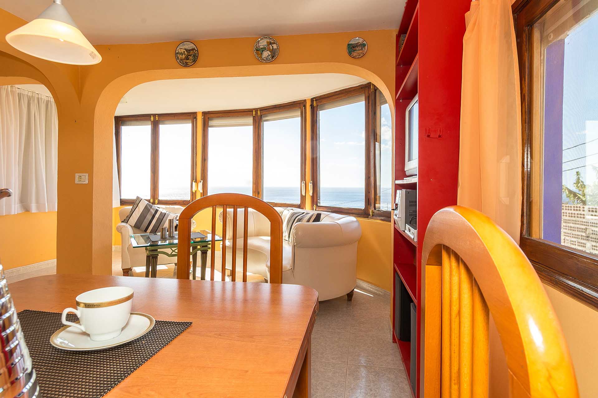 Sie ist im 1. OG aufgeteilt in ein Wohnzimmer mit Essplatz, eine Küche, zwei Schlafzimmer, ein Tageslichtbad und eine überdachte Terrasse sowie im 2. OG in einen Wintergarten (oder 2. Wohnzimmer) mit Zugang zur großen, teilweise überdachten Dachterrasse mit fantastischem Meerblick. Sie wurde bisher ausschließlich als Ferienwohnung genutzt, kann aber auch dauerhaft bewohnt werden.