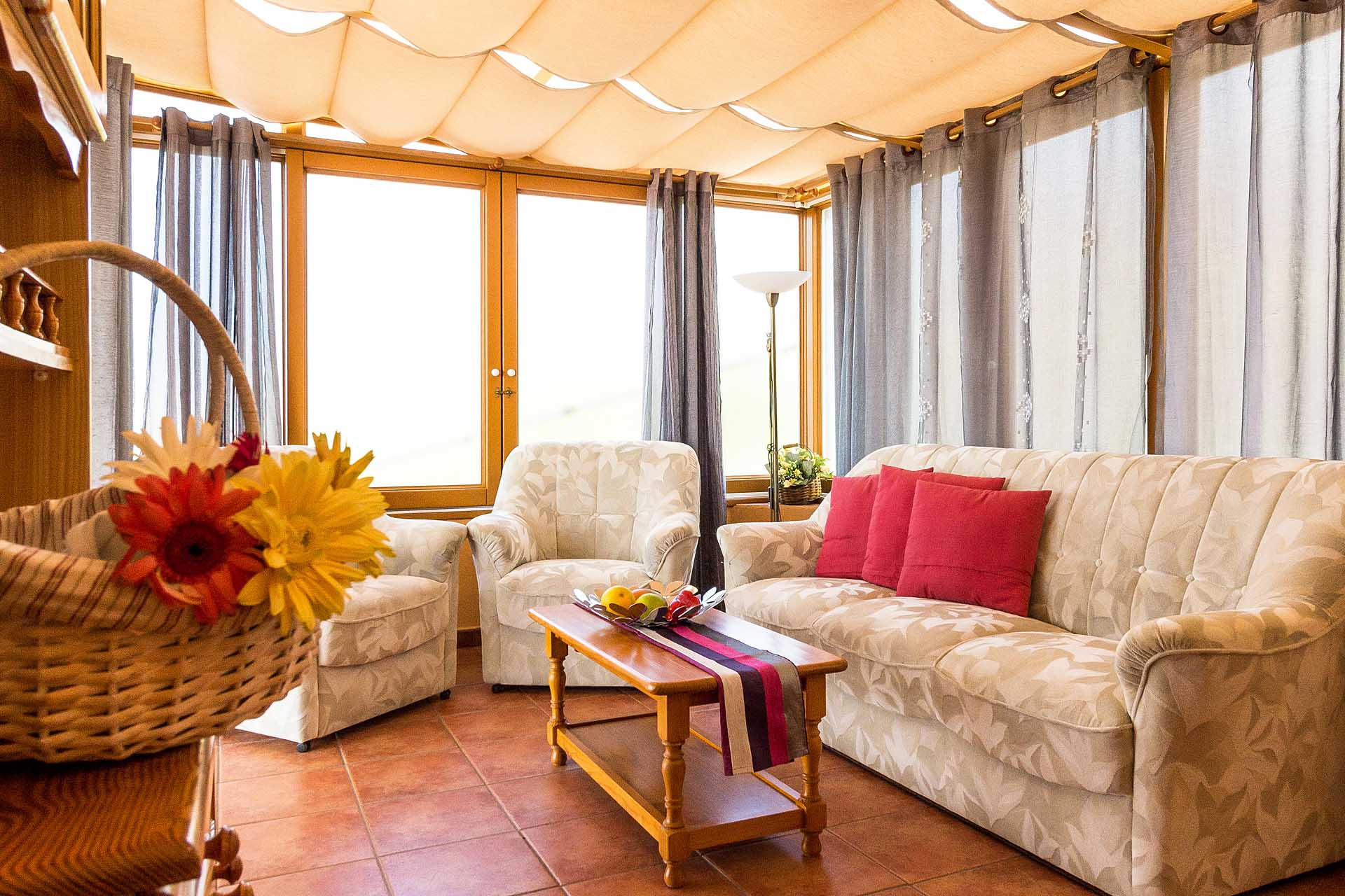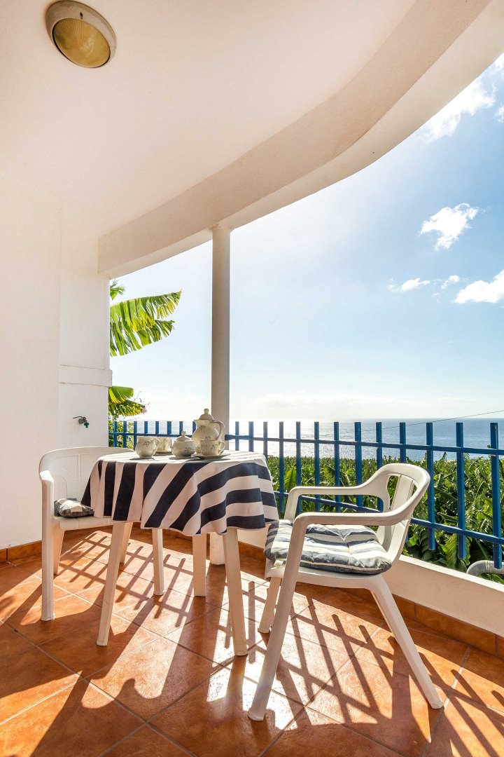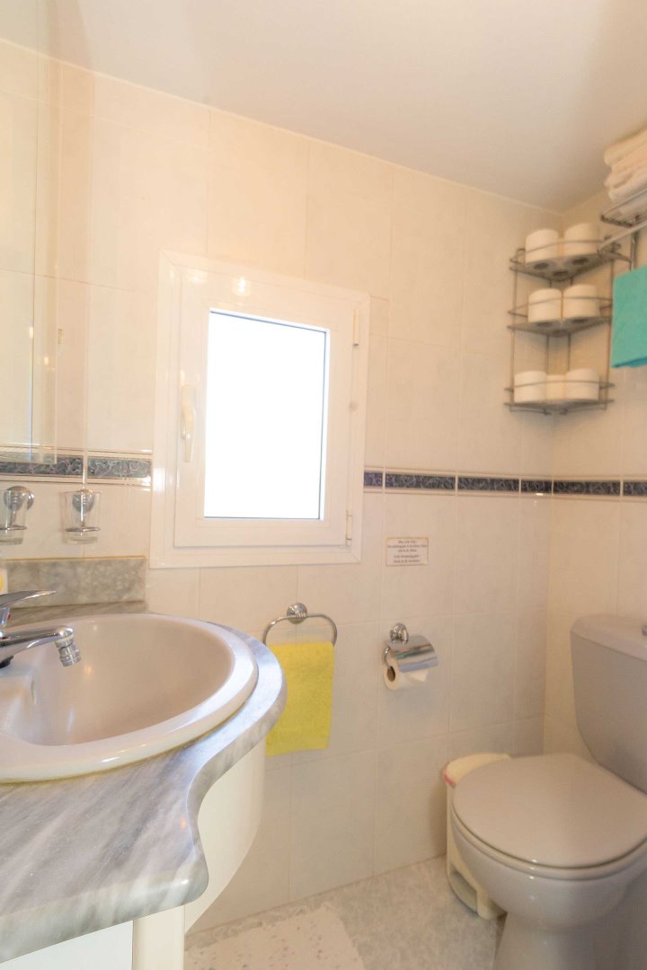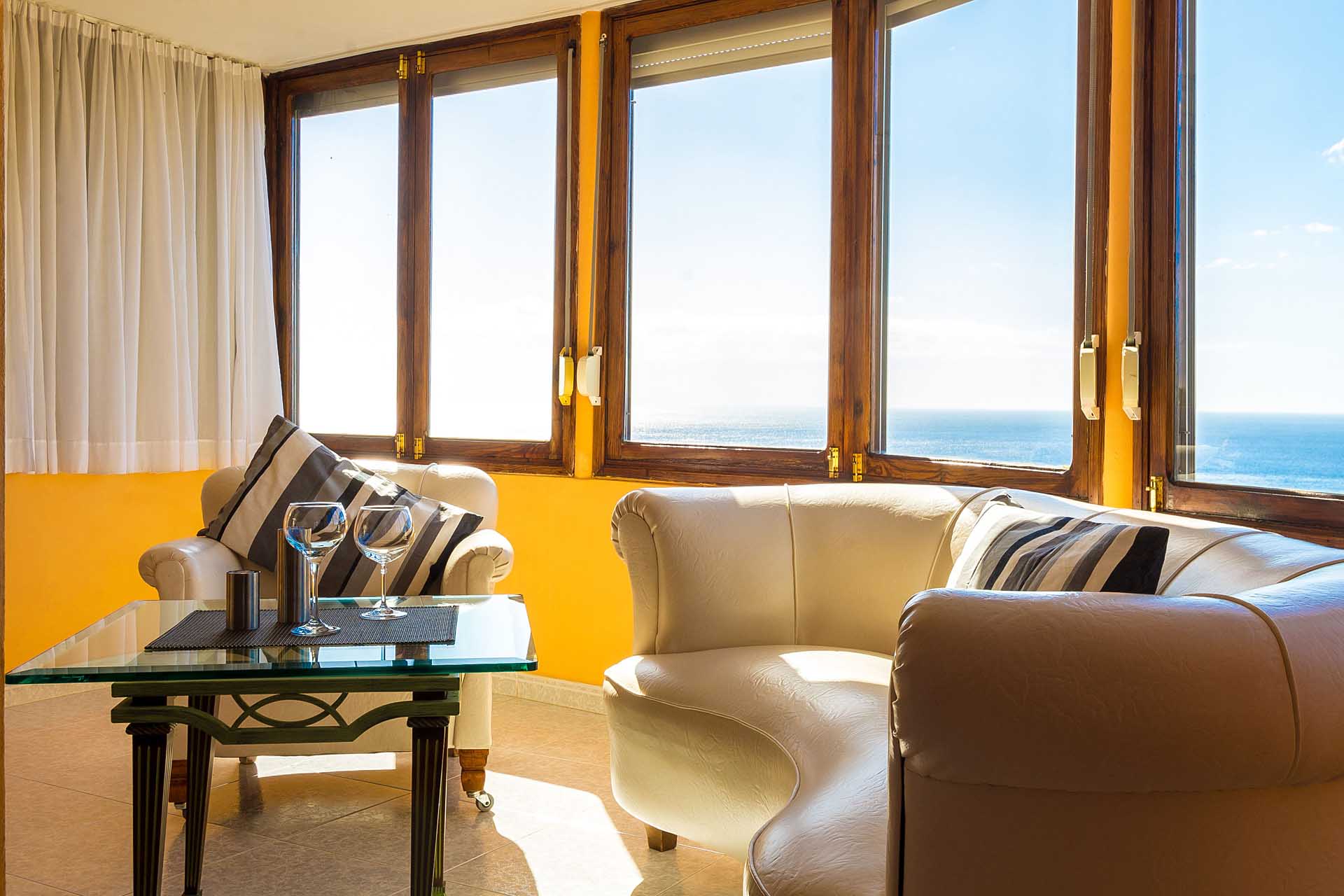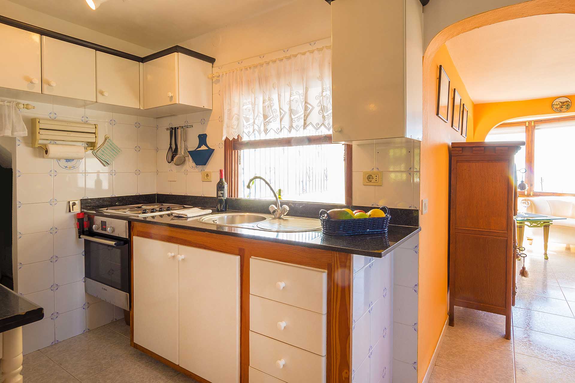 Sie ist im 1. OG aufgeteilt in ein Wohnzimmer mit Essplatz, eine Küche, zwei Schlafzimmer, ein Tageslichtbad und eine überdachte Terrasse sowie im 2. OG in einen Wintergarten (oder 2. Wohnzimmer) mit Zugang zur großen, teilweise überdachten Dachterrasse mit fantastischem Meerblick. Sie wurde bisher ausschließlich als Ferienwohnung genutzt, kann aber auch dauerhaft bewohnt werden.