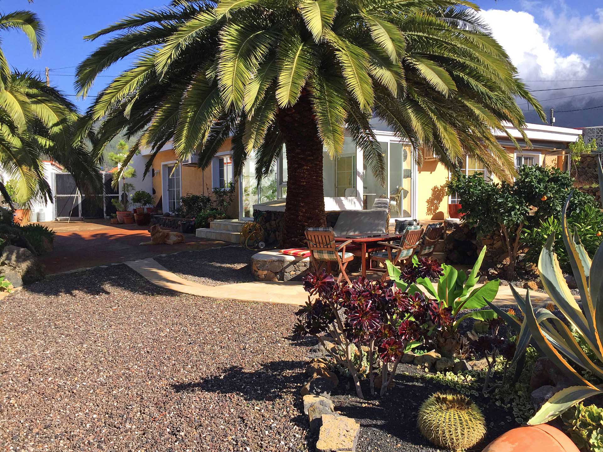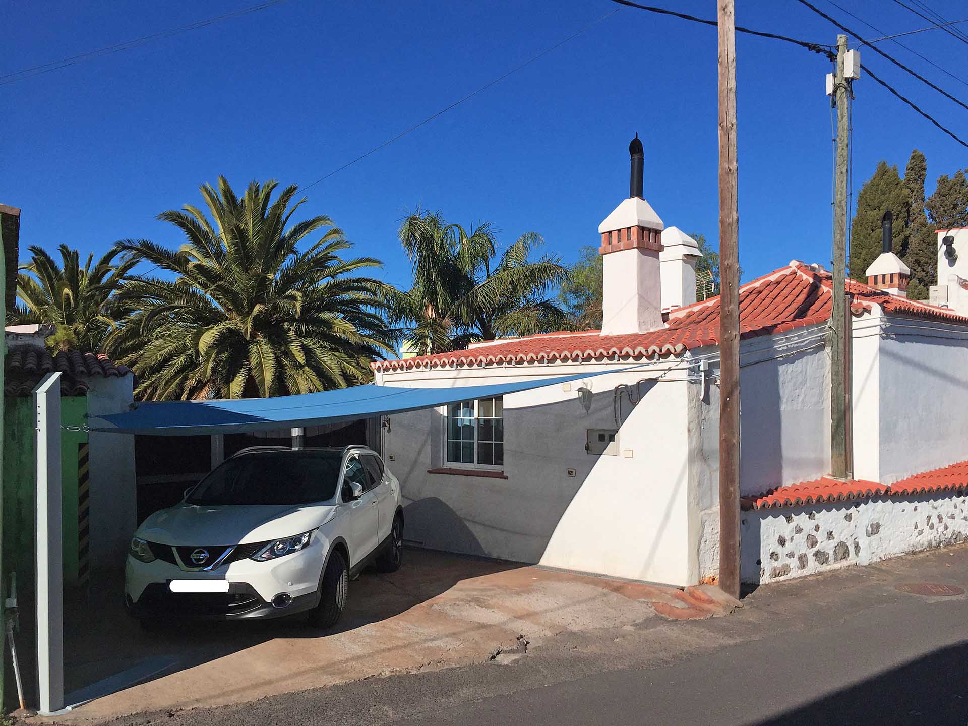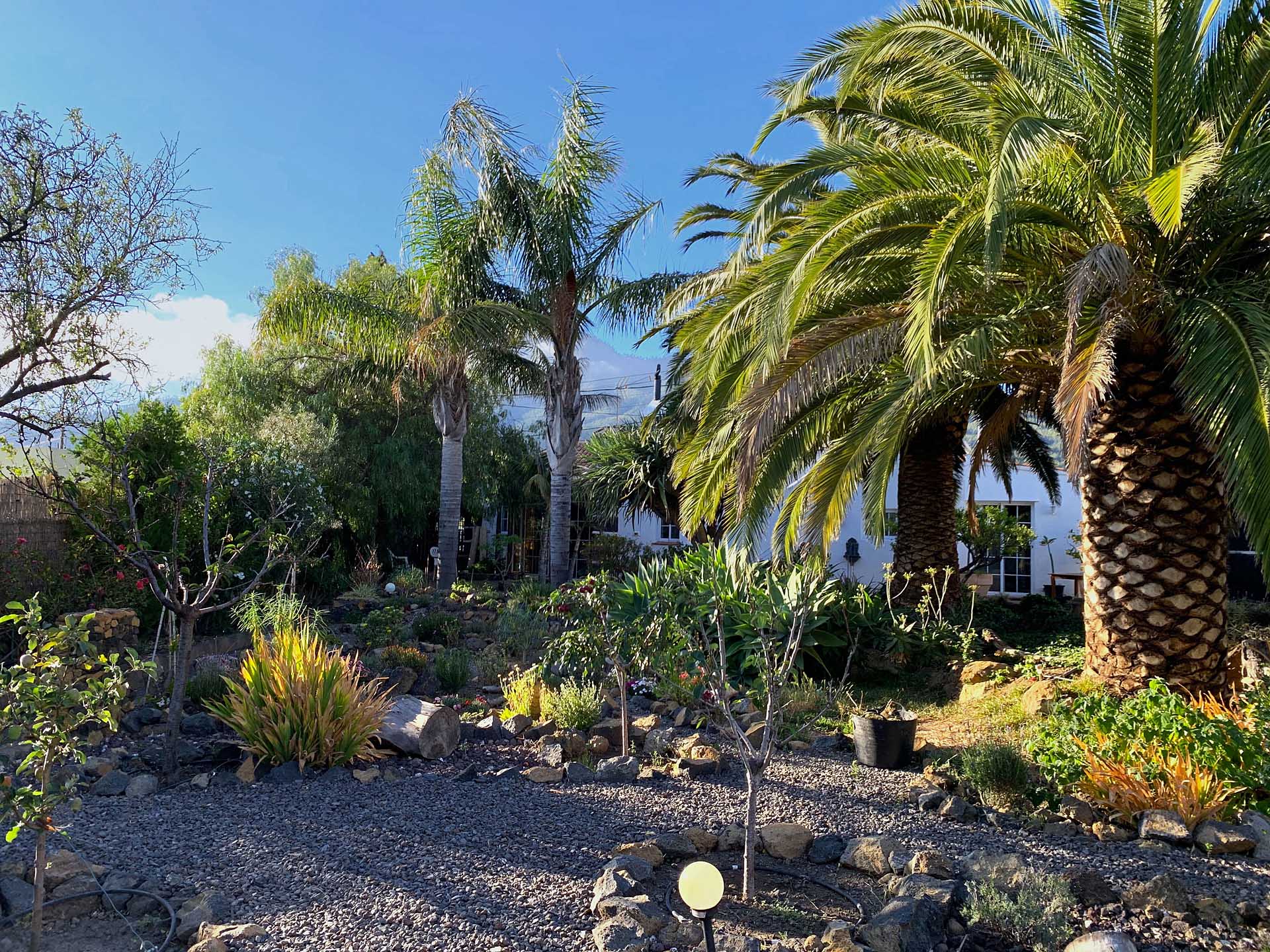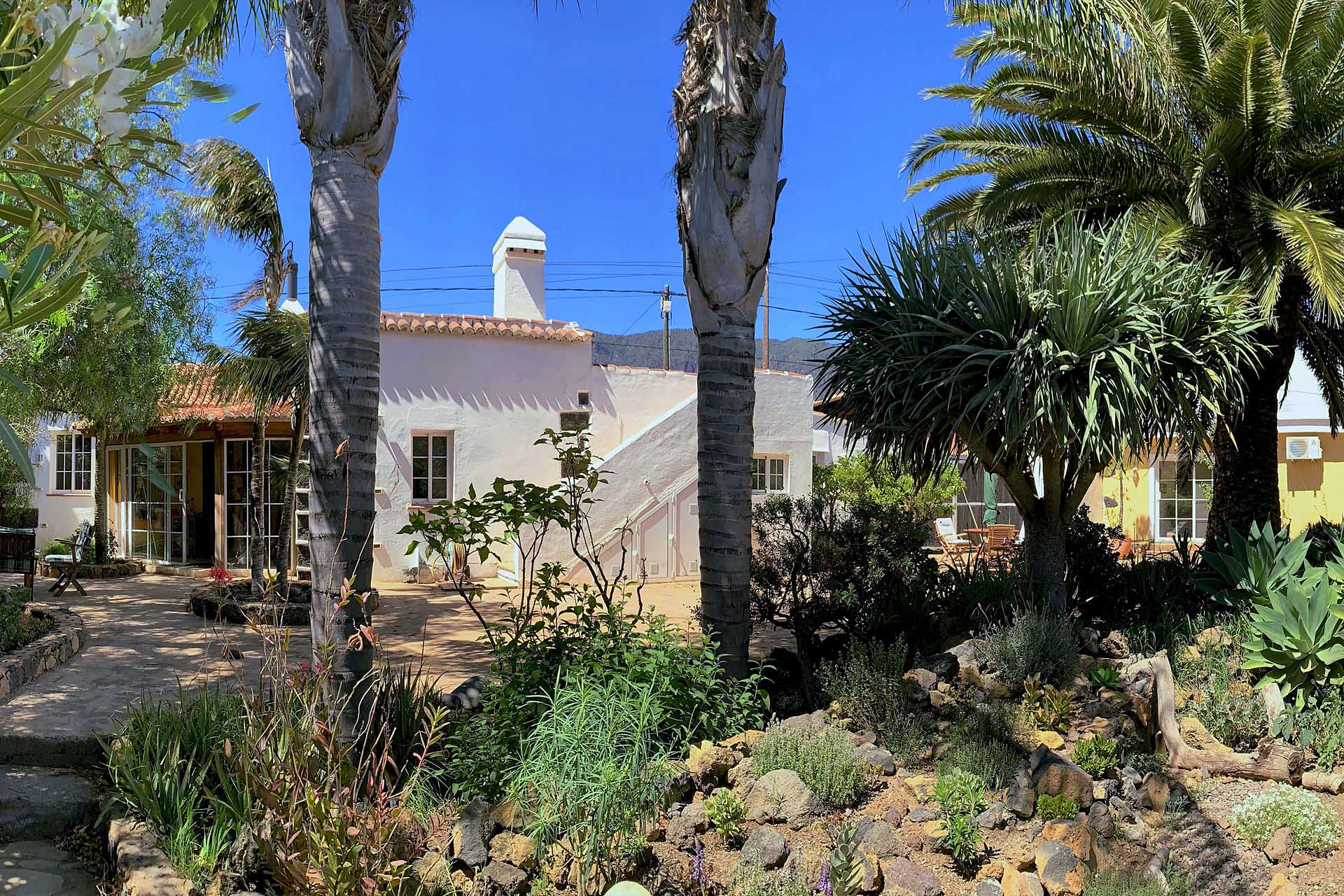 Ein typisch kanarisches Bauernhaus (143 m² Grundfläche, ca. 104 m² Nutzfläche), das Sie mit seinen ca. 60 cm dicken Wänden aus handbehauenem Blaubasalt die klimatischen Vorteile dieser traditionellen Bauweise spüren lässt: Es wird durch die sehr gute Speicherwirkung dieser Wände im Sommer nie zu heiß und im Winter nie zu kalt, zumal die Heizwirkung des später hinzugekommenen Wintergartens gut genutzt werden kann. Das Haus wurde ca. 1880 gebaut und 1995 kernsaniert und erweitert. Es beherbergt neben dem Wintergarten mit Holz-Ziegeldach ein Wohnzimmer, ein Esszimmer, drei Schlafzimmer, eine Küche und zwei Tageslicht-Badezimmer, eines mit Badewanne, das andere mit Dusche. Der Grundriss wurde so angelegt und ausgeführt, dass es sich auch mit einfachen Mitteln in zwei komplett getrennte Wohnbereiche aufteilen lässt. So wurden bereits alle Versorgungsleitungen für einen zweiten Kochbereich gelegt. Außerdem verfügt das Haus über eine Dachterrasse (ca. 40 m²) mit herrlichem Rundumblick. Zum Haus gehört eine ca. 130 m² große Terrasse, die von einem großen Pfefferbaum wohltuend beschattet wird.