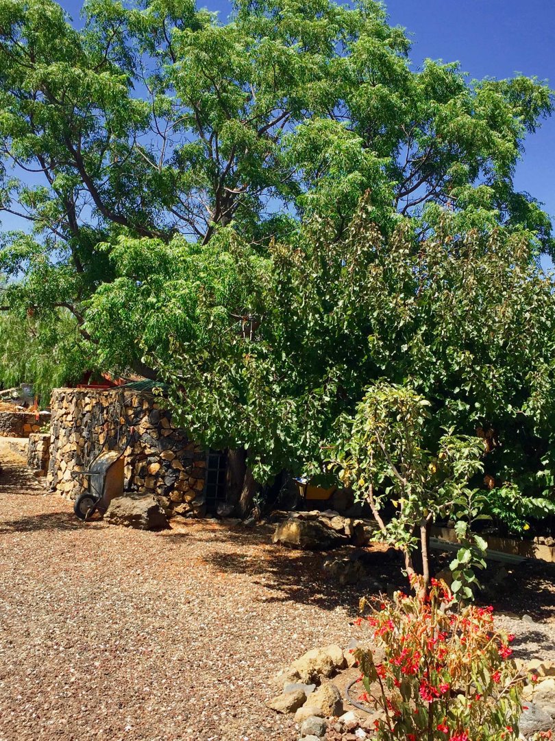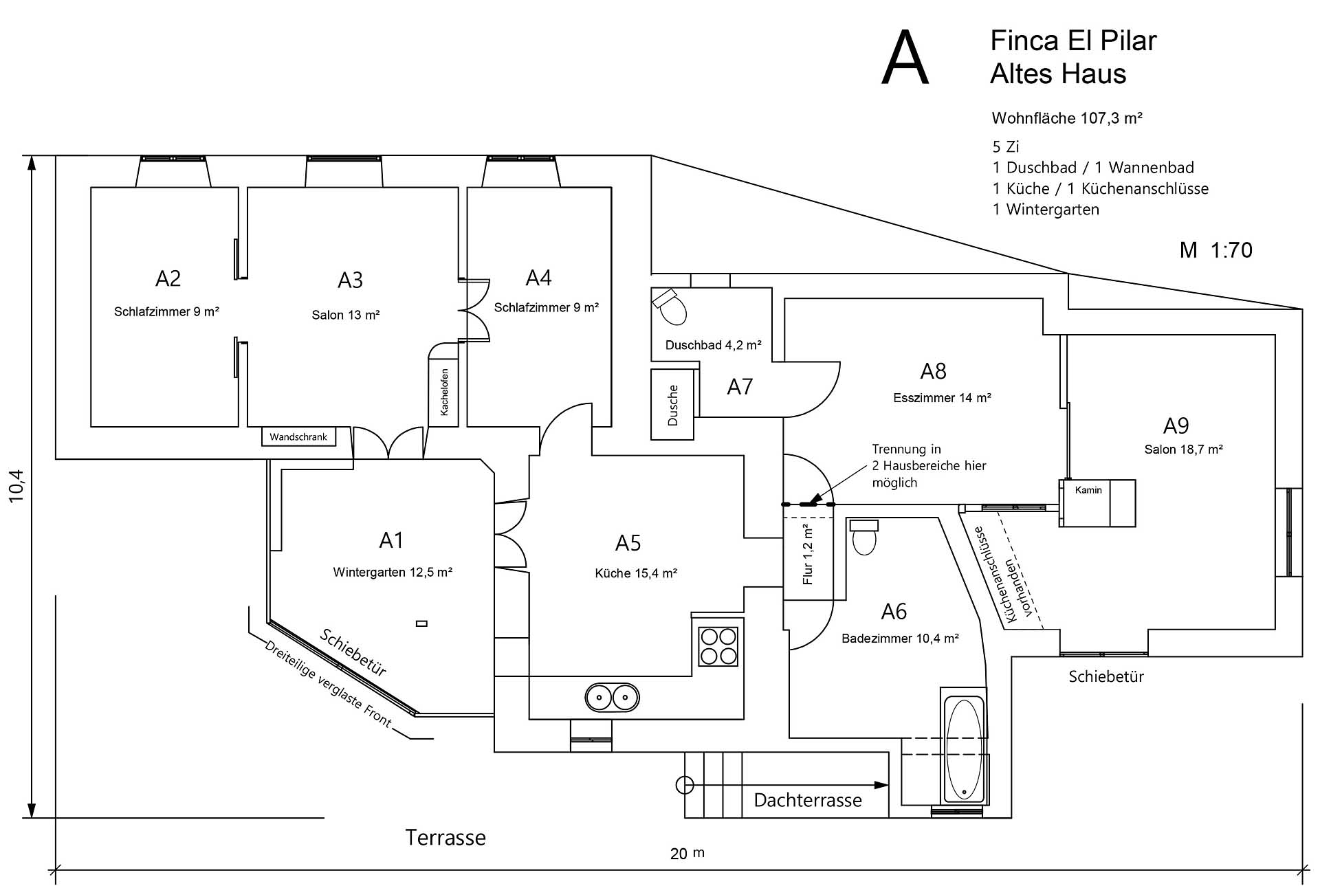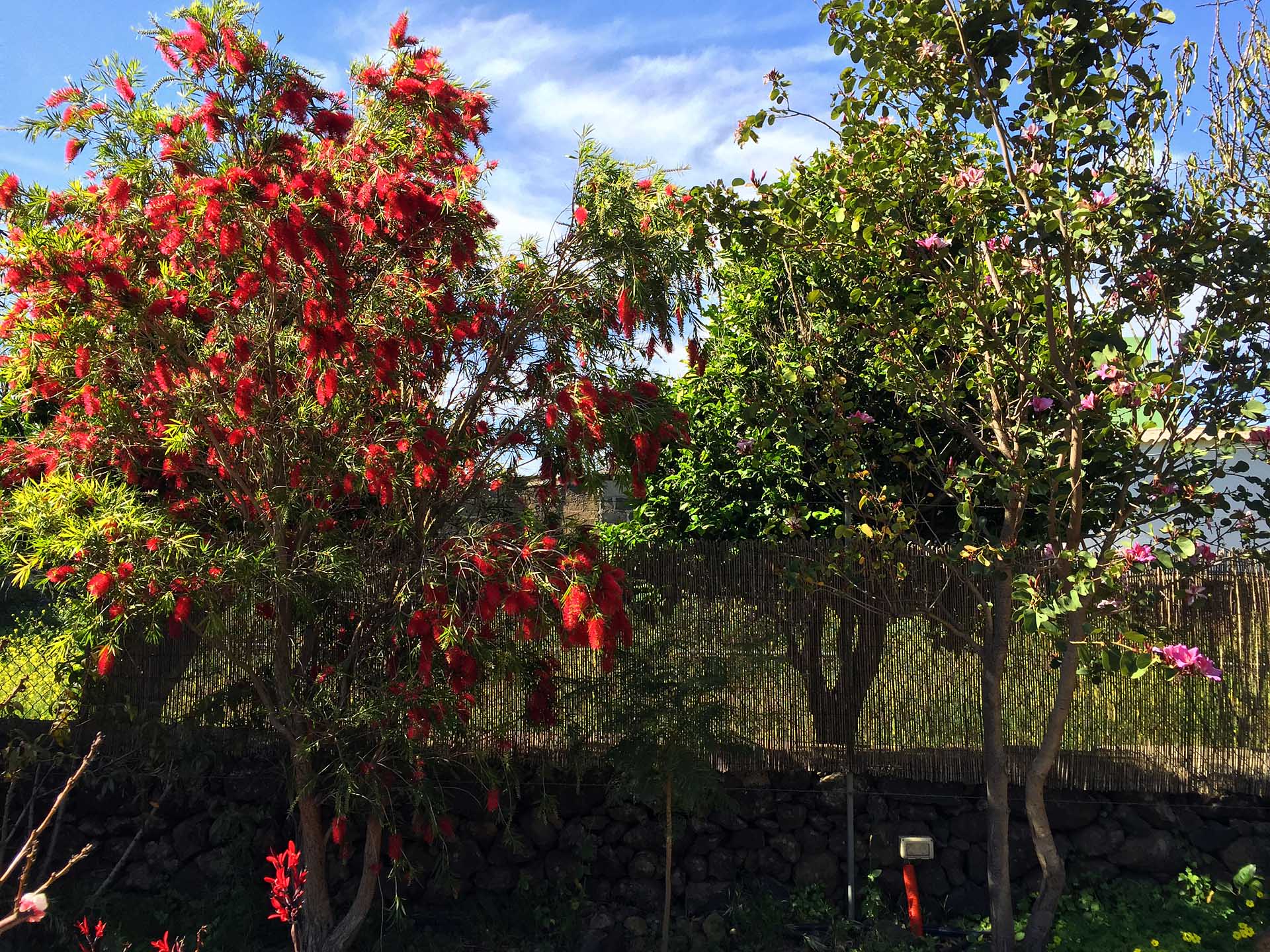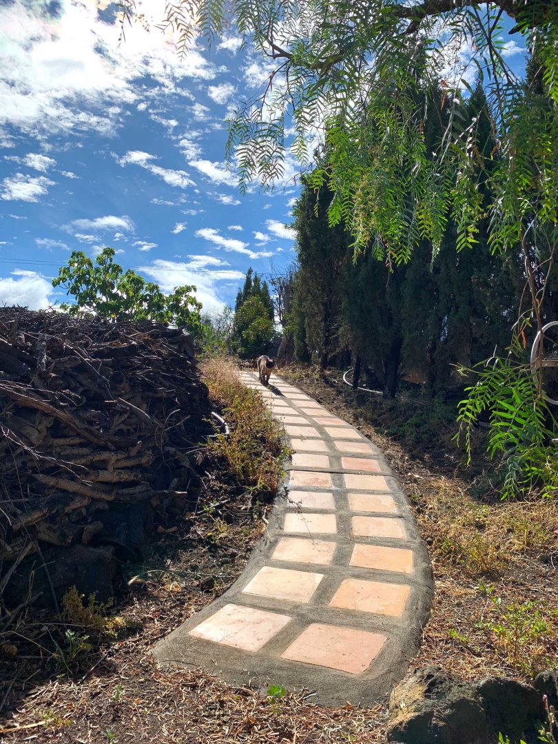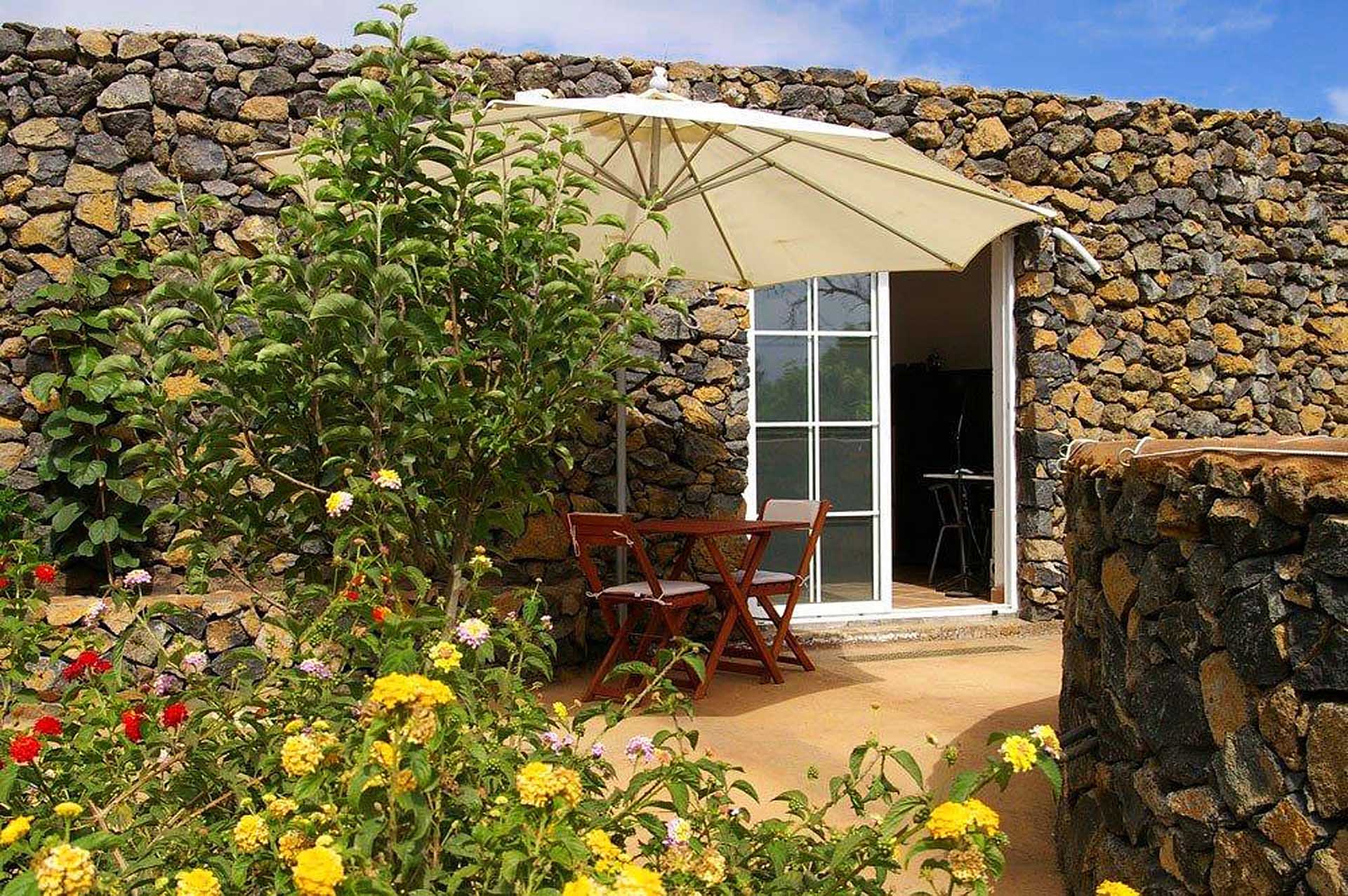 Ein typisch kanarisches Bauernhaus (143 m² Grundfläche, ca. 104 m² Nutzfläche), das Sie mit seinen ca. 60 cm dicken Wänden aus handbehauenem Blaubasalt die klimatischen Vorteile dieser traditionellen Bauweise spüren lässt: Es wird durch die sehr gute Speicherwirkung dieser Wände im Sommer nie zu heiß und im Winter nie zu kalt, zumal die Heizwirkung des später hinzugekommenen Wintergartens gut genutzt werden kann. Das Haus wurde ca. 1880 gebaut und 1995 kernsaniert und erweitert. Es beherbergt neben dem Wintergarten mit Holz-Ziegeldach ein Wohnzimmer, ein Esszimmer, drei Schlafzimmer, eine Küche und zwei Tageslicht-Badezimmer, eines mit Badewanne, das andere mit Dusche. Der Grundriss wurde so angelegt und ausgeführt, dass es sich auch mit einfachen Mitteln in zwei komplett getrennte Wohnbereiche aufteilen lässt. So wurden bereits alle Versorgungsleitungen für einen zweiten Kochbereich gelegt. Außerdem verfügt das Haus über eine Dachterrasse (ca. 40 m²) mit herrlichem Rundumblick. Zum Haus gehört eine ca. 130 m² große Terrasse, die von einem großen Pfefferbaum wohltuend beschattet wird.