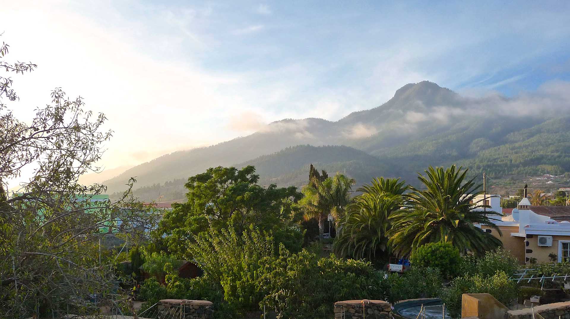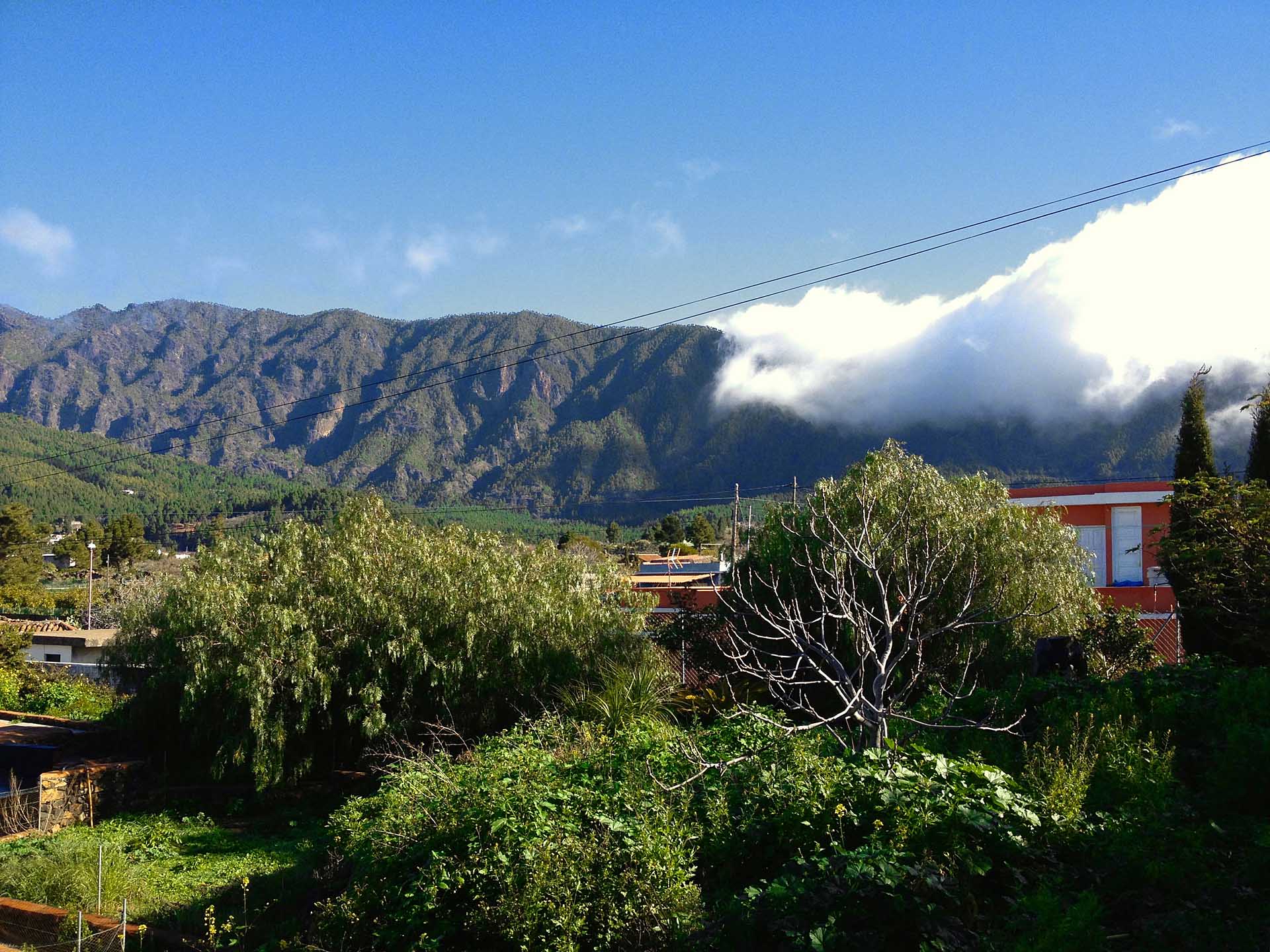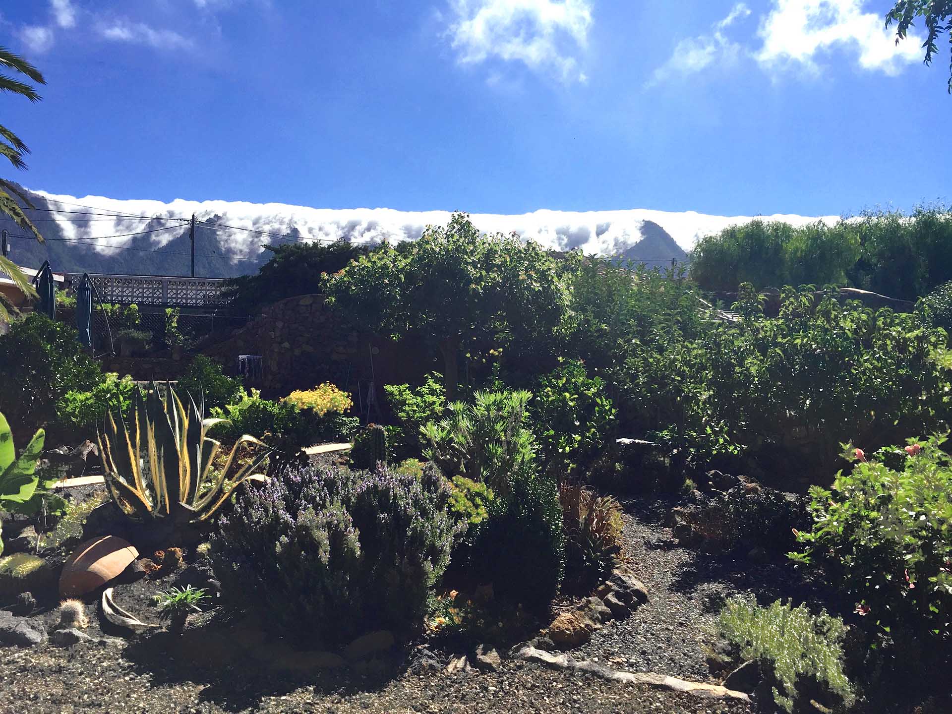Blick über das Grundstück auf den berühmten Wolkenfall an der Cumbre