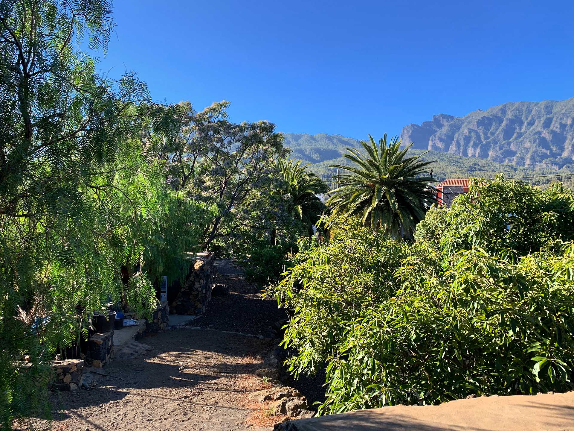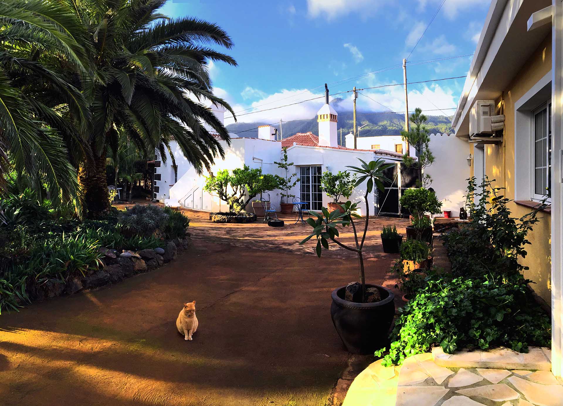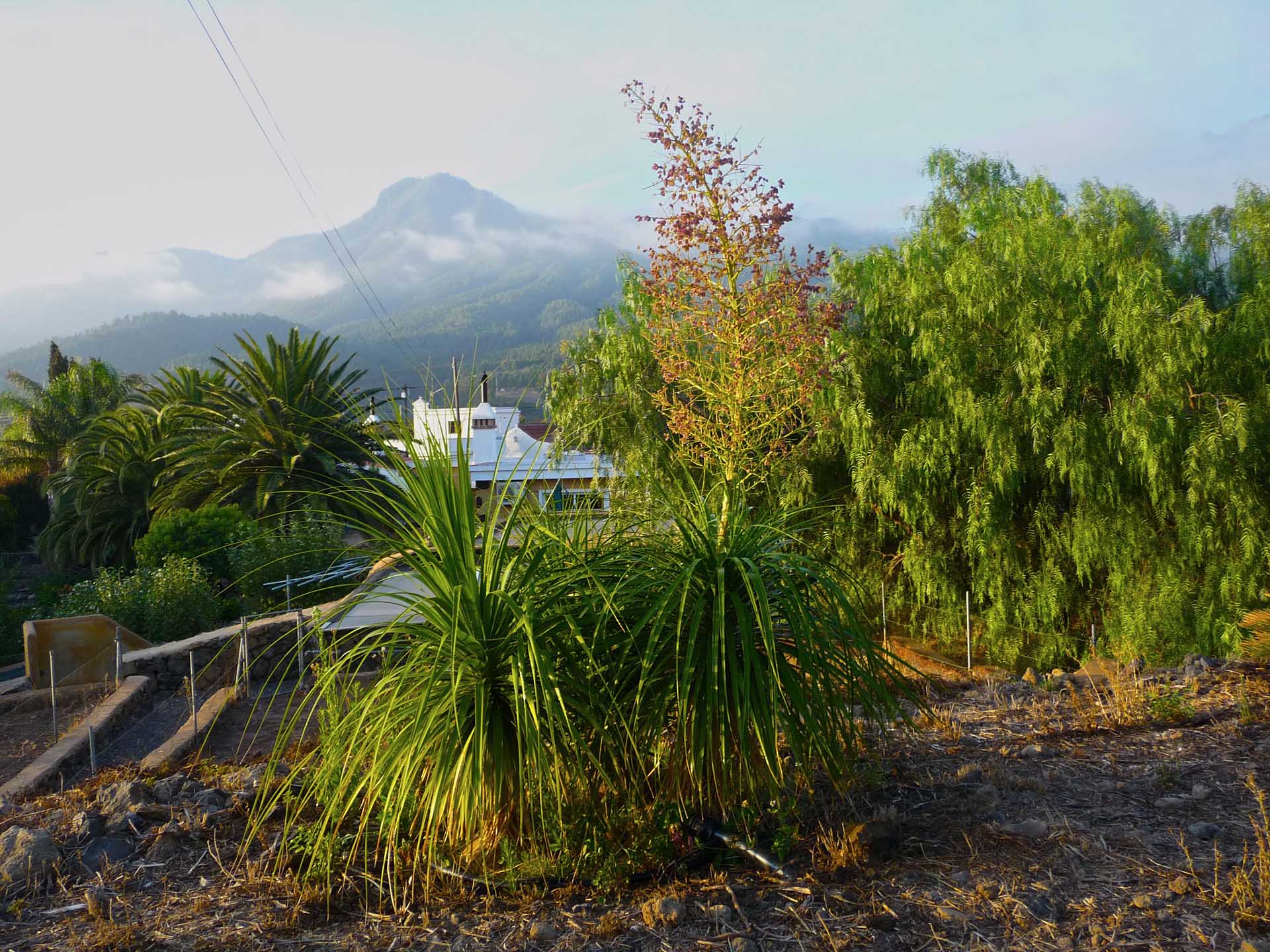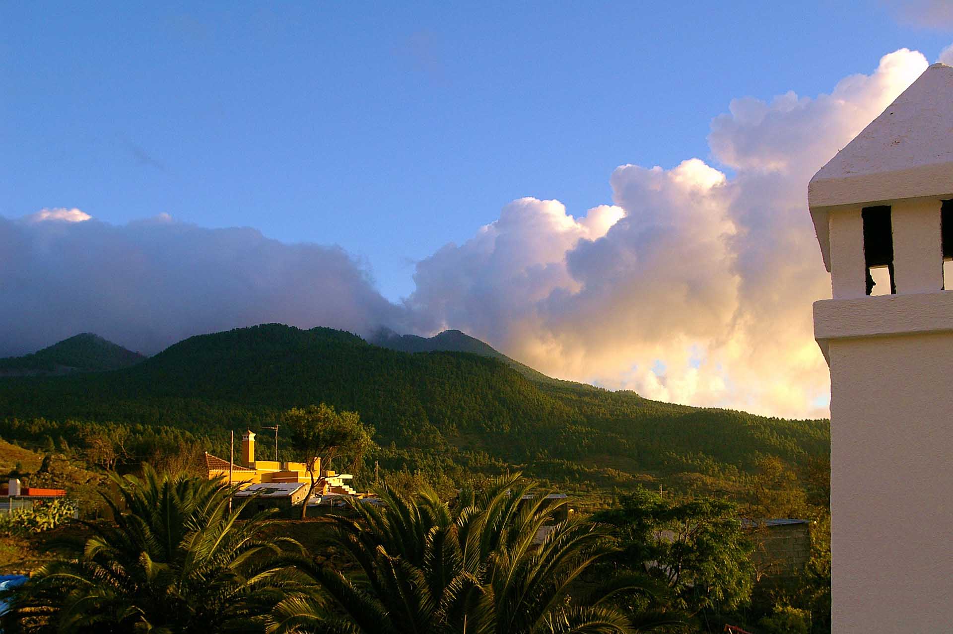 Blick über das Grundstück auf den berühmten Wolkenfall an der Cumbre