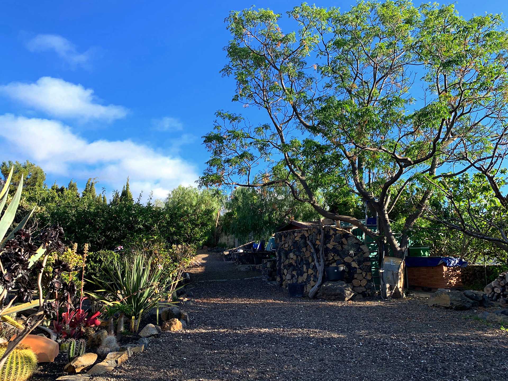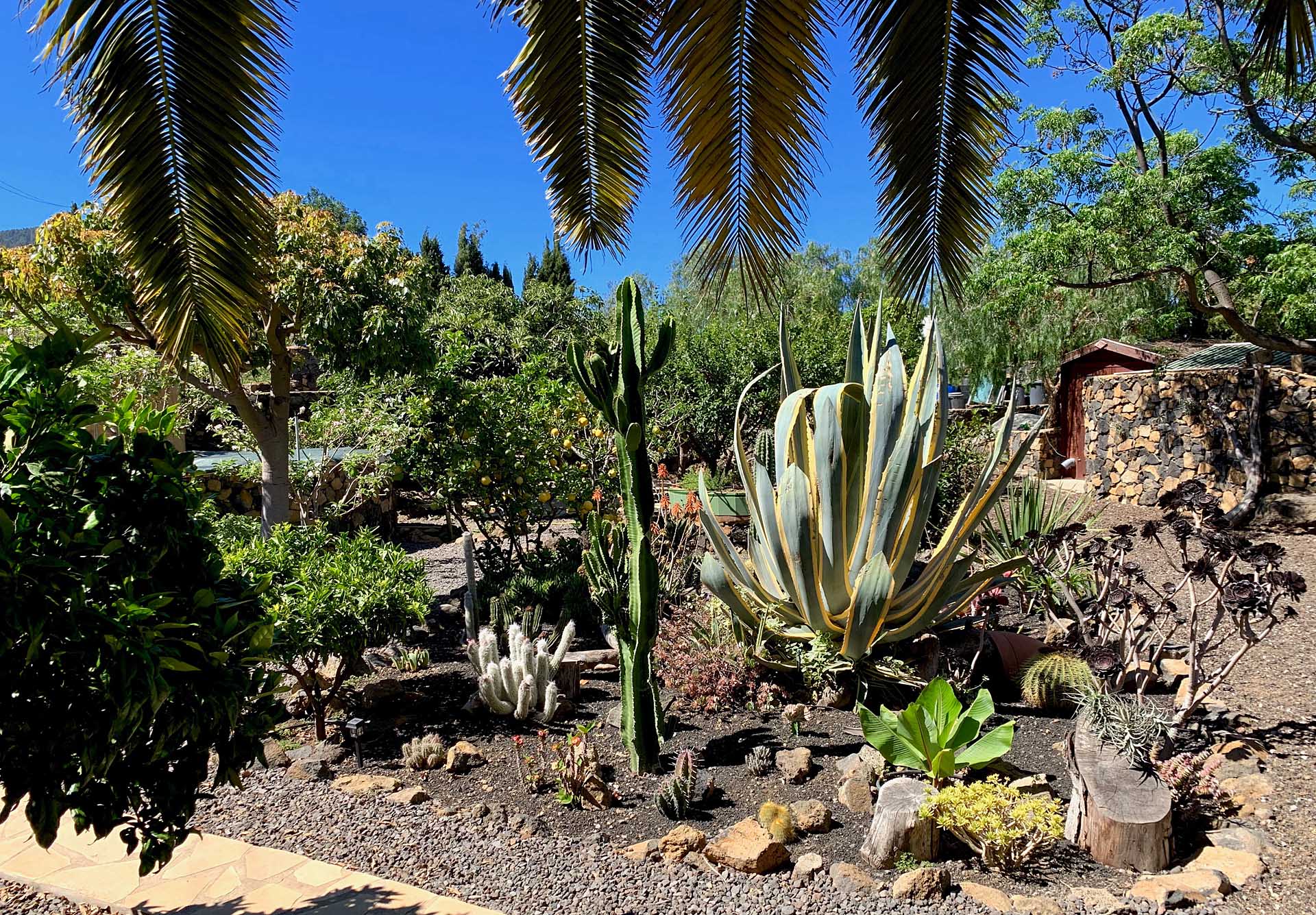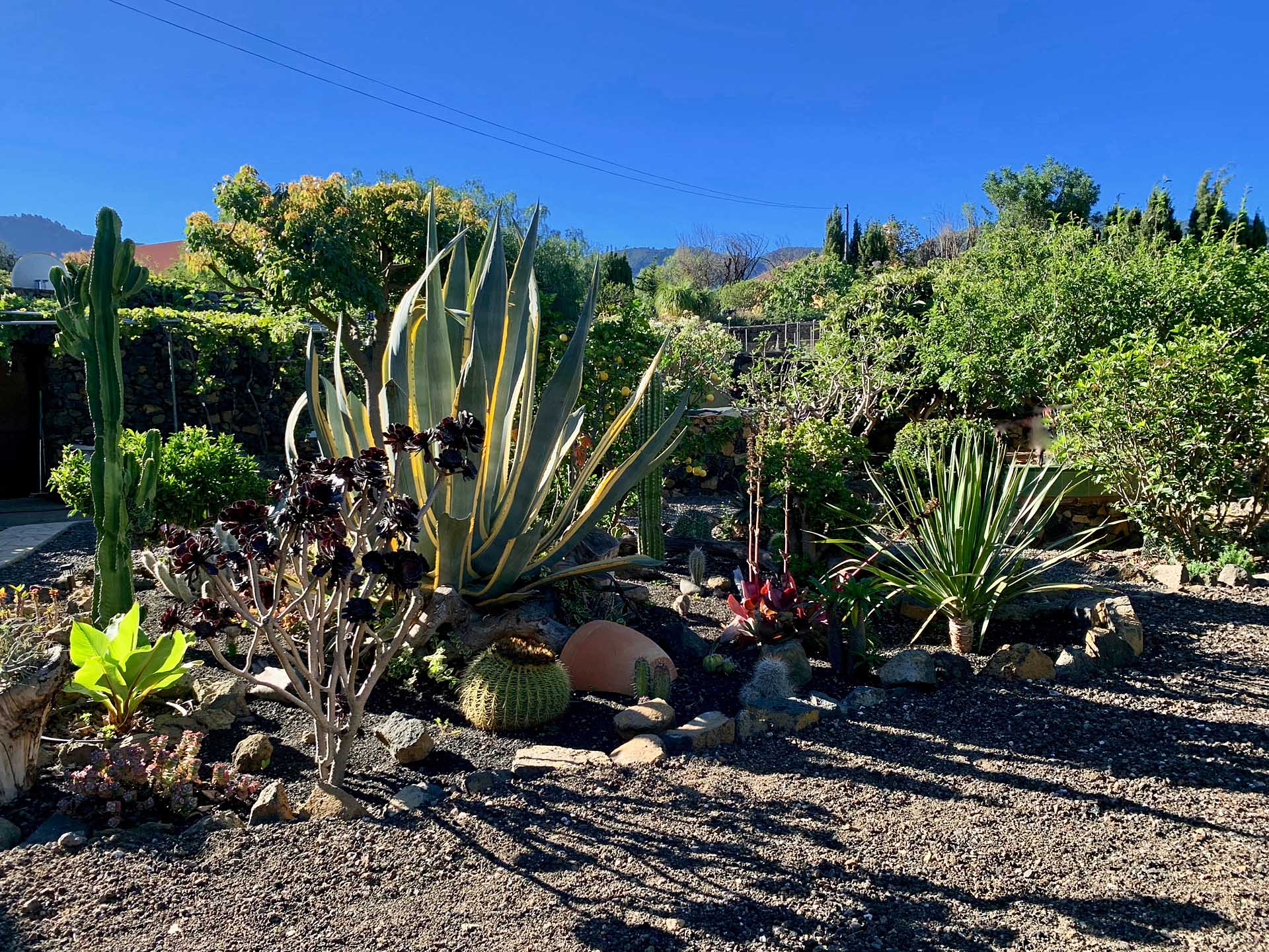 Der 2.152 m² große Garten ist mit großen Bäumen und Palmen sowie zahlreichen, subtropischen Zier- und Fruchtbäumen, sowie Kakteen und Blühpflanzen angelegt und mit gut gestalteten Gartenwegen sowie Terrassenflächen erschlossen. Er nimmt neben zwei Gartenschuppen (zusammen ca. 10,8 m² Nutzfläche) auch einen kleinen Pool auf und ist pflegeleicht konzipiert. Für Fahrzeuge steht ein Carport für zwei PKW zur Verfügung, sowie eine mit Tor gesicherte Einfahrt, die auch von LKW genutzt werden kann. Rund 80% der Pflanzen werden automatisch über Bewässerungscomputer bewässert, es steht eine Wasserreserve von ca. 37 m³ zur Verfügung.