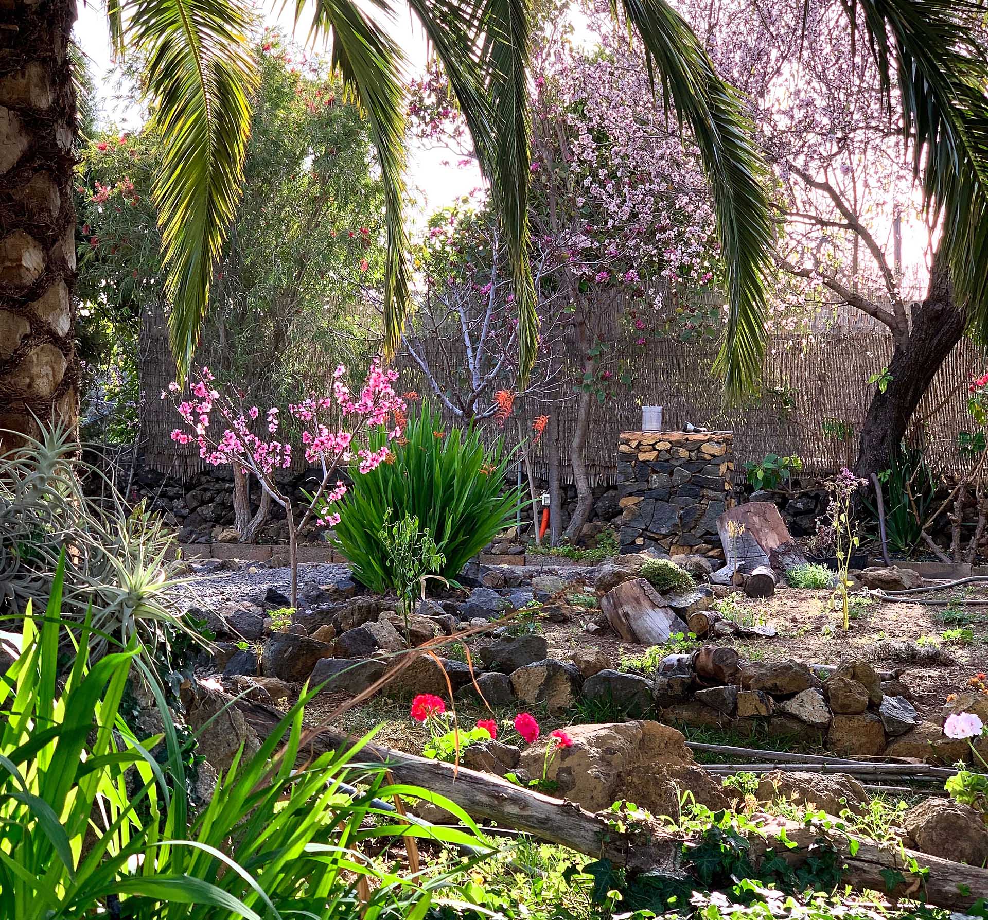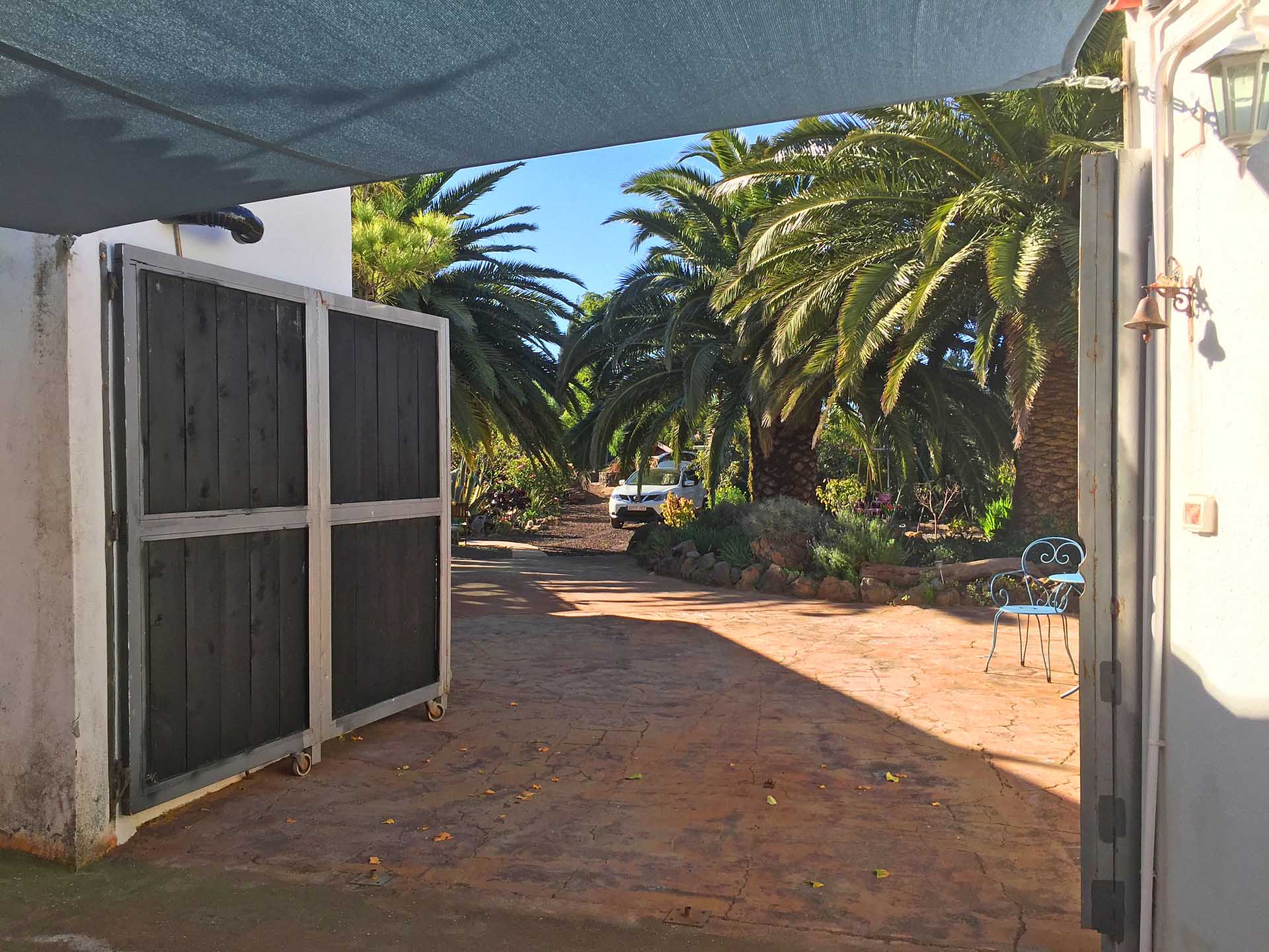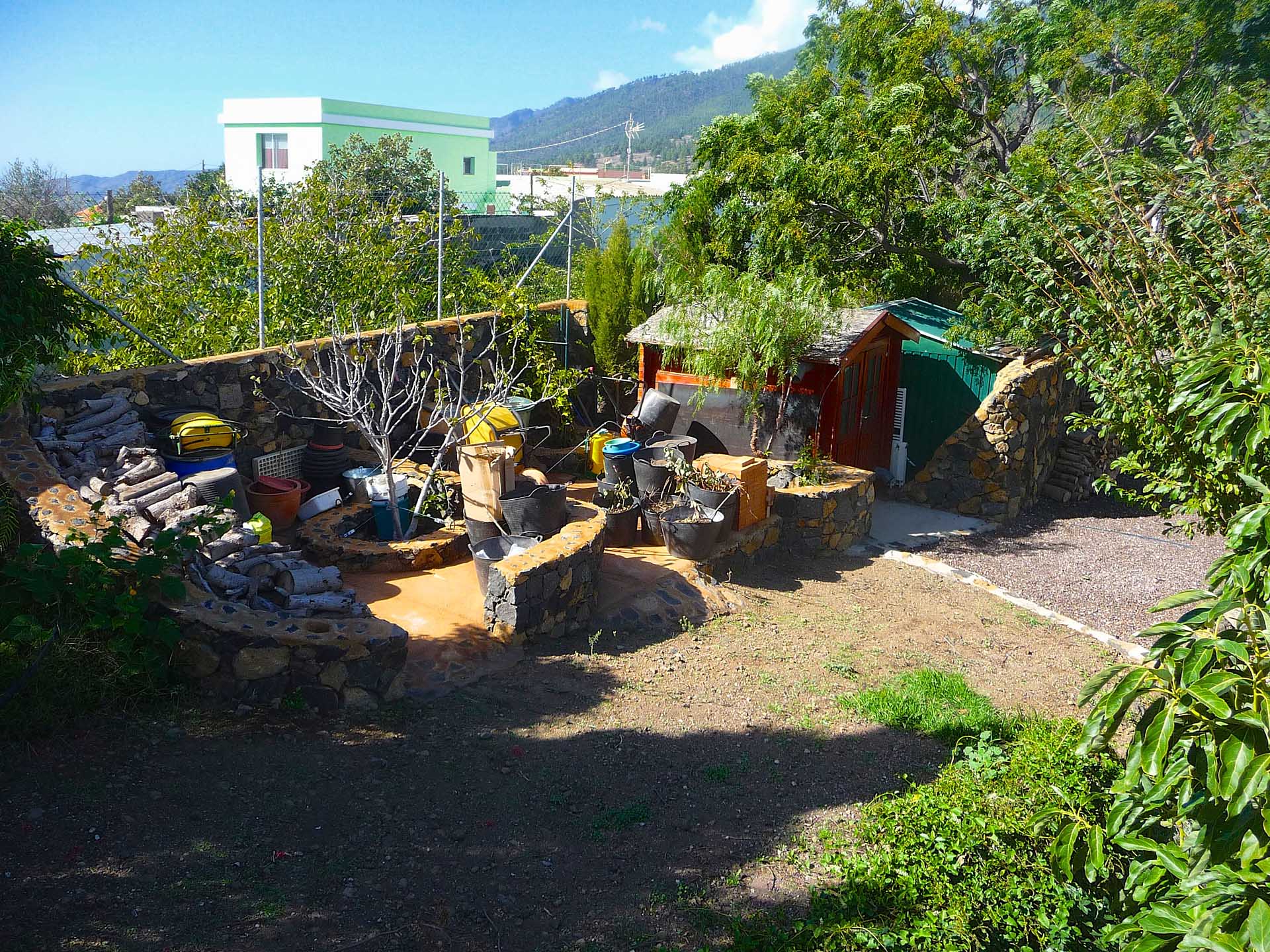 Der 2.152 m² große Garten ist mit großen Bäumen und Palmen sowie zahlreichen, subtropischen Zier- und Fruchtbäumen, sowie Kakteen und Blühpflanzen angelegt und mit gut gestalteten Gartenwegen sowie Terrassenflächen erschlossen. Er nimmt neben zwei Gartenschuppen (zusammen ca. 10,8 m² Nutzfläche) auch einen kleinen Pool auf und ist pflegeleicht konzipiert. Für Fahrzeuge steht ein Carport für zwei PKW zur Verfügung, sowie eine mit Tor gesicherte Einfahrt, die auch von LKW genutzt werden kann. Rund 80% der Pflanzen werden automatisch über Bewässerungscomputer bewässert, es steht eine Wasserreserve von ca. 37 m³ zur Verfügung.