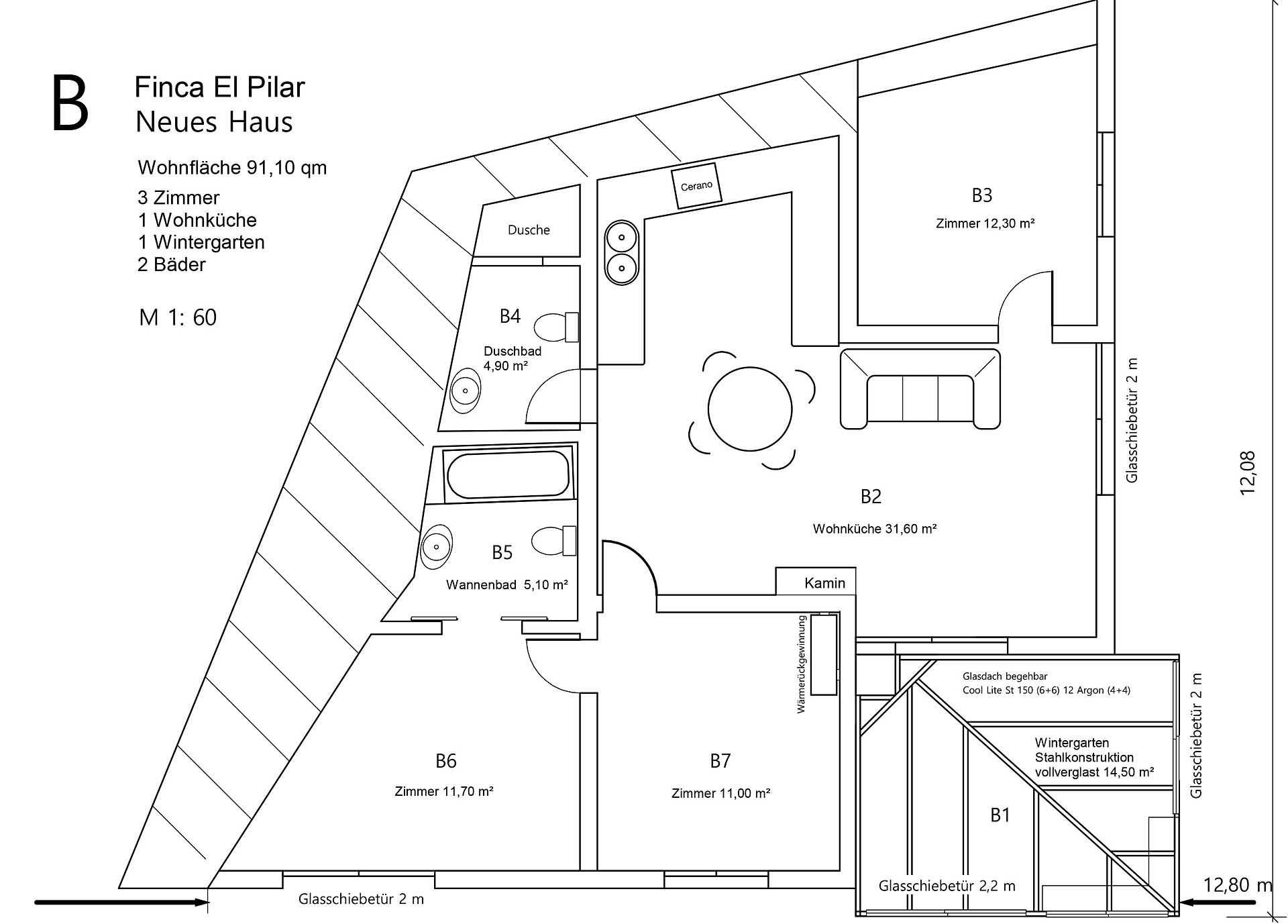 Das „Neue Haus“ (118 m² Grundfläche, 91 m² Nutzfläche) wurde 2007 fertiggestellt und besteht aus einem Wintergarten, einer Wohnküche, drei Schlafzimmern und zwei Tageslicht-Badezimmern, eines mit Whirlpool-Badewanne, das andere mit Dusche. Der Wintergarten kann sehr gut als Heizung genutzt werden, so dass die vorhandenen Heizmöglichkeiten kaum gebraucht werden. Das Haus wurde modern mit Flachdach und vier integrierten Dachfenstern gebaut, welche die Badezimmer sowie die Wohnküche hell mit Tageslicht beleuchten. Der schöne Sitzbereich unter einer großen Kanarischen Palme bietet ganzjährig Schatten. Am Haus befindet sich ein von außen zugängliches Feuerholz-Lager mit ca. 2 m³ Fassungsvermögen.
