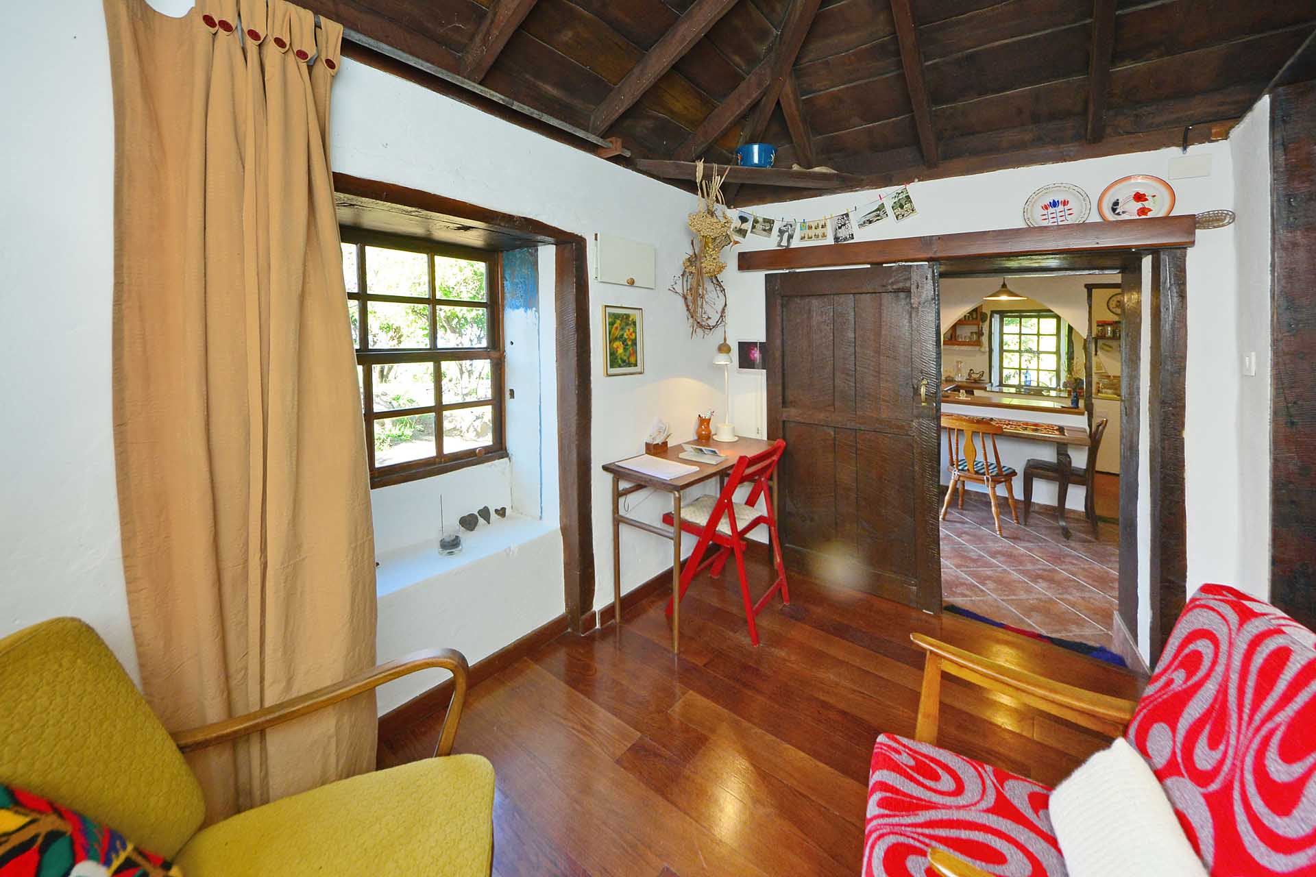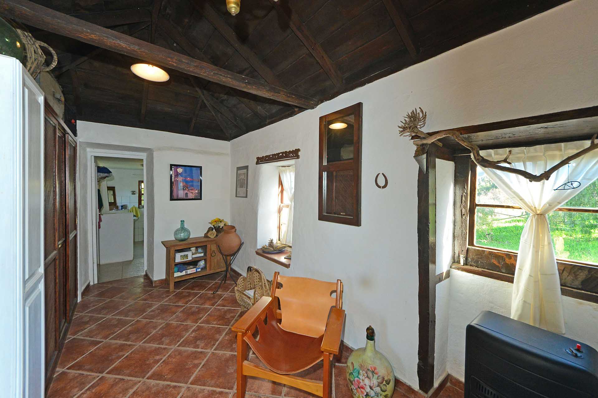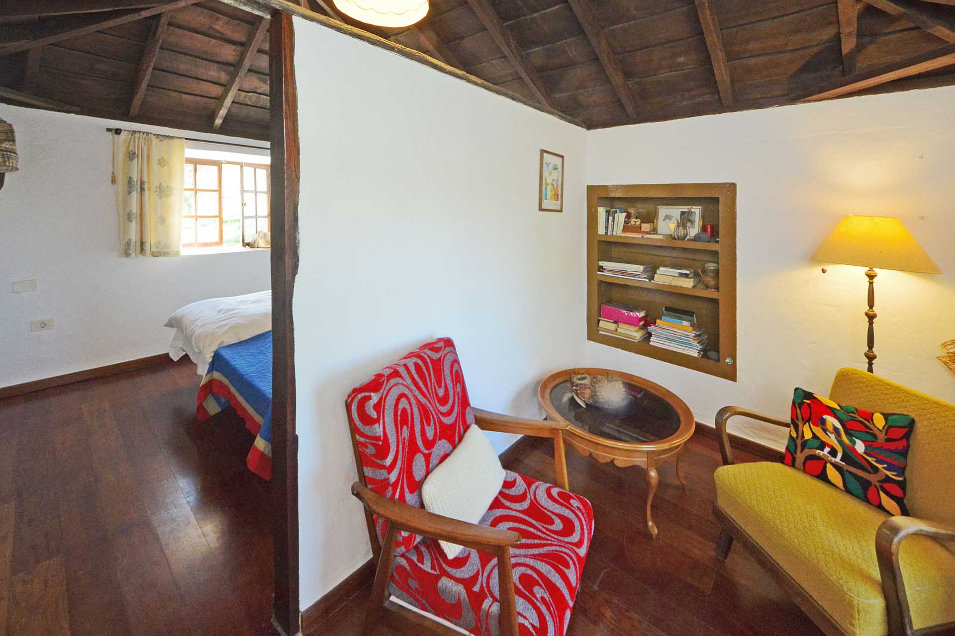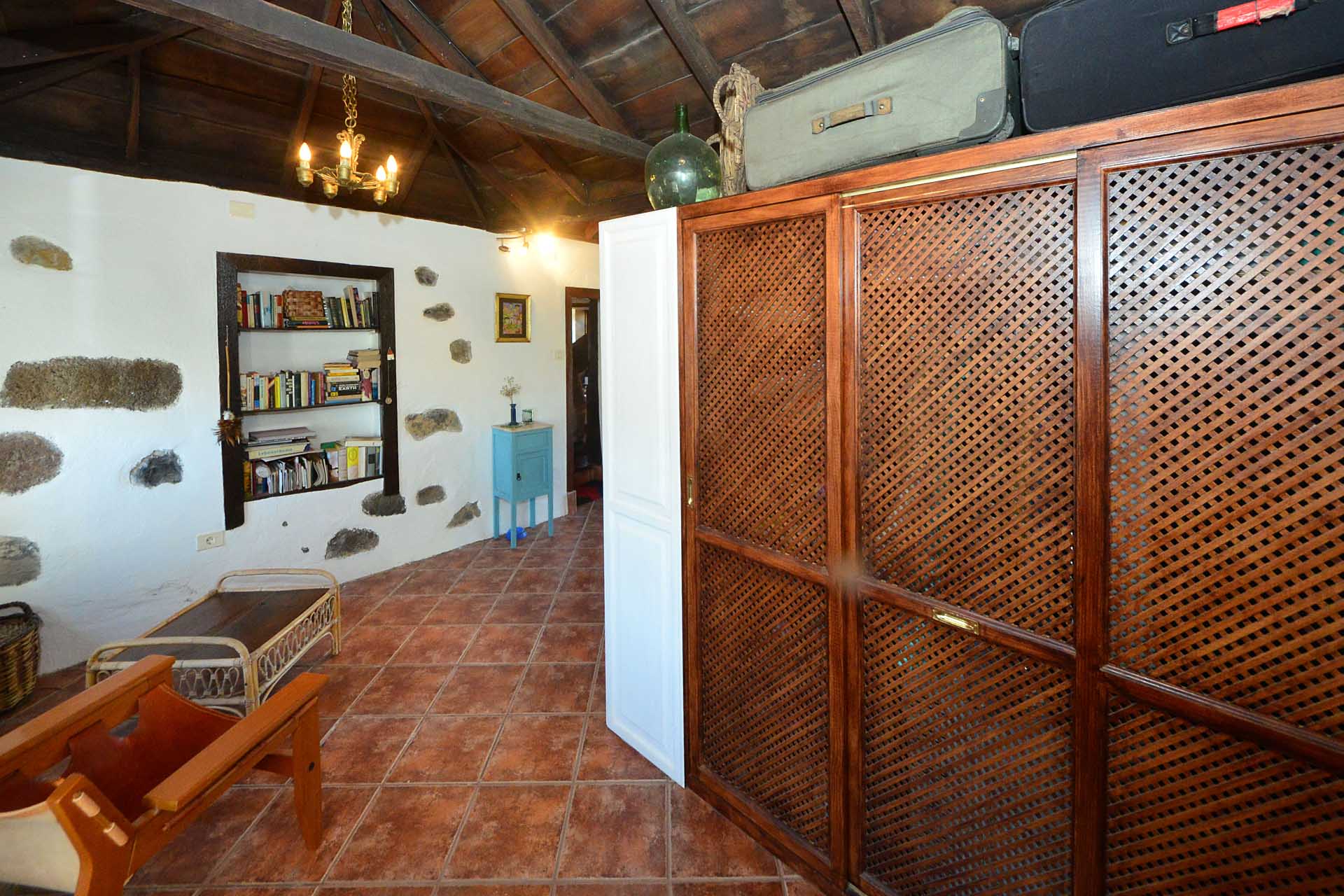 Sie betreten das Haus durch eine originale Teaholz-Türe und gelangen in das Wohnzimmer mit Essbereich und halboffener Küche – so ist der Weg mit der Kaffeetasse auf die Terrasse, die Sie gleich mit den ersten Strahlen der Morgensonne empfängt, kurz. Das L-förmige Wohnzimmer, wie auch die Schlafzimmer und die Küche haben eigene Walmdächer mit dem typischen Sichtholzdachstuhl, der nicht nur kanarische Gemütlichkeit ausstrahlt, sondern auch im Sommer dafür sorgt, dass die Wärme nach oben abziehen kann.