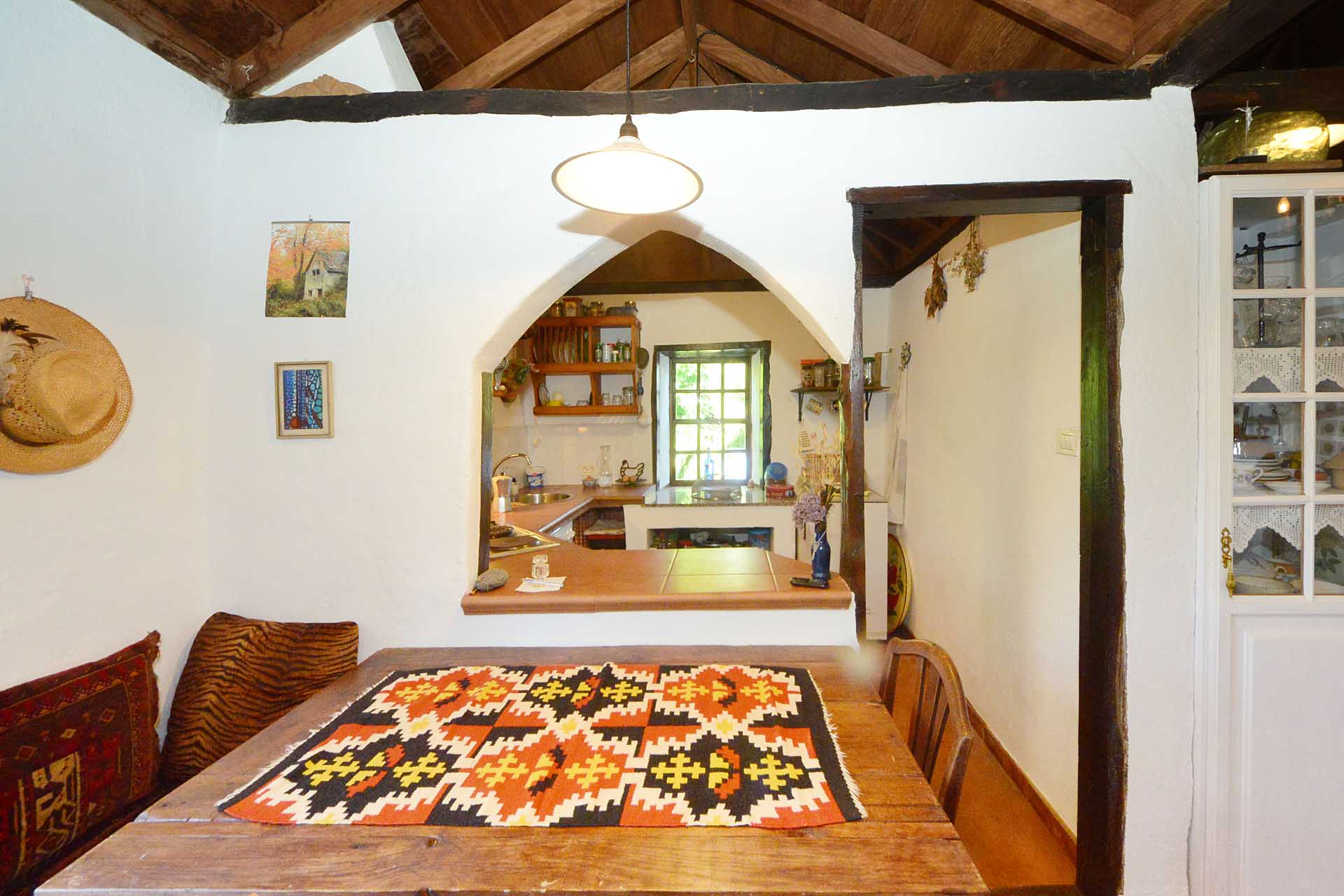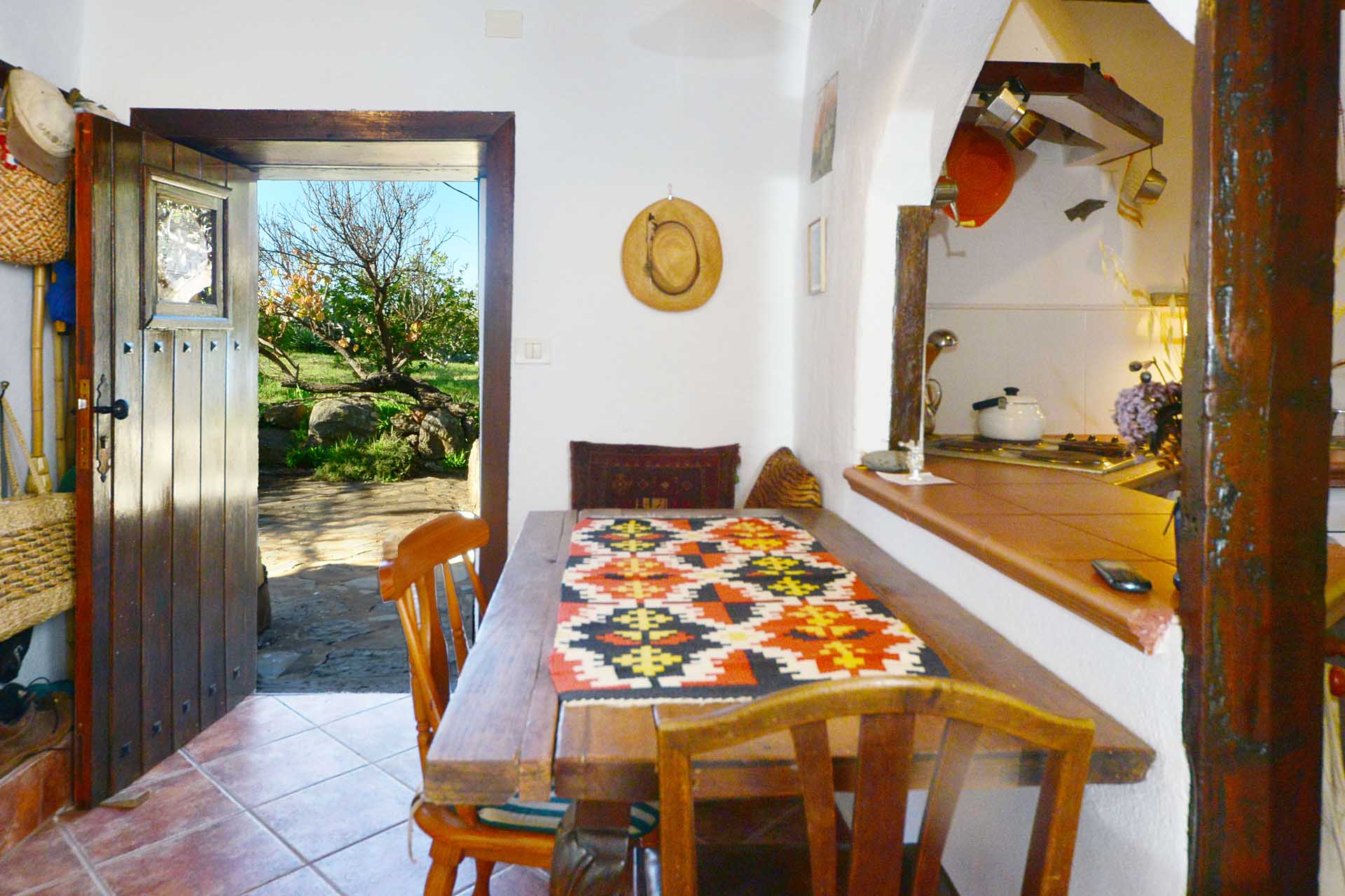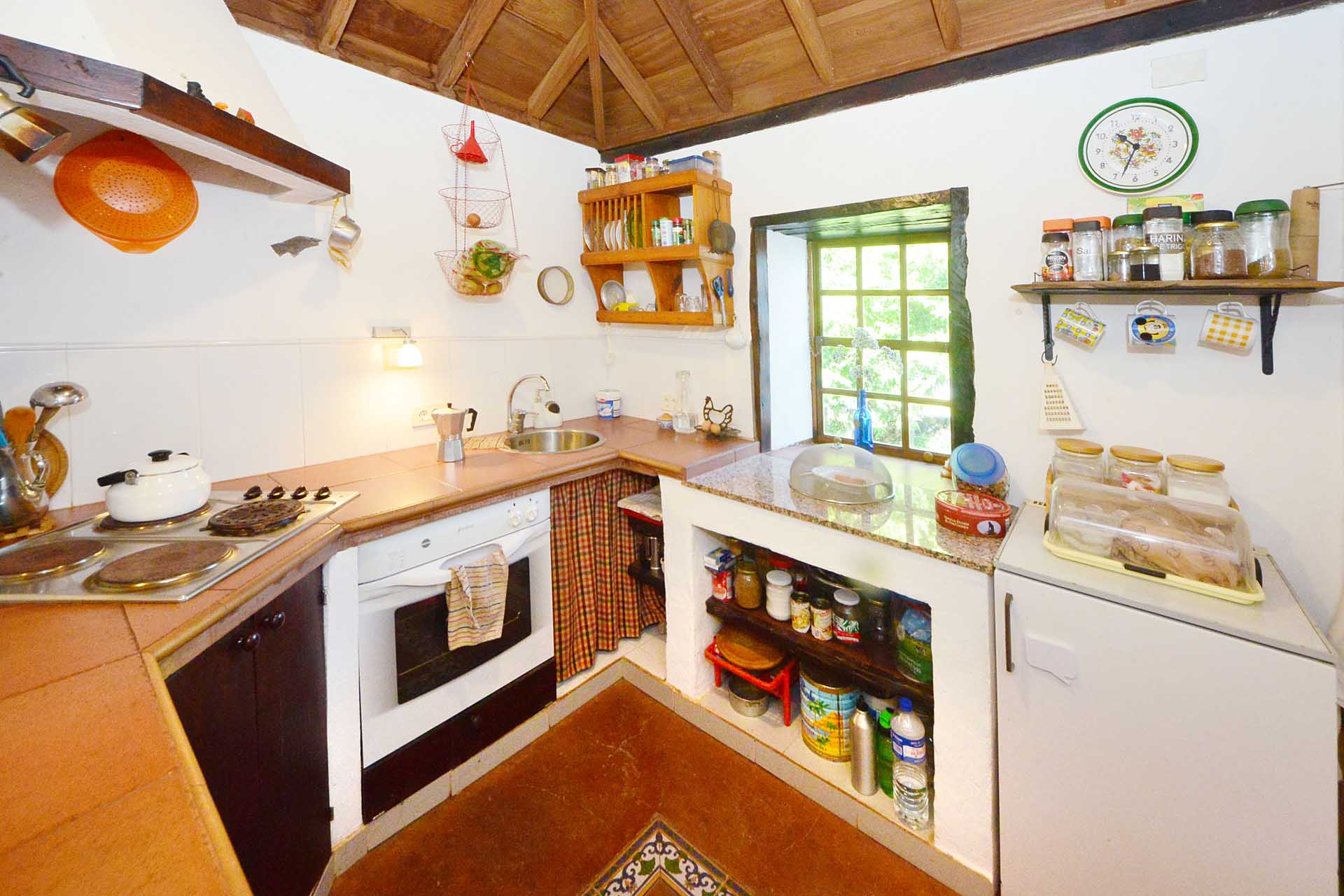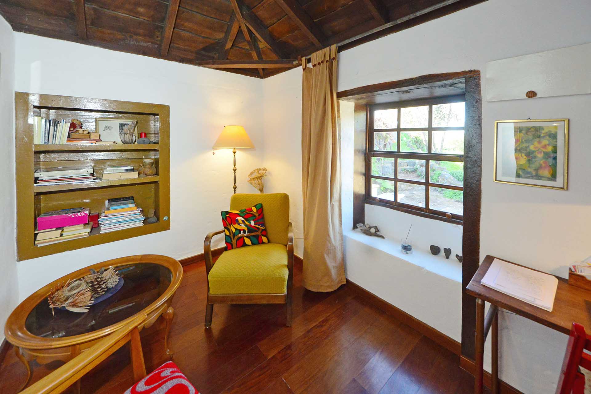Sie betreten das Haus durch eine originale Teaholz-Türe und gelangen in das Wohnzimmer mit Essbereich und halboffener Küche – so ist der Weg mit der Kaffeetasse auf die Terrasse, die Sie gleich mit den ersten Strahlen der Morgensonne empfängt, kurz. Das L-förmige Wohnzimmer, wie auch die Schlafzimmer und die Küche haben eigene Walmdächer mit dem typischen Sichtholzdachstuhl, der nicht nur kanarische Gemütlichkeit ausstrahlt, sondern auch im Sommer dafür sorgt, dass die Wärme nach oben abziehen kann.