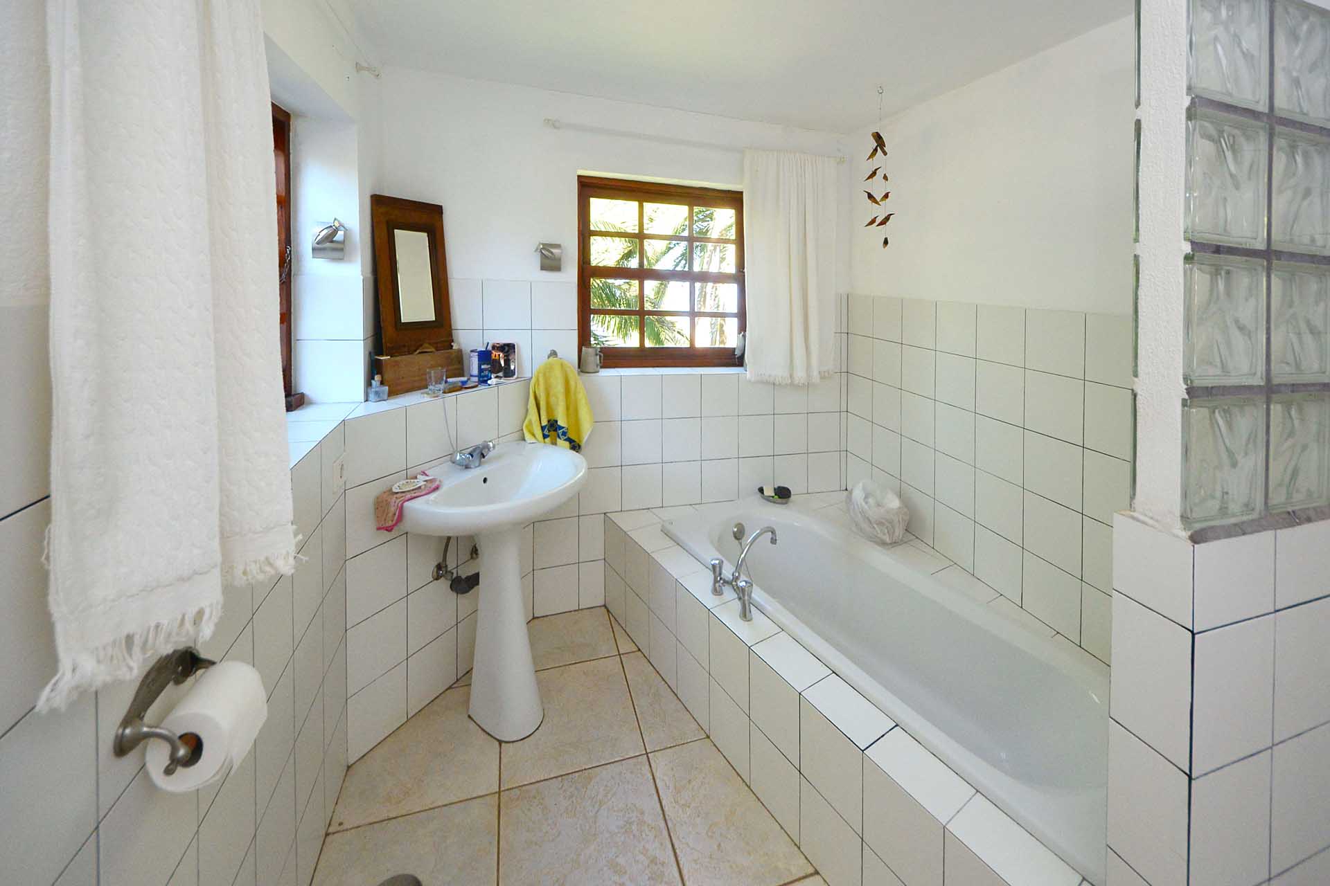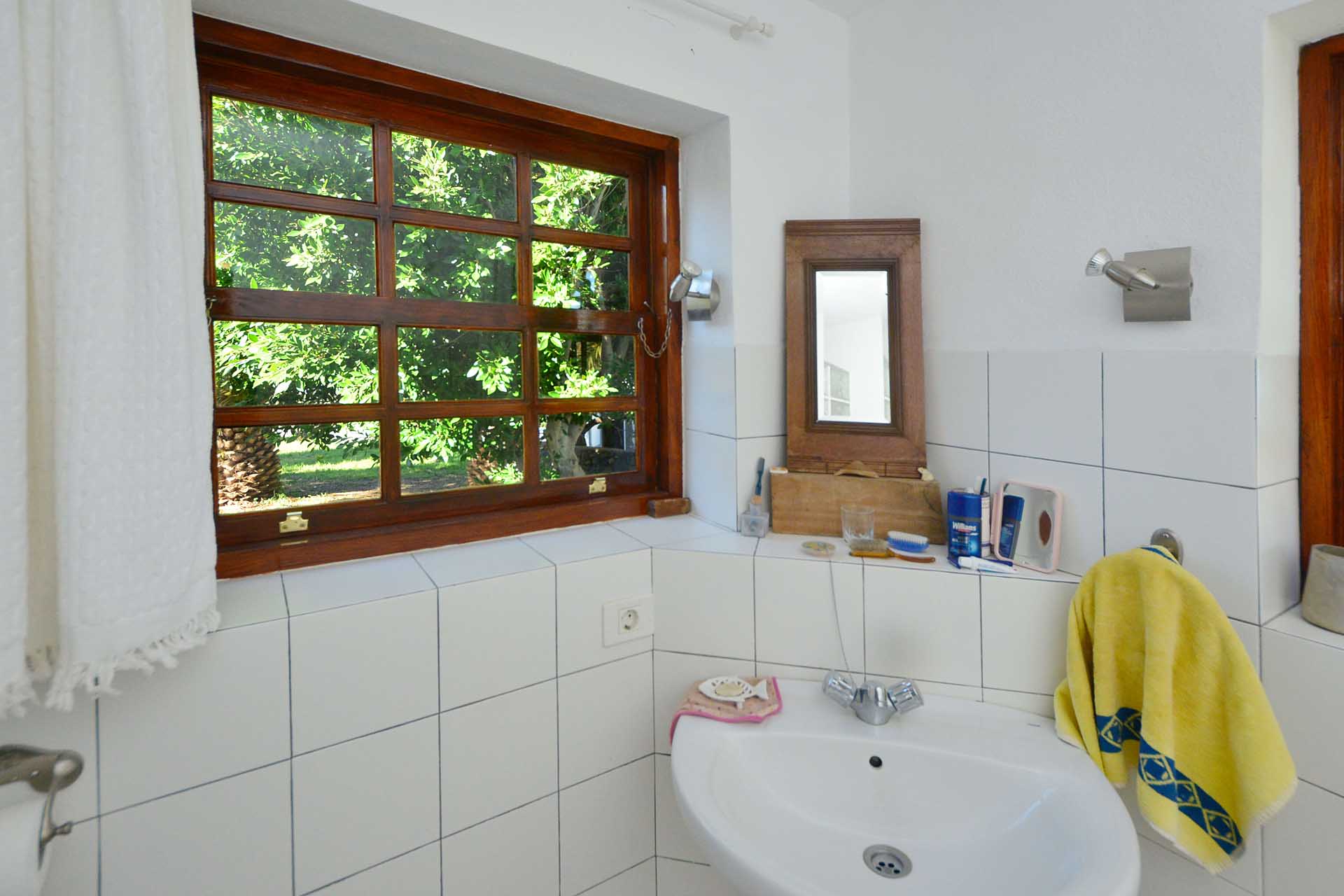 Vom Wohnzimmer gelangen Sie zur einen Seite in ein kleines Arbeits- oder Schlafzimmer, von dort in das Haupt-Schlafzimmer, das mit einer typisch palmerischen halbhohen Wand und offenem Durchgang abgeteilt ist. Zur anderen Seite gelangen Sie in das später angebaute, großzügige Badezimmer, das sowohl über eine Dusche, als auch über eine Badewanne verfügt und mit zwei Fenstern und einem kleinen Hauswirtschaftsbereich aufwartet. Es verfügt auch über eine Außentüre, so dass der Weg von der Waschmaschine ins Freie kurz ist.