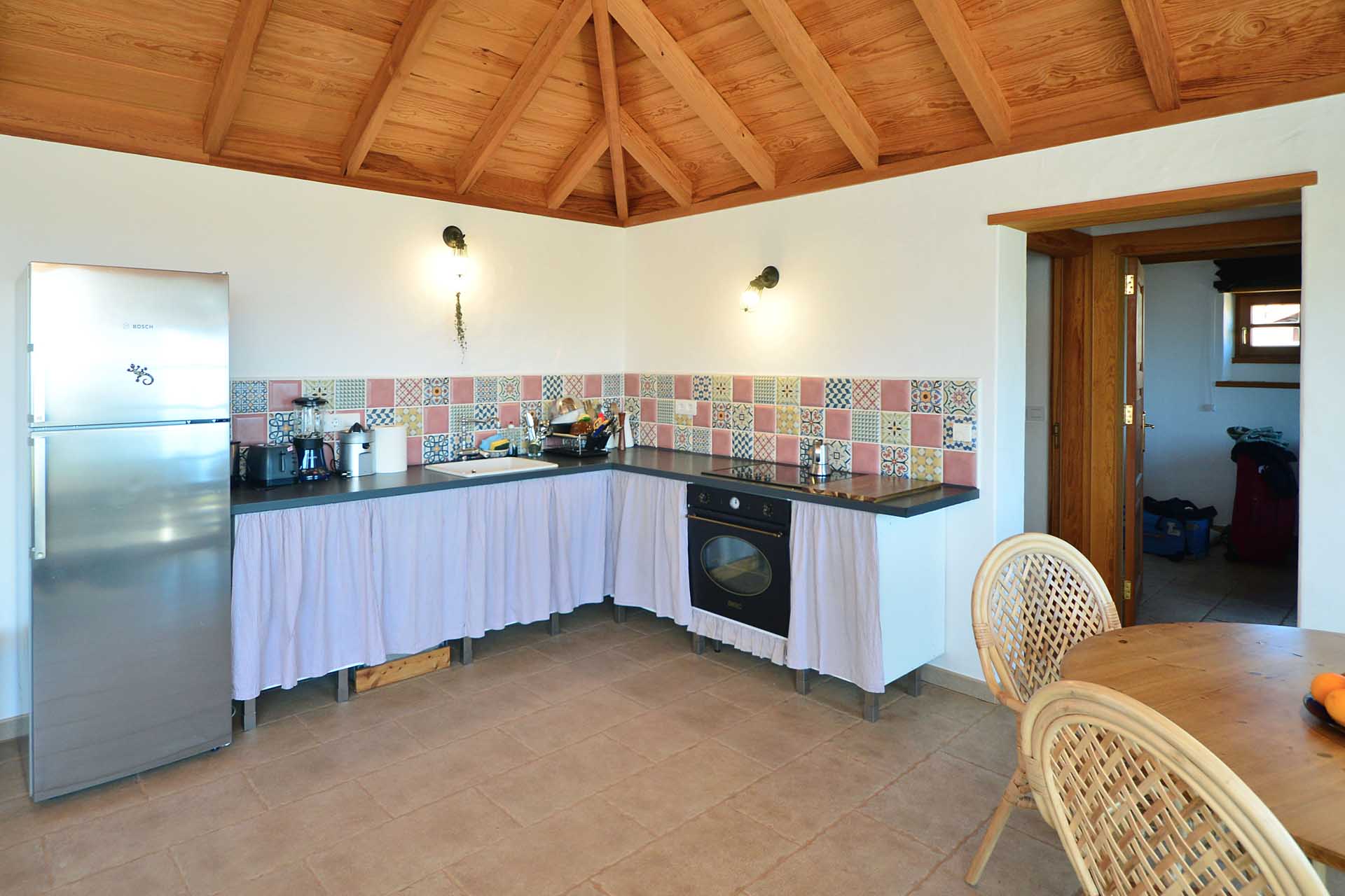 Wie auf den Kanarischen Inseln üblich, betreten Sie das Haus durch den Haupteingang oder die Terrasse und befinden sich gleich in der großzügigen Wohnküche – damit der Weg mit der Kaffeetasse in der Hand ins freie möglichst kurz ist. Der Wohnbereich zeichnet sich durch seinen wundervollen Meerblick aus, den Sie durch das tiefliegende Panoramafenster auch aus dem Sofa genießen können. Ein sehr schöner Essplatz, ebenfalls mit Meerblick, befindet sich gleich neben der verglasten Terrassentür.