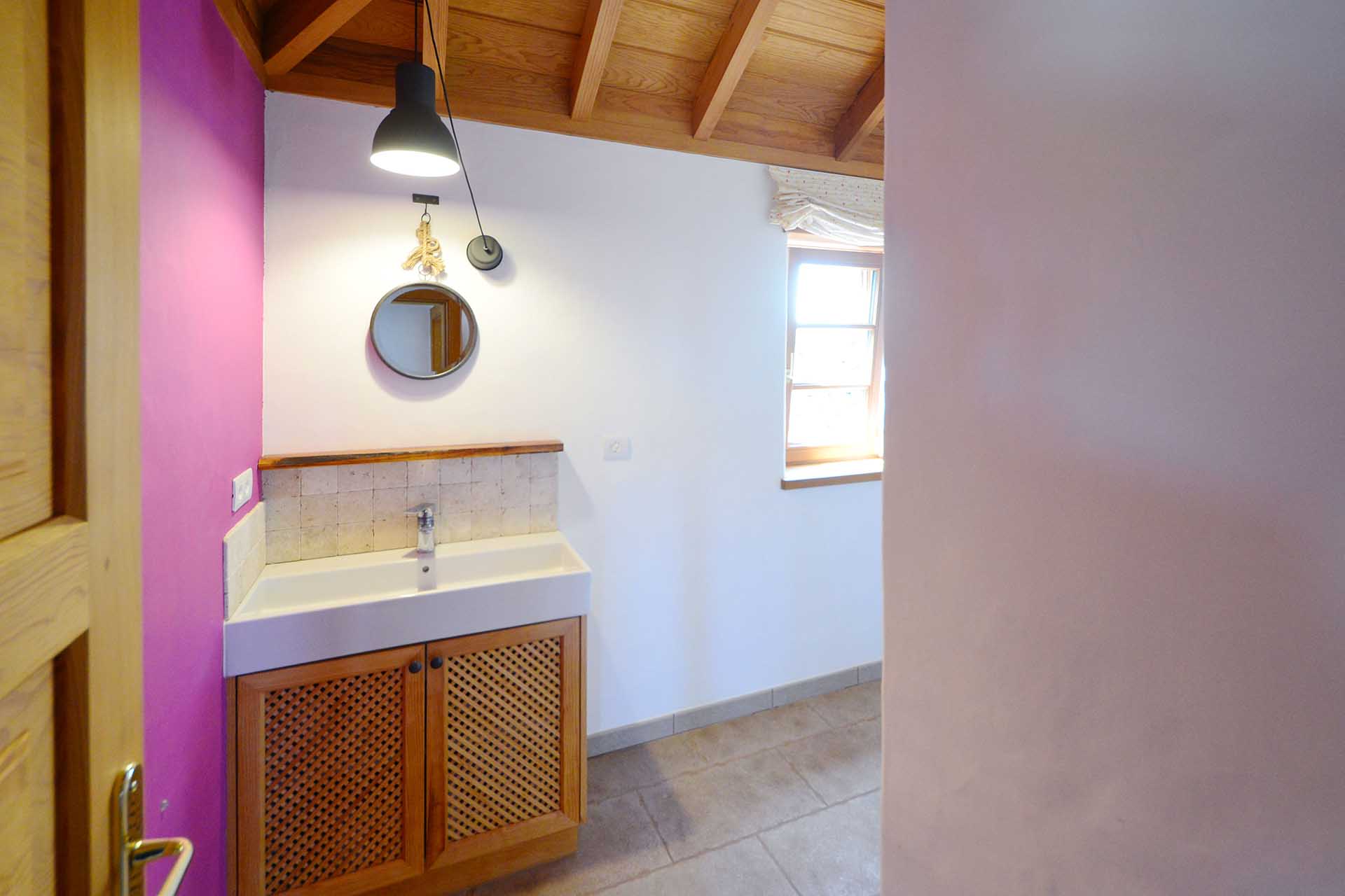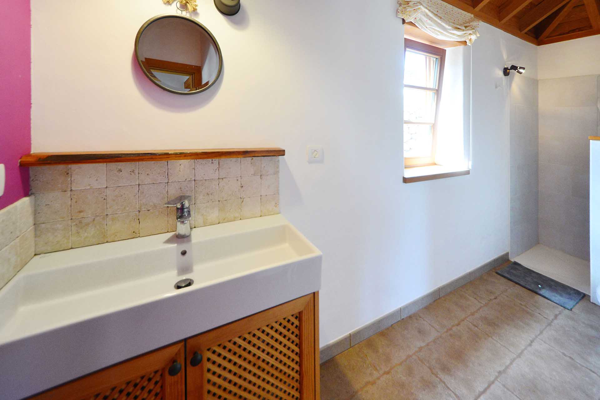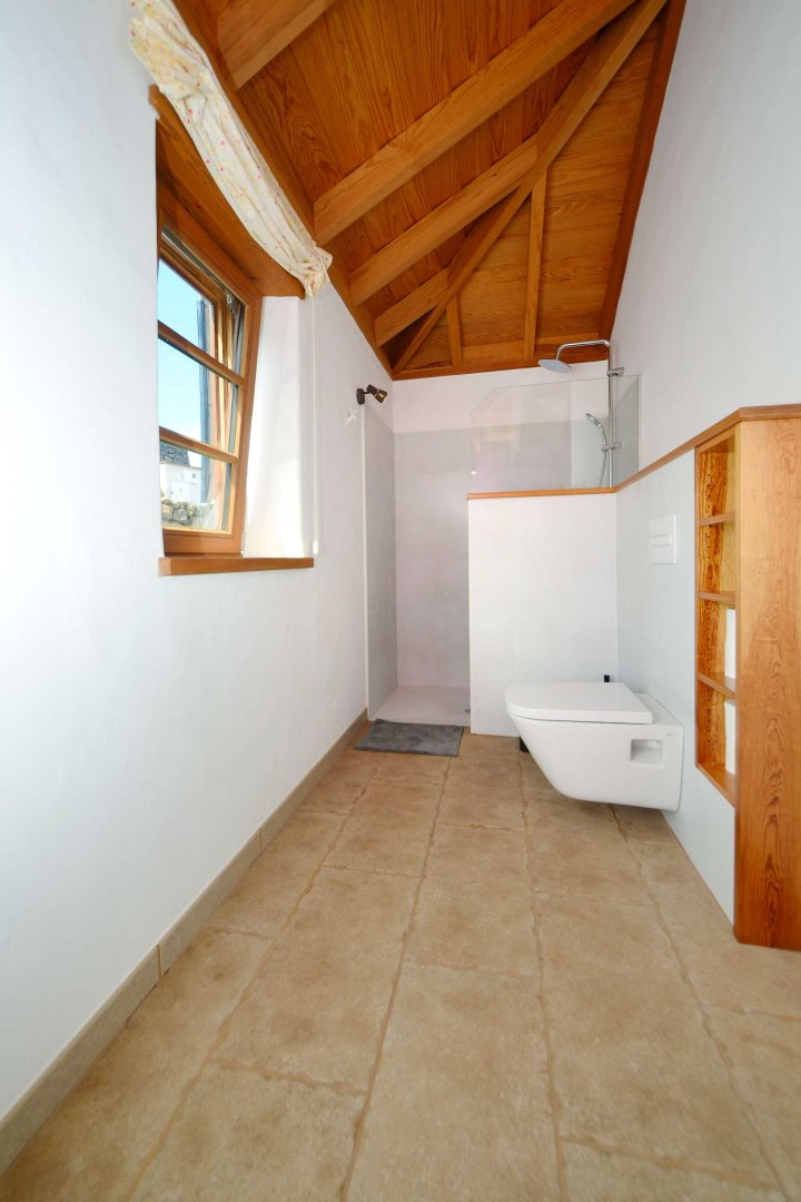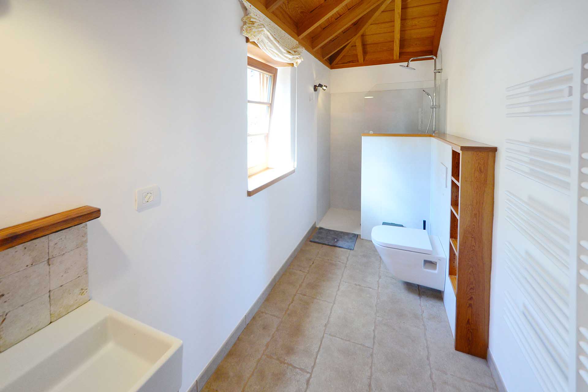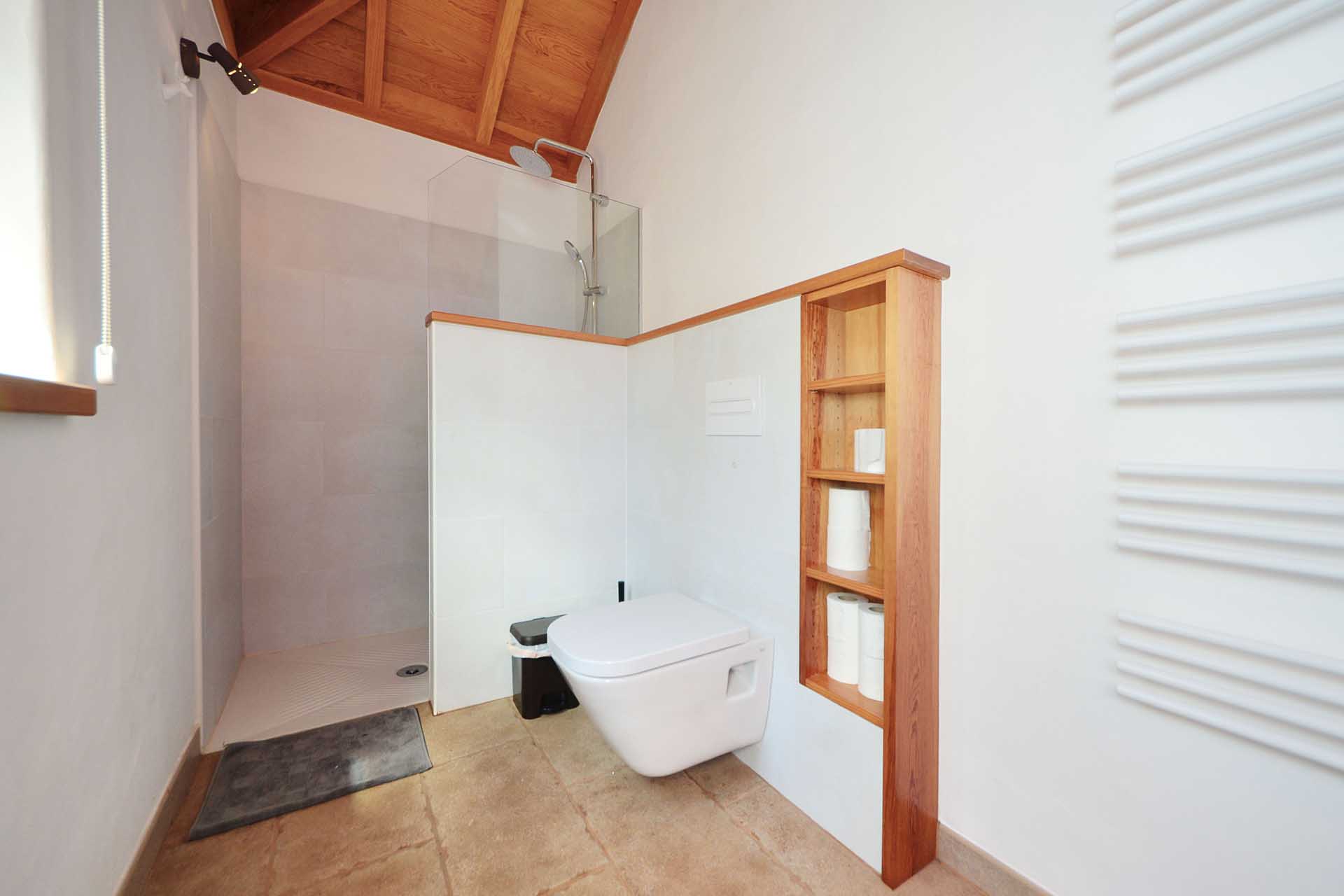 Nach Westen schließt sich das großzügige Master-Schlafzimmer an, mit direktem Zugang zum Badezimmer mit bodengleicher, großer Dusche, freihängendem WC und Waschtisch und vom Tischler gefertigtem Unterschrank.