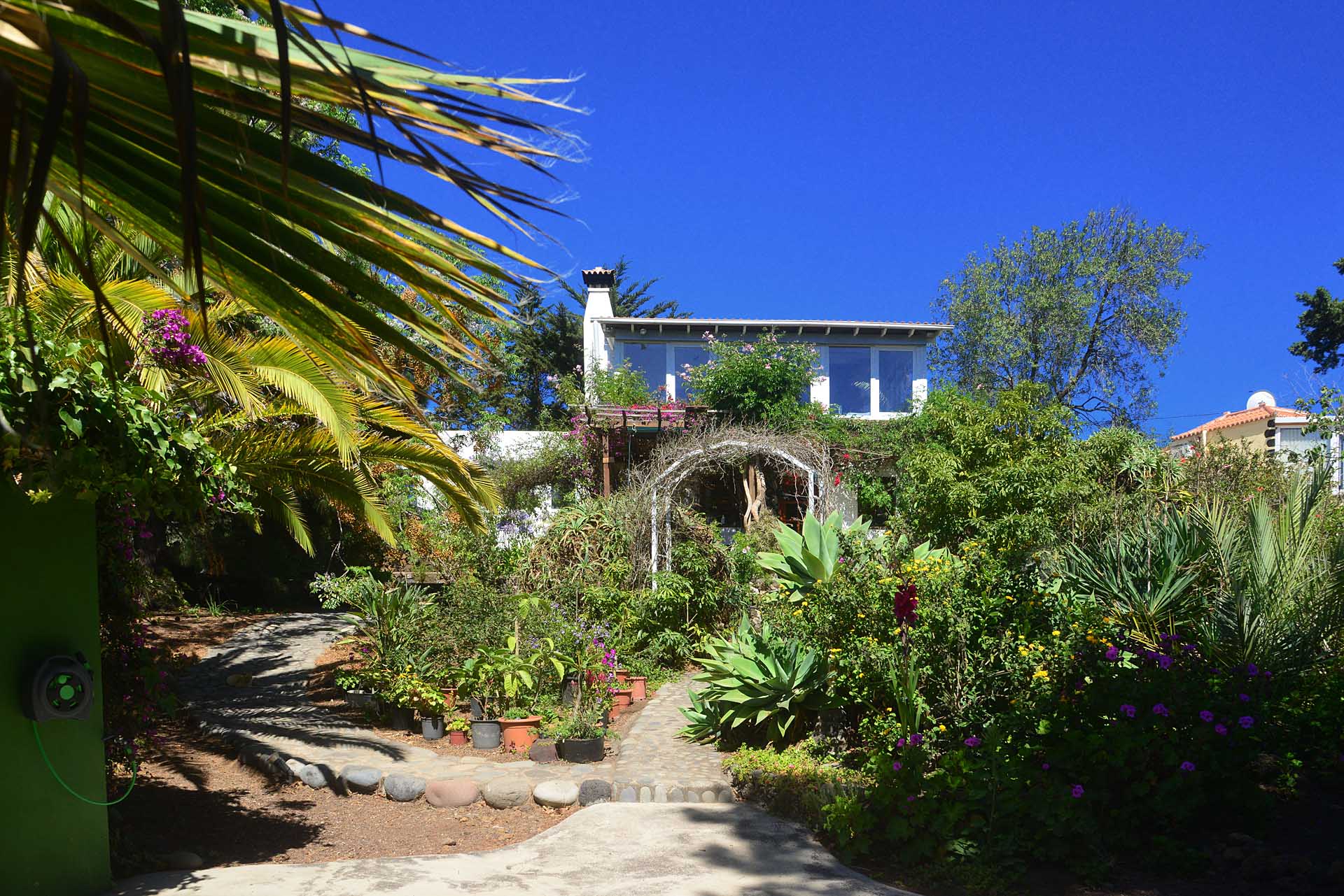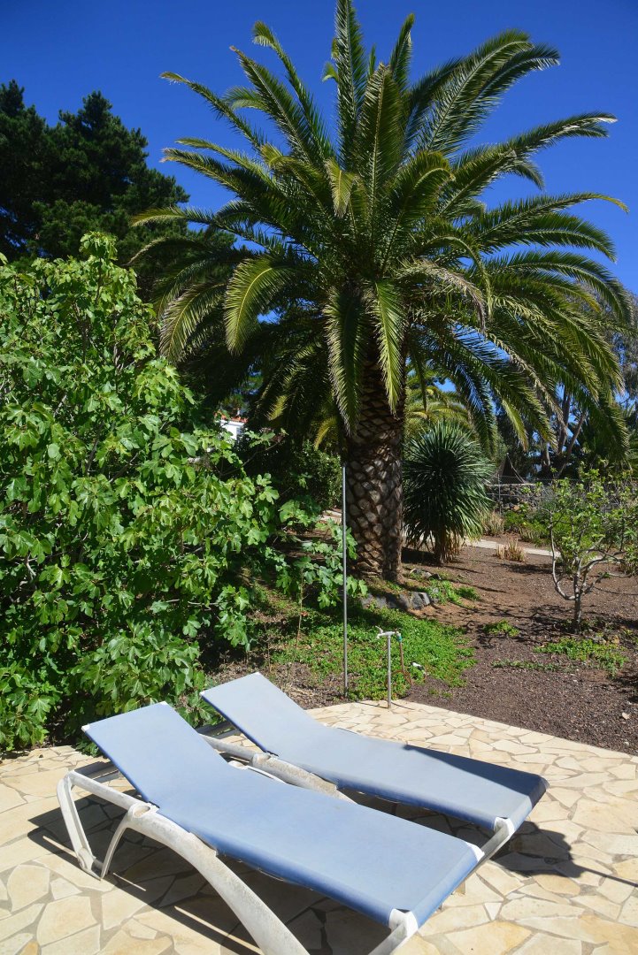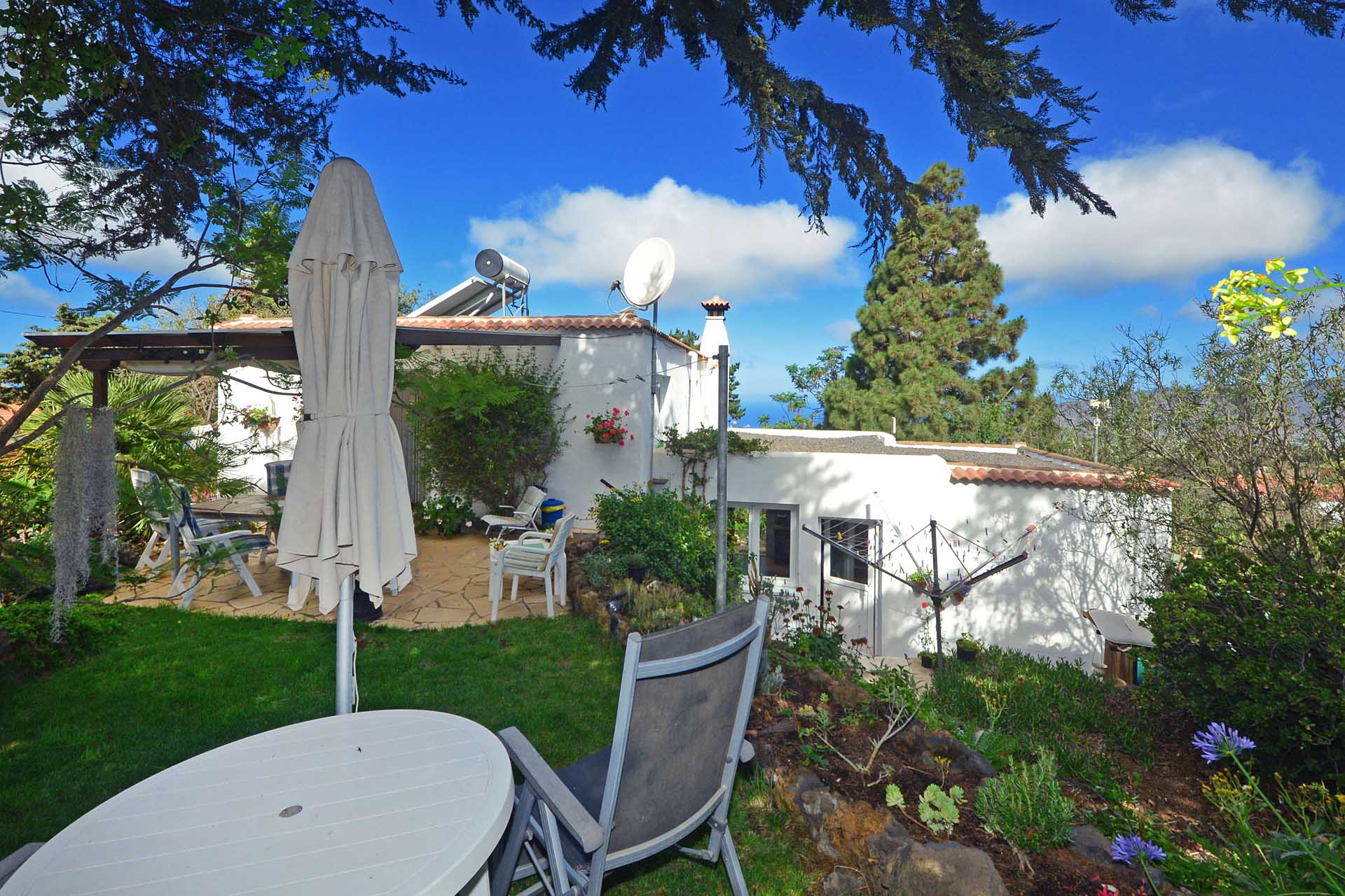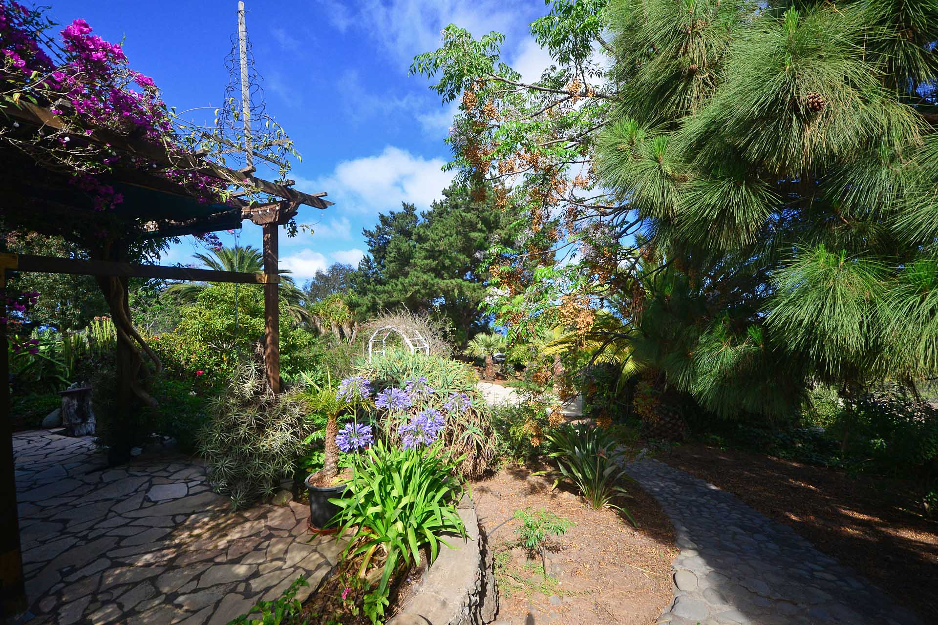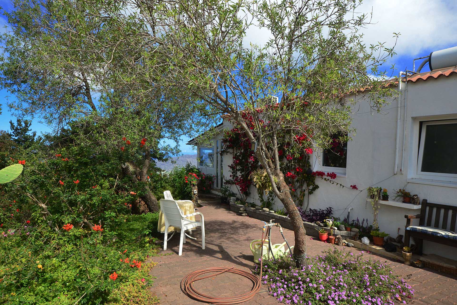 Der Garten wurde liebevoll mit subtropischen Zierpflanzen und einigen Fruchtbäumen angelegt sowie mit gut begehbaren Wegen und einer Zufahrt für normale PKWs bis zur Hauptebene gestaltet. Die Bewässerung erfolgt überwiegend mit einer automatischen Bewässerungsanlage, zwei Zisternen für Trink- und Gartenwasser sorgen für ausreichenden Wasservorrat, der über gemietete, private Wasserrechte mit ca. 1,2 l/Minute gespeist wird. Insgesamt stehen den Bewohnern vier, teilweise überdachte Terrassen mit guter Privatsphäre zur Verfügung.
