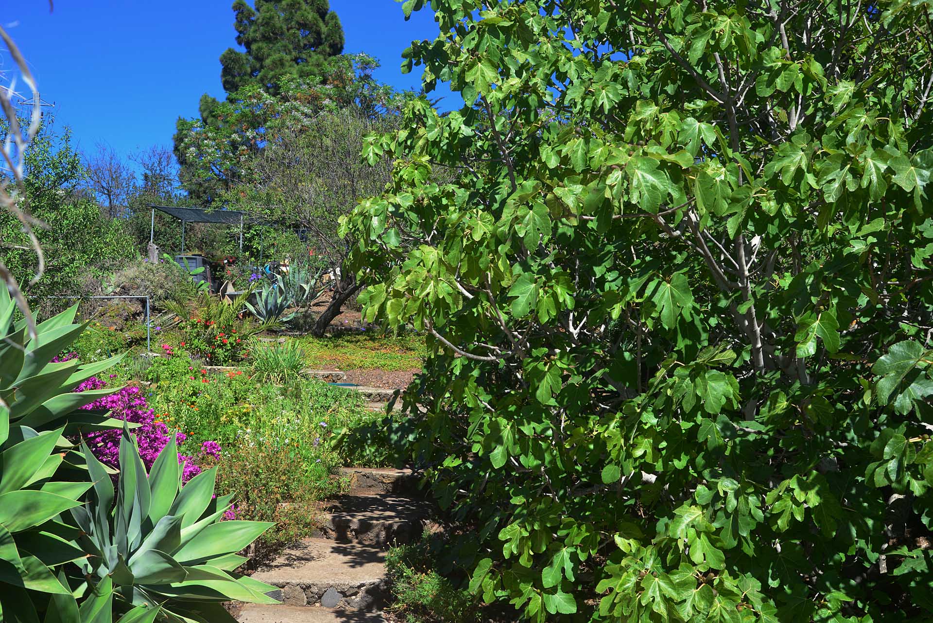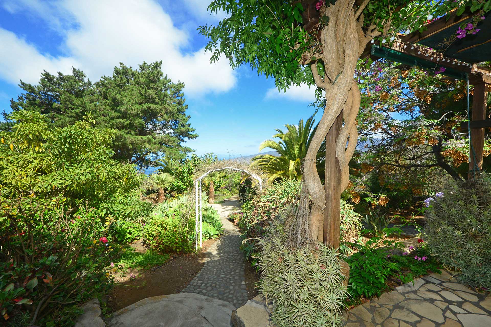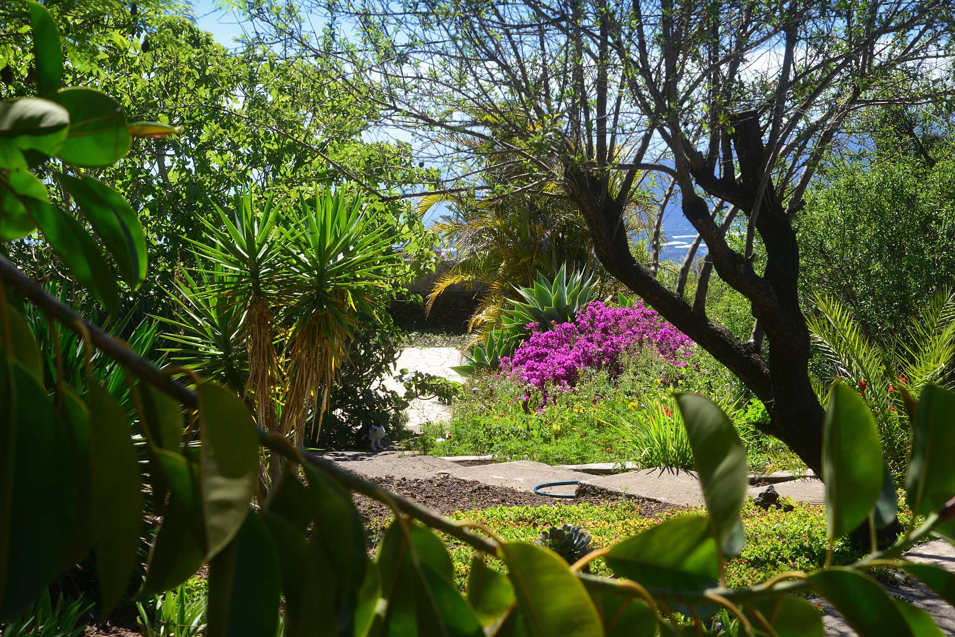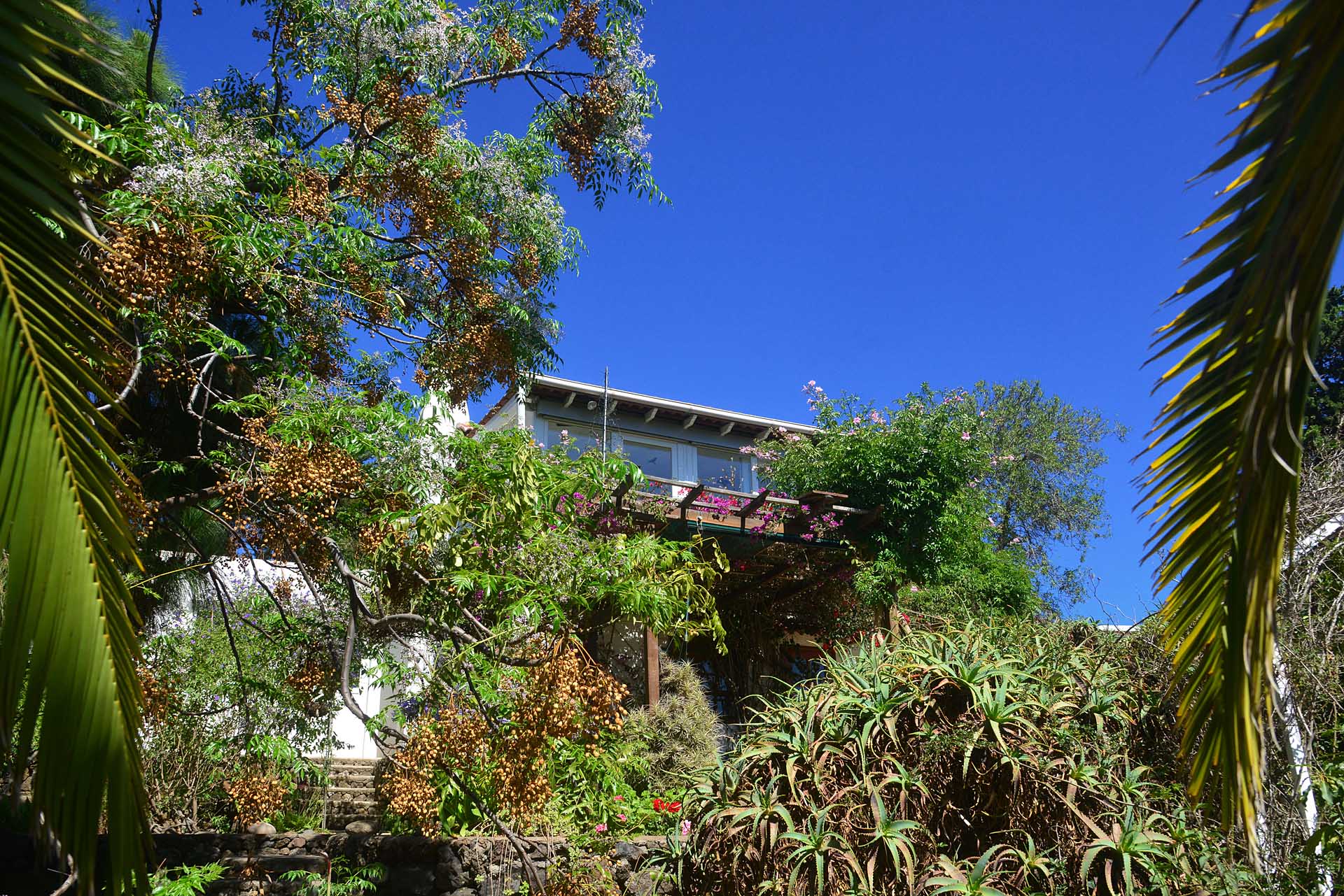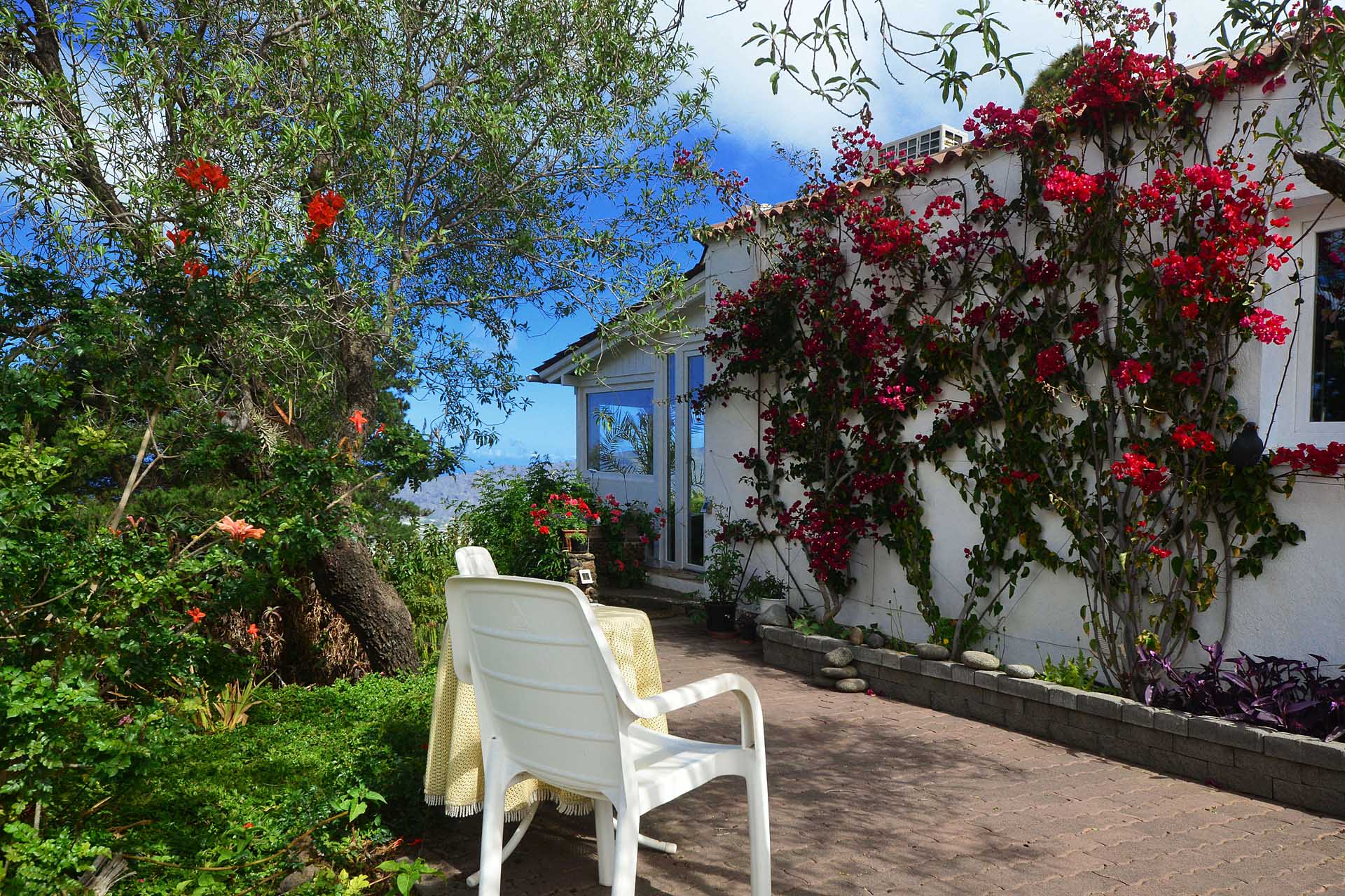 Der Garten wurde liebevoll mit subtropischen Zierpflanzen und einigen Fruchtbäumen angelegt sowie mit gut begehbaren Wegen und einer Zufahrt für normale PKWs bis zur Hauptebene gestaltet. Die Bewässerung erfolgt überwiegend mit einer automatischen Bewässerungsanlage, zwei Zisternen für Trink- und Gartenwasser sorgen für ausreichenden Wasservorrat, der über gemietete, private Wasserrechte mit ca. 1,2 l/Minute gespeist wird. Insgesamt stehen den Bewohnern vier, teilweise überdachte Terrassen mit guter Privatsphäre zur Verfügung.