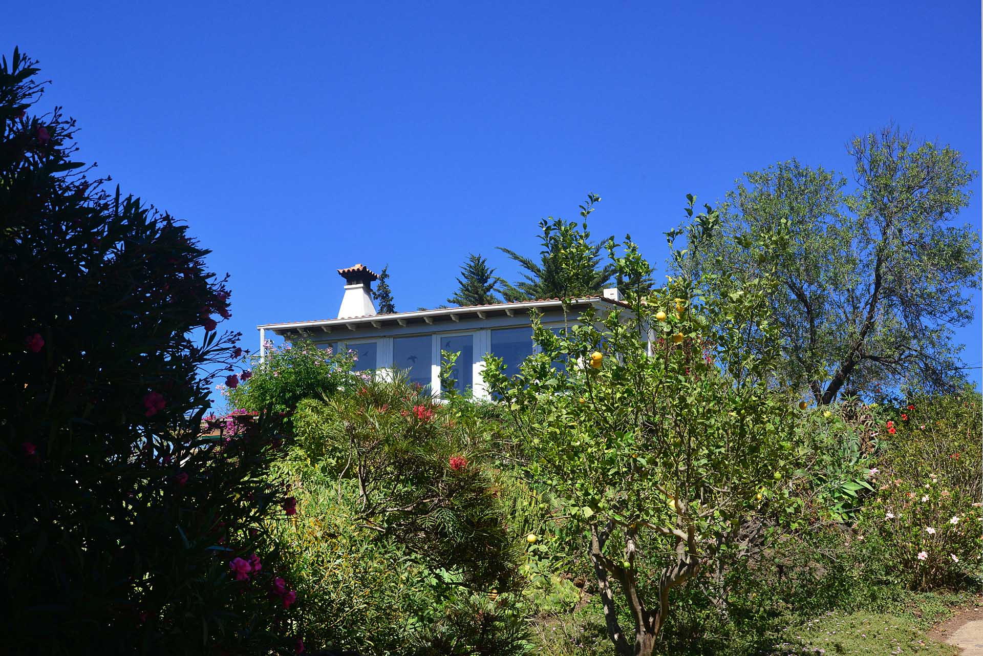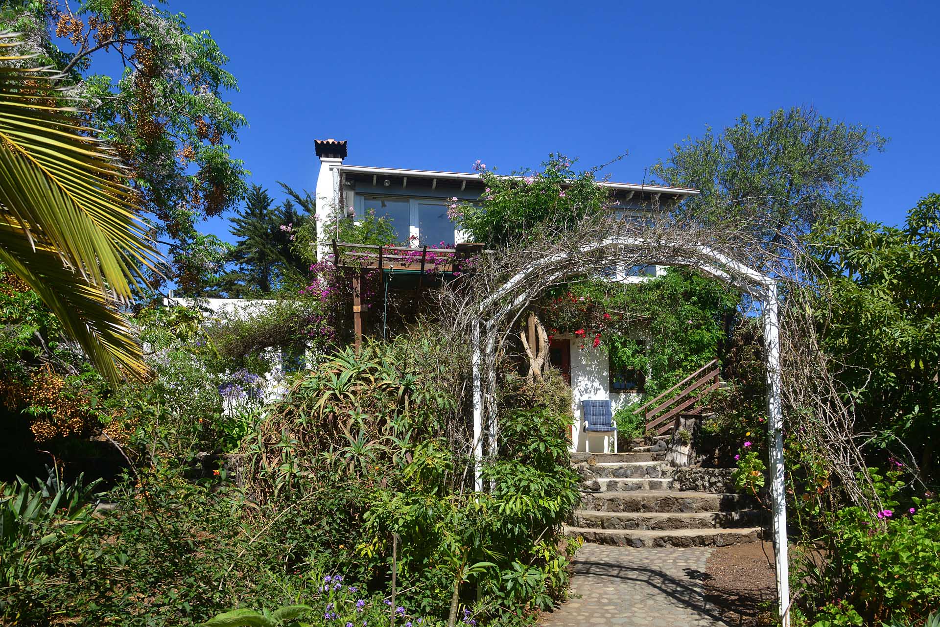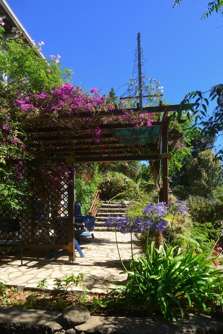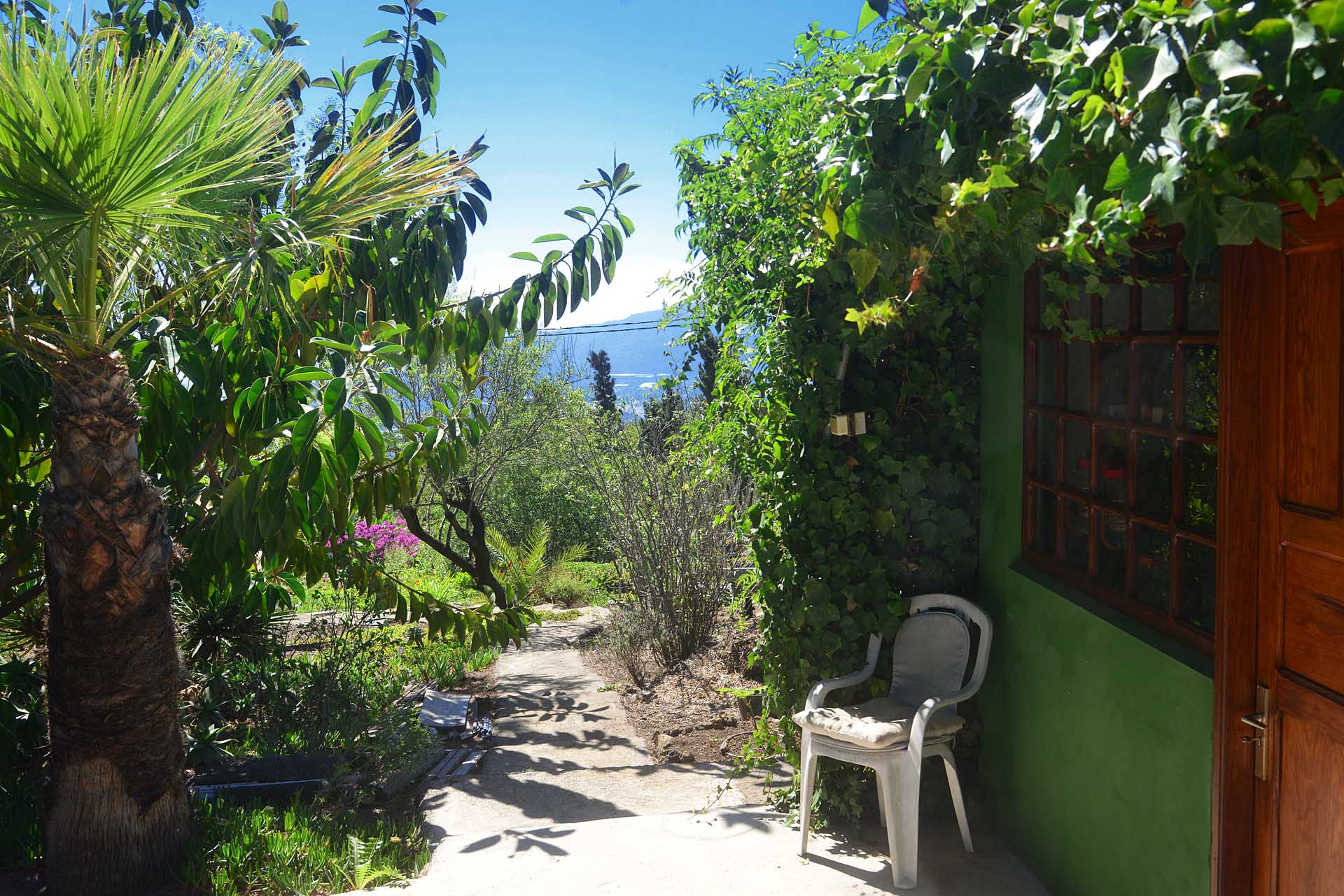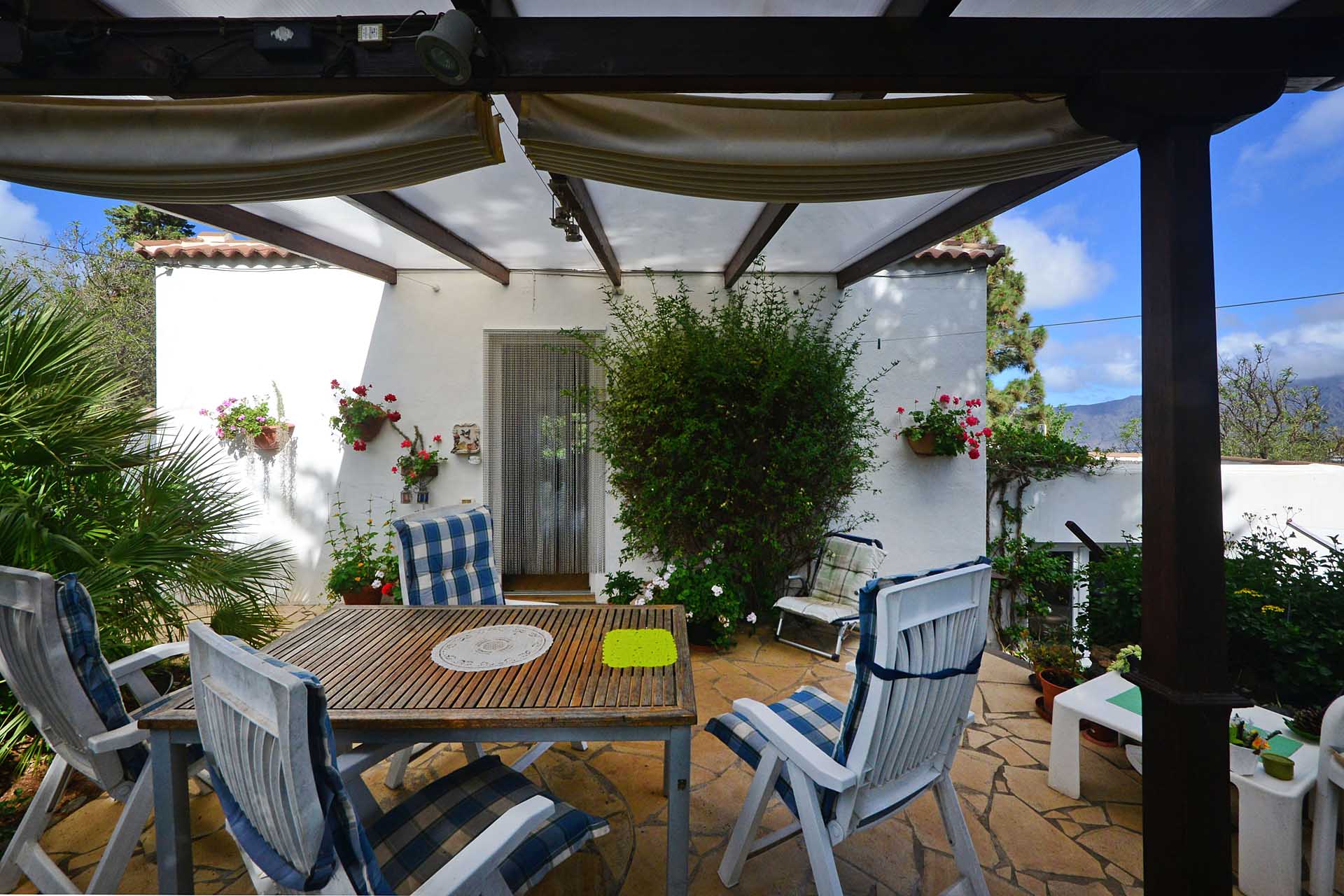 Der Garten wurde liebevoll mit subtropischen Zierpflanzen und einigen Fruchtbäumen angelegt sowie mit gut begehbaren Wegen und einer Zufahrt für normale PKWs bis zur Hauptebene gestaltet. Die Bewässerung erfolgt überwiegend mit einer automatischen Bewässerungsanlage, zwei Zisternen für Trink- und Gartenwasser sorgen für ausreichenden Wasservorrat, der über gemietete, private Wasserrechte mit ca. 1,2 l/Minute gespeist wird. Insgesamt stehen den Bewohnern vier, teilweise überdachte Terrassen mit guter Privatsphäre zur Verfügung.