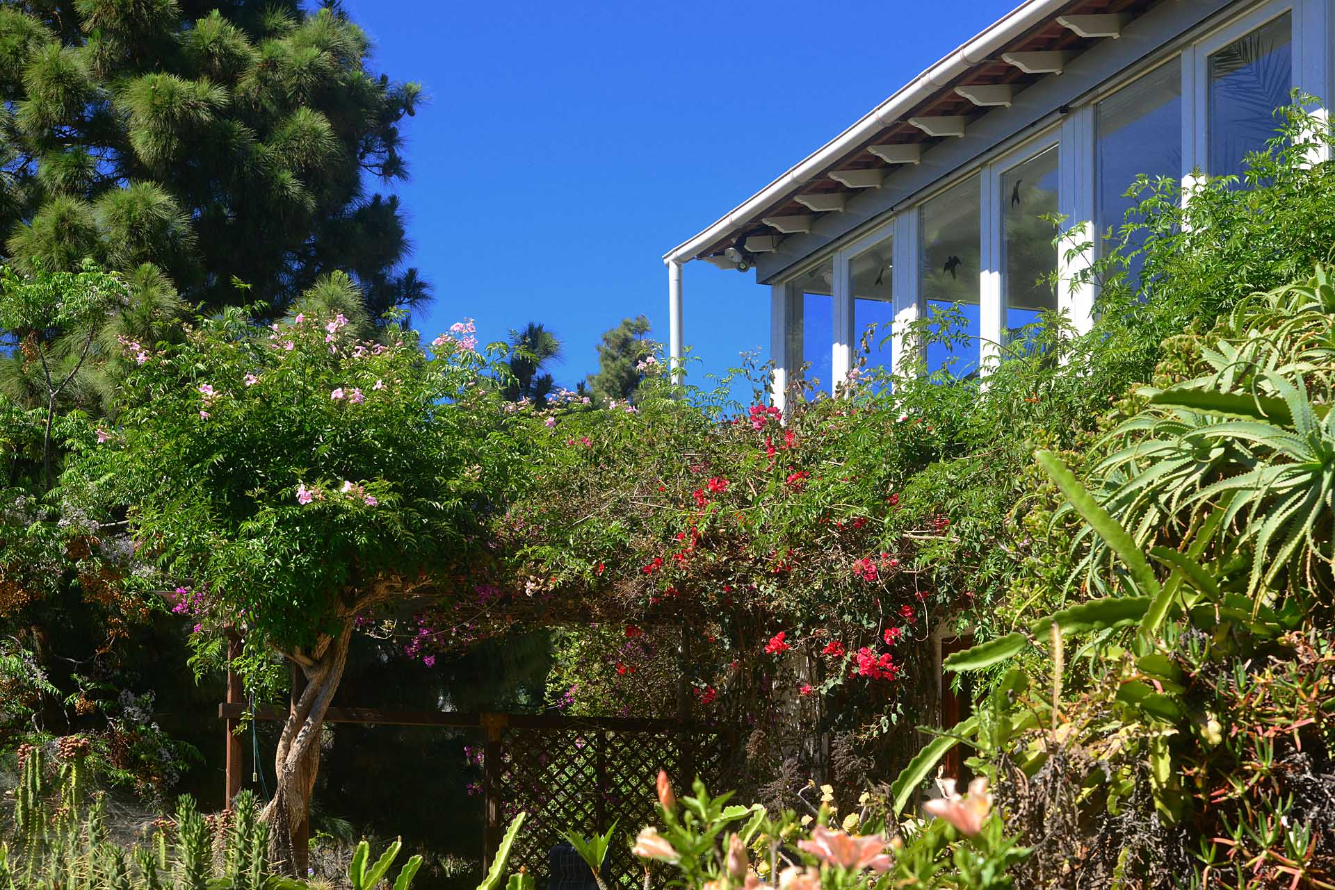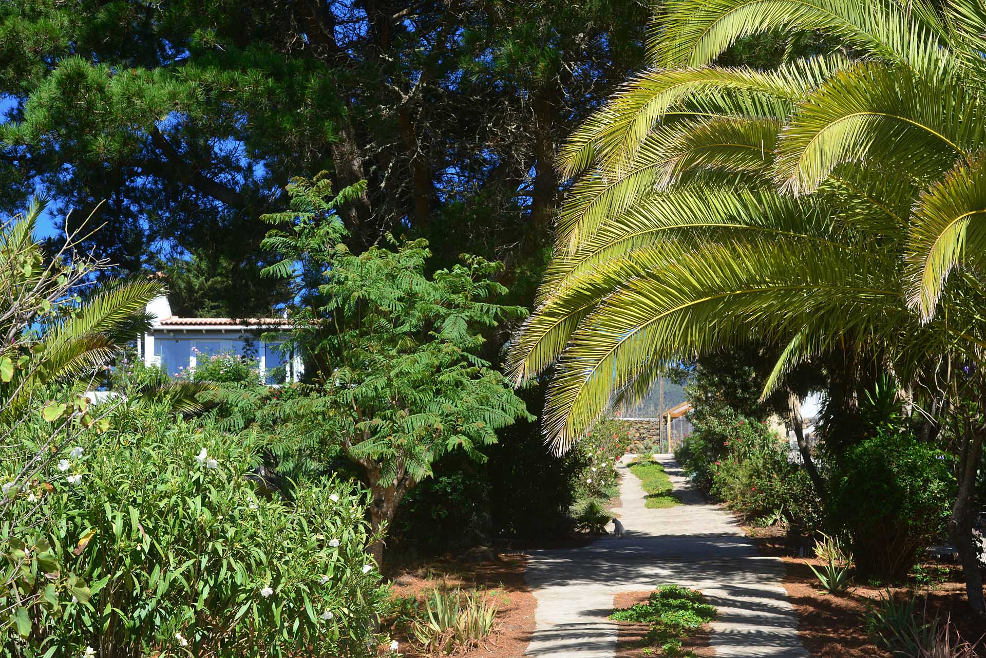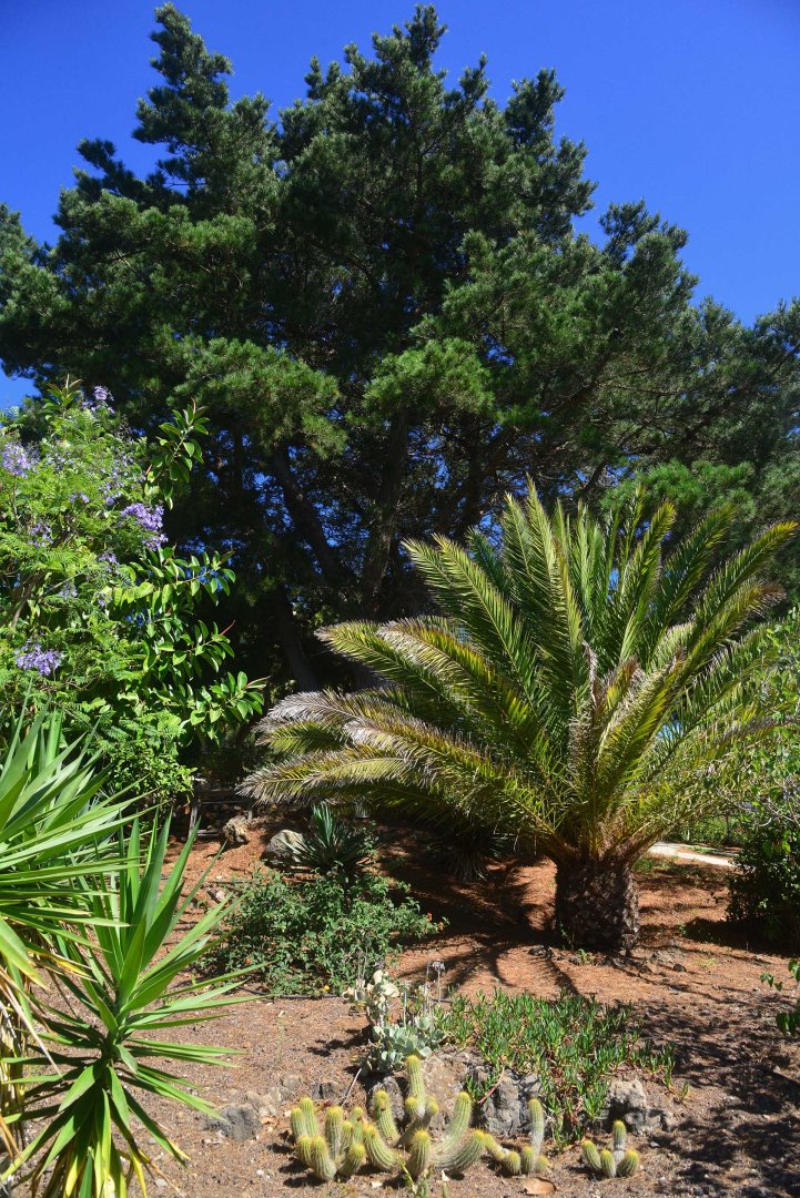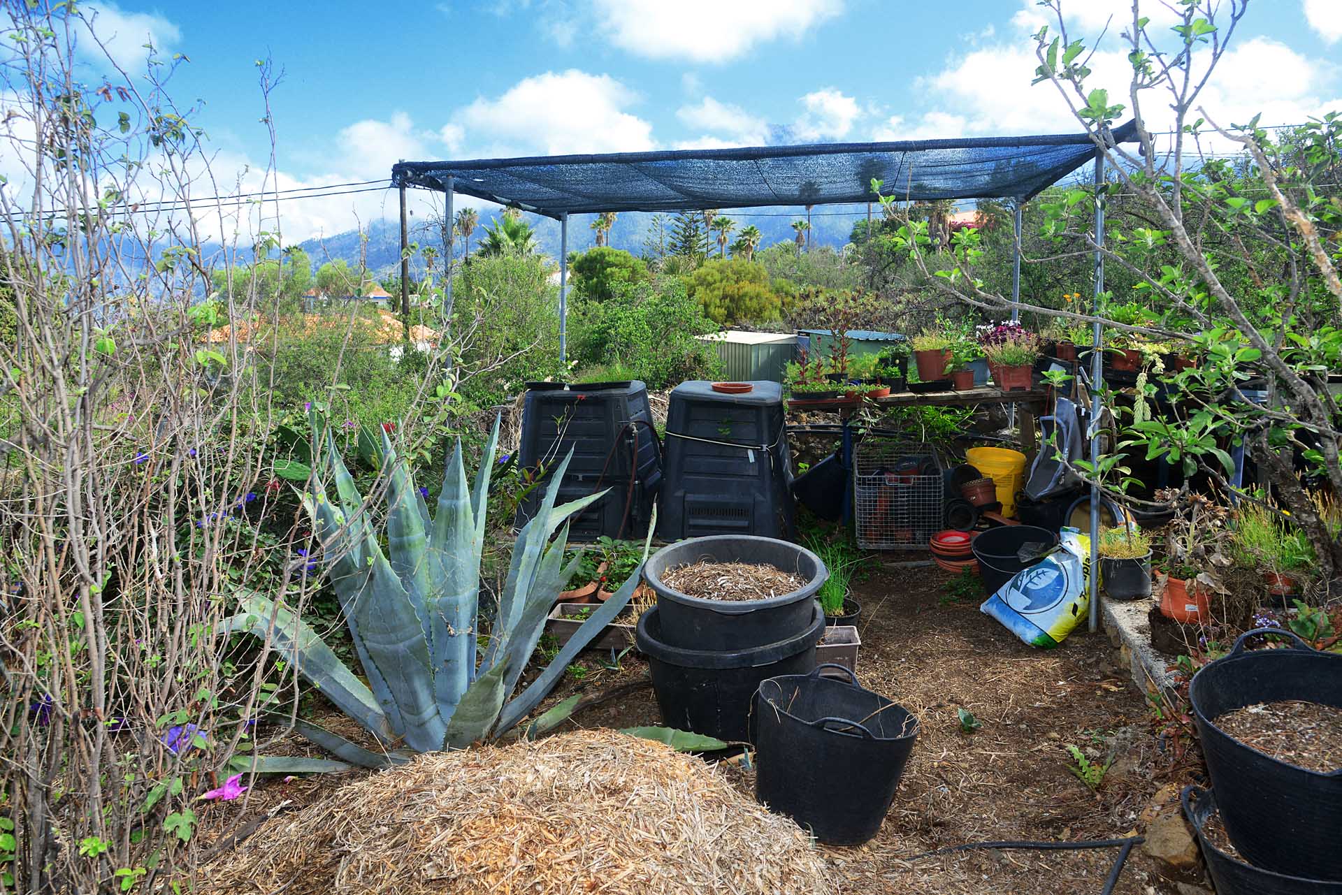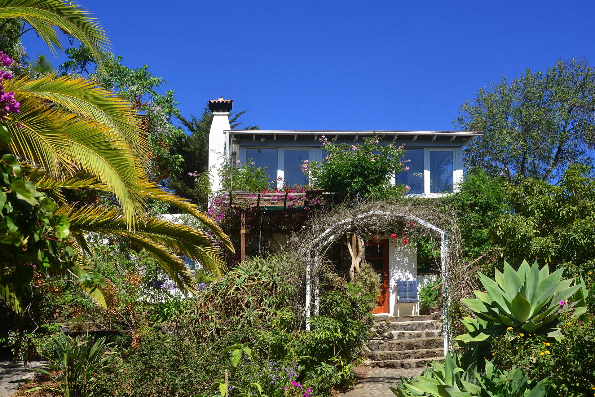 Der Garten wurde liebevoll mit subtropischen Zierpflanzen und einigen Fruchtbäumen angelegt sowie mit gut begehbaren Wegen und einer Zufahrt für normale PKWs bis zur Hauptebene gestaltet. Die Bewässerung erfolgt überwiegend mit einer automatischen Bewässerungsanlage, zwei Zisternen für Trink- und Gartenwasser sorgen für ausreichenden Wasservorrat, der über gemietete, private Wasserrechte mit ca. 1,2 l/Minute gespeist wird. Insgesamt stehen den Bewohnern vier, teilweise überdachte Terrassen mit guter Privatsphäre zur Verfügung.