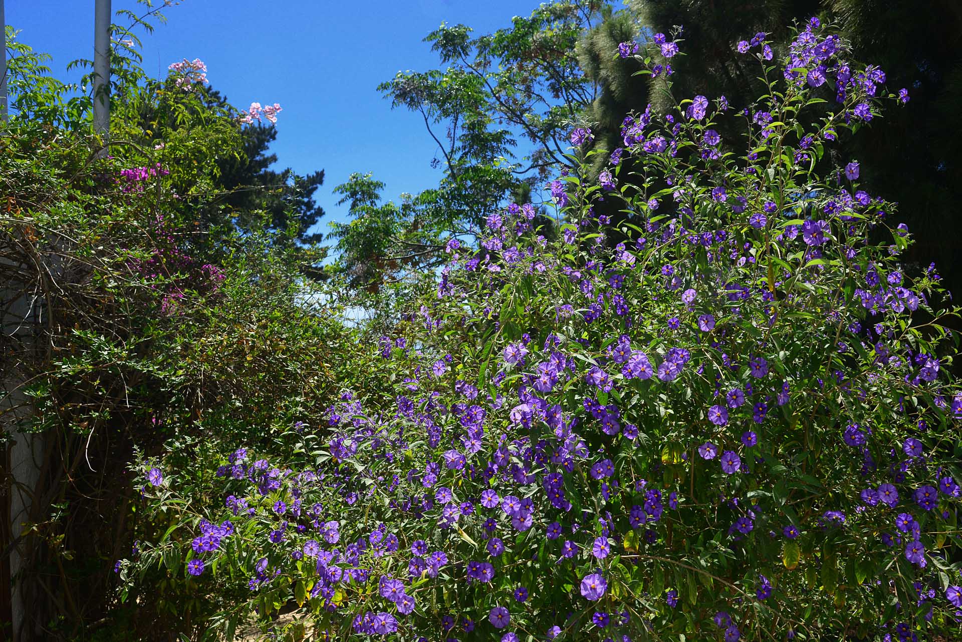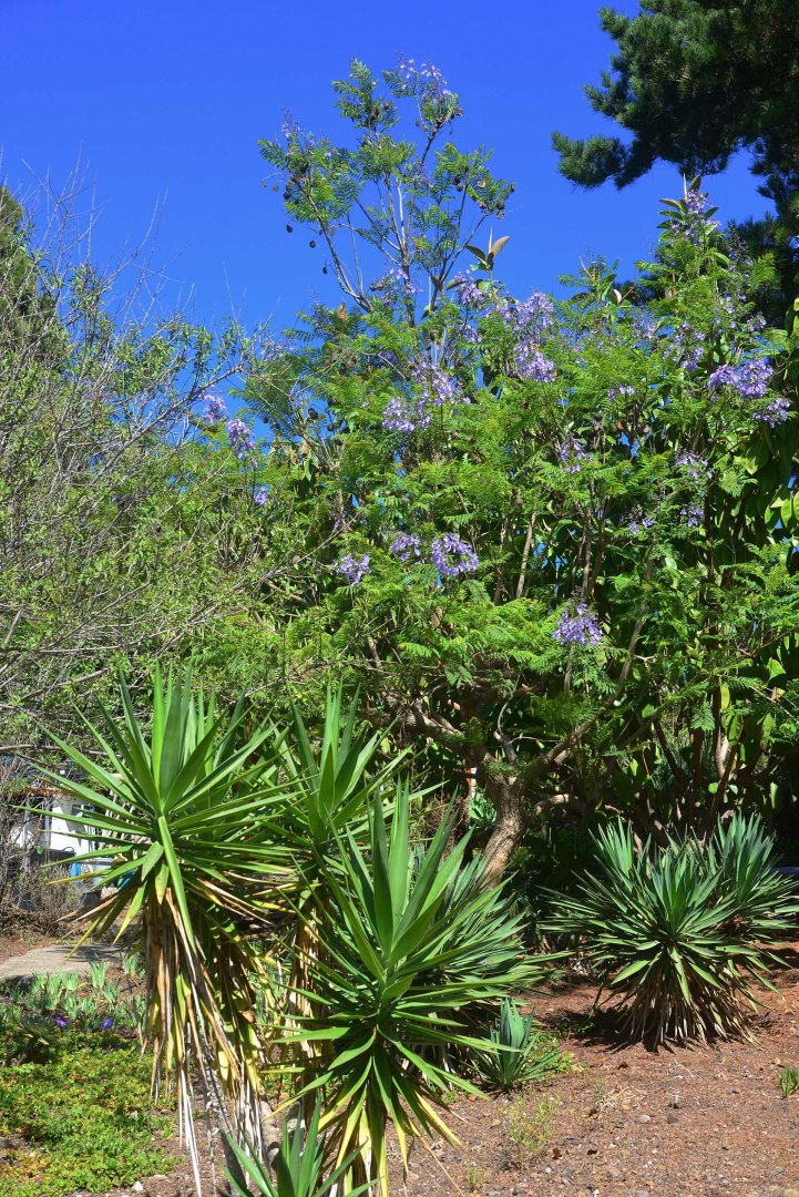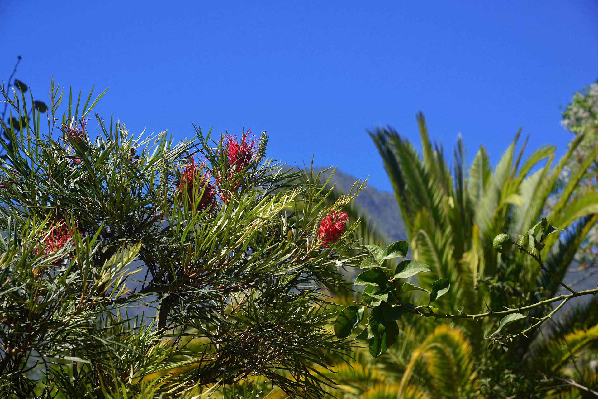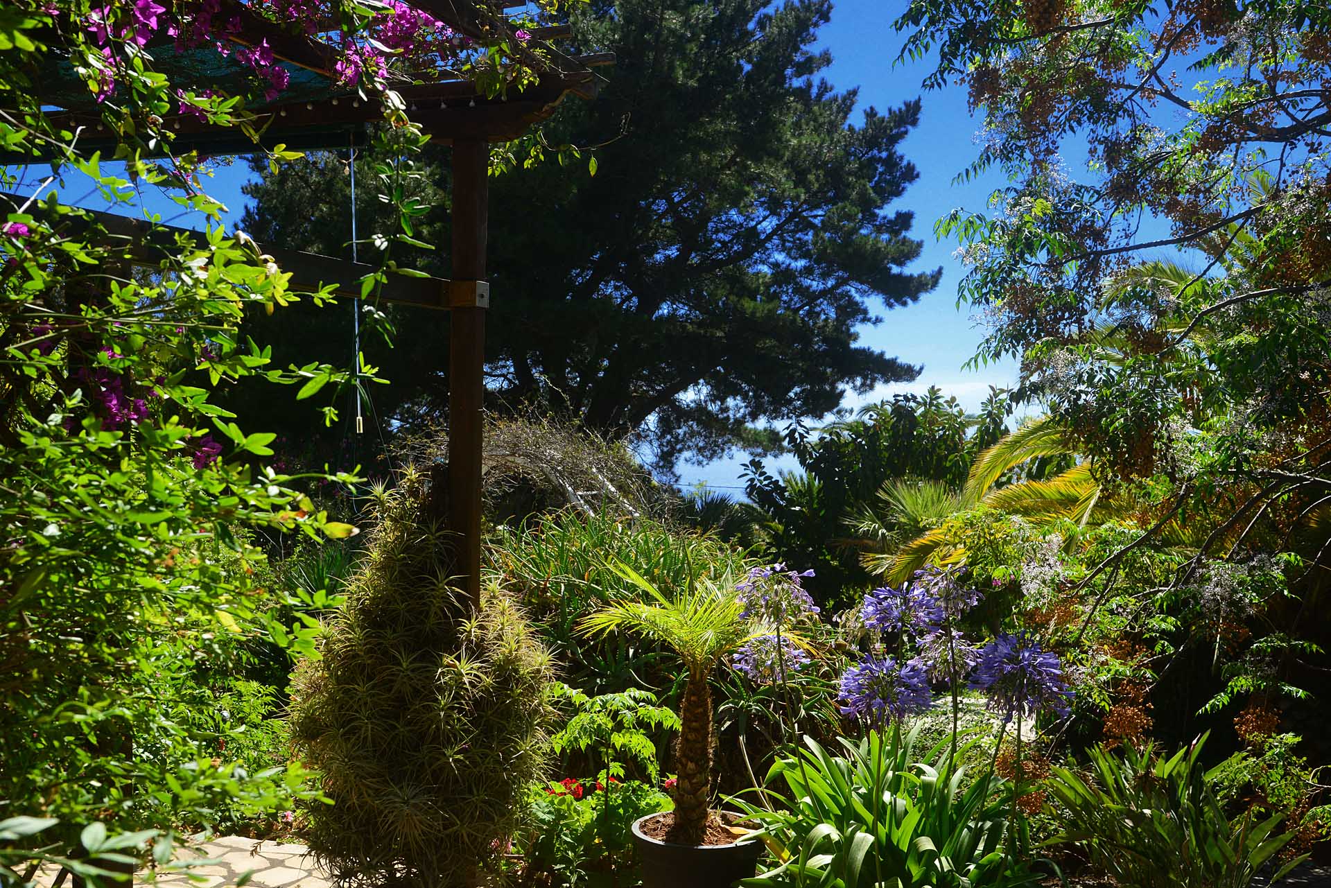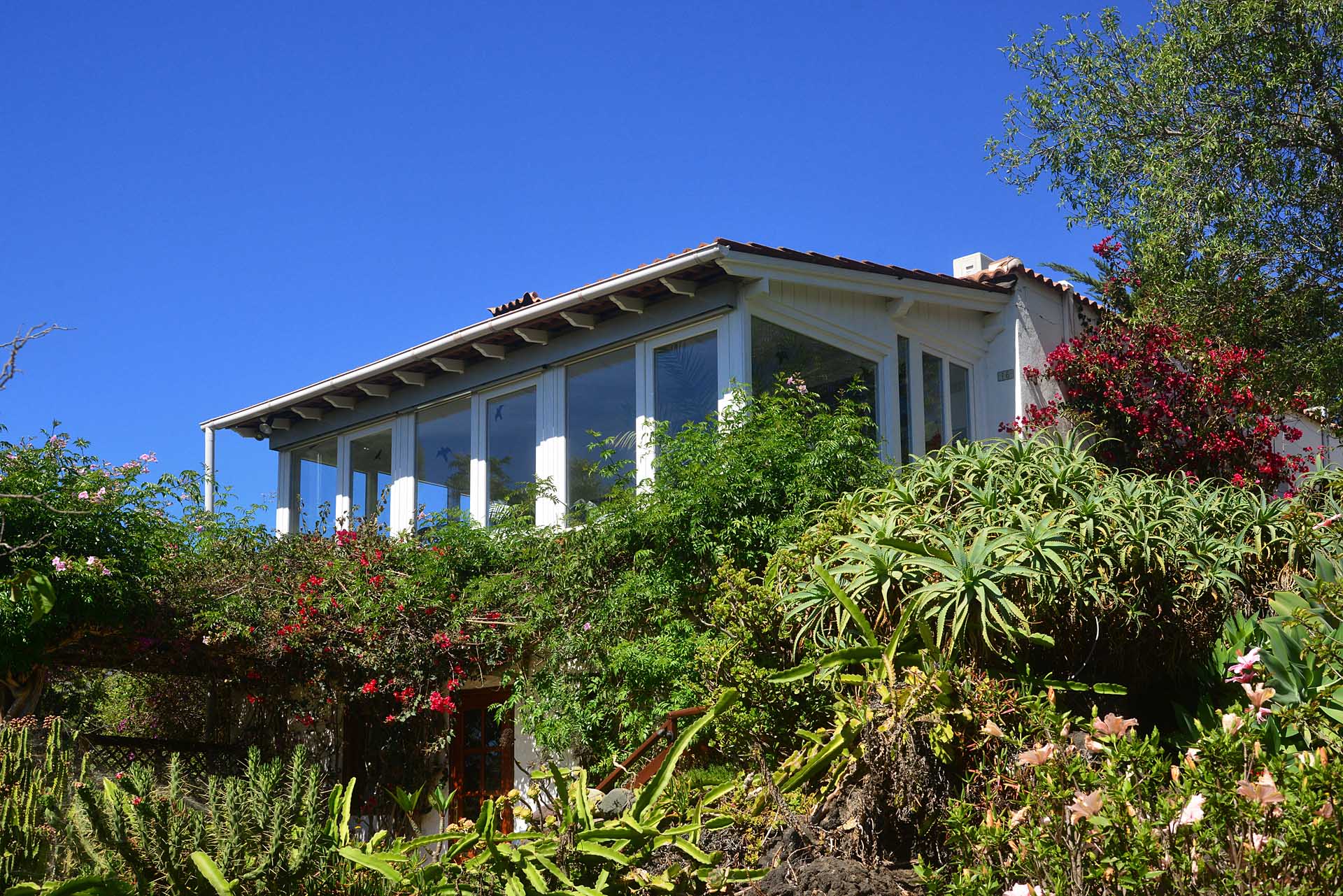 Der Garten wurde liebevoll mit subtropischen Zierpflanzen und einigen Fruchtbäumen angelegt sowie mit gut begehbaren Wegen und einer Zufahrt für normale PKWs bis zur Hauptebene gestaltet. Die Bewässerung erfolgt überwiegend mit einer automatischen Bewässerungsanlage, zwei Zisternen für Trink- und Gartenwasser sorgen für ausreichenden Wasservorrat, der über gemietete, private Wasserrechte mit ca. 1,2 l/Minute gespeist wird. Insgesamt stehen den Bewohnern vier, teilweise überdachte Terrassen mit guter Privatsphäre zur Verfügung.