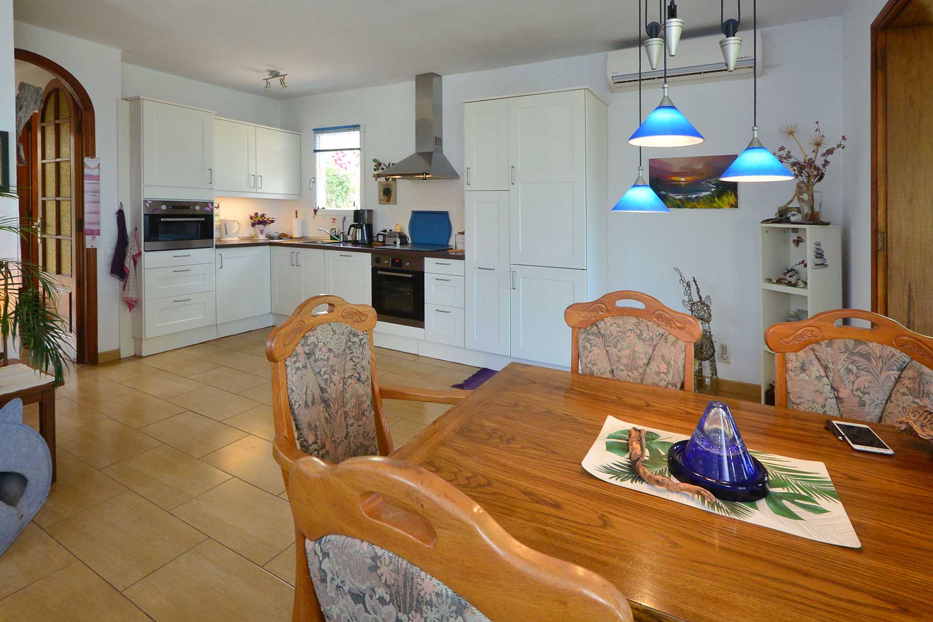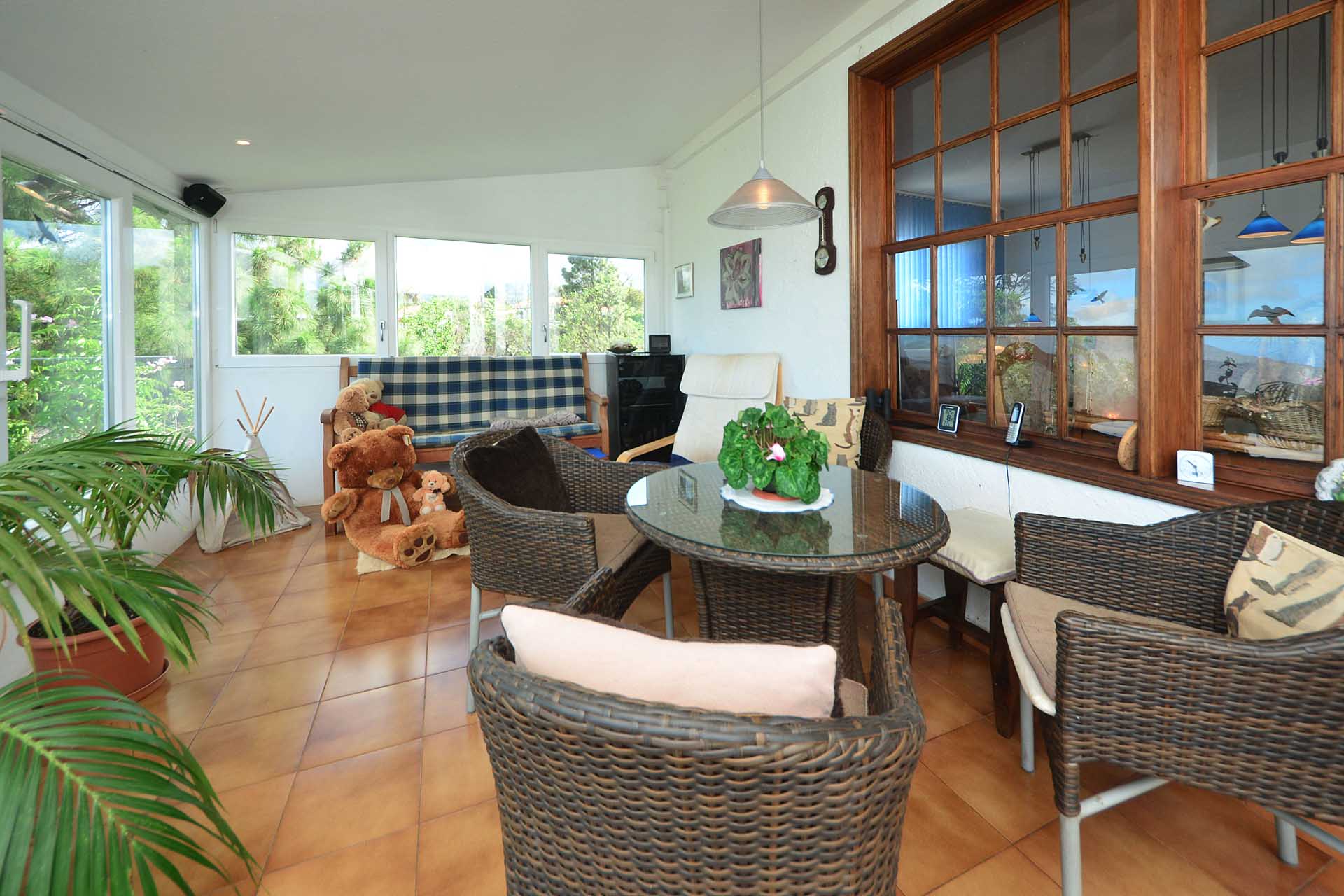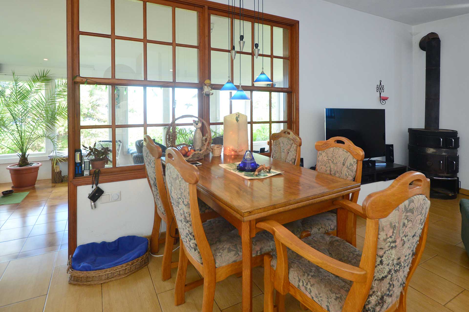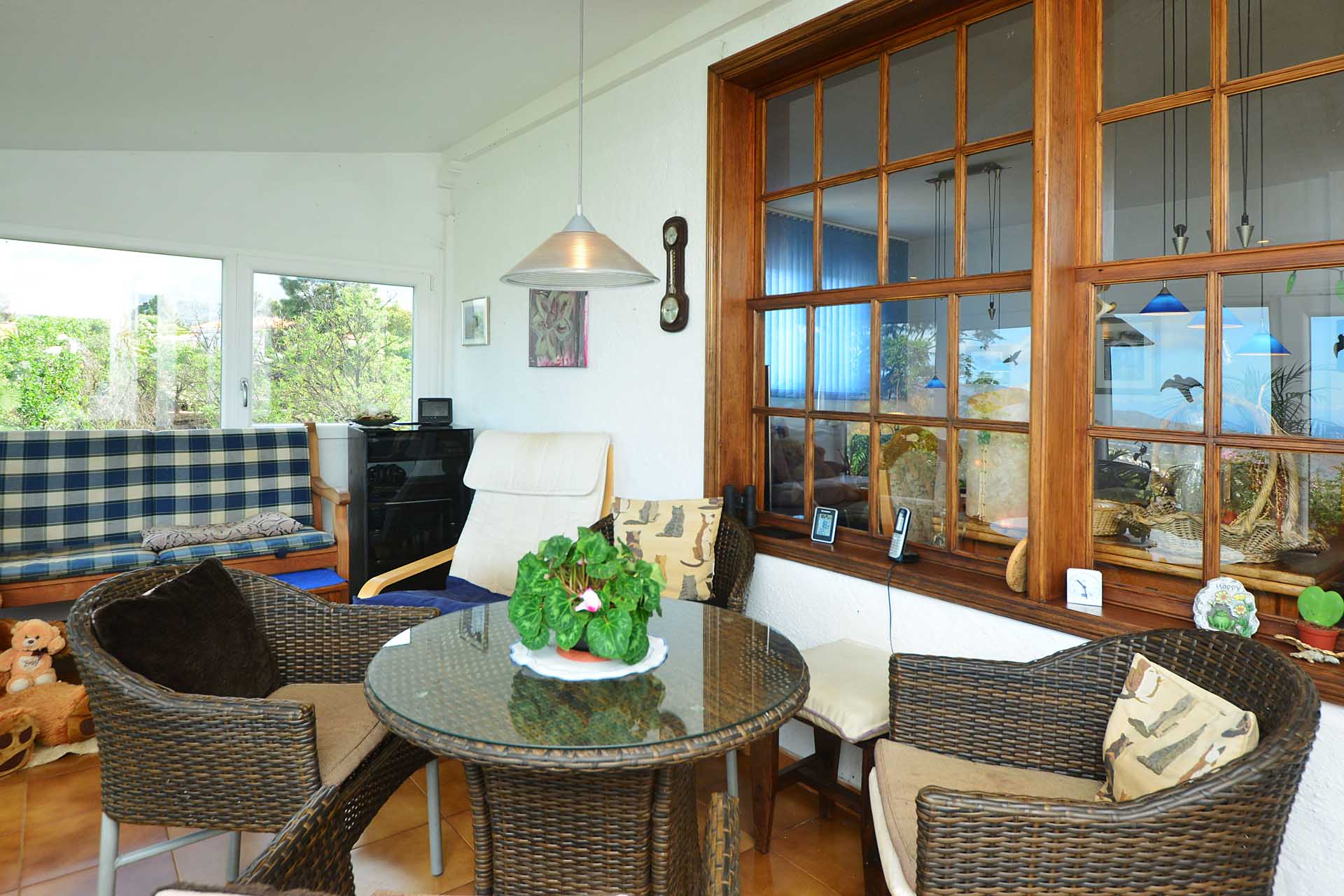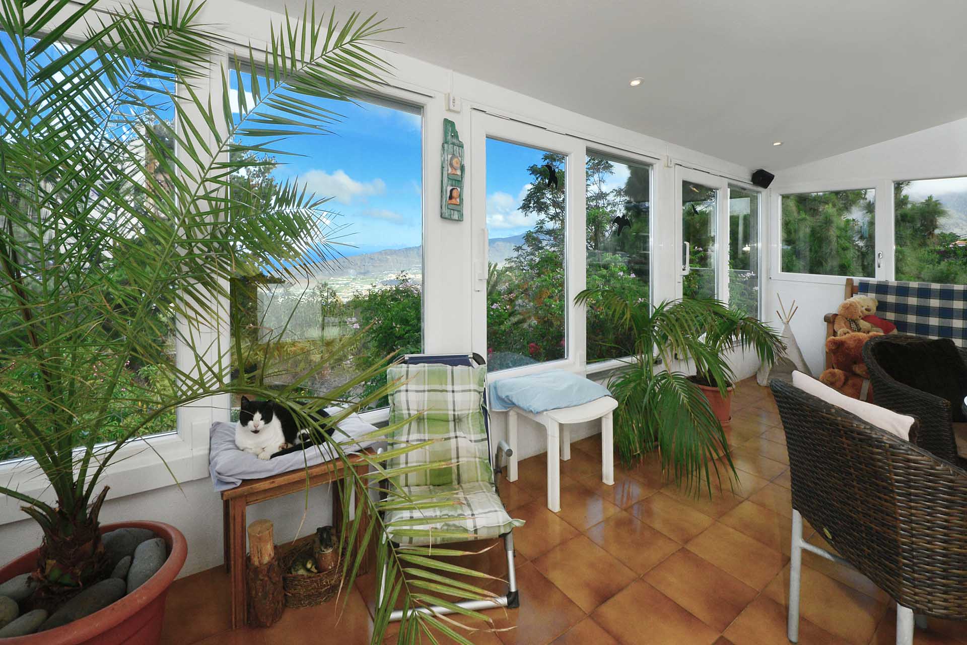 Das zweigeschossige Wohnhaus ist in eine Hauptebene mit großzügiger Wohnküche mit Essbereich, angrenzendem Wintergarten mit fantastischer Aussicht auf Los Llanos de Aridane und den Atlantik, ein modernes Tageslicht-Badezimmer mit Dusche und Urinal, einen kleinen Flur und ein Schlafzimmer aufgeteilt. Die gut ausgestattete Einbauküche ist mit einem Induktions-Kochfeld versehen. Die nach Westen ausgerichteten Panoramafenster des Wintergartens wurden mit elektrisch betätigten Jalousien ausgestattet, so dass im Sommer abends eine übermäßige Erwärmung vermieden wird. Seit dem Bau des Wintergartens kann mit diesem das Obergeschoss weitestgehend beheizt werden, so dass der vorhandene Holzofen eigentlich nicht mehr benötigt wird. Für die wenigen, heißen Tage steht eine Wärmepumpen-Klimaanlage ebenfalls mit Heizfunktion zur Verfügung.