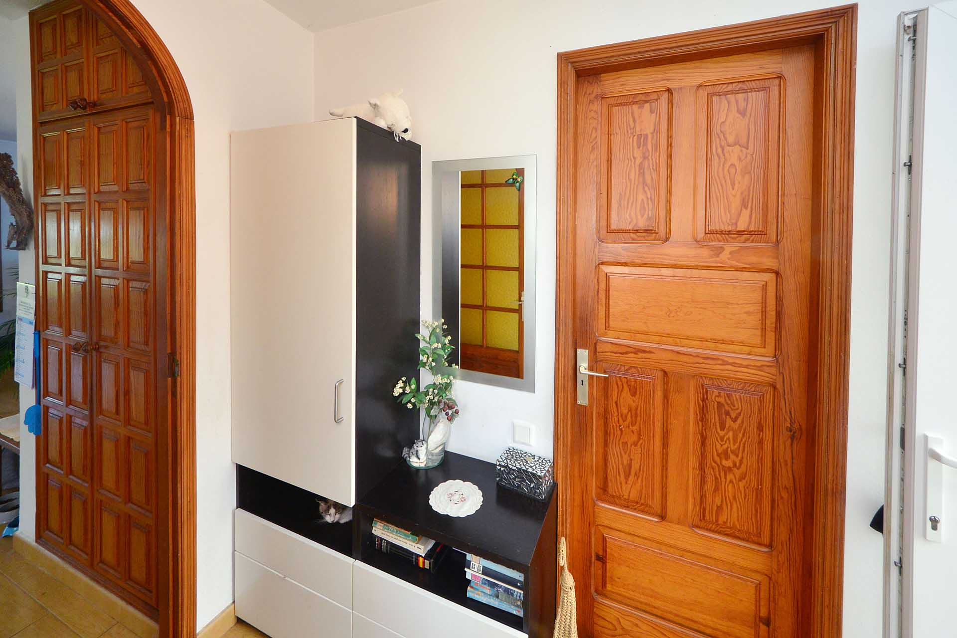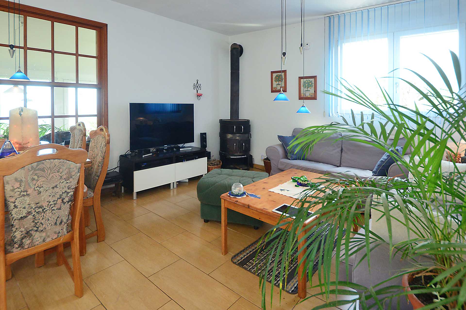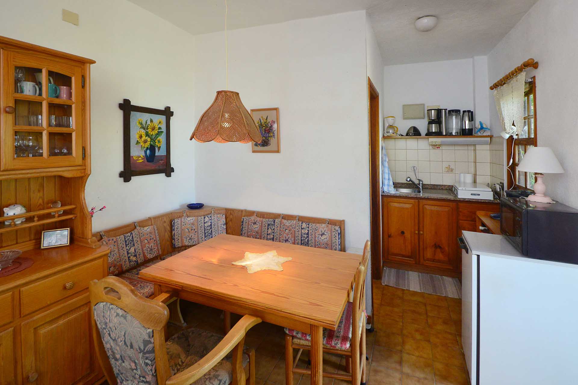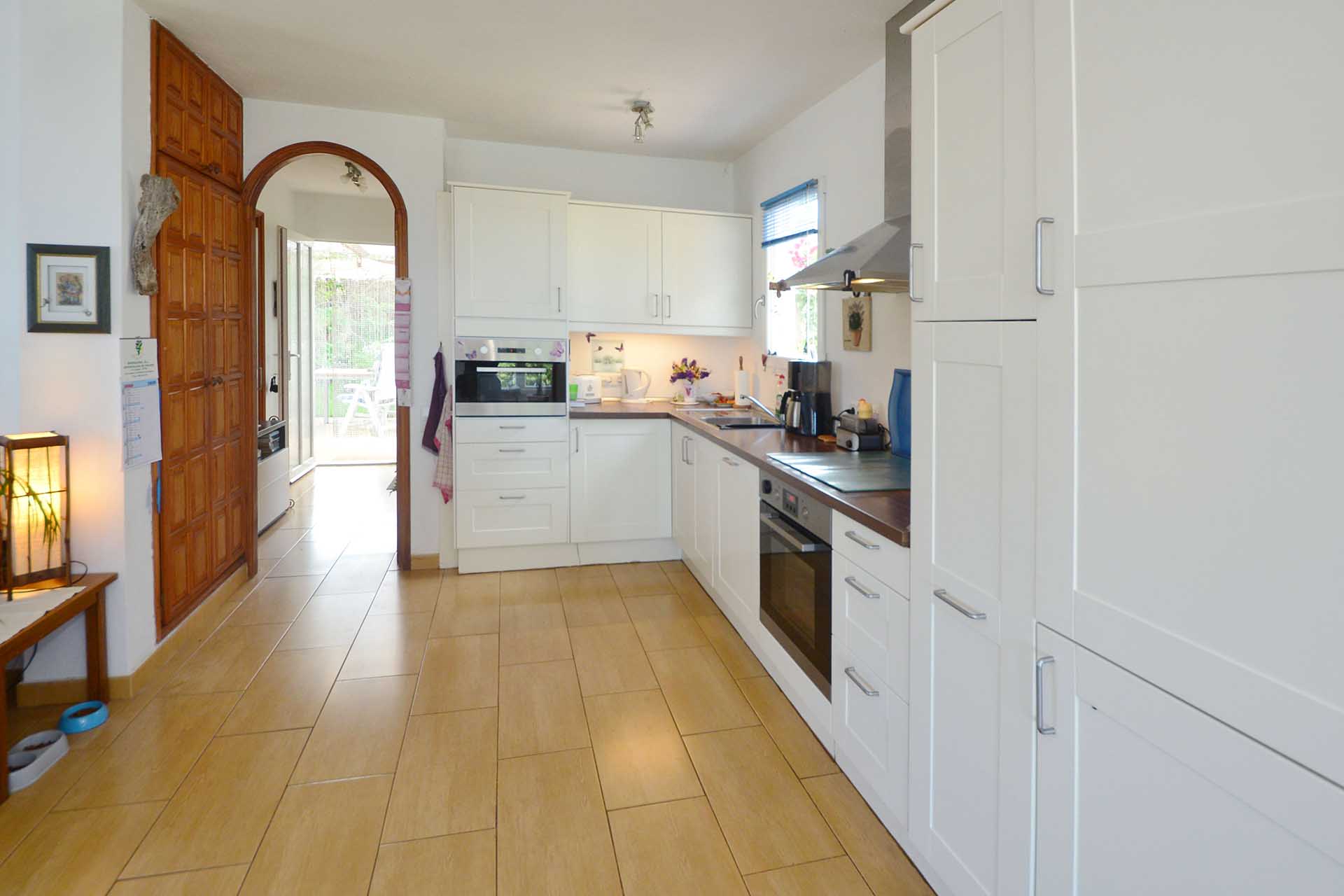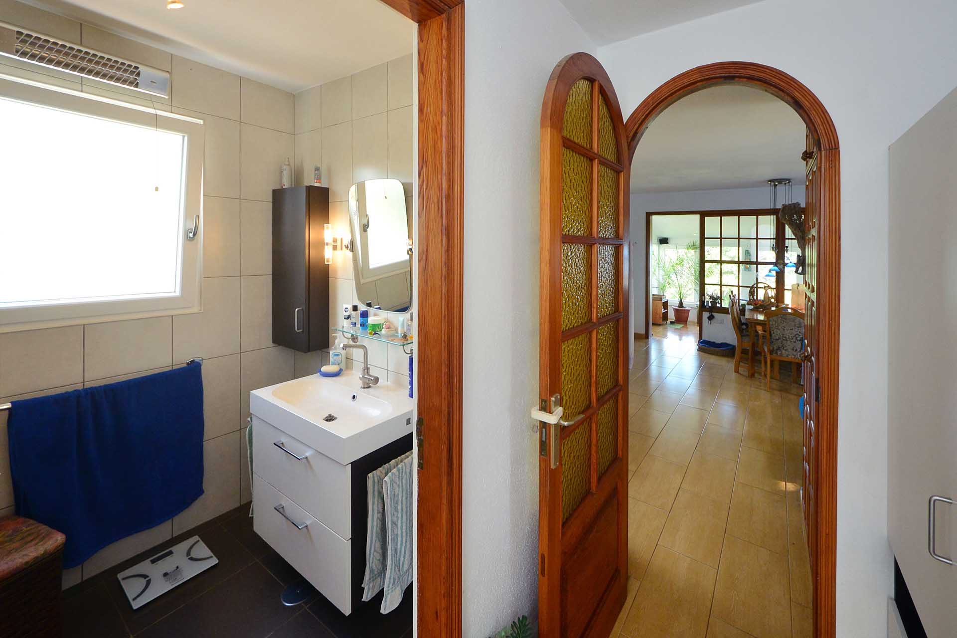Das zweigeschossige Wohnhaus ist in eine Hauptebene mit großzügiger Wohnküche mit Essbereich, angrenzendem Wintergarten mit fantastischer Aussicht auf Los Llanos de Aridane und den Atlantik, ein modernes Tageslicht-Badezimmer mit Dusche und Urinal, einen kleinen Flur und ein Schlafzimmer aufgeteilt. Die gut ausgestattete Einbauküche ist mit einem Induktions-Kochfeld versehen. Die nach Westen ausgerichteten Panoramafenster des Wintergartens wurden mit elektrisch betätigten Jalousien ausgestattet, so dass im Sommer abends eine übermäßige Erwärmung vermieden wird. Seit dem Bau des Wintergartens kann mit diesem das Obergeschoss weitestgehend beheizt werden, so dass der vorhandene Holzofen eigentlich nicht mehr benötigt wird. Für die wenigen, heißen Tage steht eine Wärmepumpen-Klimaanlage ebenfalls mit Heizfunktion zur Verfügung.