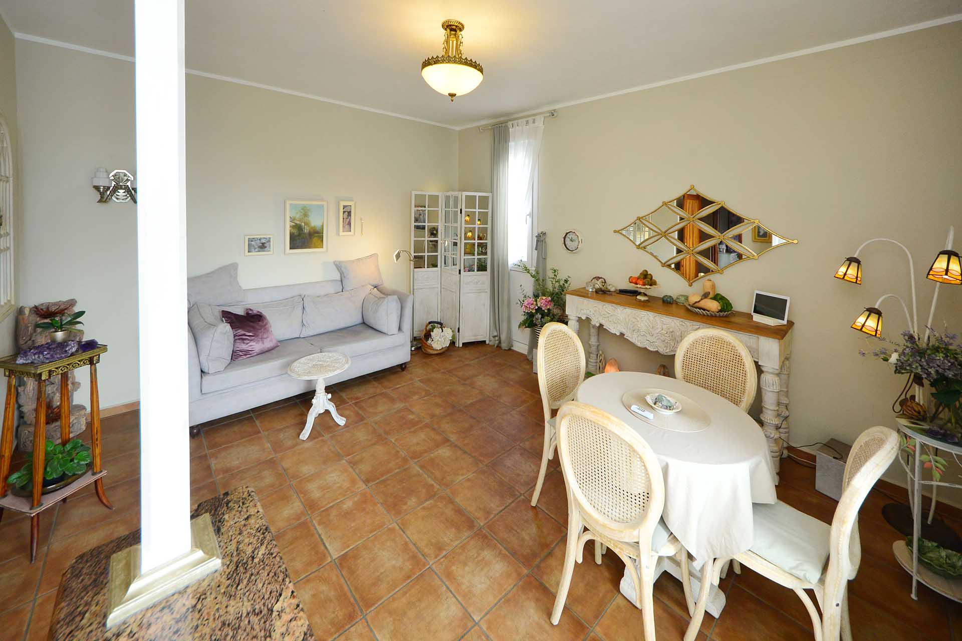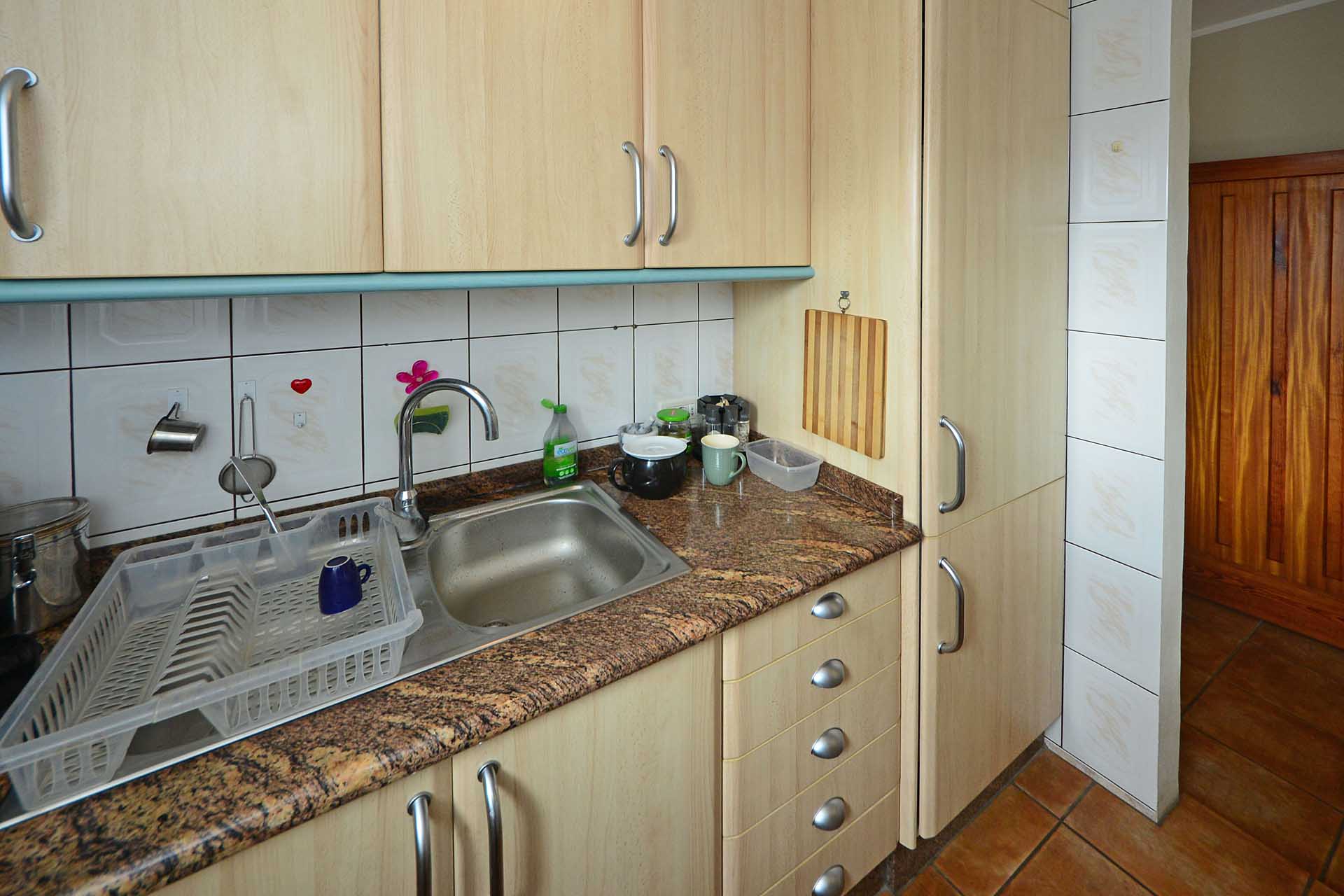 Der Flur erschließt auch die ca. 60 m² große Dachterrasse, die sich über die gesamte Größe des Hauses erstreckt und exklusiv zu dieser Wohnung gehört. Auf der Dachterrasse wurde eine Außenküche installiert, sowie ein kleiner Hauswirtschaftsraum der mit Anschlüssen für eine Waschmaschine versehen ist, von den jetzigen Eigentümern jedoch als kleine Werkstatt genutzt wird.