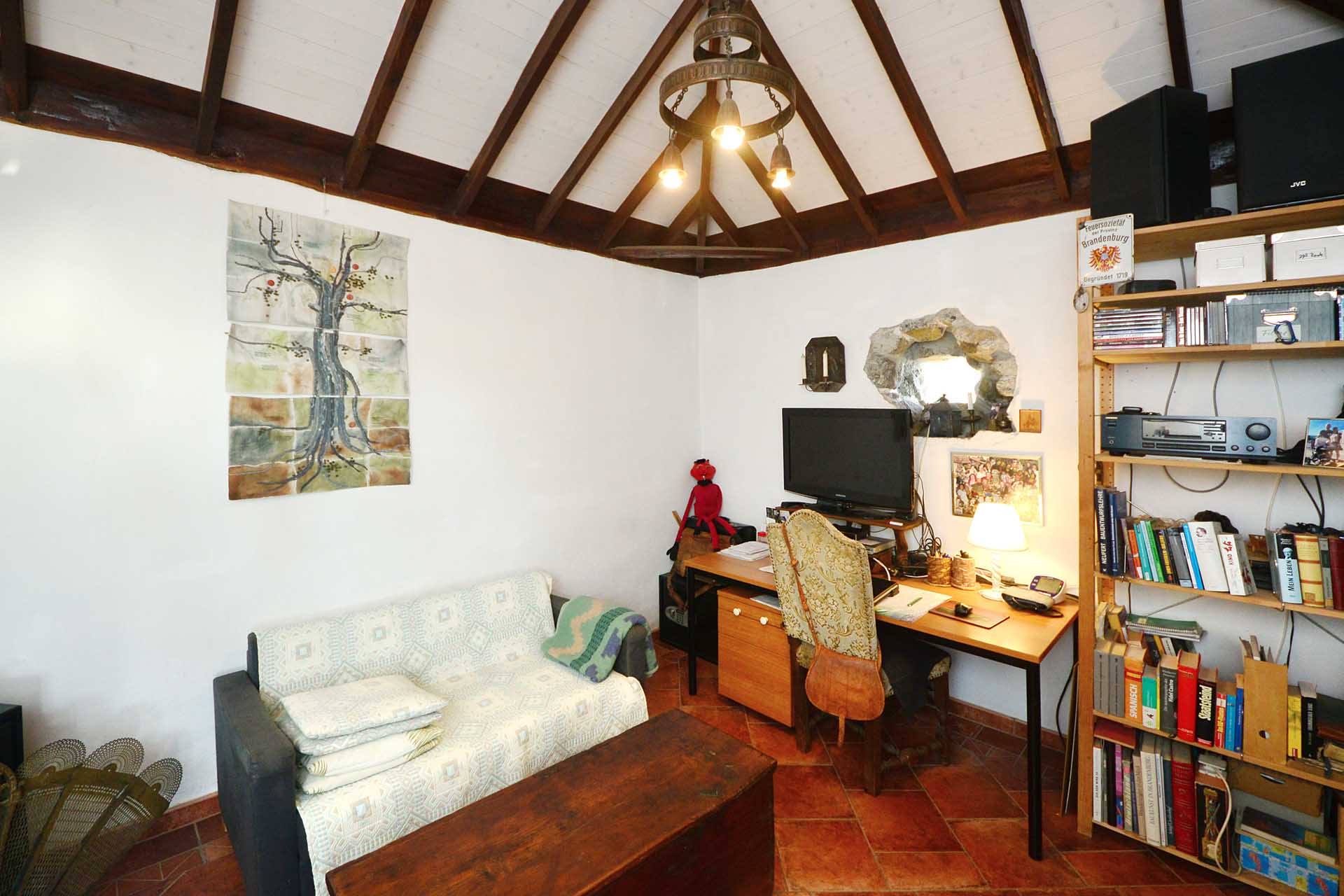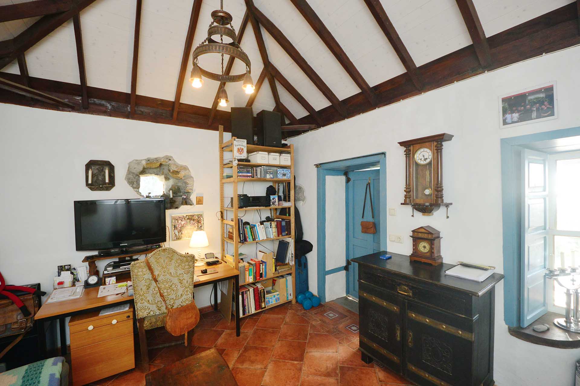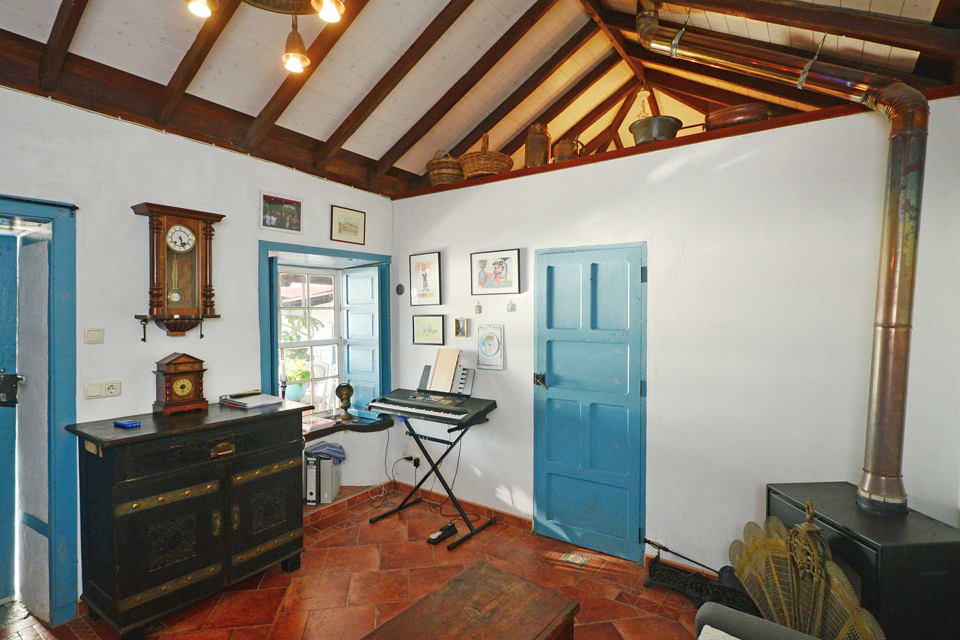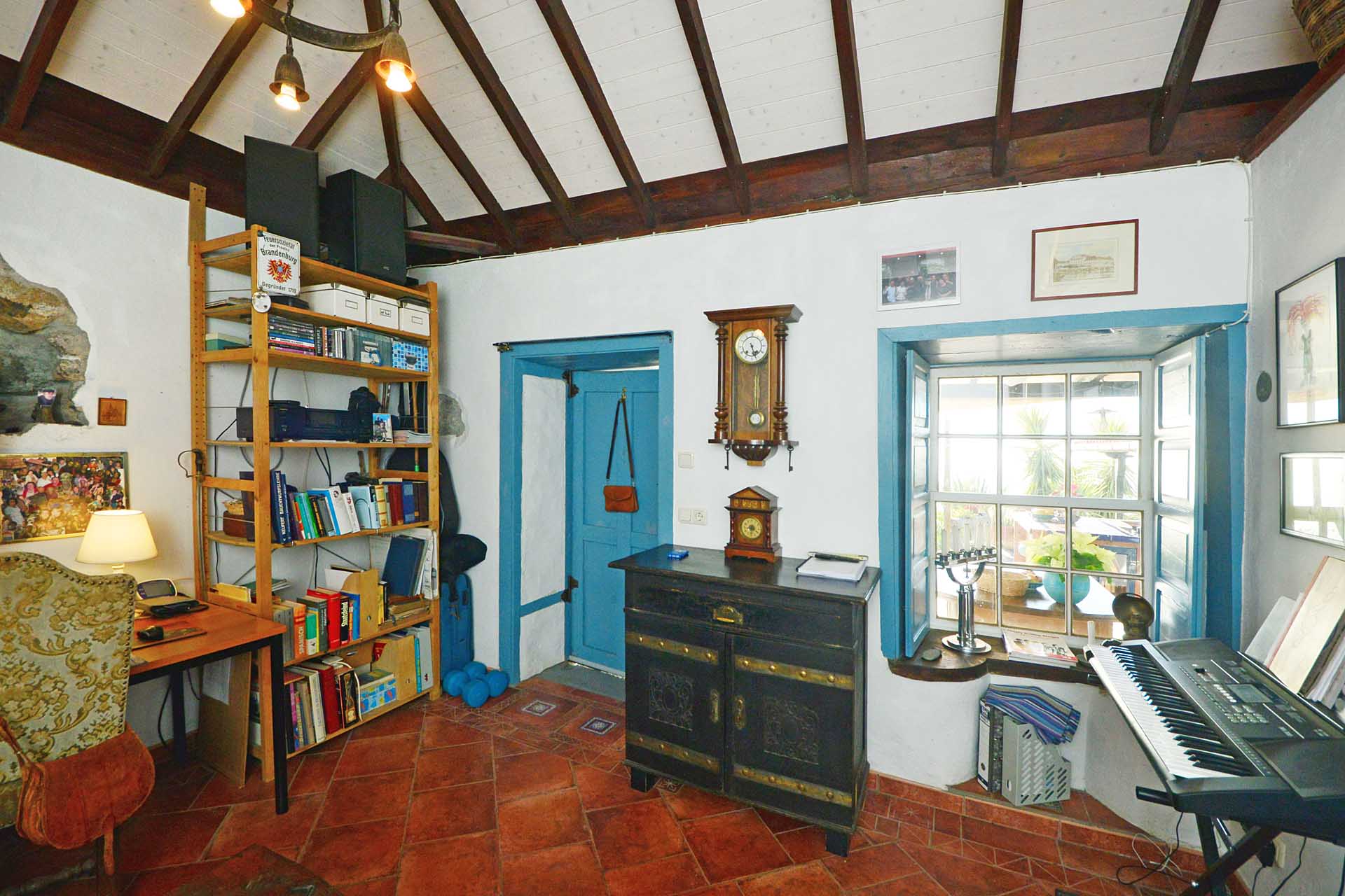 Alle Räume und Terrassen liegen auf einer Ebene, so dass das Haus auch von älteren Menschen sehr gut genutzt werden kann. Die aus bis zu 60 cm dicken Wände des Haupthauses sind aus Lavagestein geschichtet und sorgen für ein angenehmes Raumklima. Das kanarische Dach hat eine weiße Holzschalung welche schön zum Teaholz des Dachstuhls kontrastiert. Die Dacheindeckung ist traditionell Mönch-Nonne, die Anbauten haben Stahlbetondecken mit ortstypischer Randeindeckung dieser Ziegel. Türen und Fenster des Haupthauses sind noch original aus Teaholz, Türen und Fenster der Anbauten sind doppelverglast.