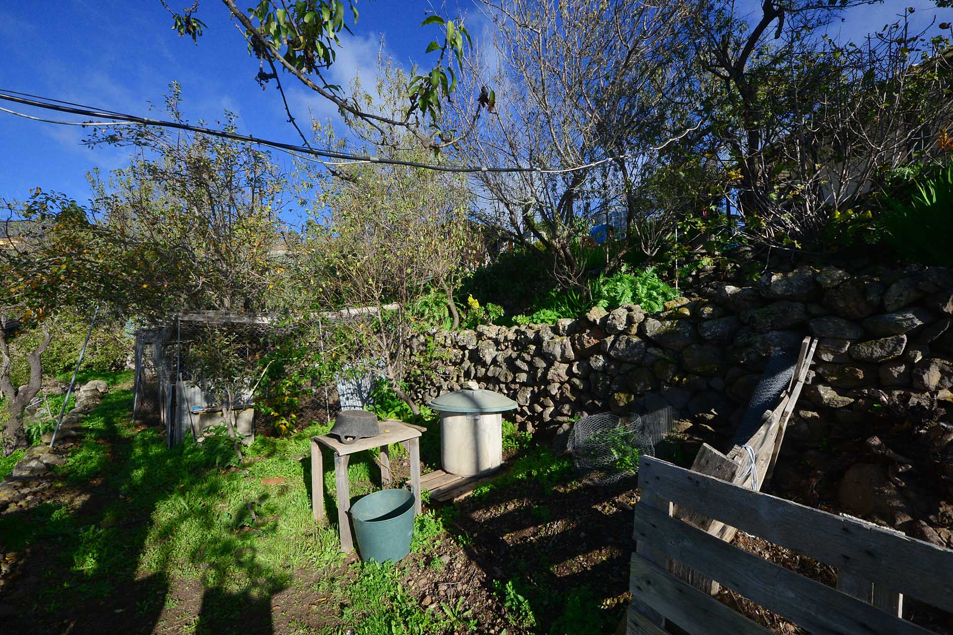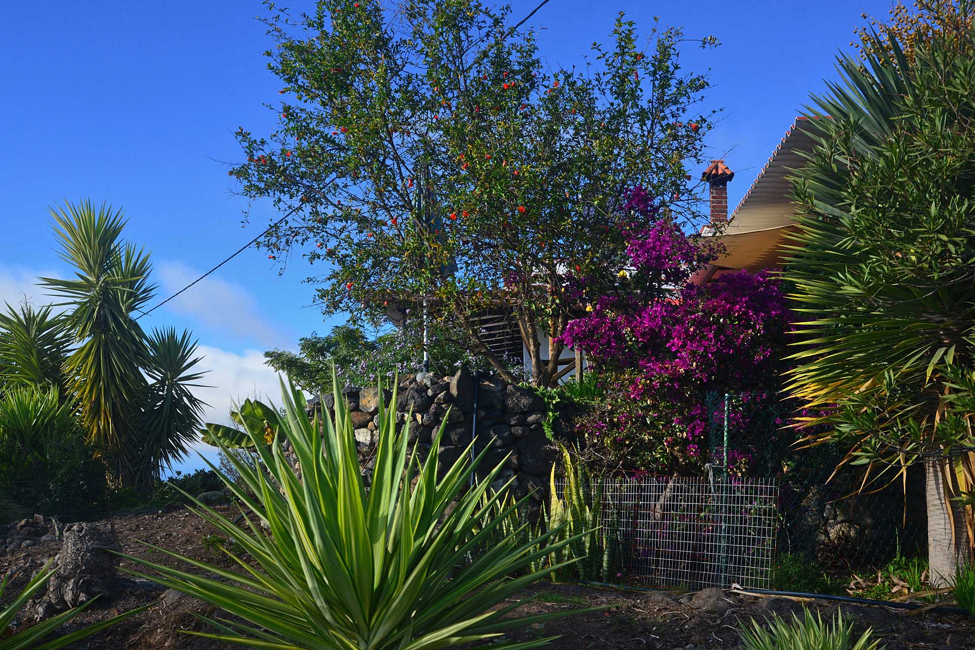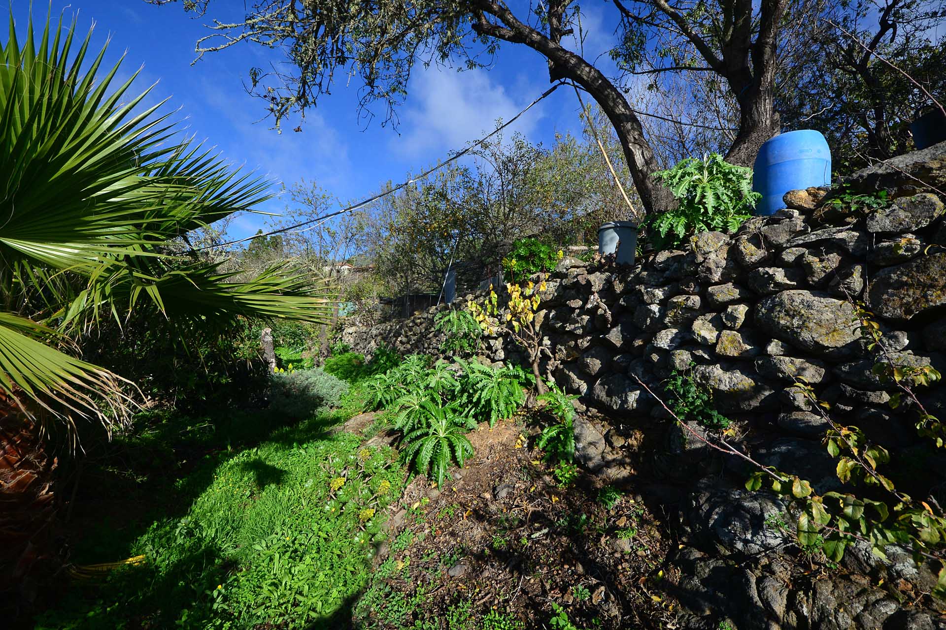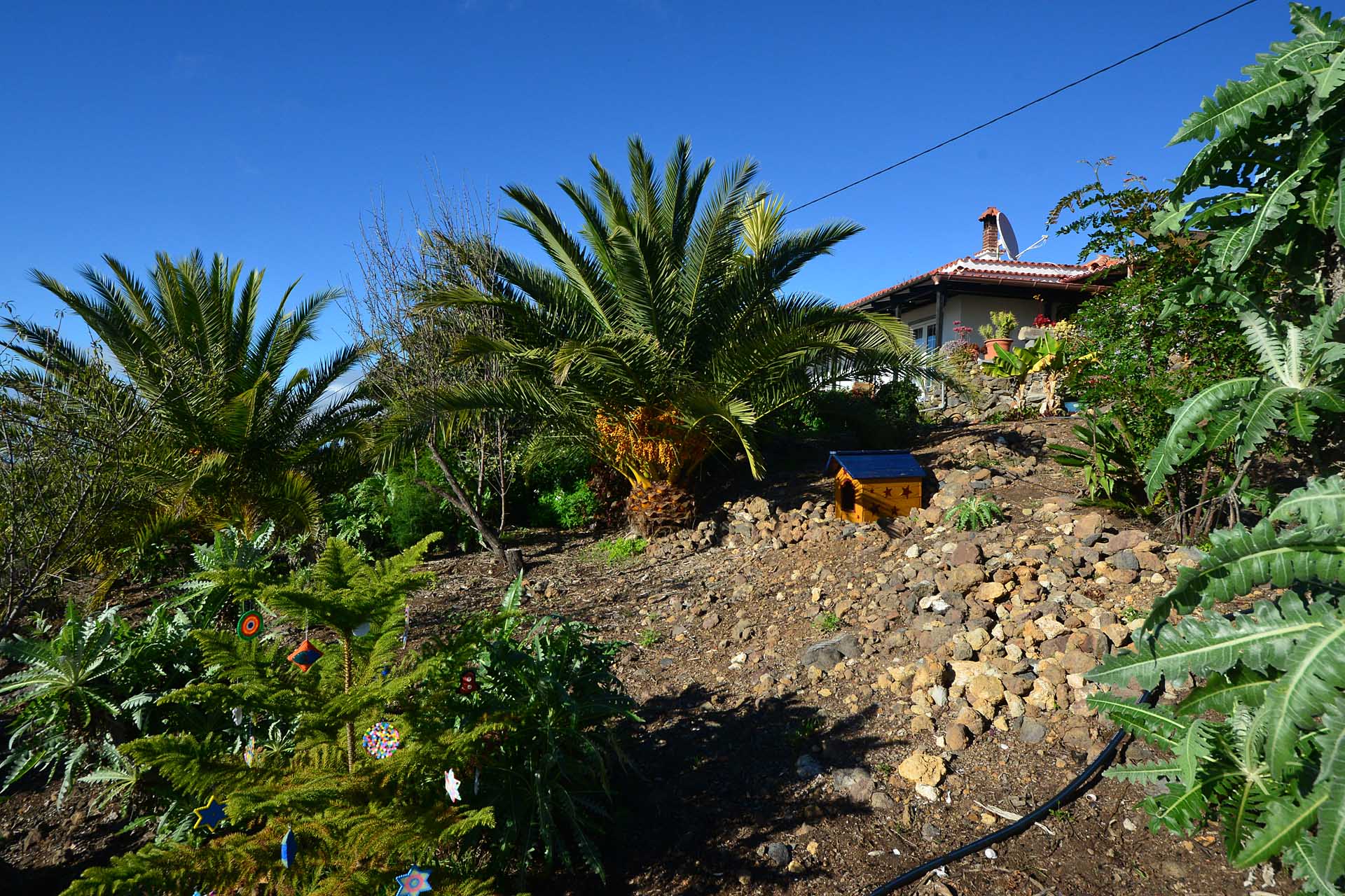 Der große Garten ist gut eingewachsen, die ursprünglichen Terrassen wurden rekultiviert und naturnah angelegt. Er wird automatisch bewässert. Neben zahlreichen Mandelbäumen gibt es 65 verschiedenste Obstgehölze, darunter Zitrusgehölze, Cherimoja, Mangos, Guaven. Palmen, Rosen, exotische und endemische Pflanzen und verschiedene Kakteen und Sukkulenten runden den Garten ab.
