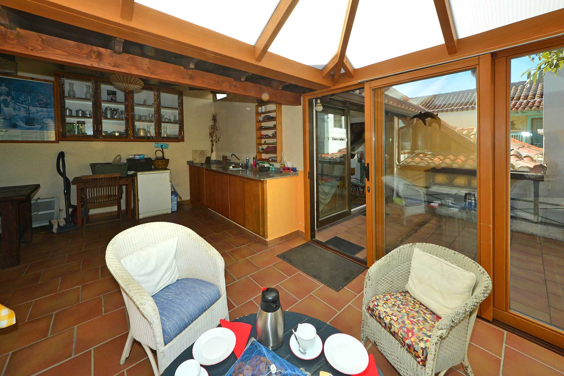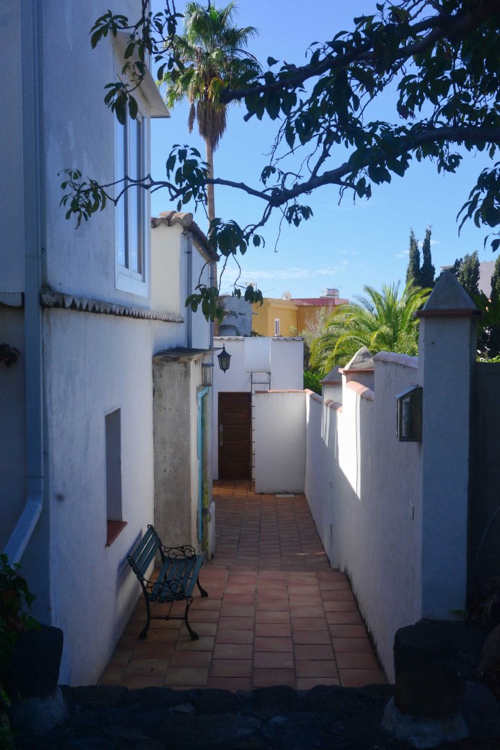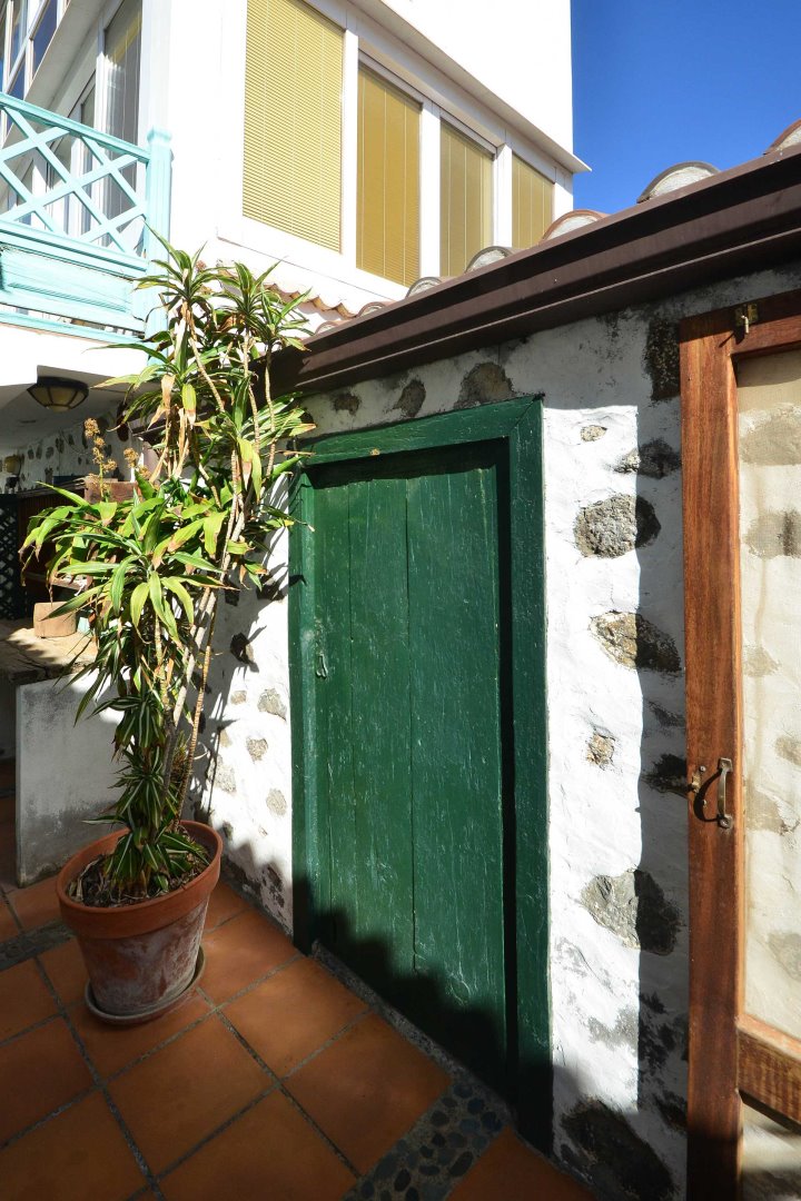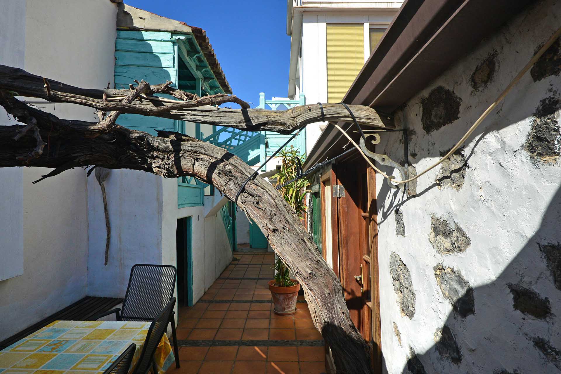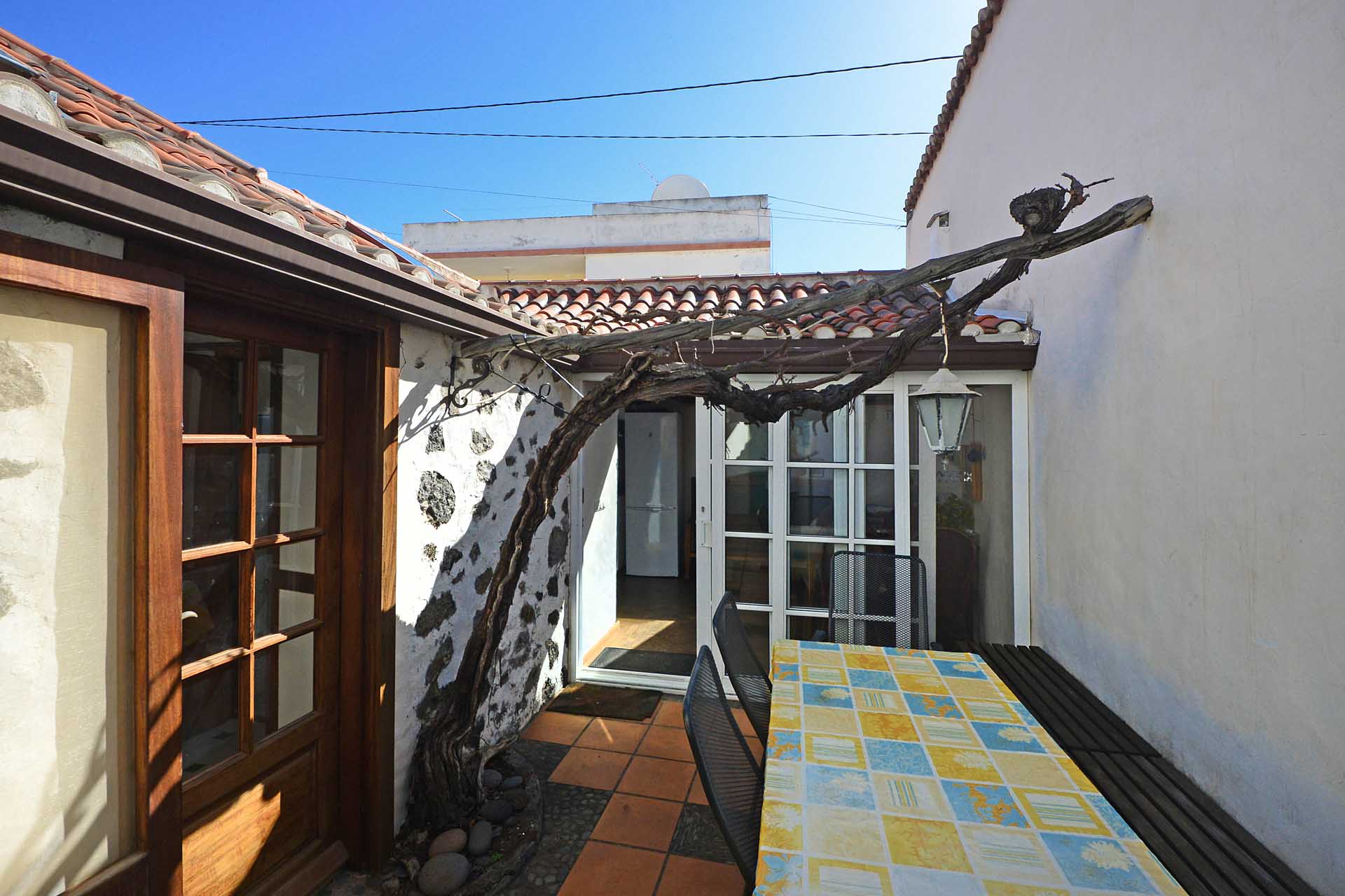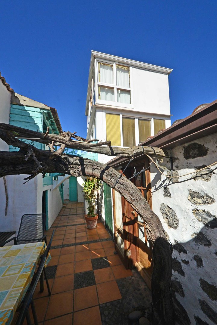 Durch das historische Eingangstor kommen Sie in einen Innenhof, auf dessen linker Seite ein dreigeschossiges Gebäude liegt. Über eine Steintreppe, auf deren Abseite sich ein historischer Wasserfilter aus der Caldera befindet, erreichen Sie ein Arbeits- oder Schlafzimmer im ersten Stock. Eine schön gebaute Wendeltreppe führt zum Turmwintergarten im zweiten Stock mit sensationellem Rundumblick auf den Atlantik und die Calderaberge, oder in ein Schlafzimmer mit kleinem Bad im Erdgeschoss und direktem Zugang zum Innenhof. Am Ende des Innenhofs befindet sich ein Essplatz - überdeckt von einem uralten Weinstock - und gegenüber dem Zugang zum Schlafzimmer mit eigenem Badezimmer. Am Ende des Innenhofs gelangen Sie durch eine große Glas-Schiebetür zur Küche, in der nach alten Erzählungen früher einmal Bonbons aus Zuckerrohrsaft gewerblich hergestellt wurden.