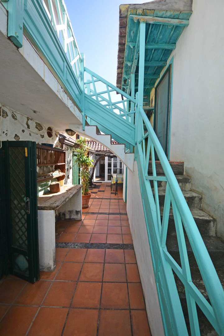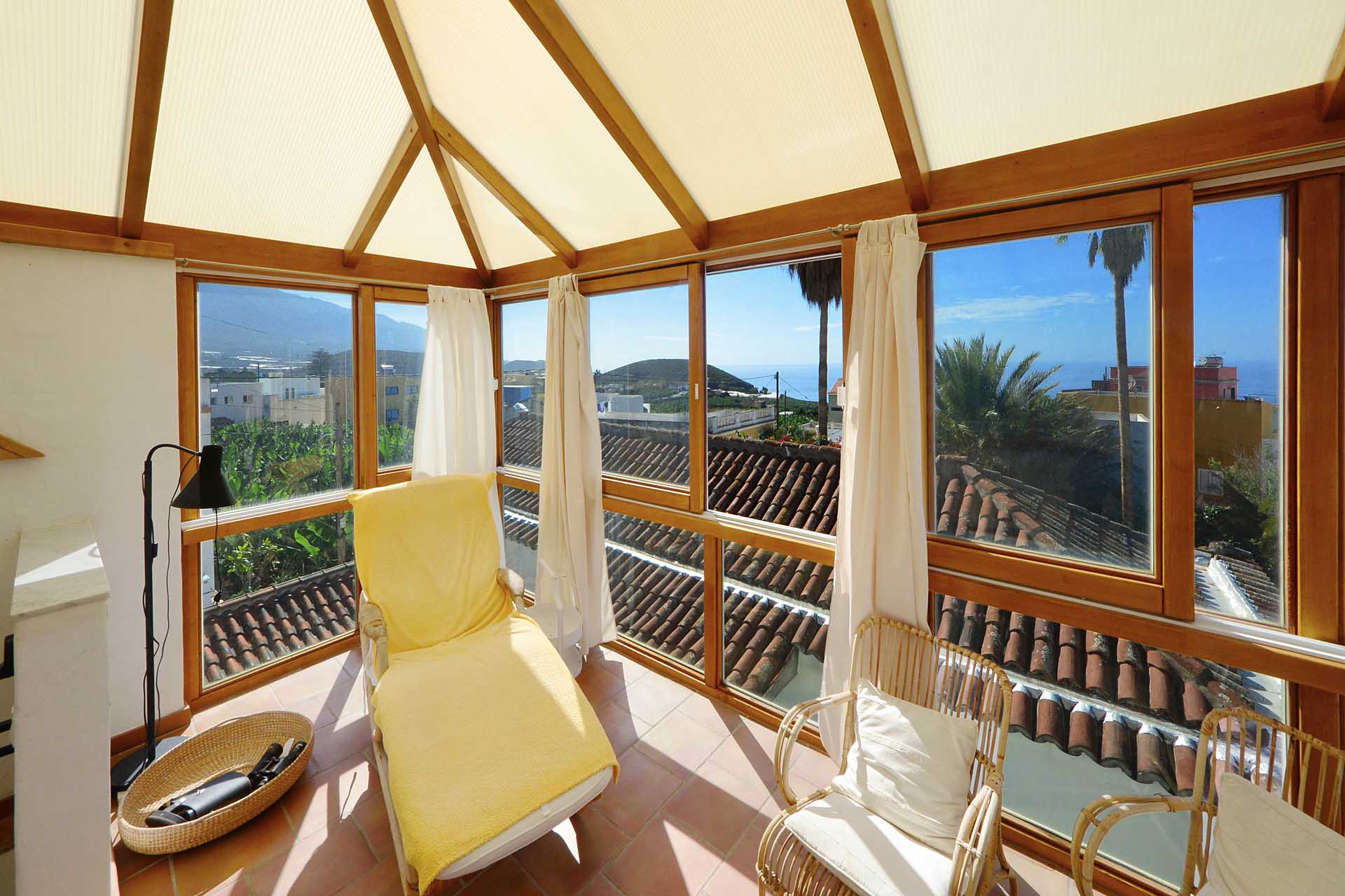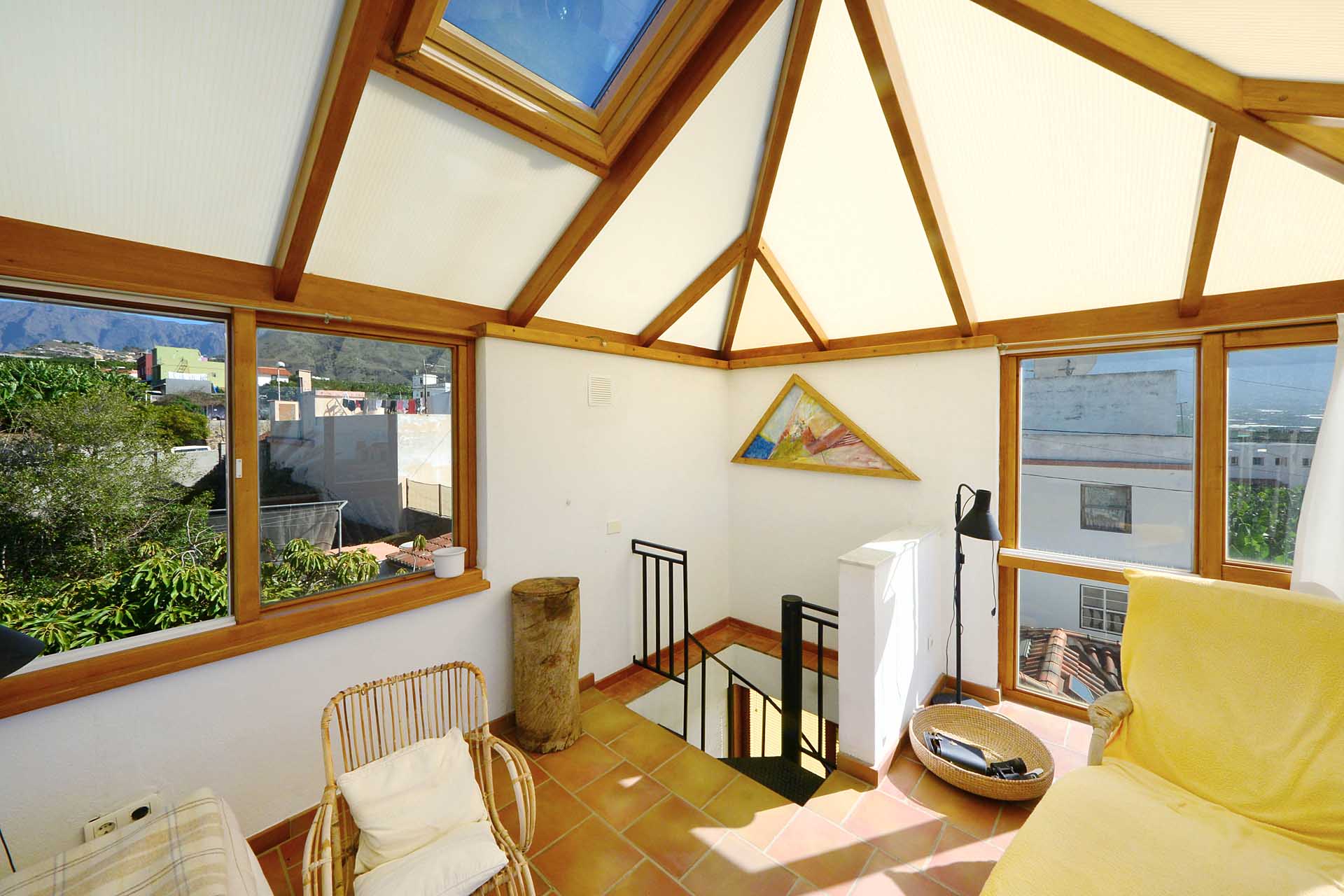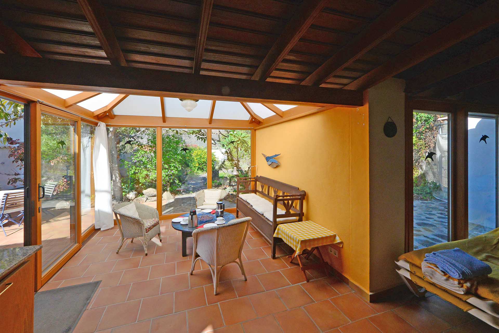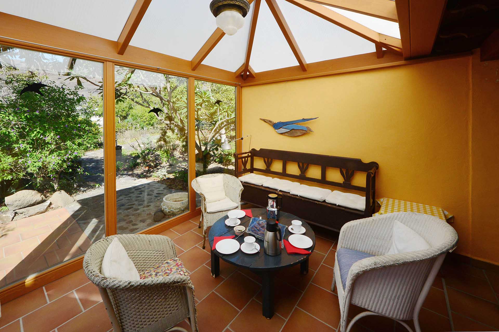 Durch das historische Eingangstor kommen Sie in einen Innenhof, auf dessen linker Seite ein dreigeschossiges Gebäude liegt. Über eine Steintreppe, auf deren Abseite sich ein historischer Wasserfilter aus der Caldera befindet, erreichen Sie ein Arbeits- oder Schlafzimmer im ersten Stock. Eine schön gebaute Wendeltreppe führt zum Turmwintergarten im zweiten Stock mit sensationellem Rundumblick auf den Atlantik und die Calderaberge, oder in ein Schlafzimmer mit kleinem Bad im Erdgeschoss und direktem Zugang zum Innenhof. Am Ende des Innenhofs befindet sich ein Essplatz - überdeckt von einem uralten Weinstock - und gegenüber dem Zugang zum Schlafzimmer mit eigenem Badezimmer. Am Ende des Innenhofs gelangen Sie durch eine große Glas-Schiebetür zur Küche, in der nach alten Erzählungen früher einmal Bonbons aus Zuckerrohrsaft gewerblich hergestellt wurden.