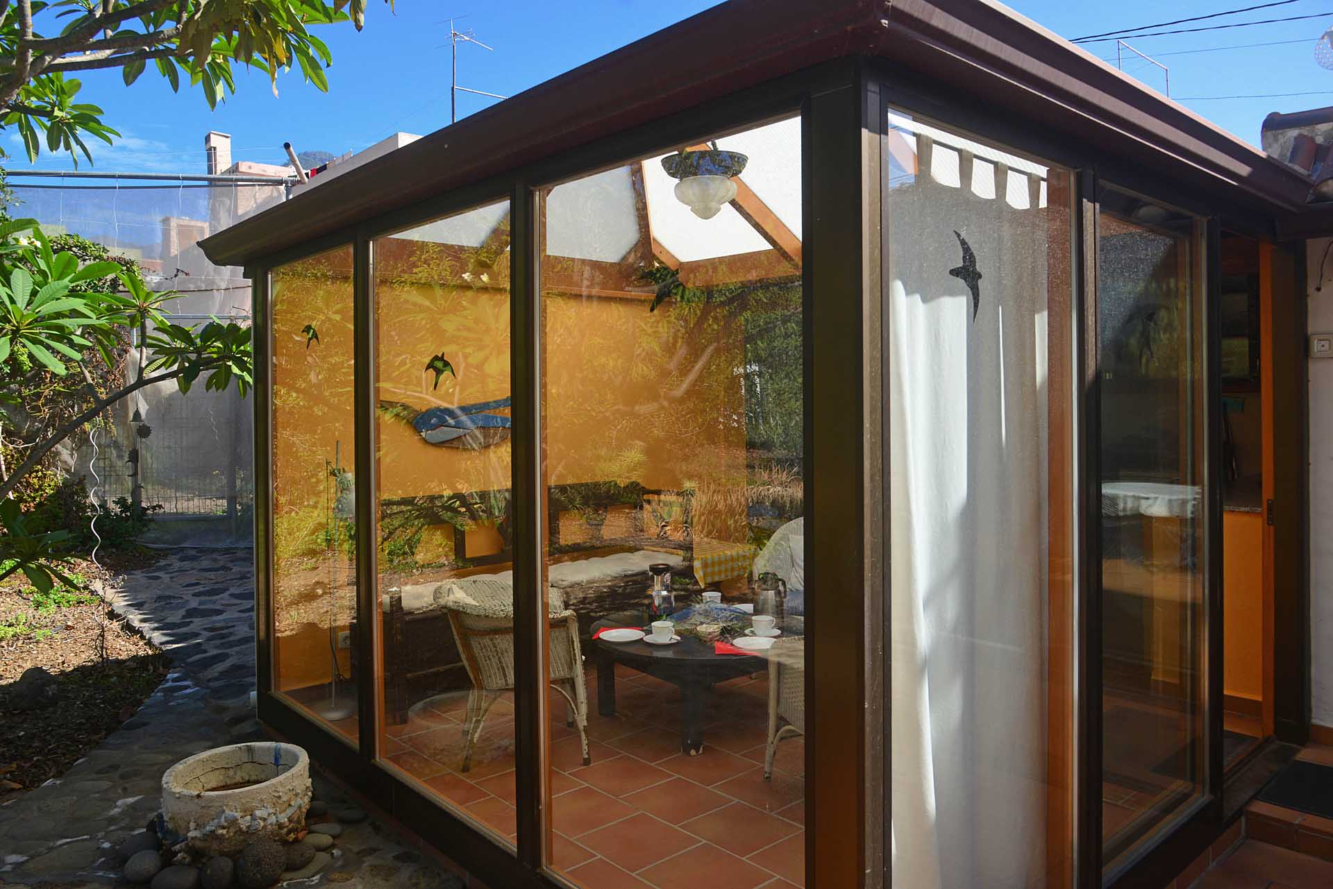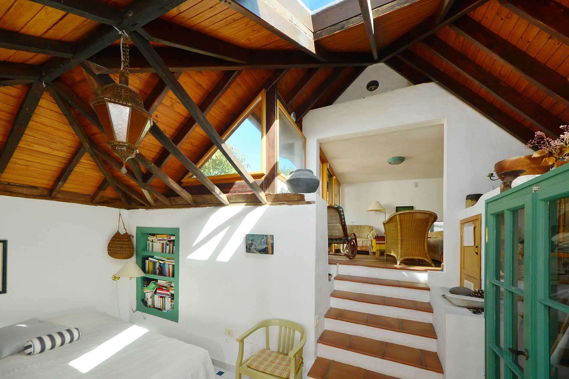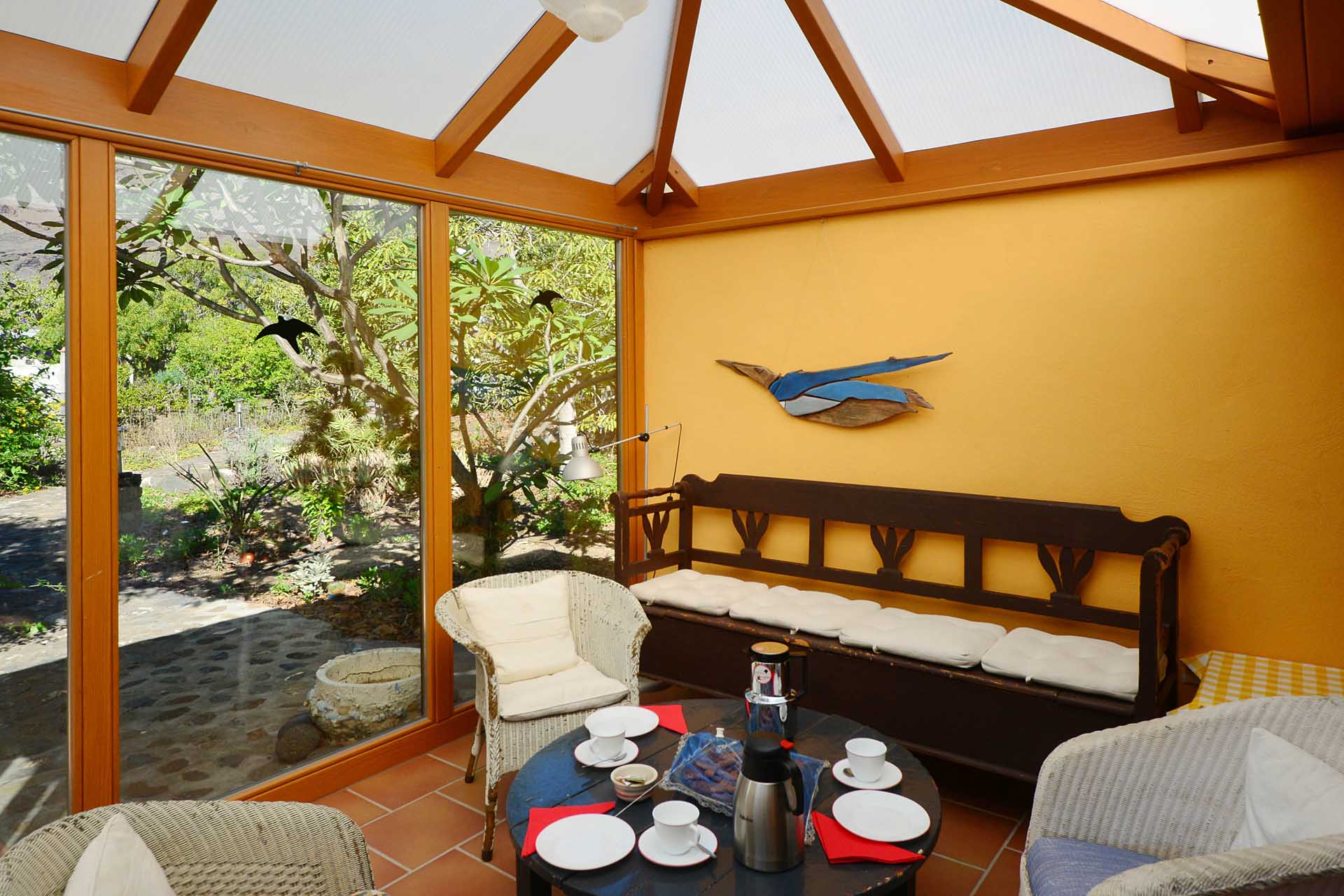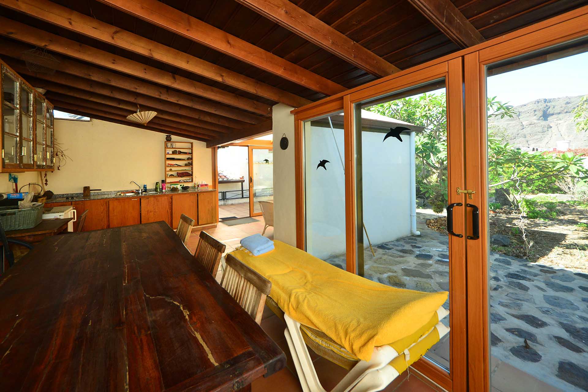Durch das historische Eingangstor kommen Sie in einen Innenhof, auf dessen linker Seite ein dreigeschossiges Gebäude liegt. Über eine Steintreppe, auf deren Abseite sich ein historischer Wasserfilter aus der Caldera befindet, erreichen Sie ein Arbeits- oder Schlafzimmer im ersten Stock. Eine schön gebaute Wendeltreppe führt zum Turmwintergarten im zweiten Stock mit sensationellem Rundumblick auf den Atlantik und die Calderaberge, oder in ein Schlafzimmer mit kleinem Bad im Erdgeschoss und direktem Zugang zum Innenhof. Am Ende des Innenhofs befindet sich ein Essplatz - überdeckt von einem uralten Weinstock - und gegenüber dem Zugang zum Schlafzimmer mit eigenem Badezimmer. Am Ende des Innenhofs gelangen Sie durch eine große Glas-Schiebetür zur Küche, in der nach alten Erzählungen früher einmal Bonbons aus Zuckerrohrsaft gewerblich hergestellt wurden.