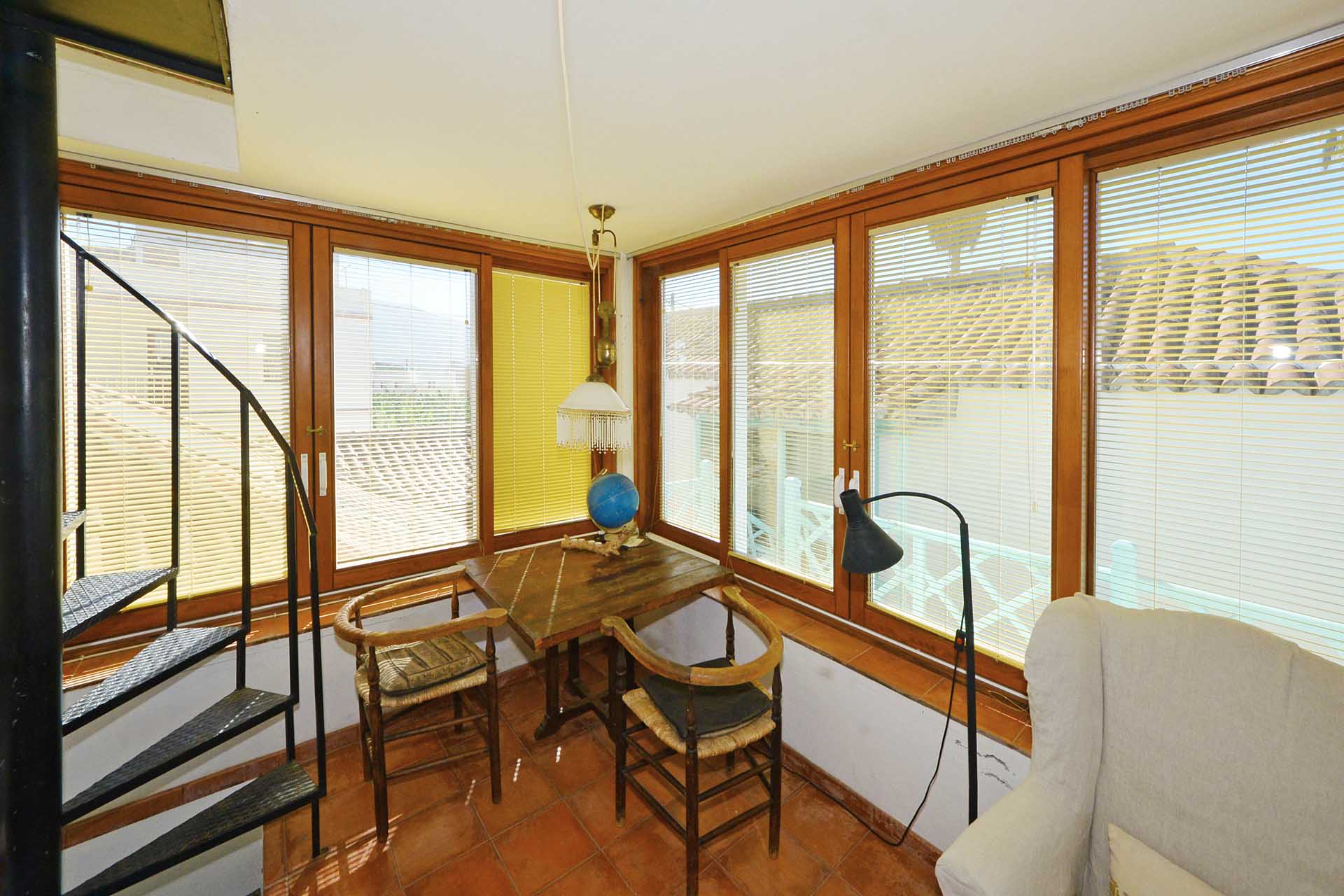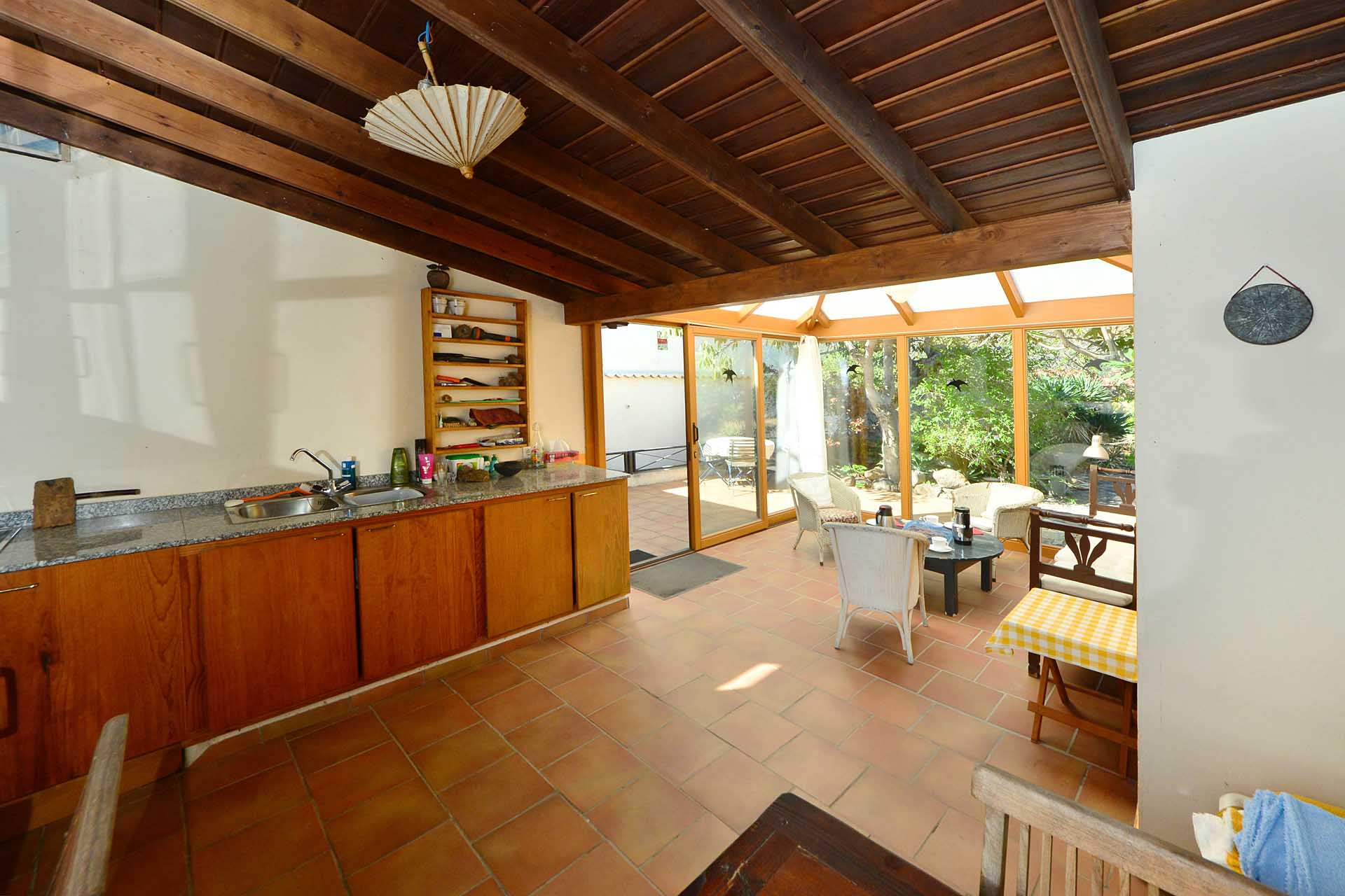 Ein alternativer Eingang führt über eine Terrasse in das Wohnzimmer mit großer Fensterfront. Von dort gelangen Sie über ein Treppchen zum Schlafzimmer und Badezimmer sowie den Innenhof und die Küche. Von der Terrasse aus erreichen sie außerdem einen Wintergarten, mit anschließendem großen Festraum für Familienfeiern mit Küchenzeile und sehr großem Teaholztisch.