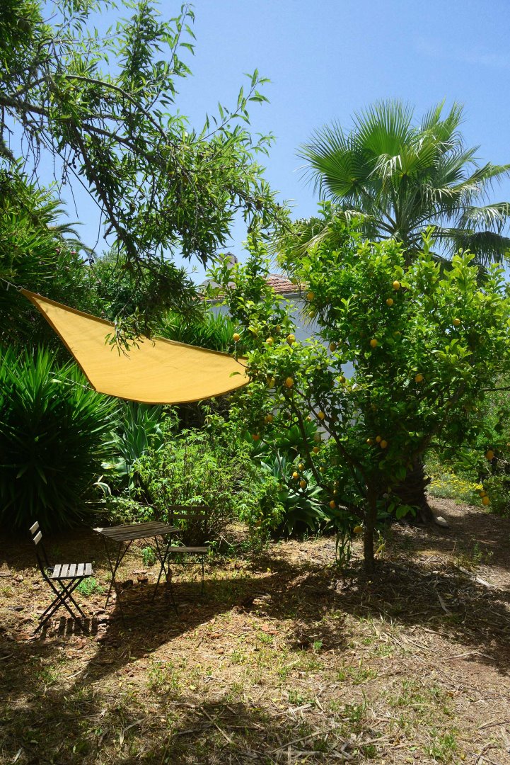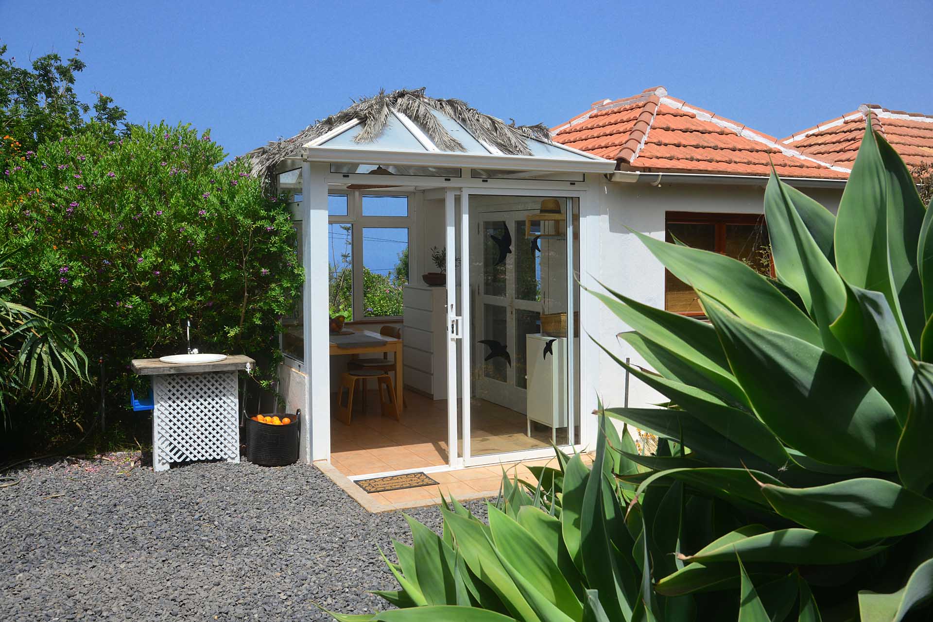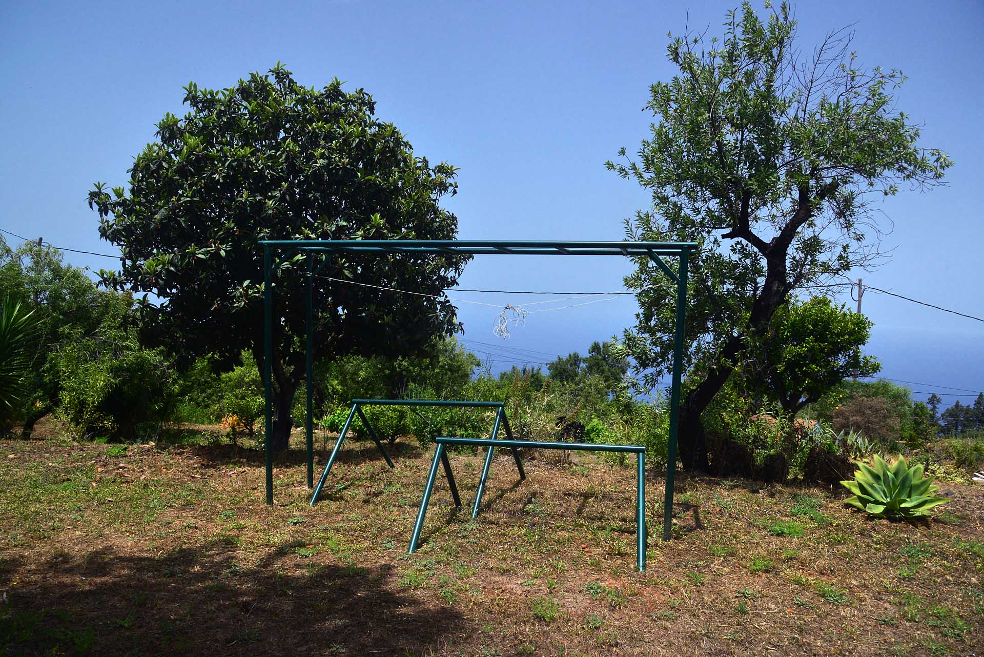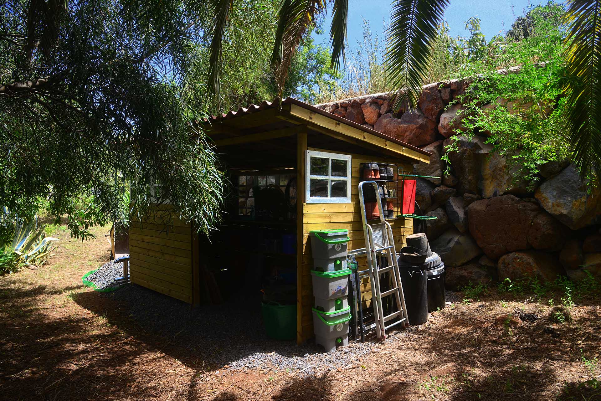 Im Garten befindet sich auch ein neu errichtetes Holzhaus für Gartengeräte und ein Sportgerät zum „Hangeln“, Strecken und Dehnen mit Meerblick.