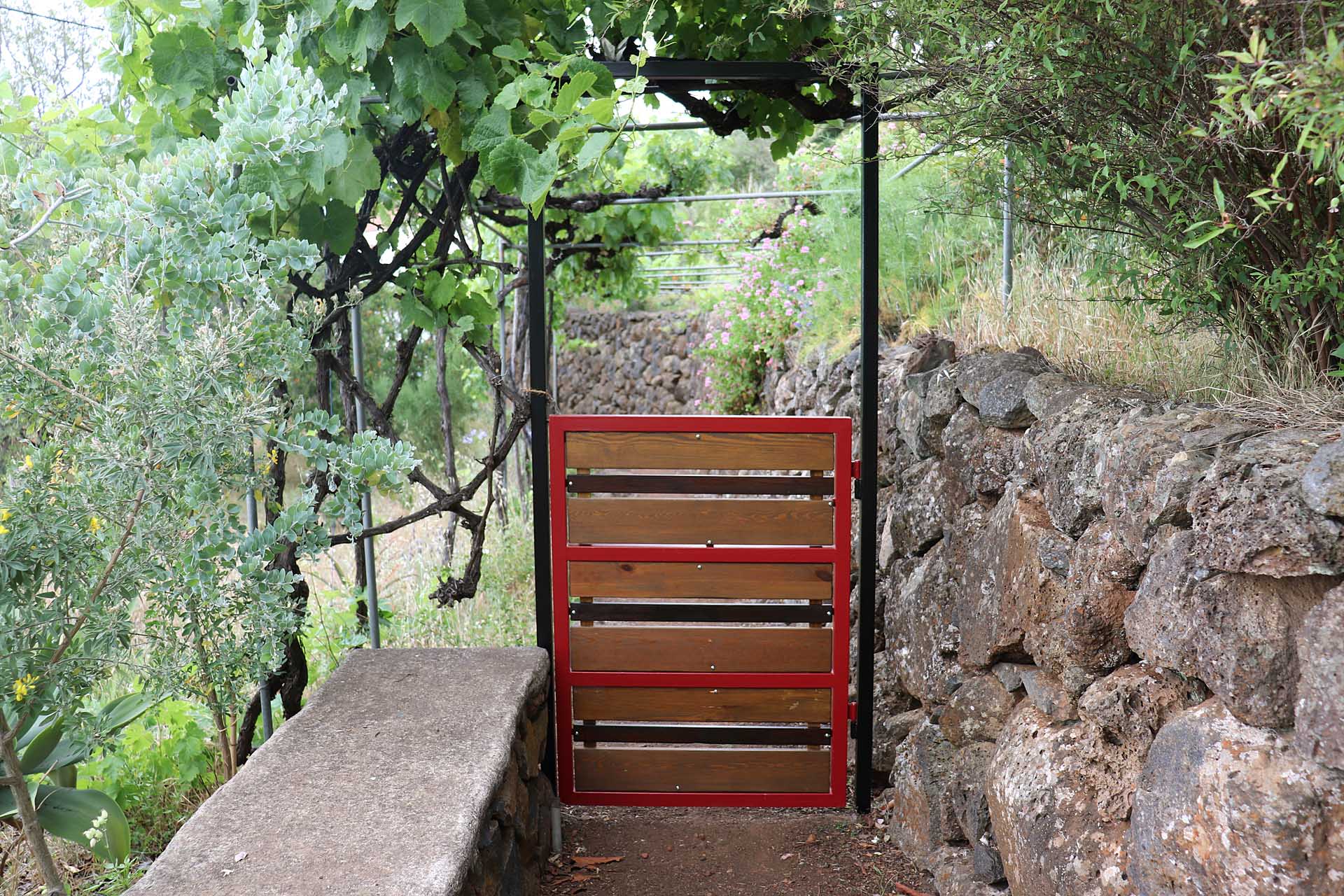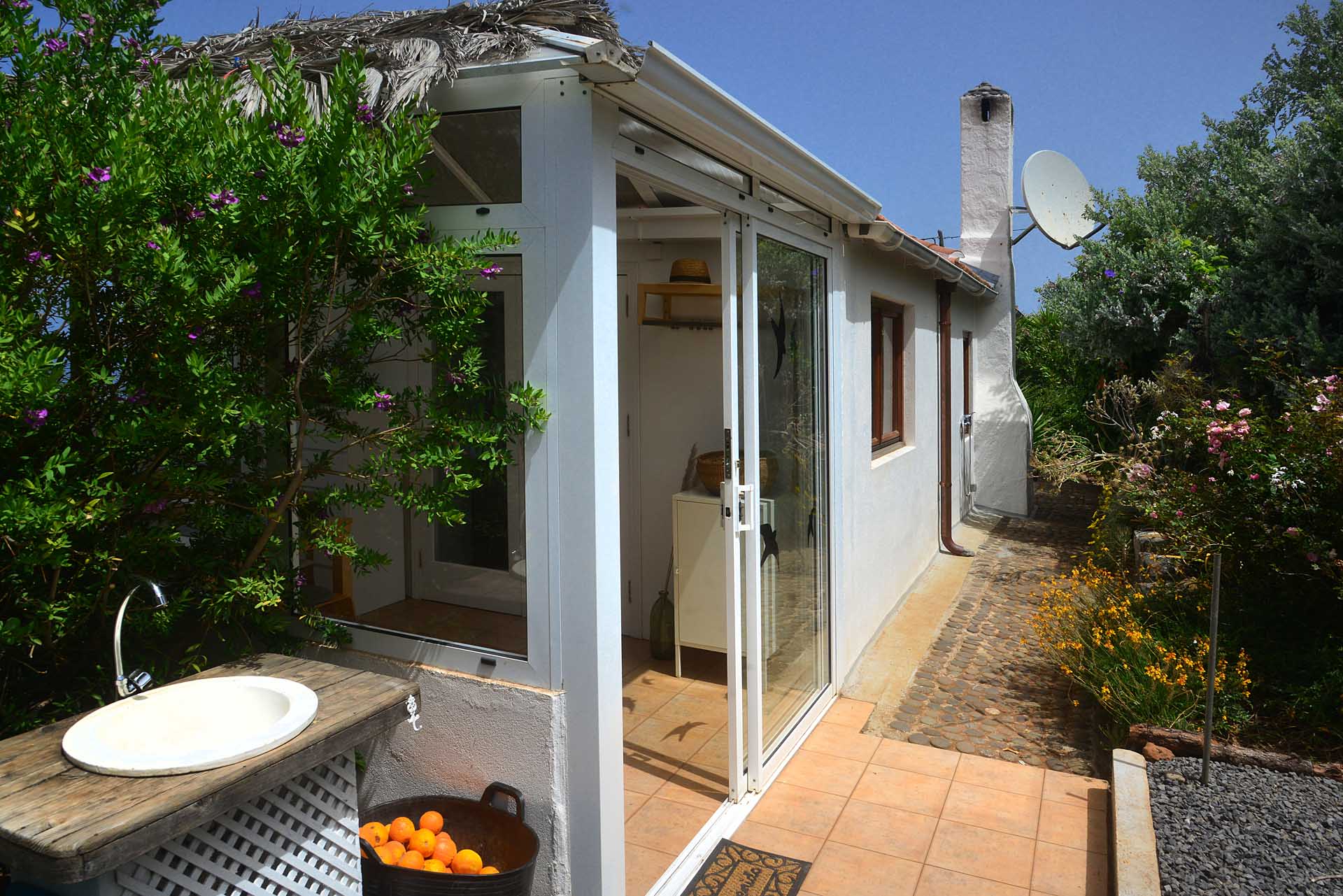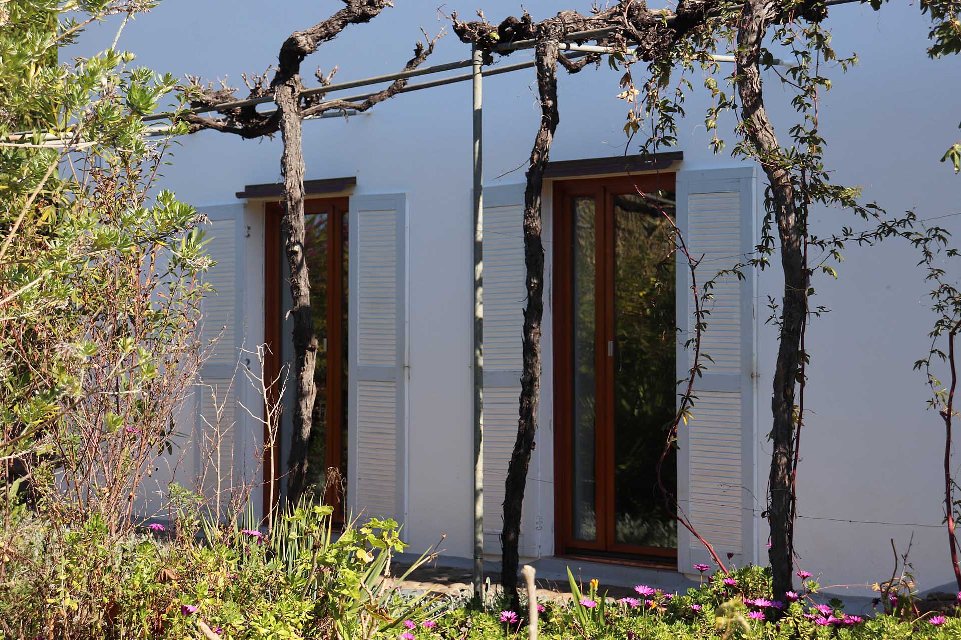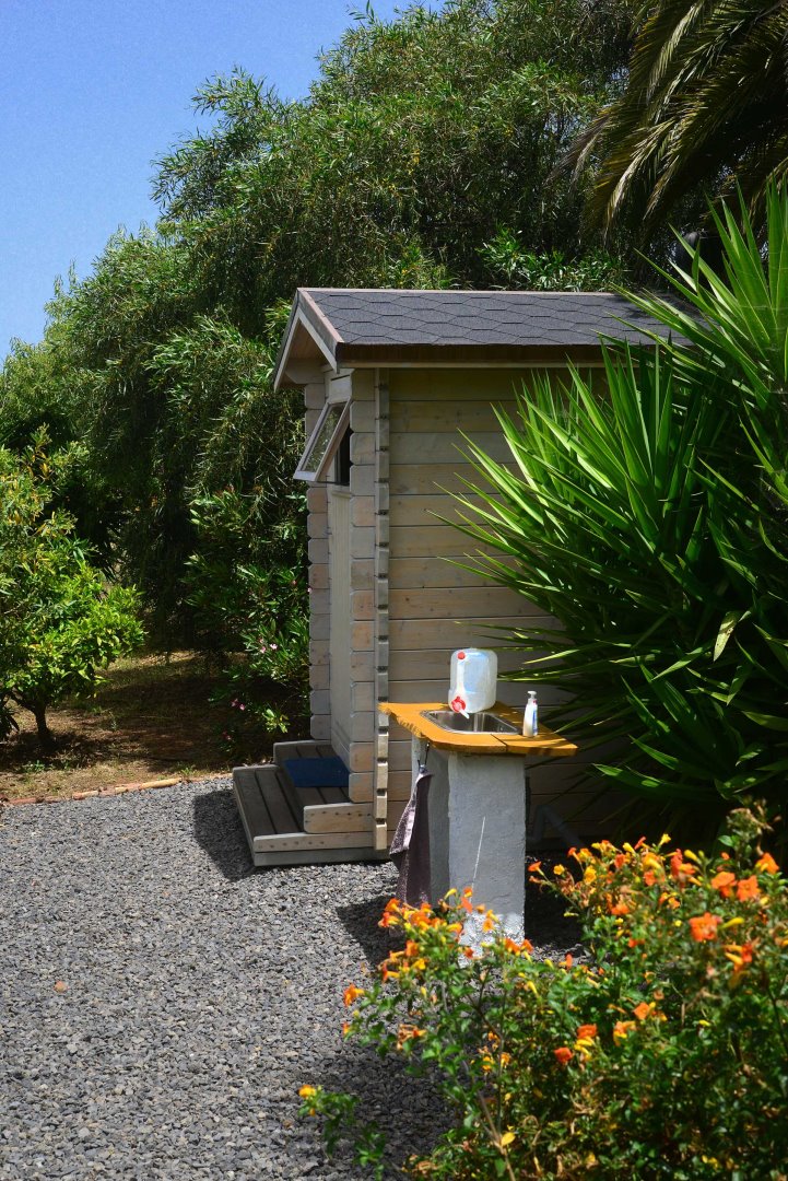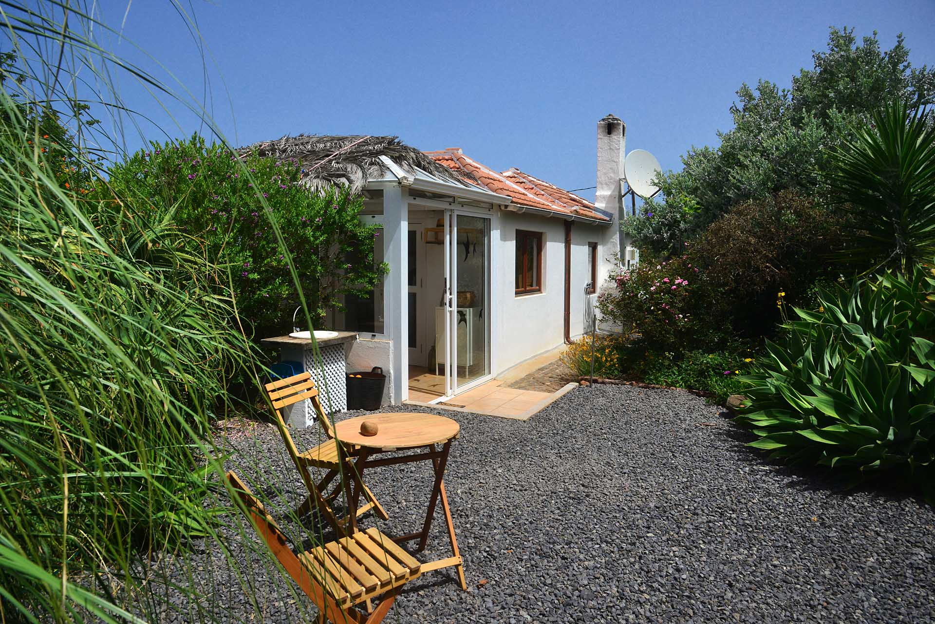Im Garten befindet sich auch ein neu errichtetes Holzhaus für Gartengeräte und ein Sportgerät zum „Hangeln“, Strecken und Dehnen mit Meerblick.