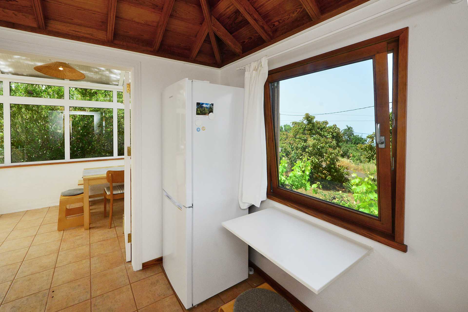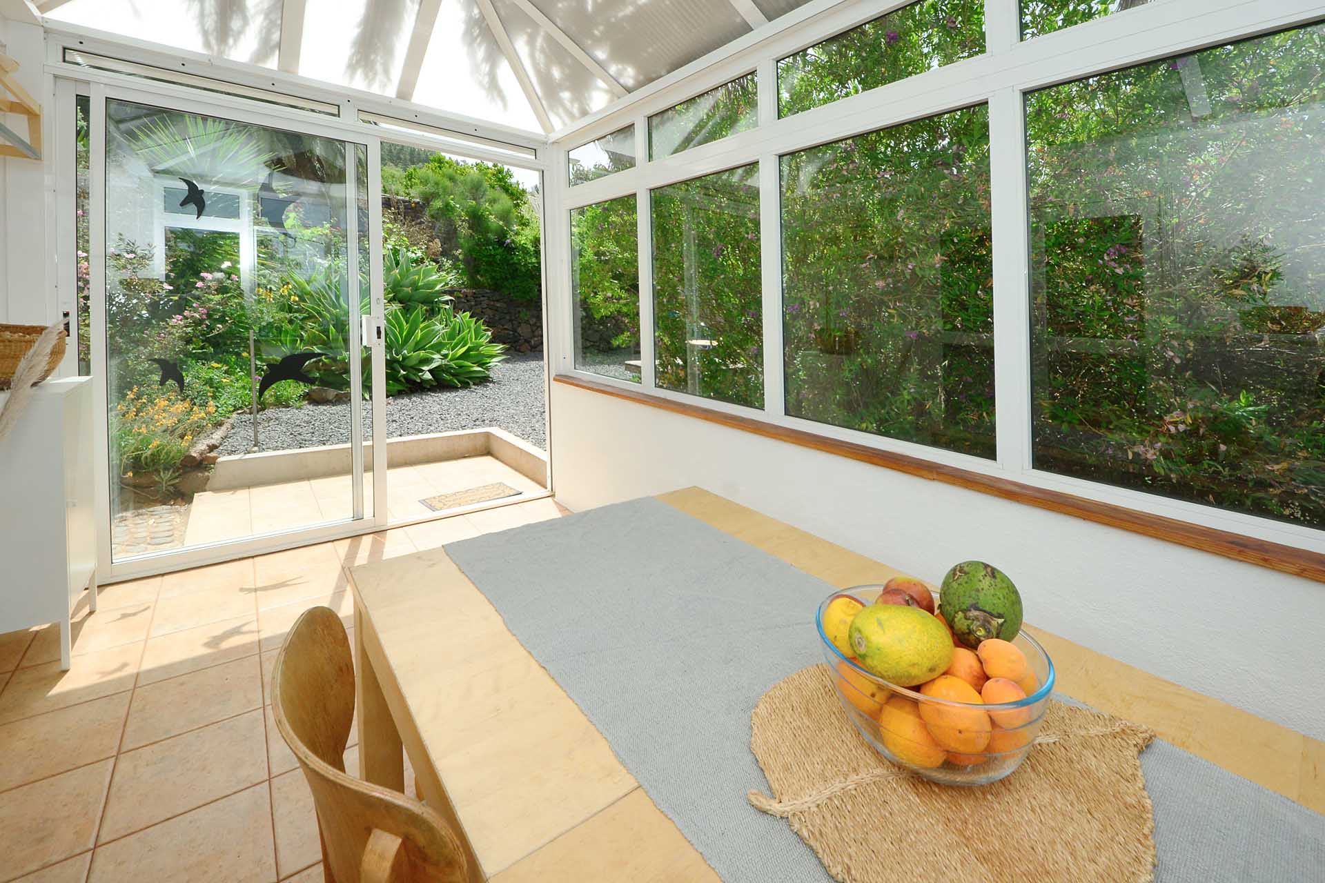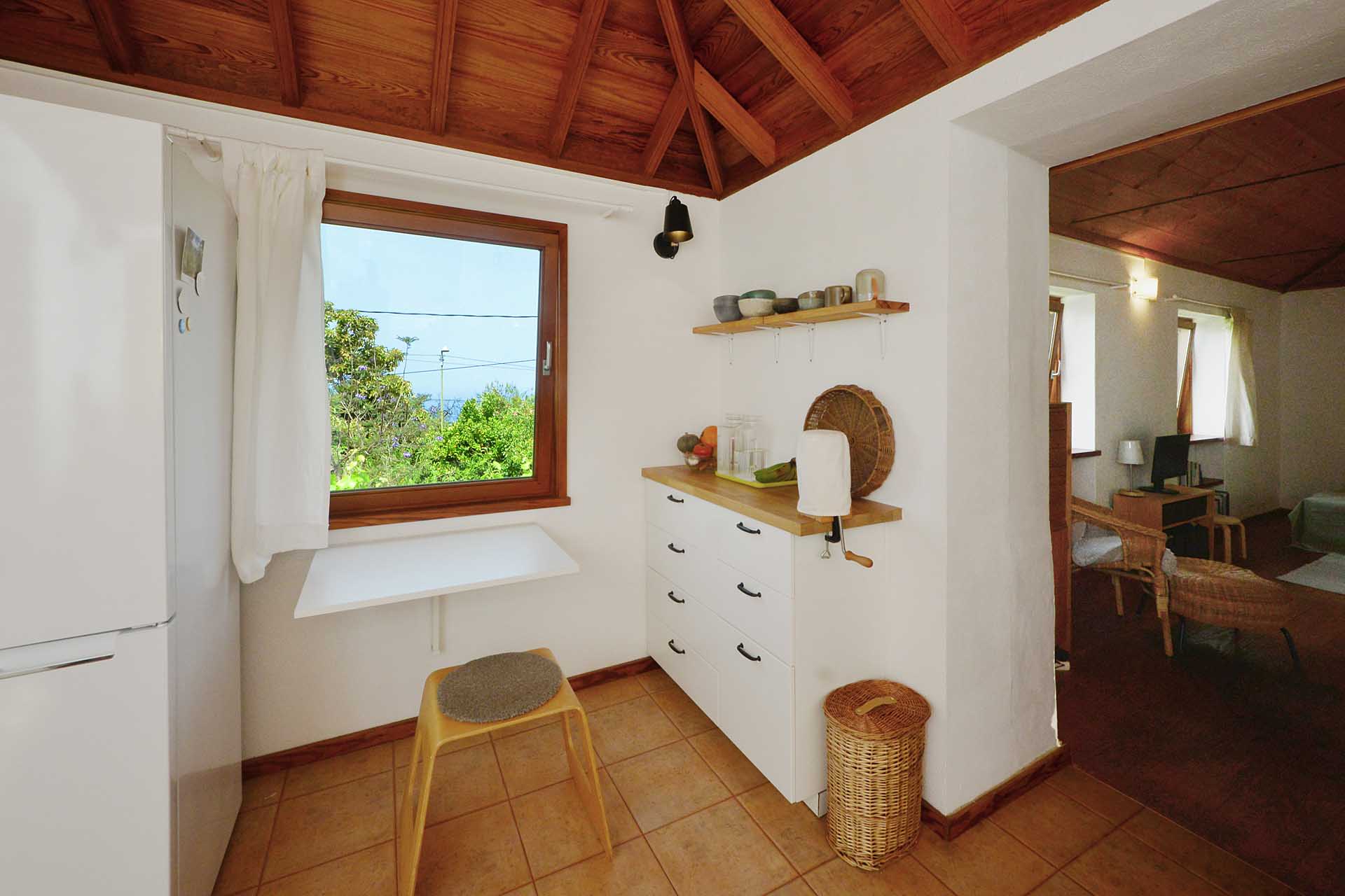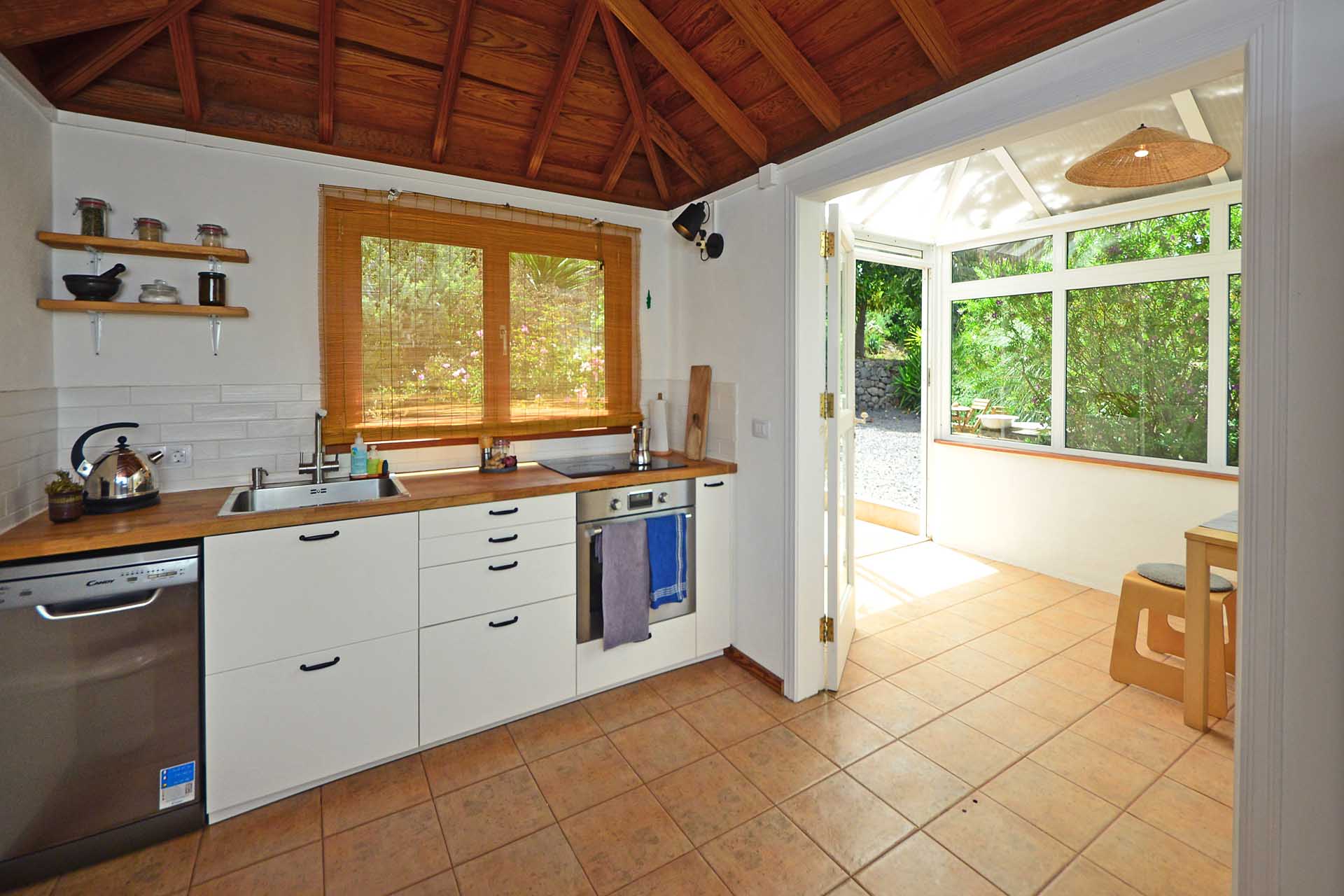 Sie betreten den Wohnbereich im Obergeschoss über eine gemütliche und geschützte Terrasse und einen hellen Wintergarten mit Meerblick. Dieser wird überwiegend als Esszimmer genutzt, wenn man nicht im freien dinieren möchte. An den Wintergarten grenzt eine neu eingebaute, praktisch ausgestattete Küche, von dort gelangen Sie in das große und helle Wohnzimmer, mit gemütlichem, jedoch unaufdringlichem Holzfußboden und Holzvertäfelung des typisch kanarischen Walmdachstuhls aus Riga-Holz. Außergewöhnlich für La Palma sind die insgesamt vier Fenster zu beiden Seiten des Raumes, die ihm eine überaus helle und freundliche Atmosphäre verleihen.