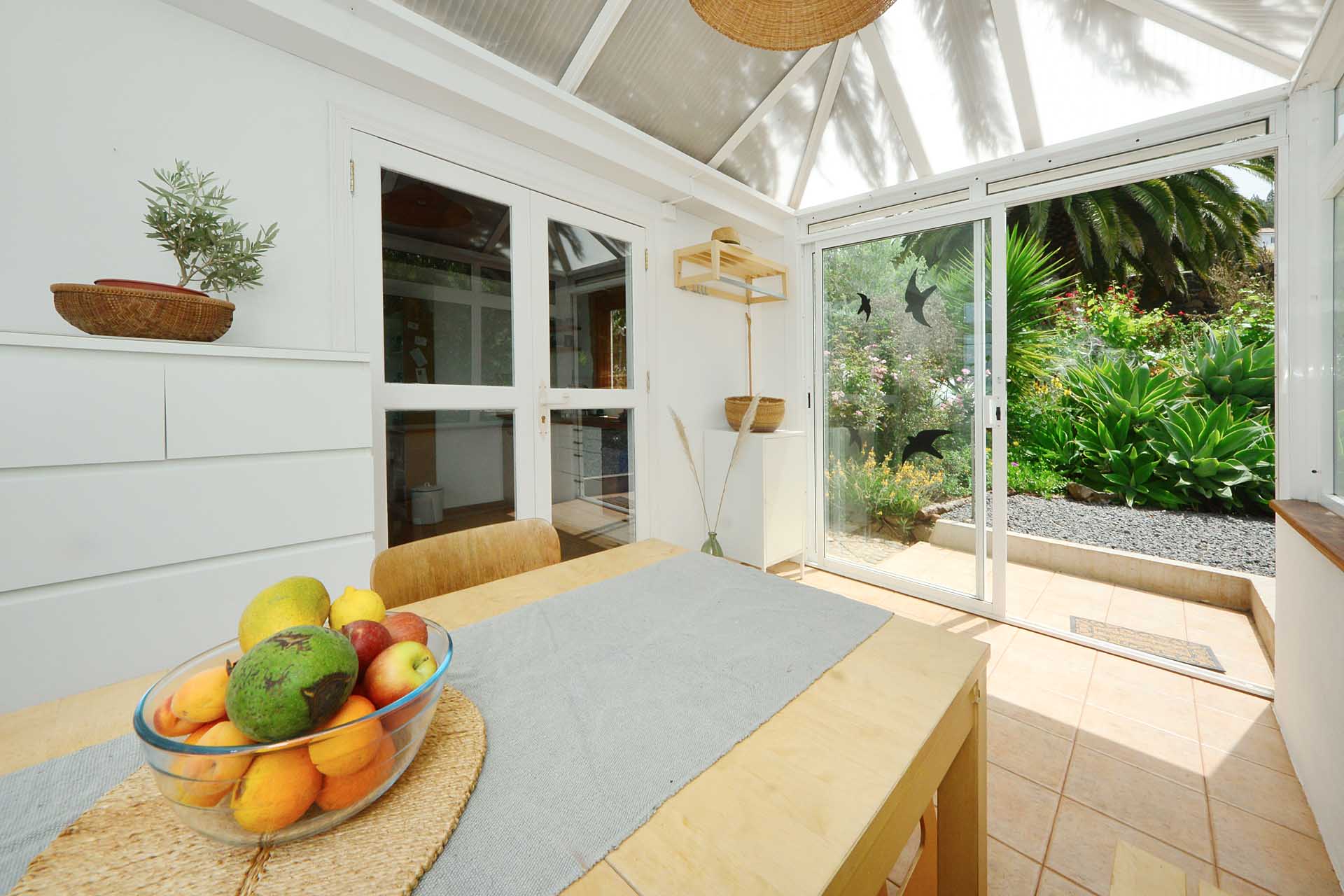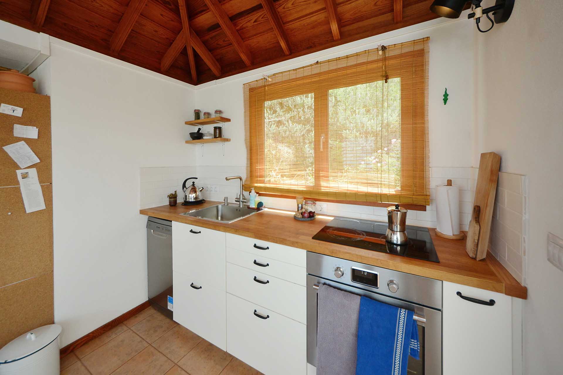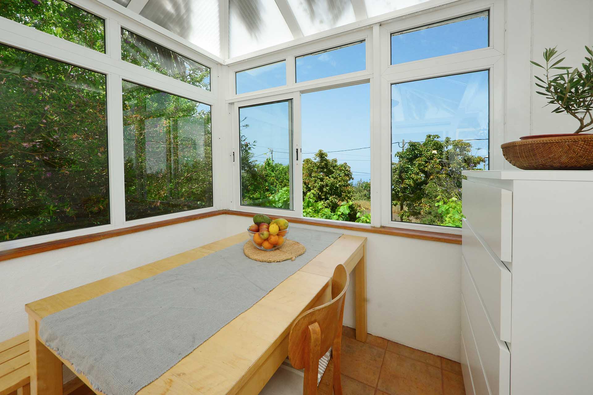 Sie betreten den Wohnbereich im Obergeschoss über eine gemütliche und geschützte Terrasse und einen hellen Wintergarten mit Meerblick. Dieser wird überwiegend als Esszimmer genutzt, wenn man nicht im freien dinieren möchte. An den Wintergarten grenzt eine neu eingebaute, praktisch ausgestattete Küche, von dort gelangen Sie in das große und helle Wohnzimmer, mit gemütlichem, jedoch unaufdringlichem Holzfußboden und Holzvertäfelung des typisch kanarischen Walmdachstuhls aus Riga-Holz. Außergewöhnlich für La Palma sind die insgesamt vier Fenster zu beiden Seiten des Raumes, die ihm eine überaus helle und freundliche Atmosphäre verleihen.