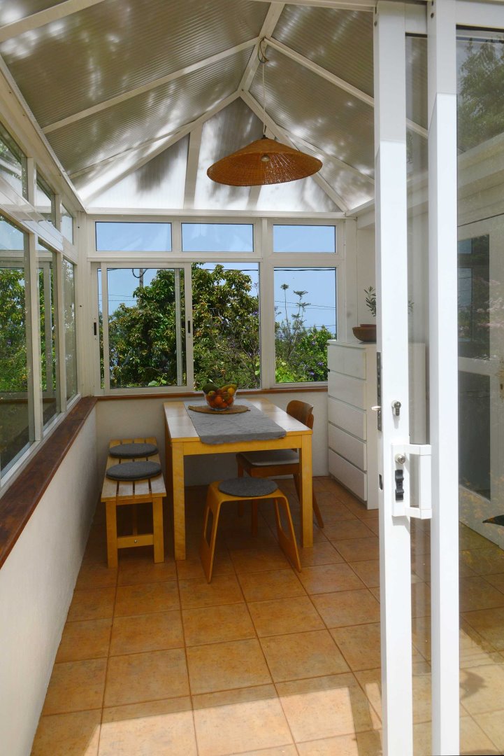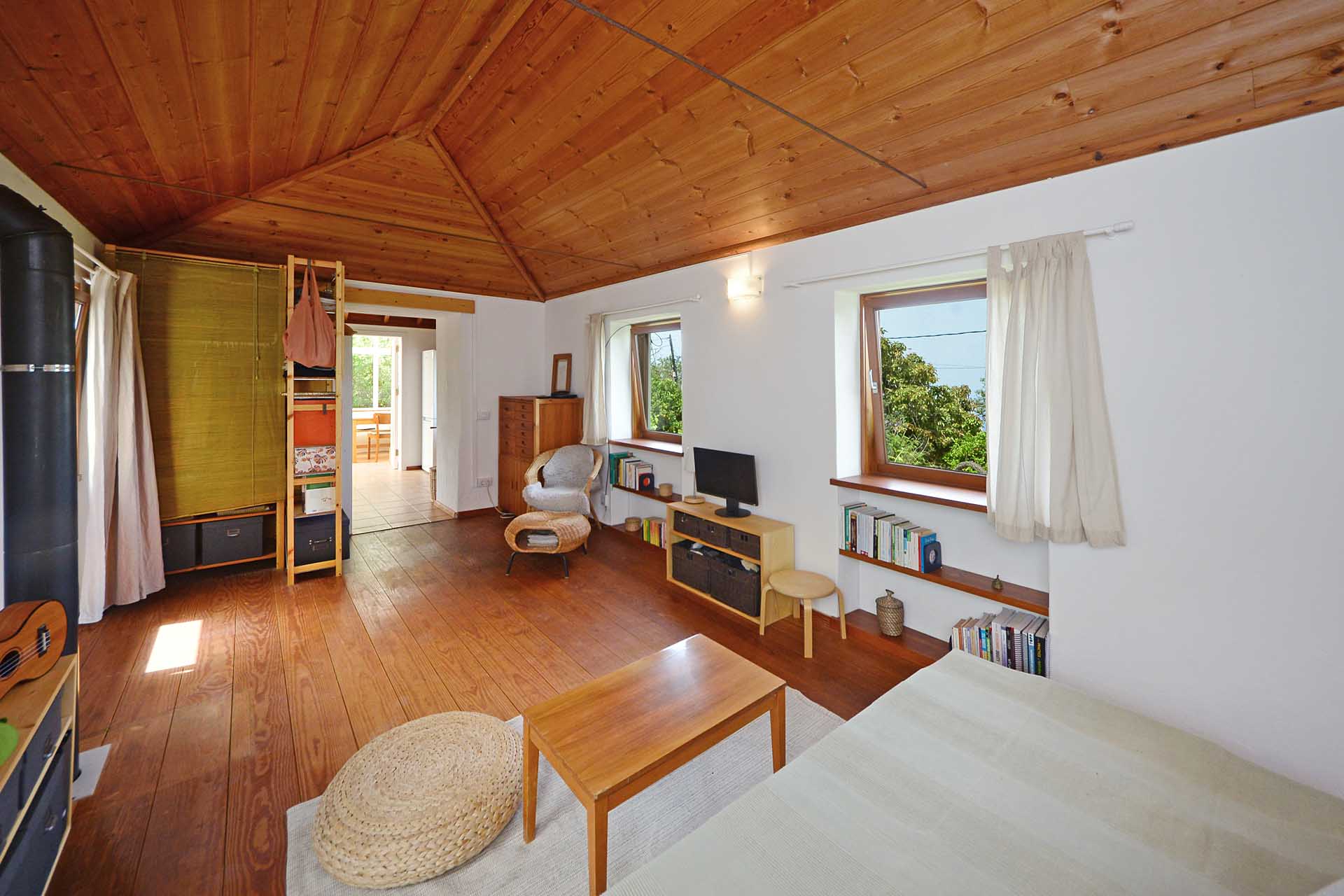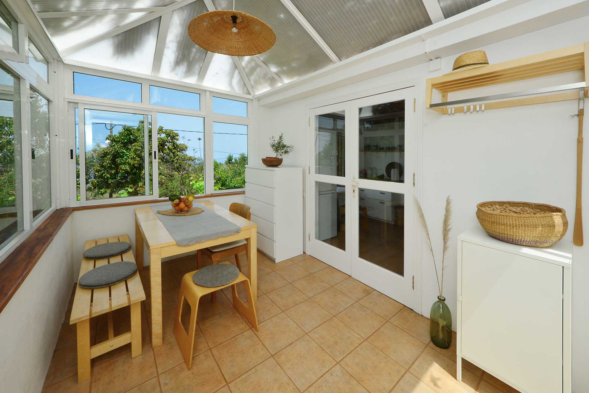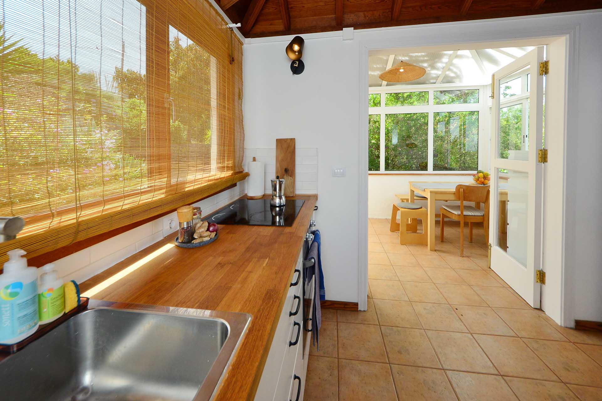 Sie betreten den Wohnbereich im Obergeschoss über eine gemütliche und geschützte Terrasse und einen hellen Wintergarten mit Meerblick. Dieser wird überwiegend als Esszimmer genutzt, wenn man nicht im freien dinieren möchte. An den Wintergarten grenzt eine neu eingebaute, praktisch ausgestattete Küche, von dort gelangen Sie in das große und helle Wohnzimmer, mit gemütlichem, jedoch unaufdringlichem Holzfußboden und Holzvertäfelung des typisch kanarischen Walmdachstuhls aus Riga-Holz. Außergewöhnlich für La Palma sind die insgesamt vier Fenster zu beiden Seiten des Raumes, die ihm eine überaus helle und freundliche Atmosphäre verleihen.