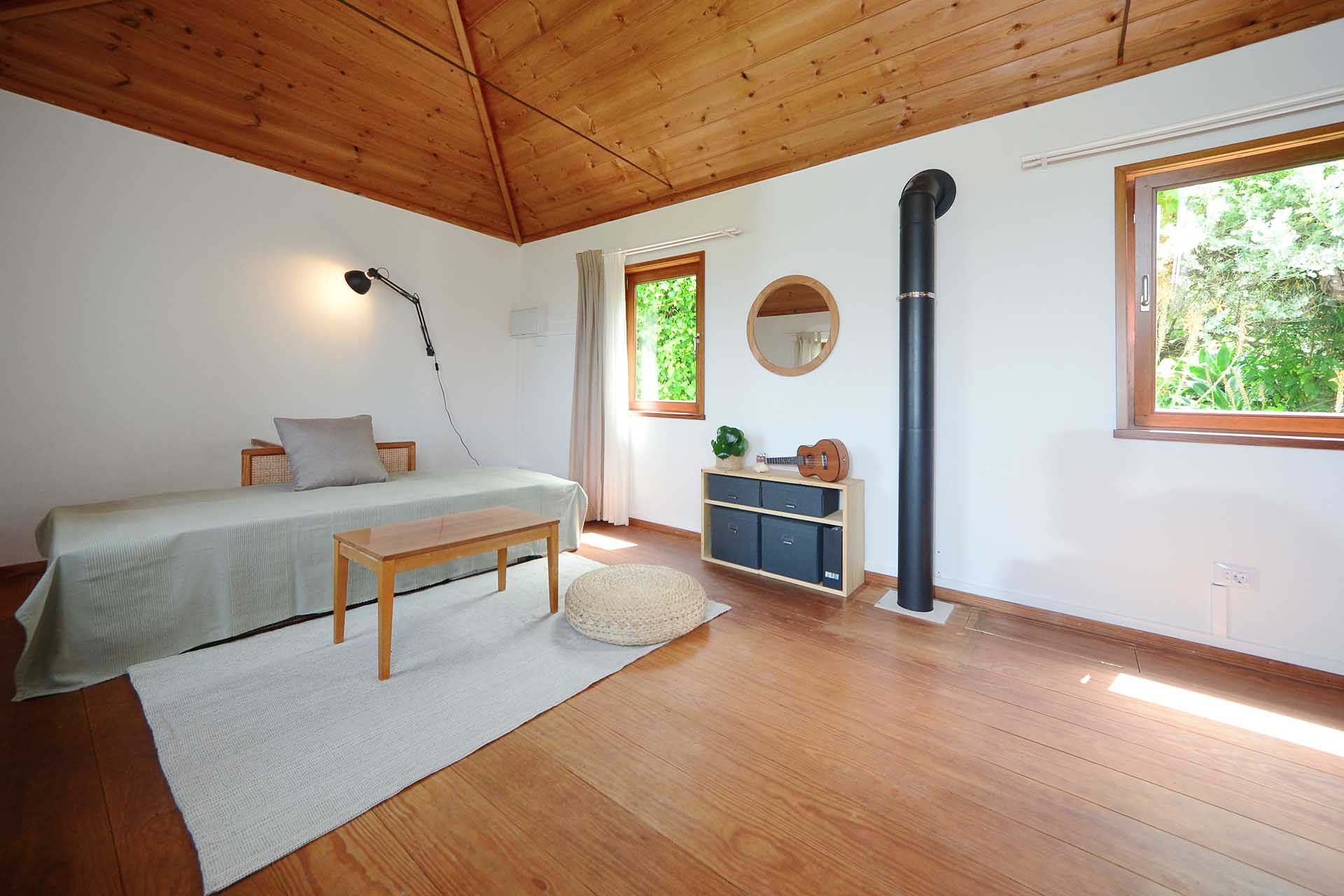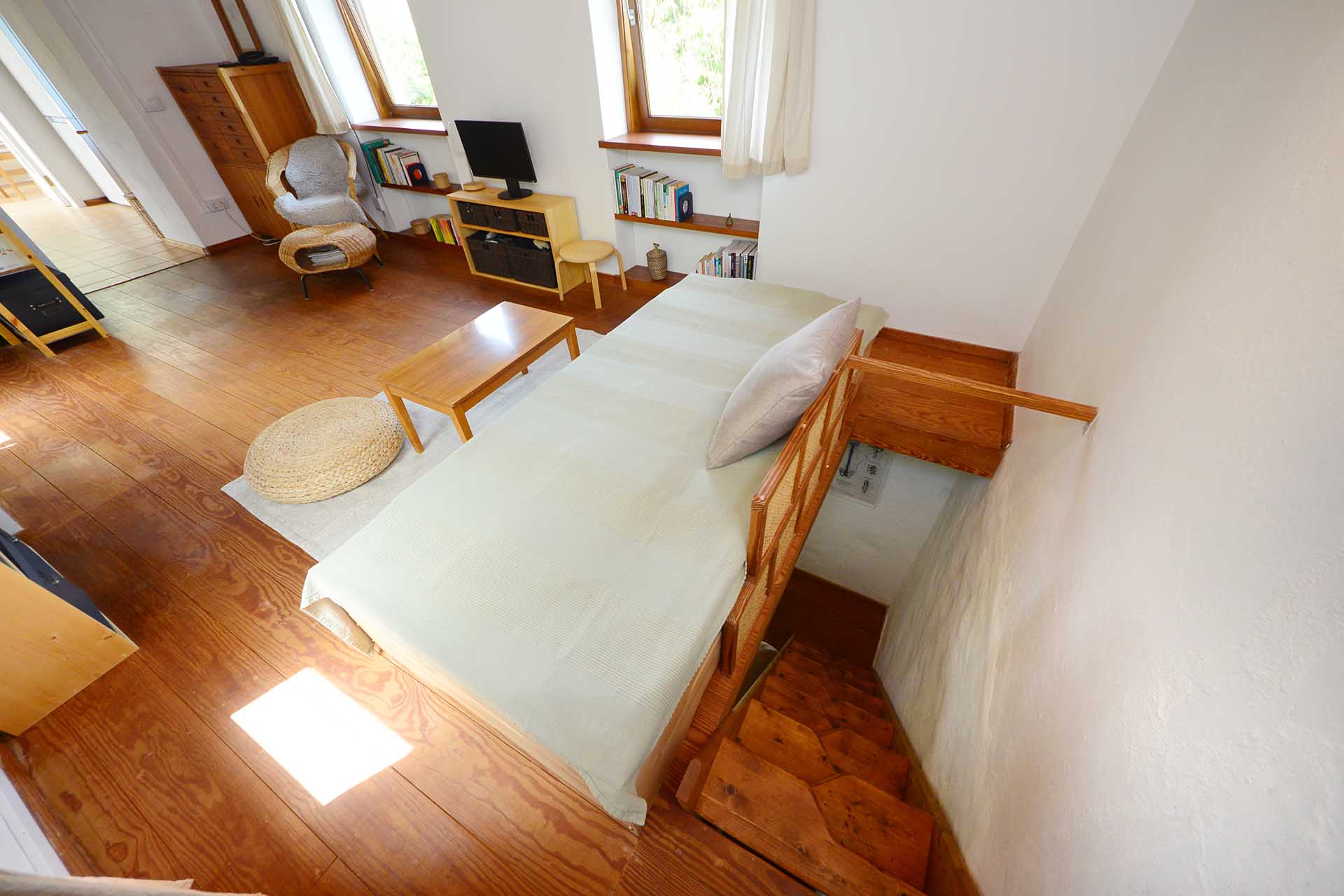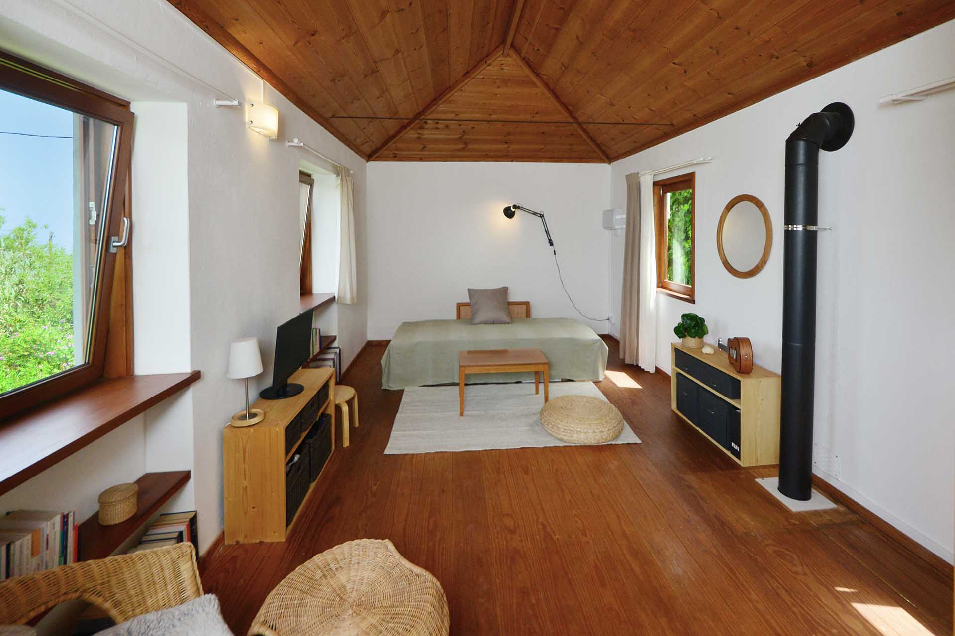 Über eine Raumspartreppe (auch Samba-Treppe genannt) gelangen Sie in das sehr große Schlafzimmer im Erdgeschoss. Zugegeben, diese Treppen sind zwar äußerst platzsparend, aber nicht jedermanns Sache. Die Treppe wäre auf Grund der Größe des Raums problemlos gegen eine „normale“ Treppe auszutauschen. Das Schlafzimmer verfügt über zwei Glastüren, so dass Sie unmittelbar ins Freie gelangen können und der Raum sehr gut belichtet und belüftet werden kann. Ehemals war im Schlafzimmer ein offenes Badezimmer installiert, das von den jetzigen Eigentümern gegen die ökologische Außenlösung ausgetauscht wurde. Alle Ver- und Entsorgungsleitungen sowie eine Sickergrube für ein Innen-Badezimmer, das auch mit einer Wand vom Schlafzimmer abgetrennt werden kann, sind vorhanden, so dass hier einfach ein Bad integriert werden kann.