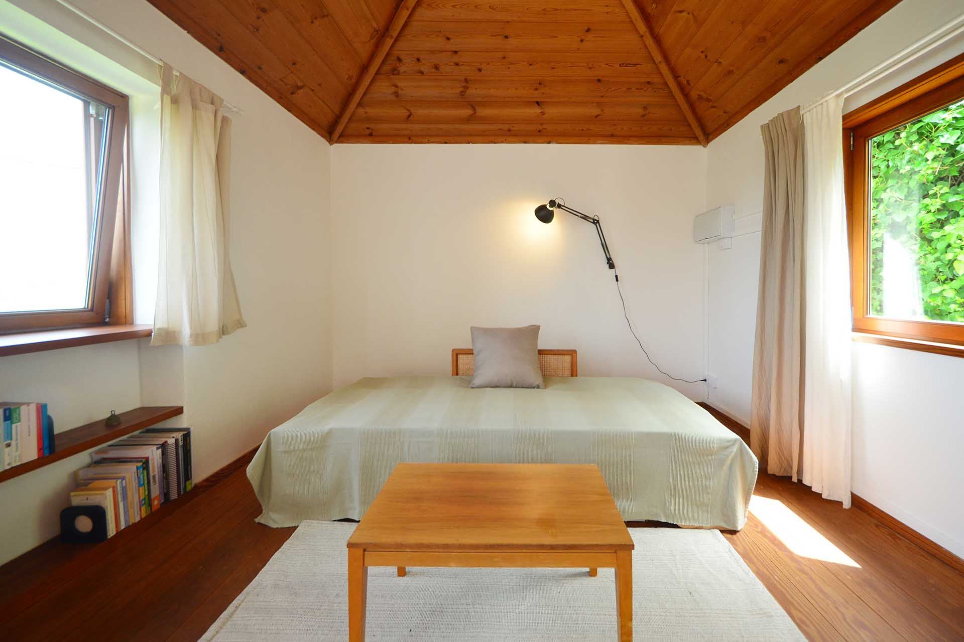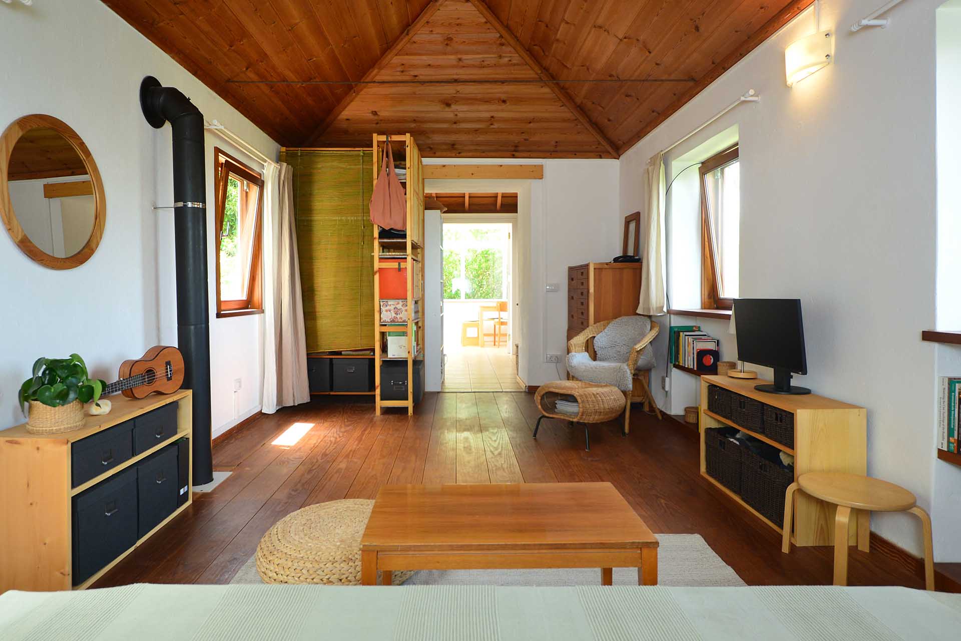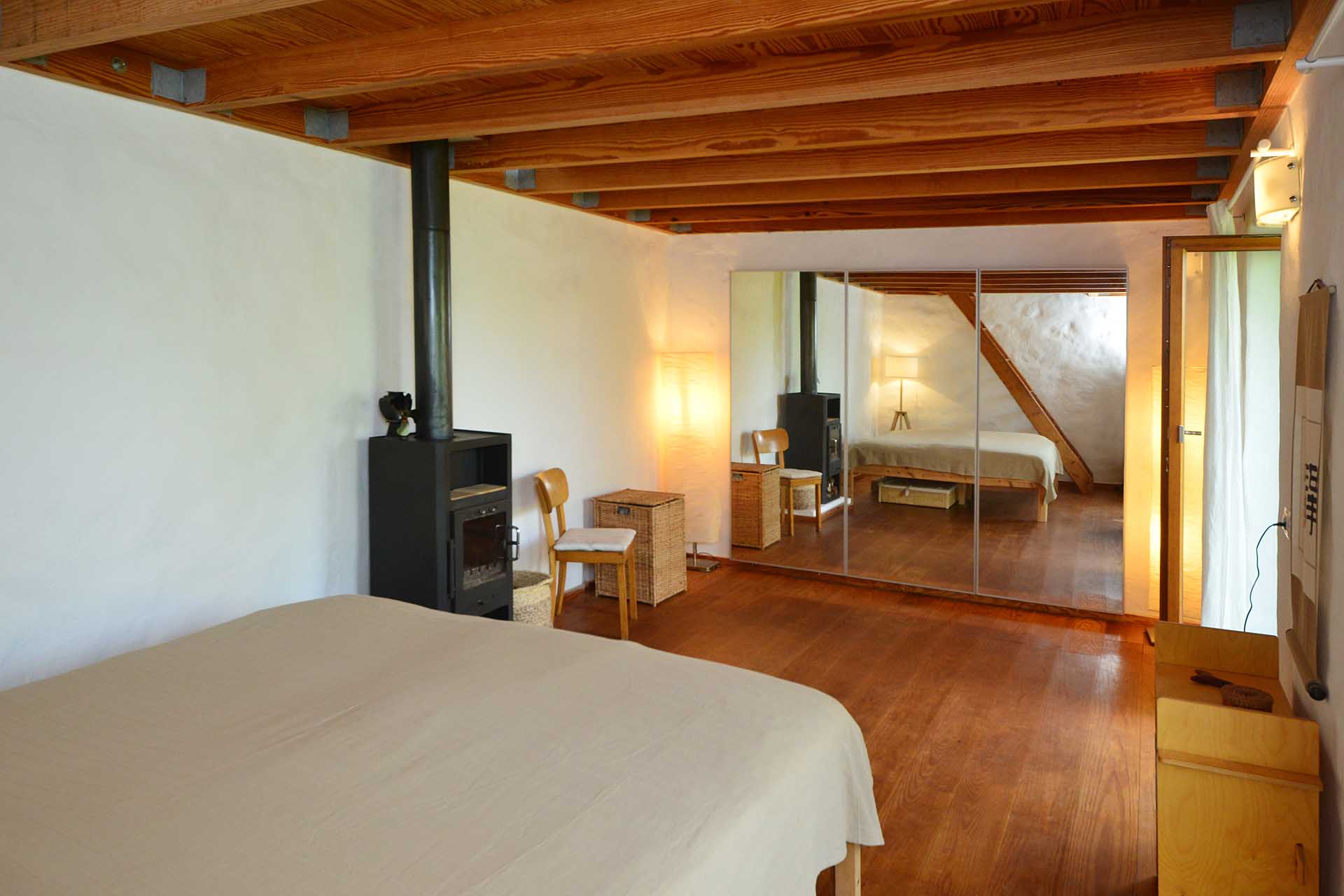 Über eine Raumspartreppe (auch Samba-Treppe genannt) gelangen Sie in das sehr große Schlafzimmer im Erdgeschoss. Zugegeben, diese Treppen sind zwar äußerst platzsparend, aber nicht jedermanns Sache. Die Treppe wäre auf Grund der Größe des Raums problemlos gegen eine „normale“ Treppe auszutauschen. Das Schlafzimmer verfügt über zwei Glastüren, so dass Sie unmittelbar ins Freie gelangen können und der Raum sehr gut belichtet und belüftet werden kann. Ehemals war im Schlafzimmer ein offenes Badezimmer installiert, das von den jetzigen Eigentümern gegen die ökologische Außenlösung ausgetauscht wurde. Alle Ver- und Entsorgungsleitungen sowie eine Sickergrube für ein Innen-Badezimmer, das auch mit einer Wand vom Schlafzimmer abgetrennt werden kann, sind vorhanden, so dass hier einfach ein Bad integriert werden kann.