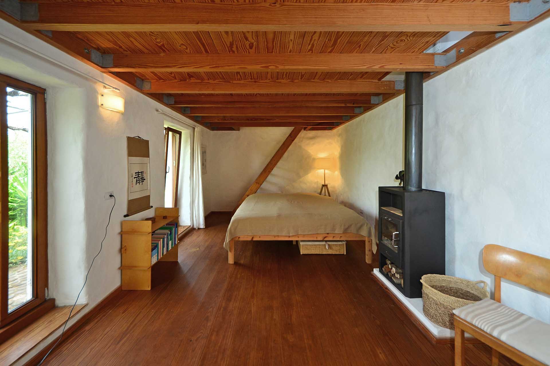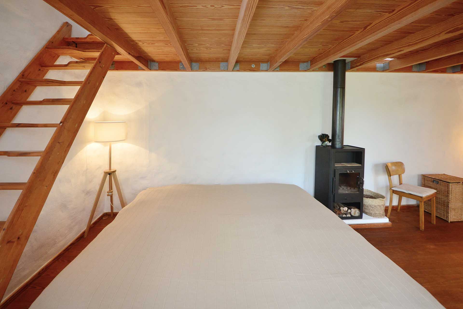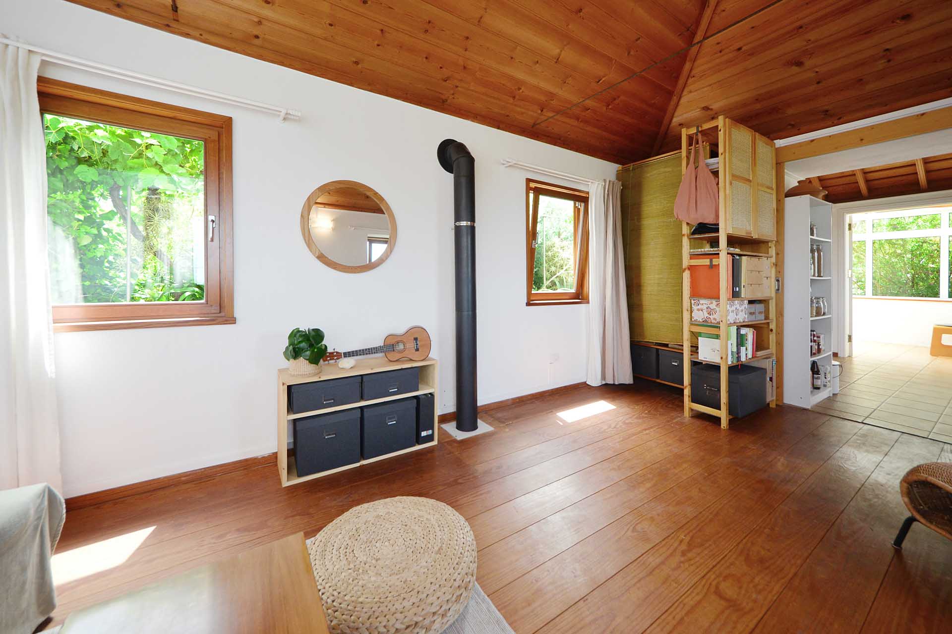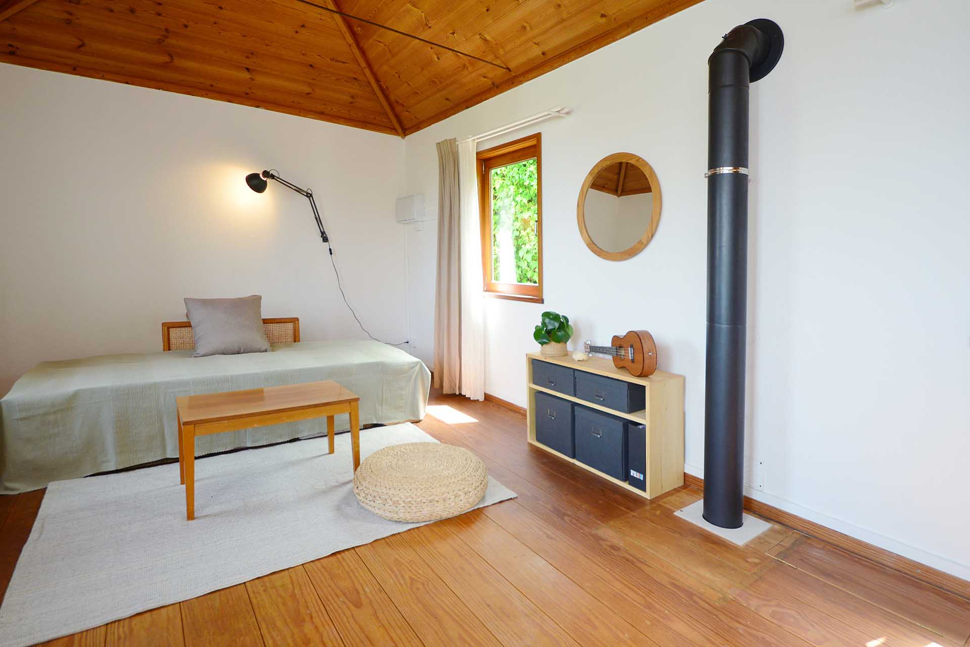 Im Schlafzimmer befindet sich auch ein Kaminofen, dessen Ofenrohr durch das Wohnzimmer über Dach geführt wurde, so dass das gesamte Haus mit diesem einen Ofen gut geheizt werden kann. Zusätzlich steht eine Luftklappe zwischen Schlaf- und Wohnzimmer zur Verfügung im die Wärmeverteilung zu optimieren.