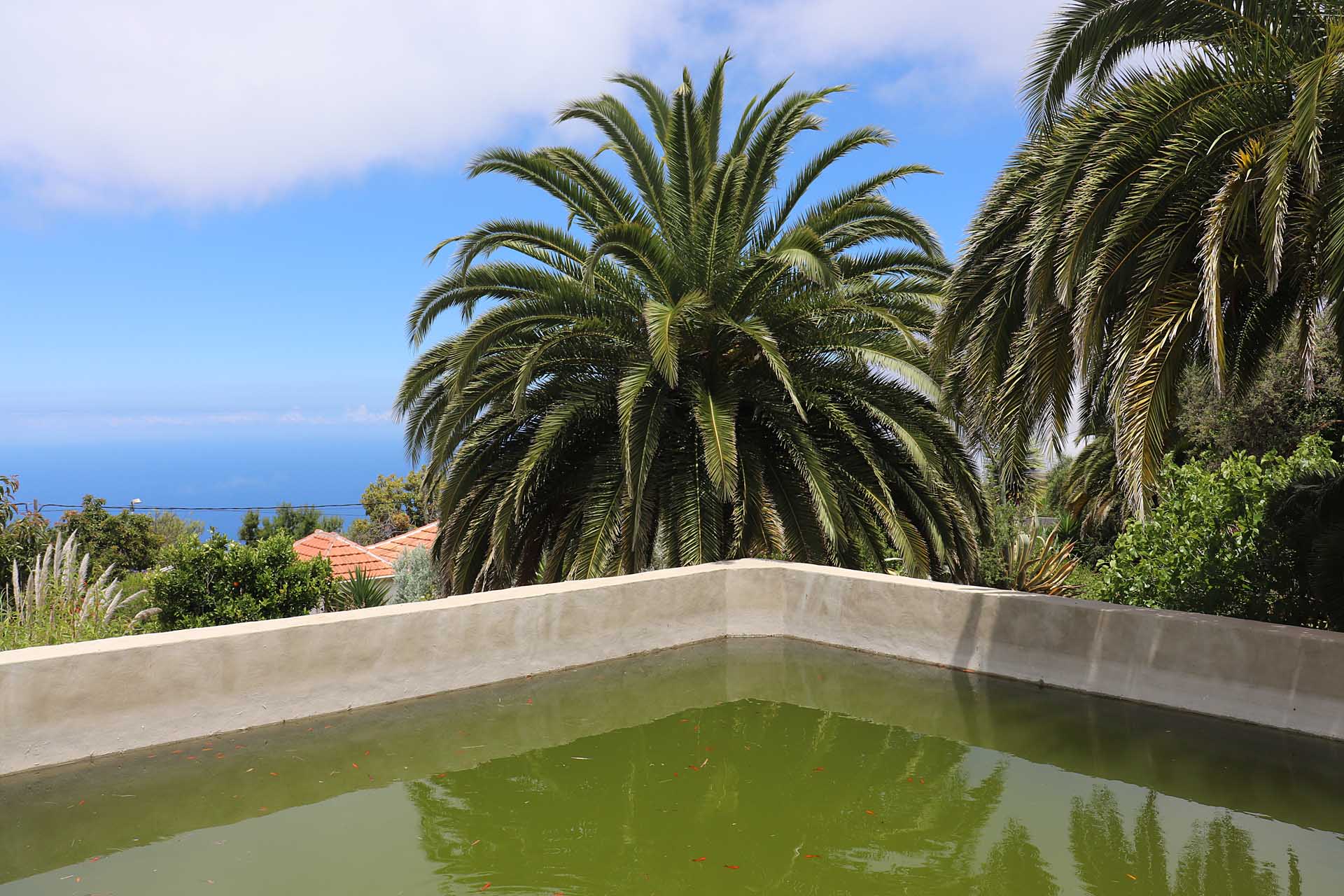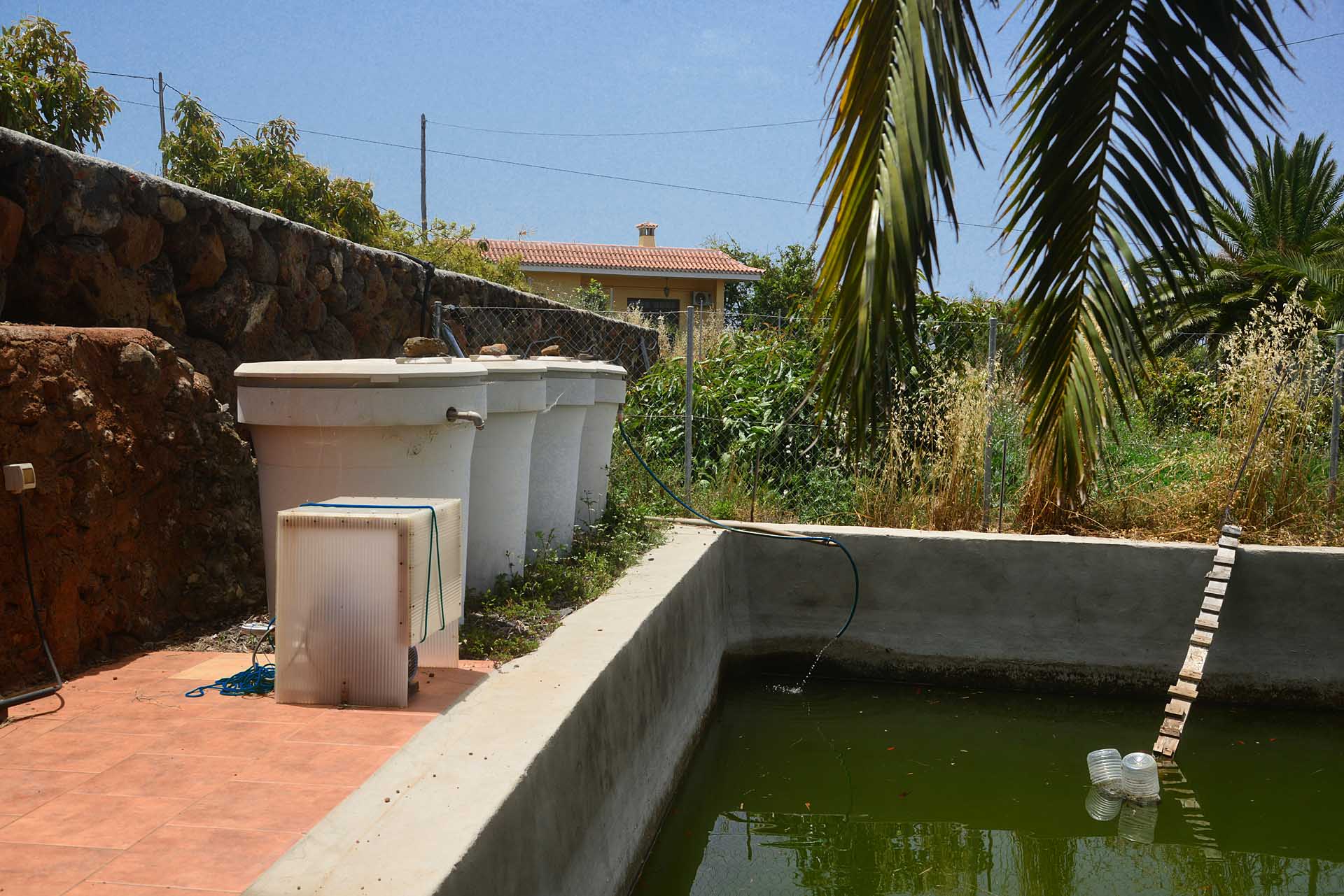 Für die Bewässerung des Gartens steht ein sehr massiv aus Natursteinen gemauerter Wassertank mit einem Fassungsvermögen von 178.000 Litern zur Verfügung, der im Jahre 2018 saniert wurde. Er wird durch eine „Minaderos“ Wasseraktie mit einer Schüttung von 1,2 bis 1,8 Liter pro Minute (je nach Regenmenge im Vorjahr) befüllt wird, die im Kaufpreis inbegriffen ist und derzeit zwischen 25.000 und 32.000 Euro wert ist. Bevor das Wasser in den Gartenwassertank fließt, befüllt es vier Trinkwassertanks mit je 500 Liter Fassungsvermögen, so dass jederzeit frisches und kühles Trinkwasser zur Verfügung steht. Wer dennoch im Haus lieber Stadtwasser verwenden möchte, kann dies einfach erreichen, da das Haus an das Stadtwassernetz angeschlossen ist, Leitungen und Zähler sind vorhanden, wurden jedoch abgemeldet.
