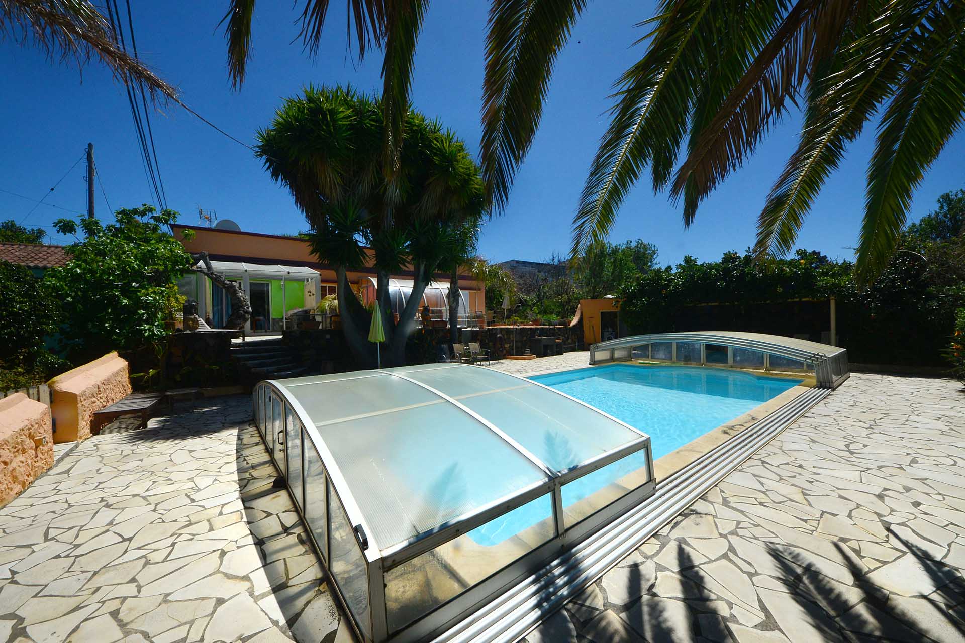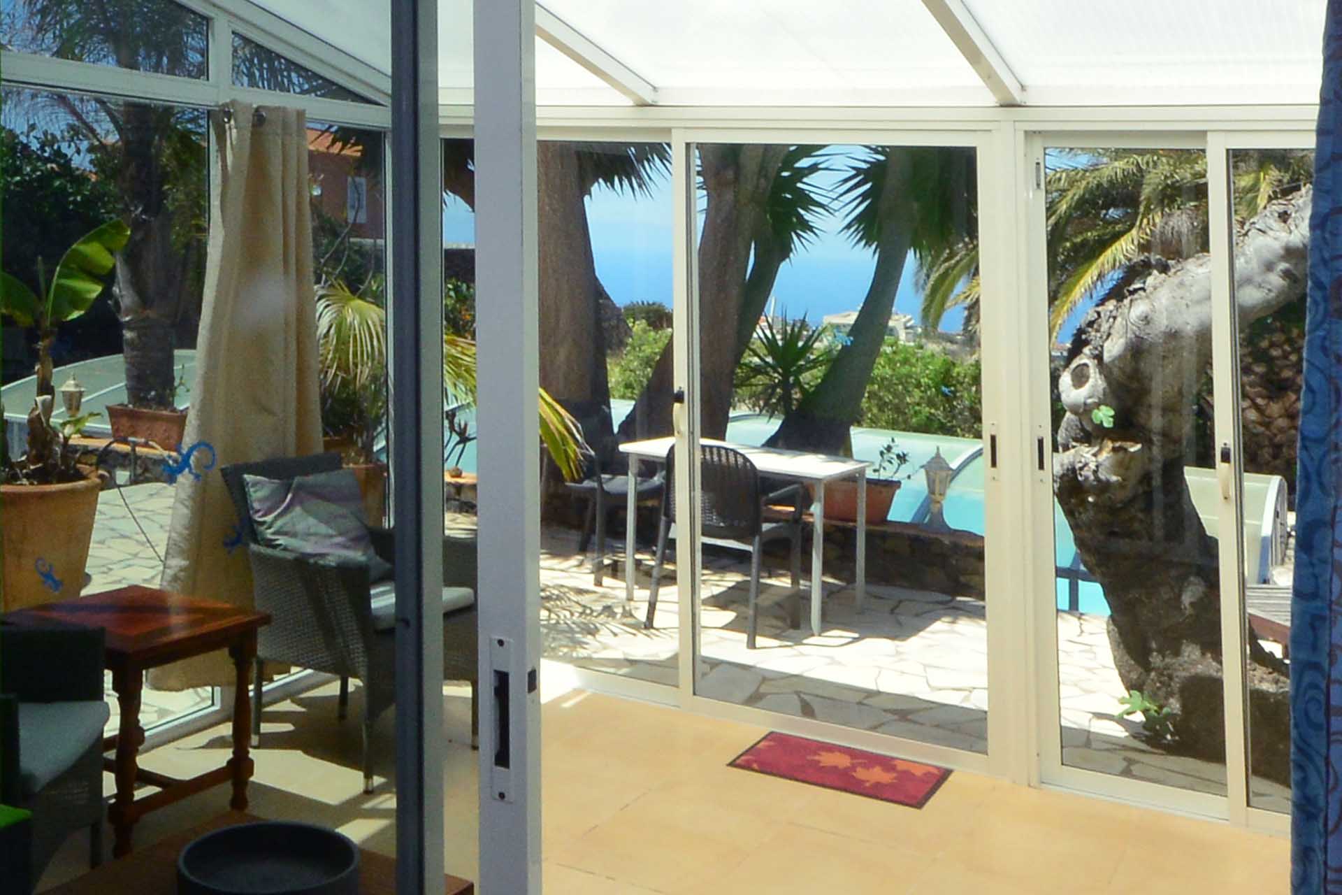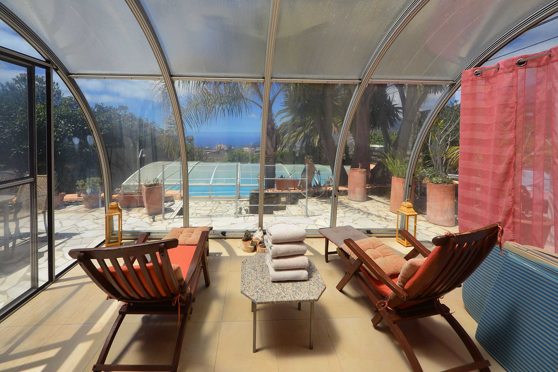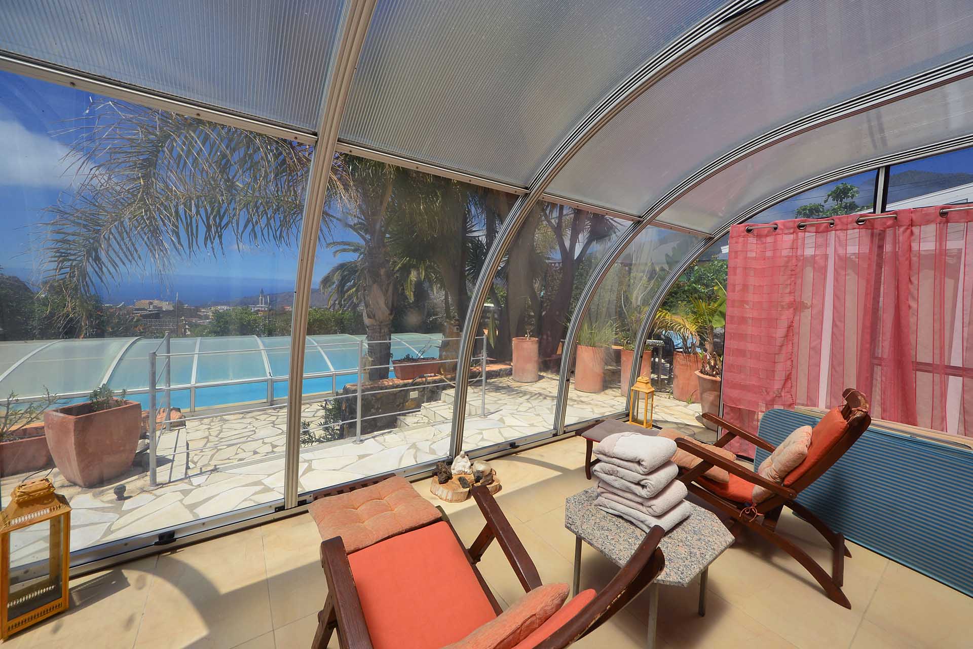 Alle drei Wohneinheiten verfügen über separate Terrassen mit guter Privatsphäre, die beiden Apartments liegen unmittelbar an dem sehr großen Pool (10 x 5 m), der mit einer variablen und transparenten Überdachung sowohl als Freibad, als auch als Hallenbad genutzt werden kann. Die Einhausung sorgt auch dafür, dass er immer eine angenehme Wassertemperatur aufweist, ohne dass er geheizt werden müsste.