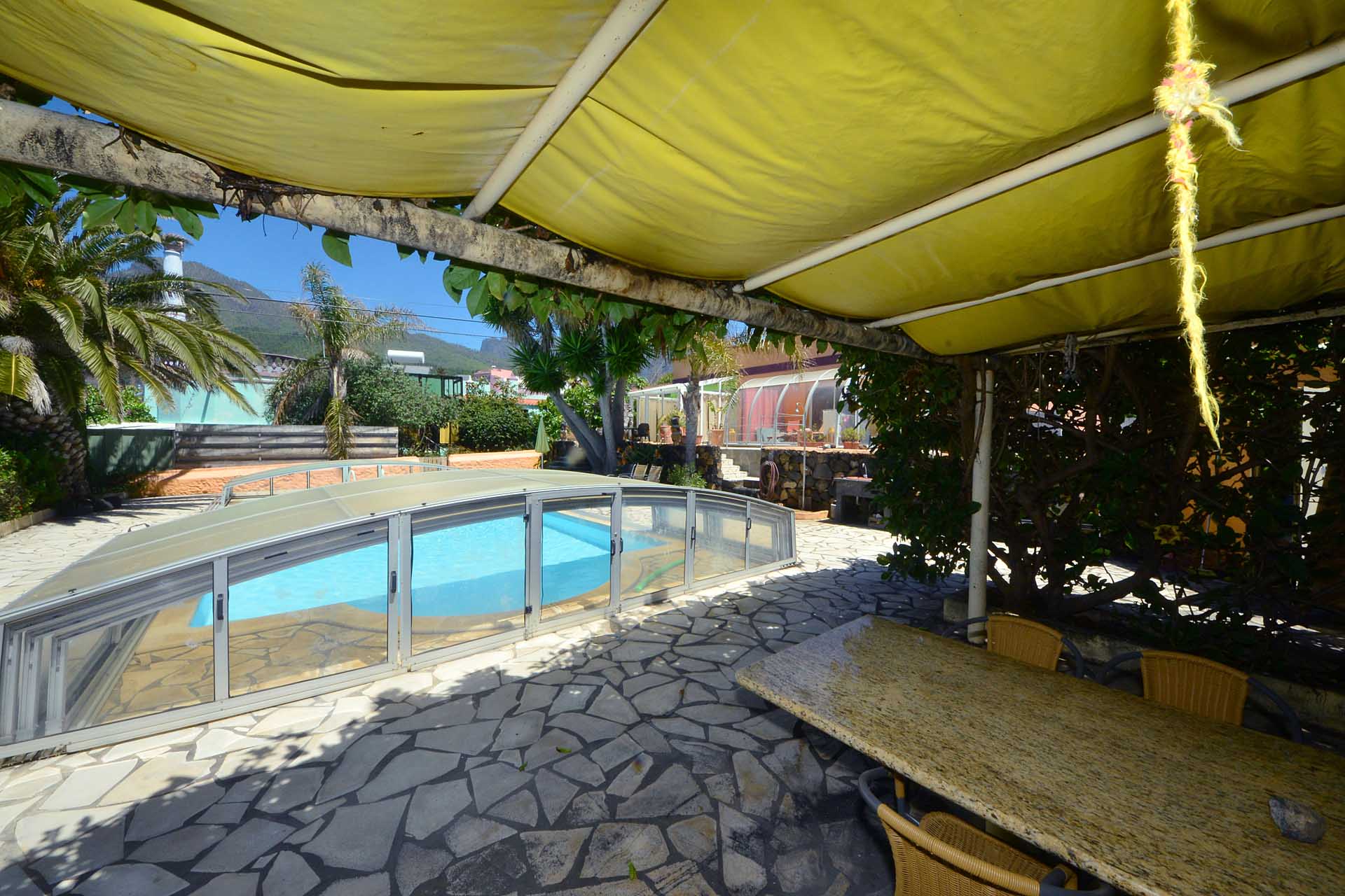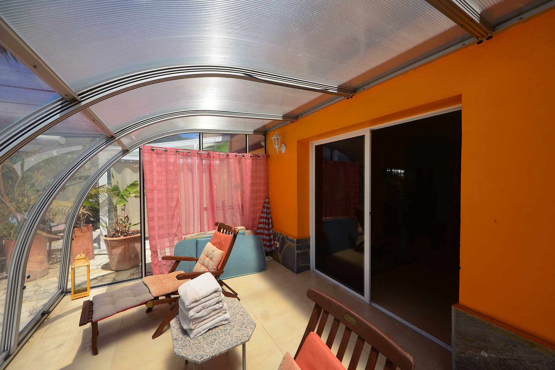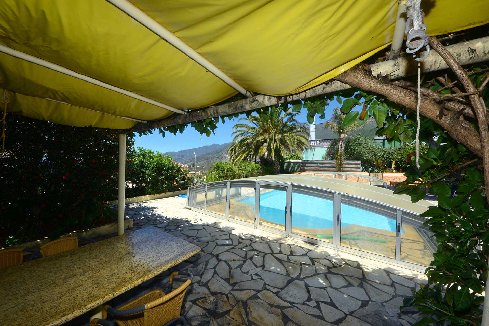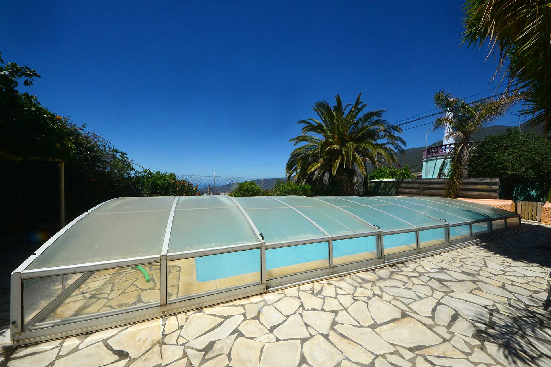 Alle drei Wohneinheiten verfügen über separate Terrassen mit guter Privatsphäre, die beiden Apartments liegen unmittelbar an dem sehr großen Pool (10 x 5 m), der mit einer variablen und transparenten Überdachung sowohl als Freibad, als auch als Hallenbad genutzt werden kann. Die Einhausung sorgt auch dafür, dass er immer eine angenehme Wassertemperatur aufweist, ohne dass er geheizt werden müsste.