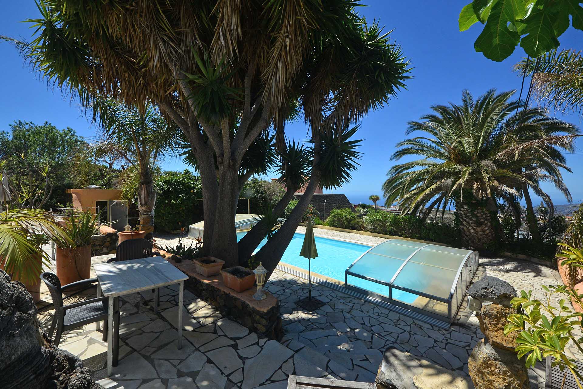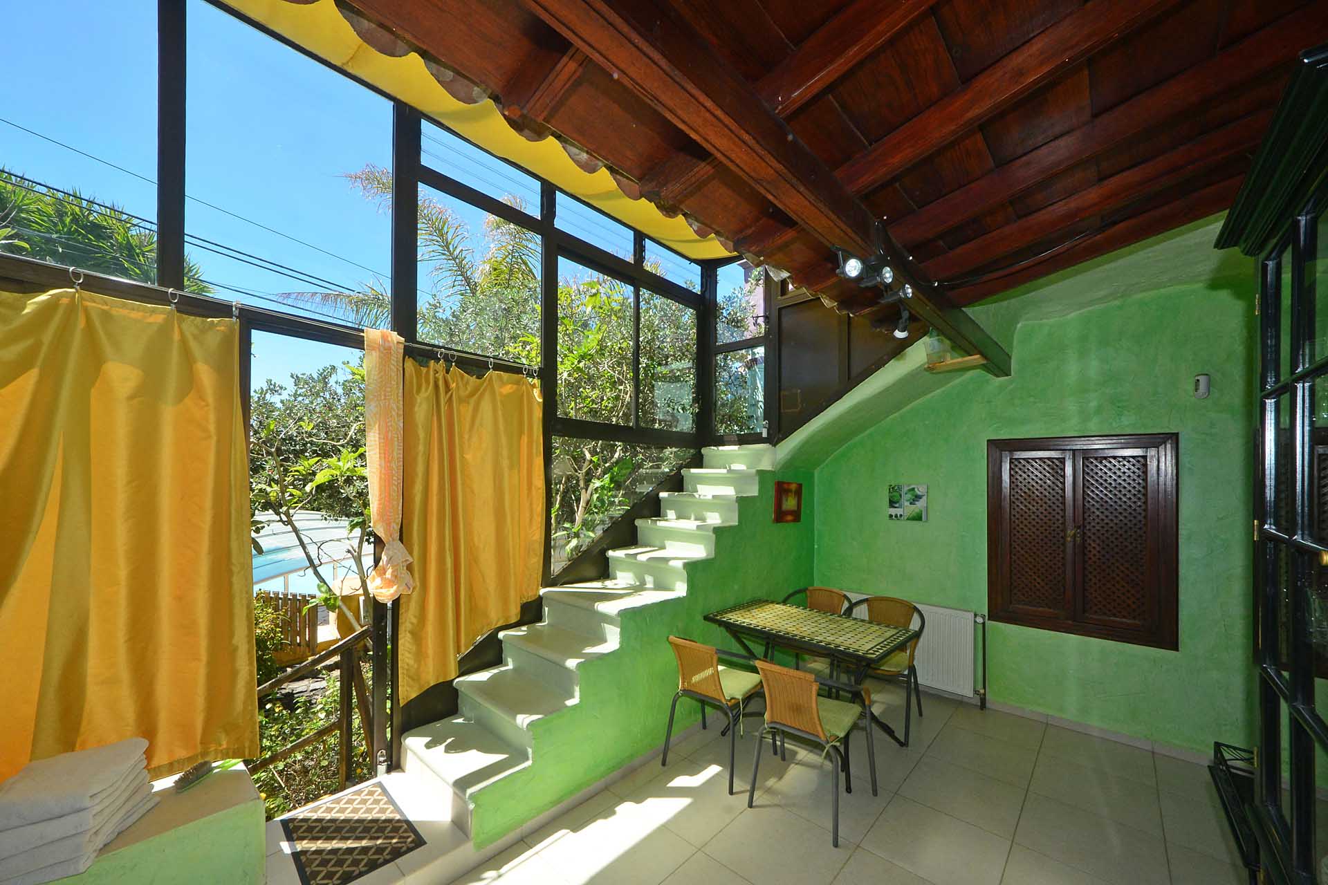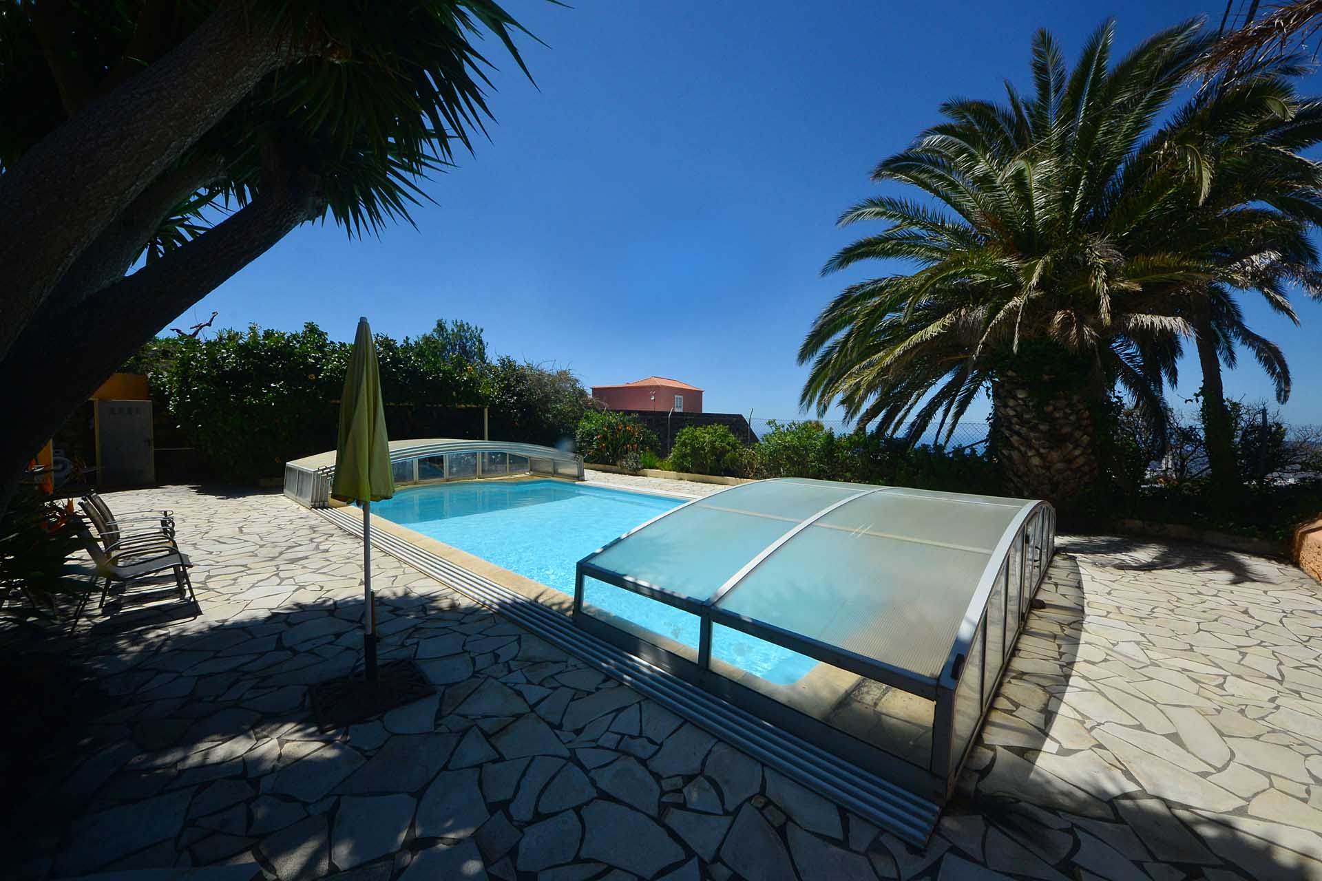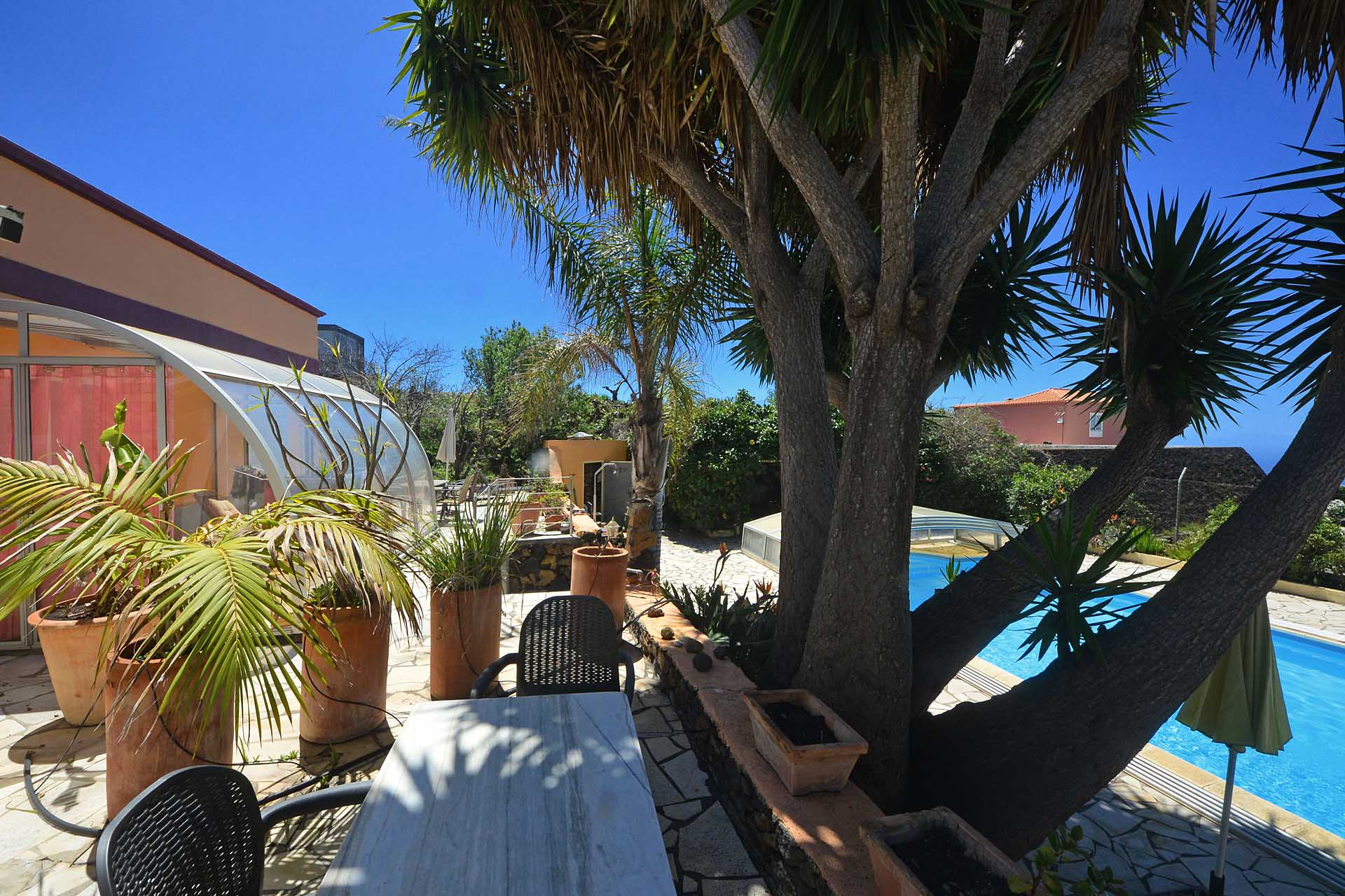 Alle drei Wohneinheiten verfügen über separate Terrassen mit guter Privatsphäre, die beiden Apartments liegen unmittelbar an dem sehr großen Pool (10 x 5 m), der mit einer variablen und transparenten Überdachung sowohl als Freibad, als auch als Hallenbad genutzt werden kann. Die Einhausung sorgt auch dafür, dass er immer eine angenehme Wassertemperatur aufweist, ohne dass er geheizt werden müsste.