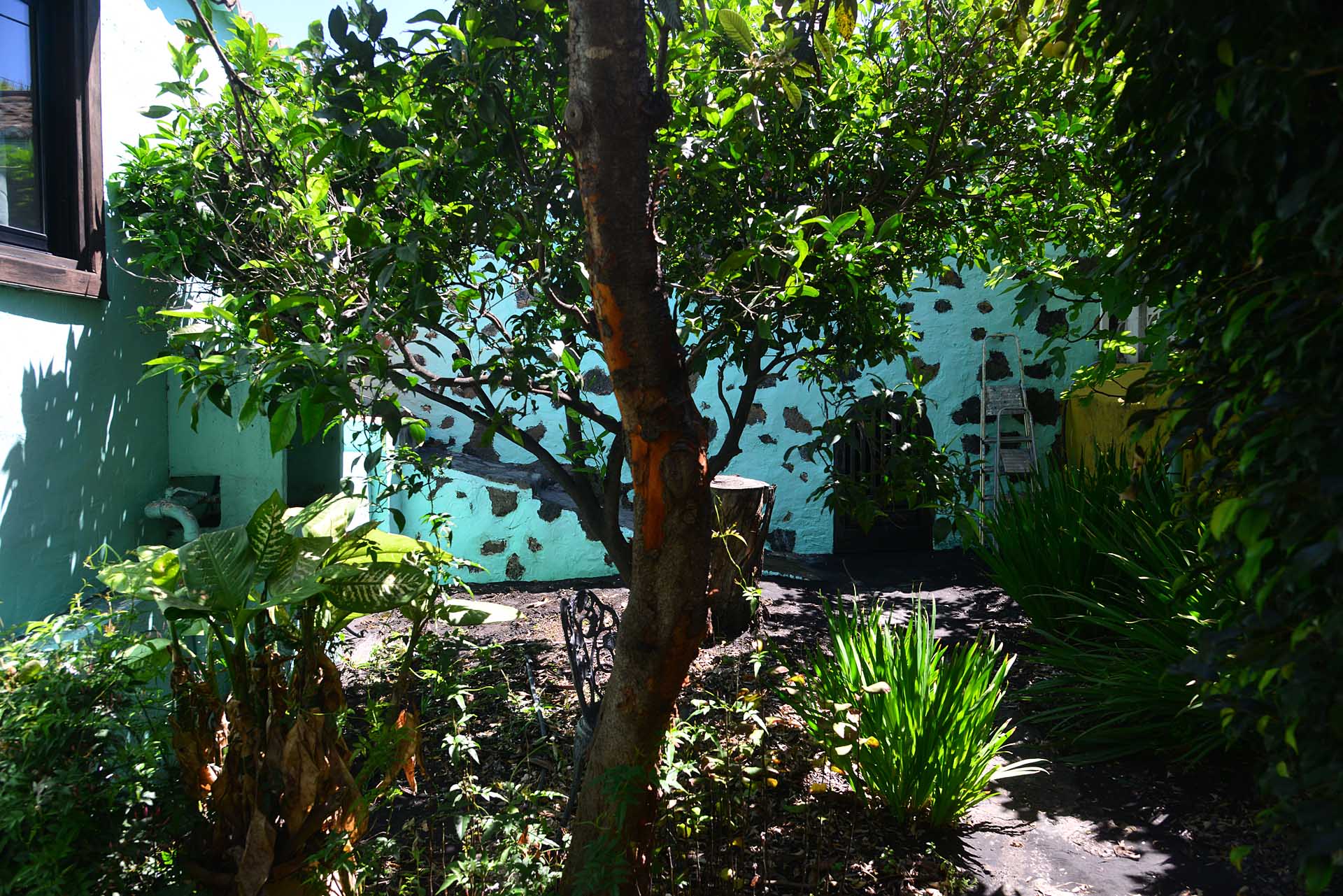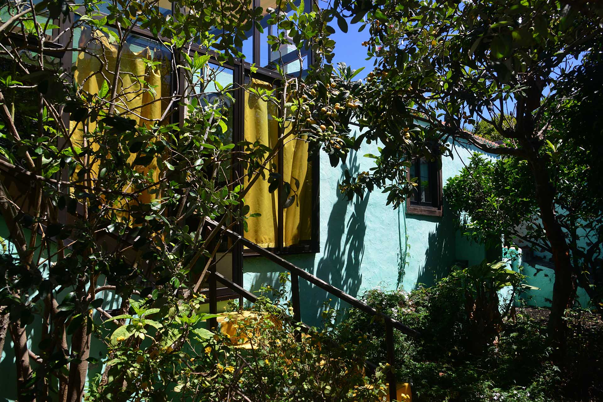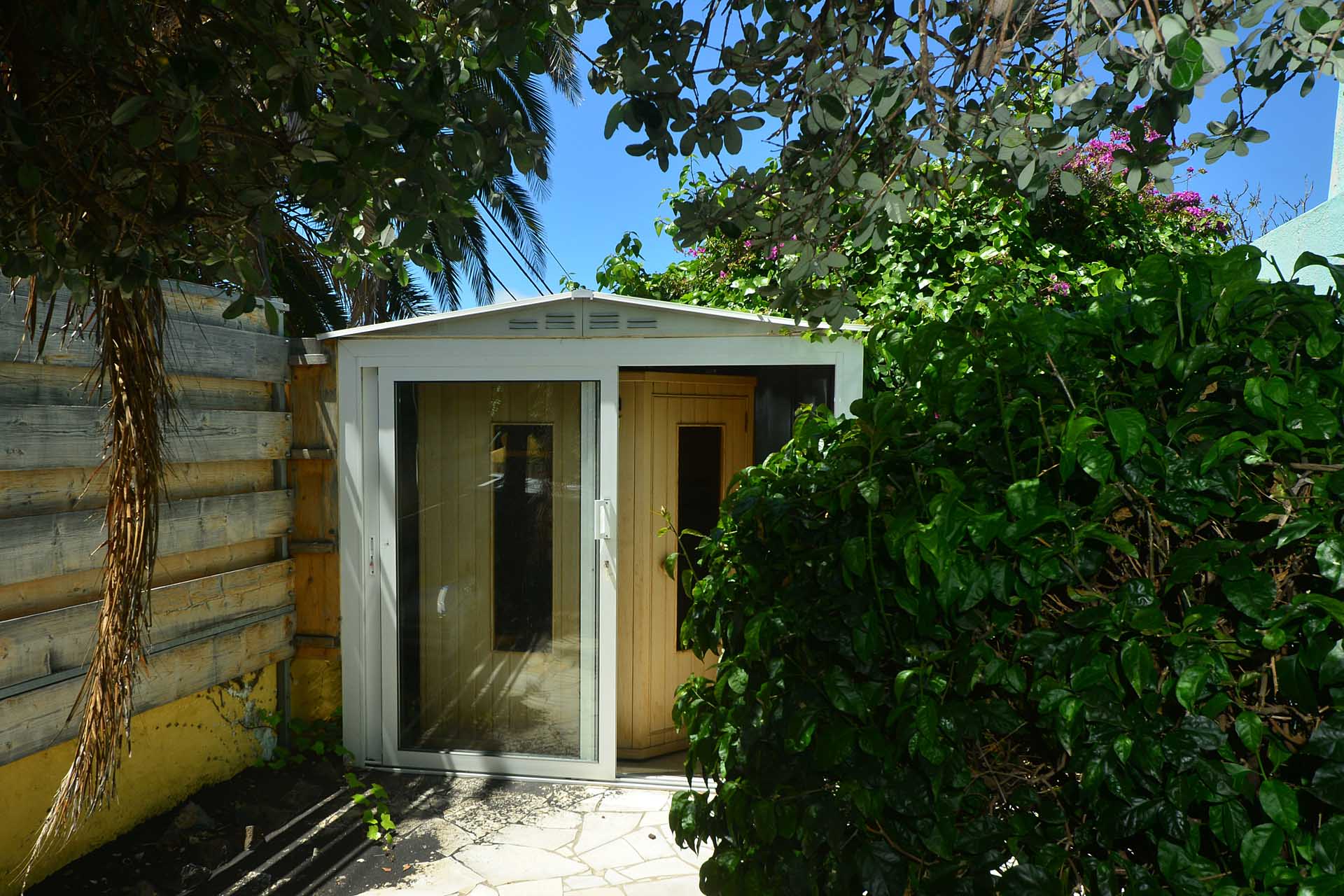 Der Außenbereich ist mit großen Bäumen und Zierpflanzen pflegeleicht bepflanzt, die Terrassen mit Solnhofer Sandstein belegt. Er enthält ein Saunagebäude sowie eine Bodega („Aussenküche“)