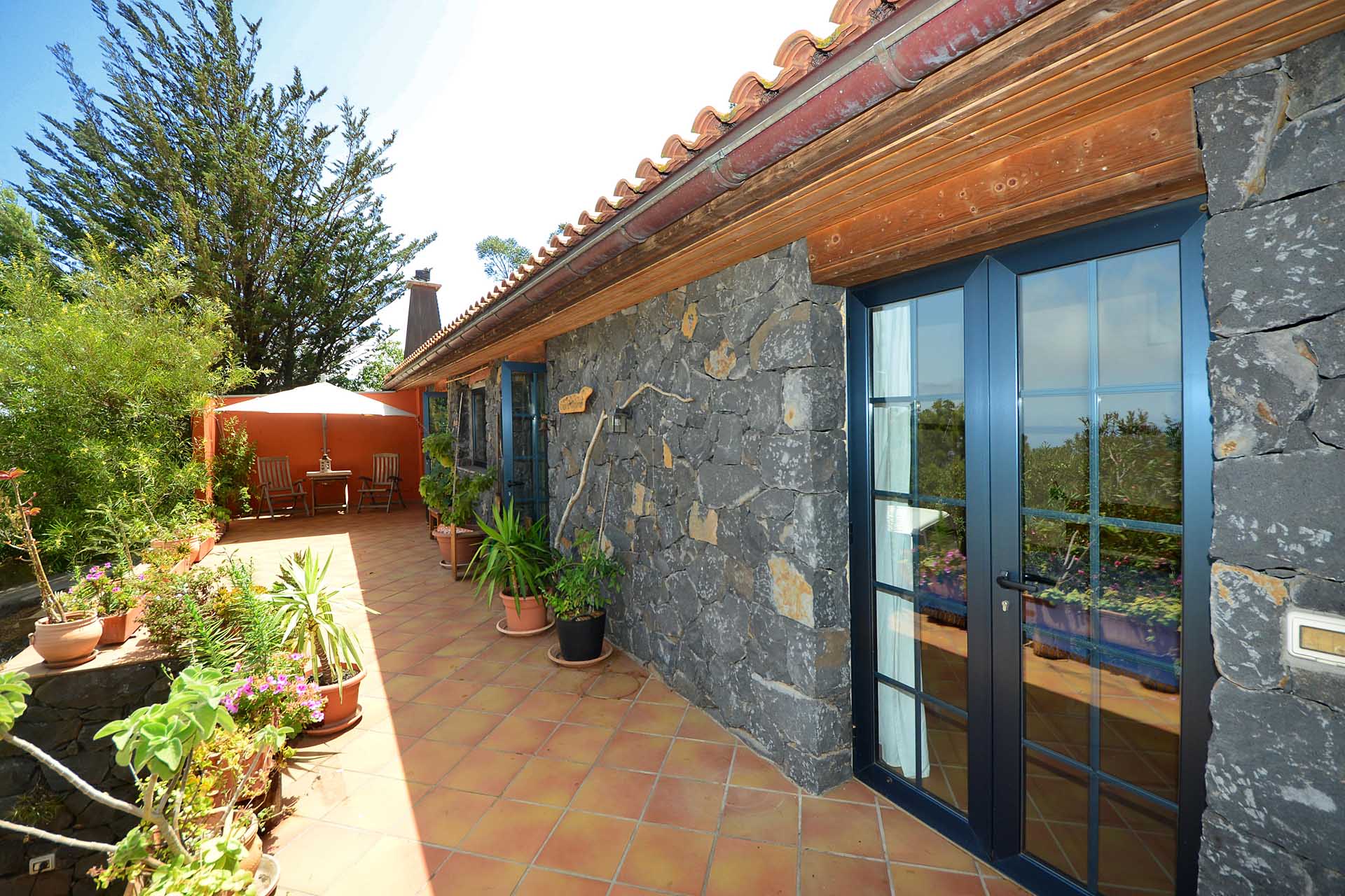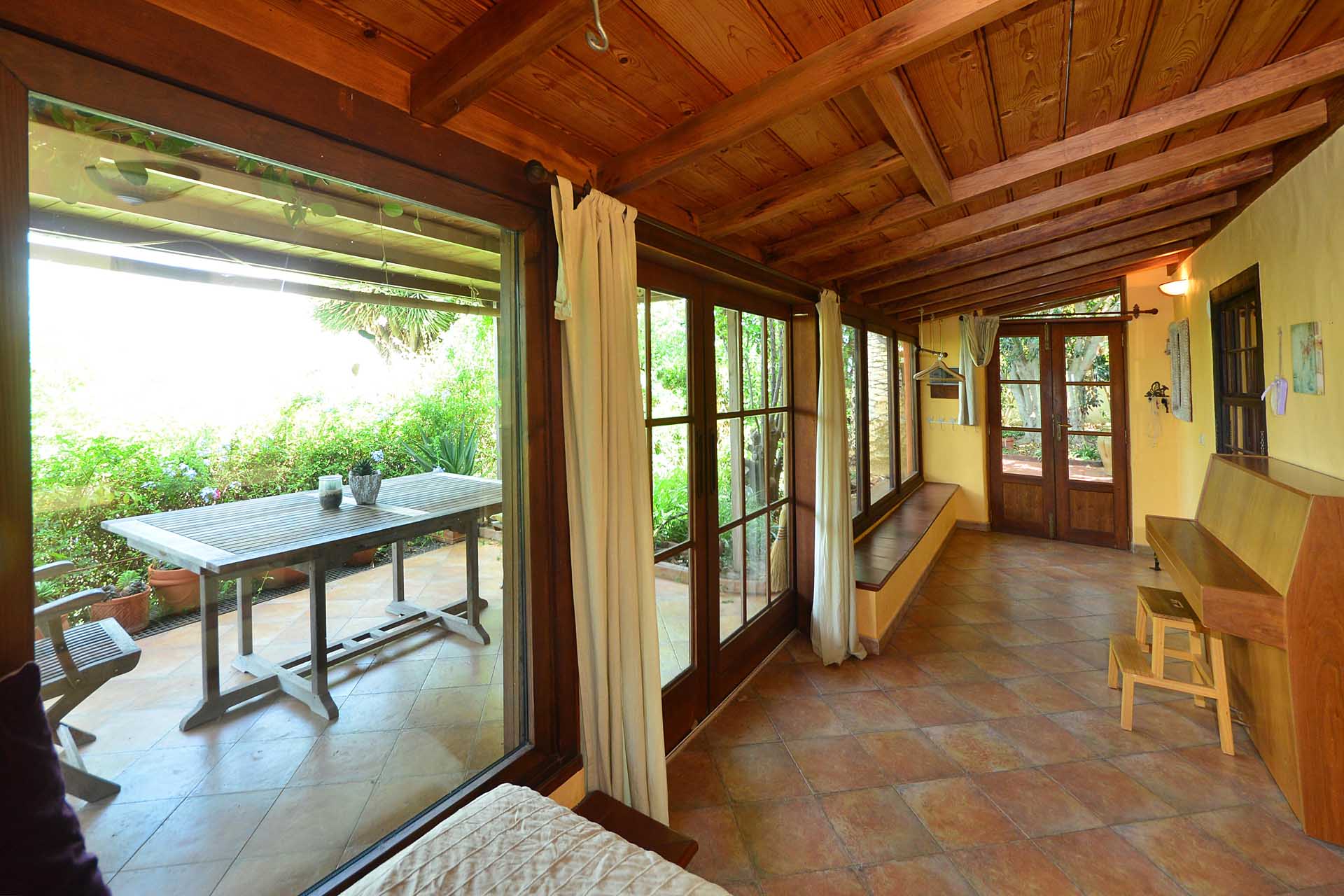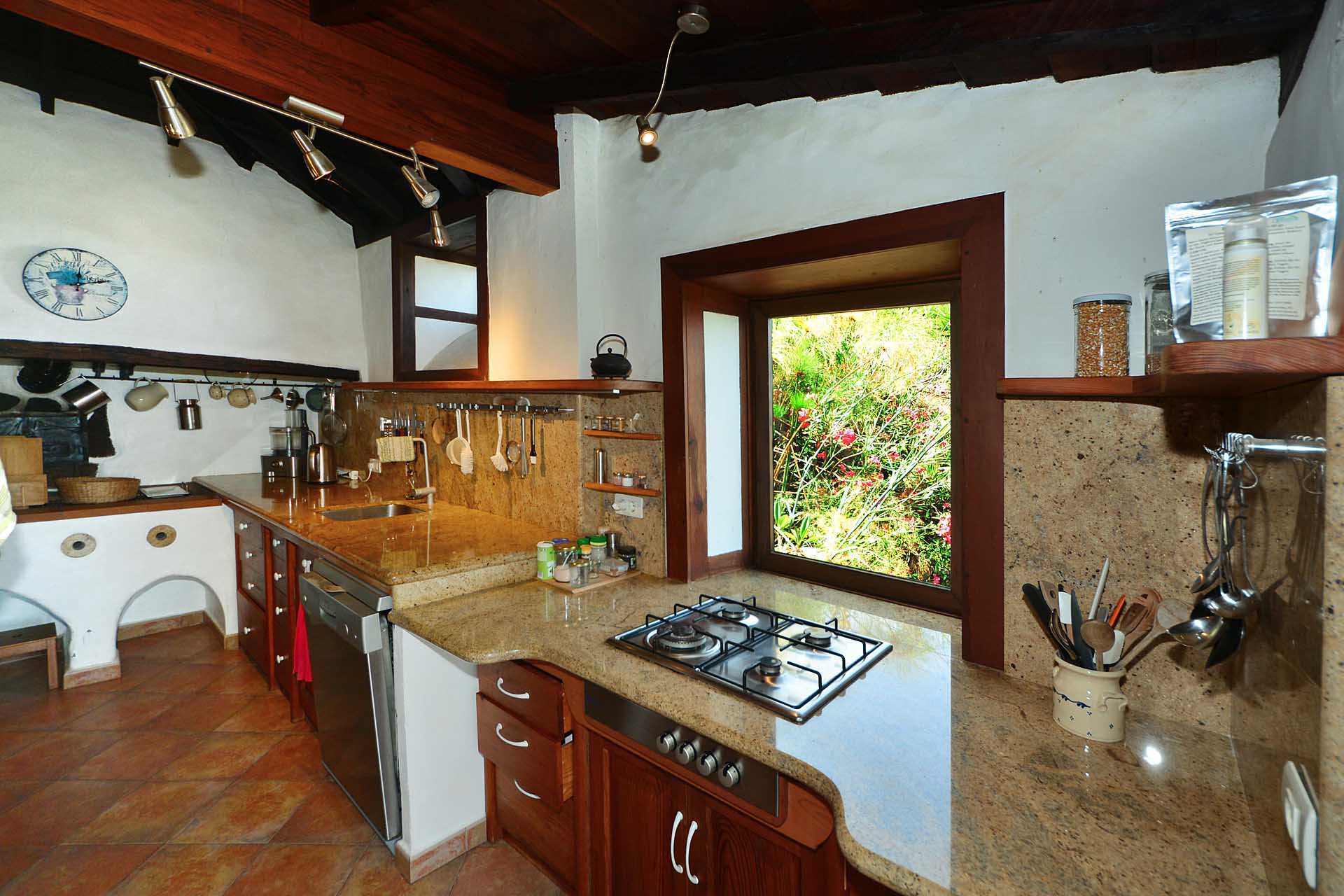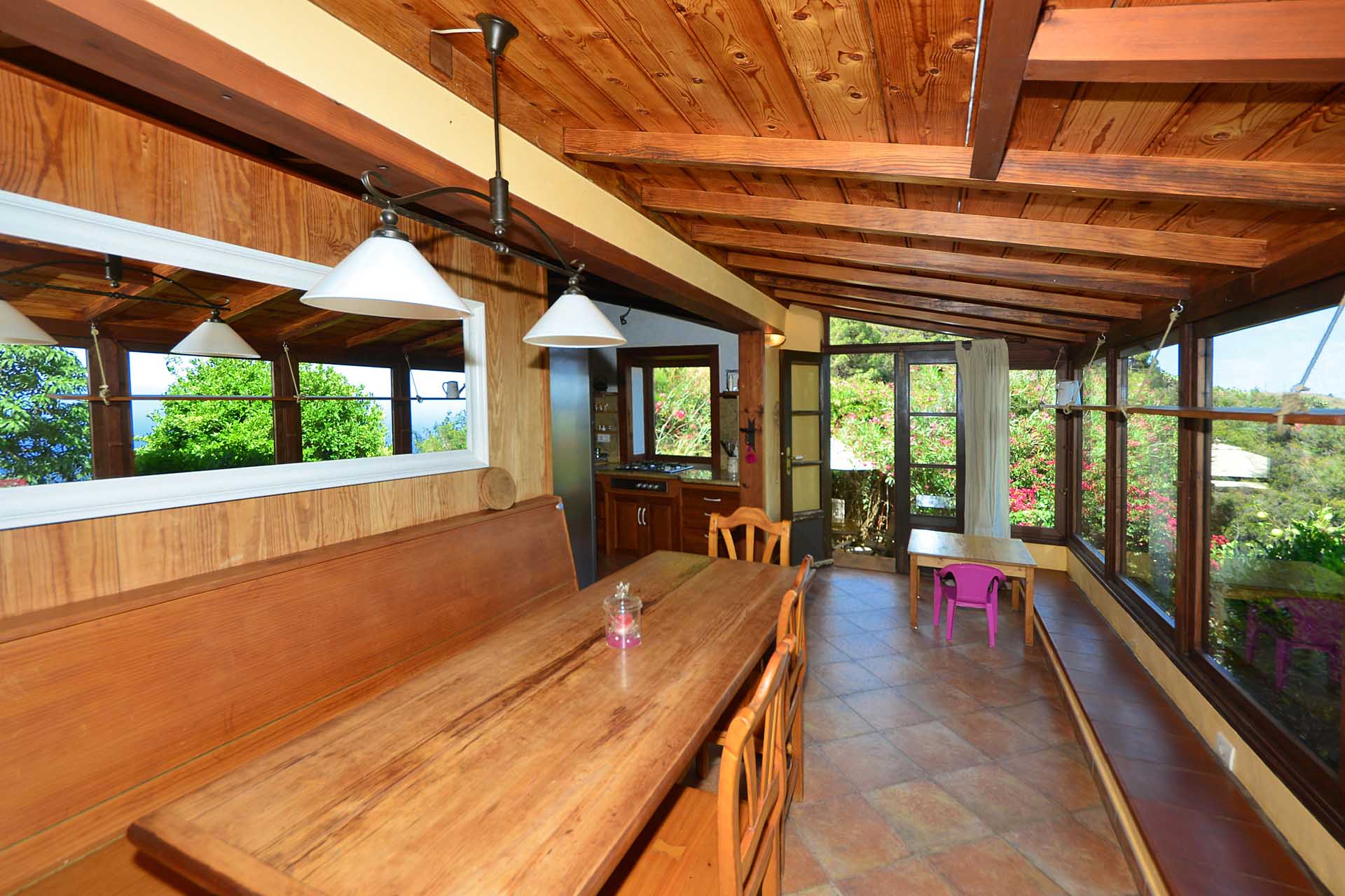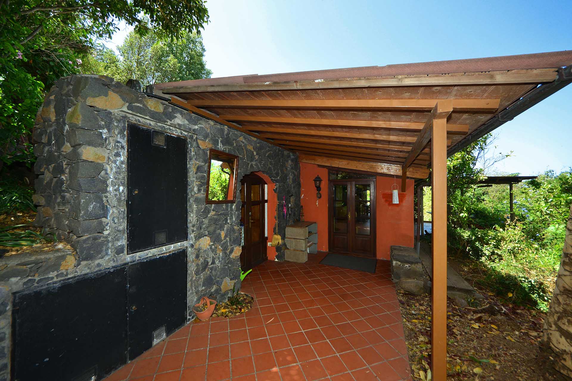 Das Haupthaus (ca. 153 m² Grundfläche) betreten Sie durch einen langgestreckten, wintergartenähnlichen Raum der konsequent auf den herrlichen Blick ausgerichtet wurde. Er geht in eine halboffene Küche über, die mit Holzbackofen und tiefergelegtem Herd in kanarischem Ambiente zur kreativen Tätigkeit einlädt. Das separate Wohnzimmer mit kanarischem Dachstuhl aus Teaholz strahlt nicht nur kanarische Gemütlichkeit aus, sondern wurde durch ein Dachfenster zusätzlich belichtet, um auch nordeuropäischen Ansprüchen Stand zu halten, ebenso wie das Schlafzimmer und das luxuriös ausgestattete Badezimmer. Da der sehr große Wintergarten ähnliche Raum in erster Linie auch als Wohnzimmer genutzt wird, kann das eigentliche Wohnzimmer auch sehr gut als sehr großes, zweites Schlaf- oder Kinderzimmer genutzt werden. In allen Räumen wurde nicht nur respektvoll mit historischer Bausubstanz umgegangen, sondern durch besonders hochwertige Massivholz- und Natursteinarbeiten ein geschmackvolles und wertiges Ambiente geschaffen. Der Wintergarten geht in eine überdachte Terrasse über, weitere Terrassen wurden rund um das Haus angelegt, teilweise mit sehr aufwändigen Natursteinmauern, um einen spektakulären Blick über die Schlucht, den Ort und das Meer zu ermöglichen.