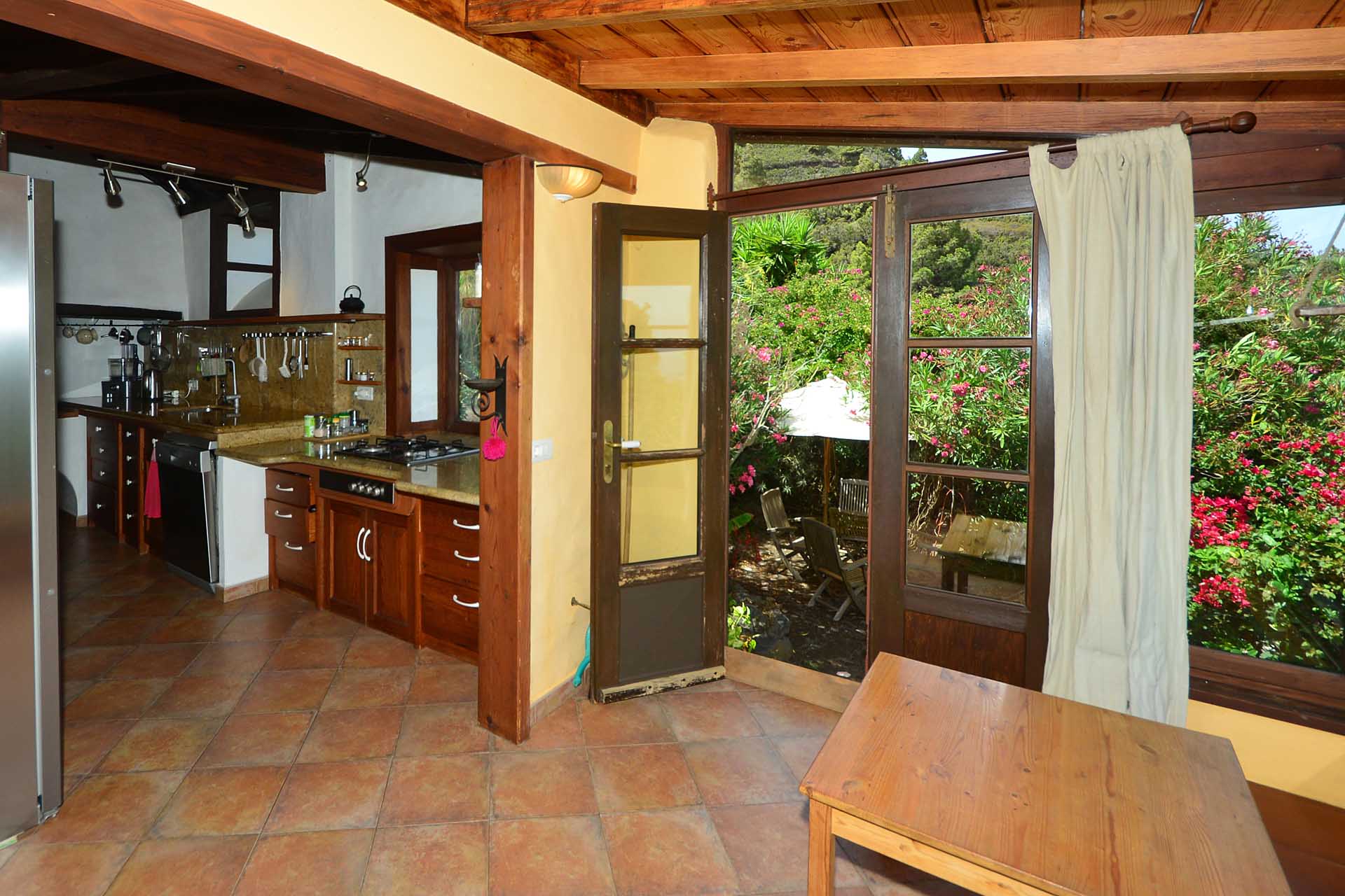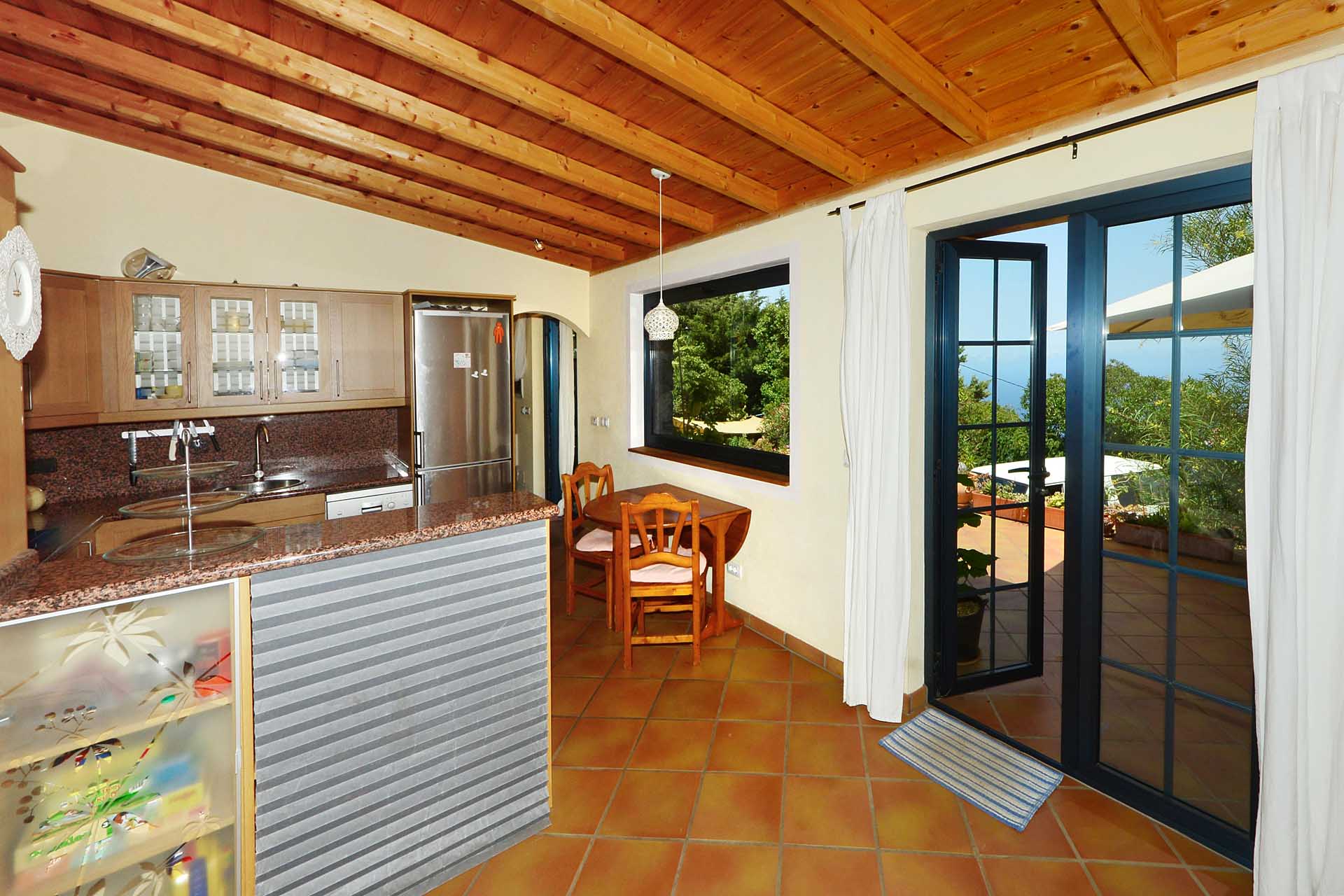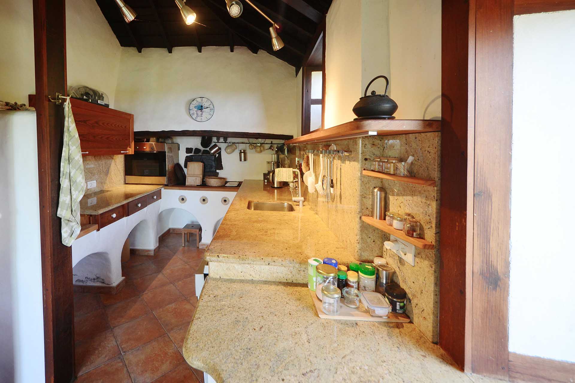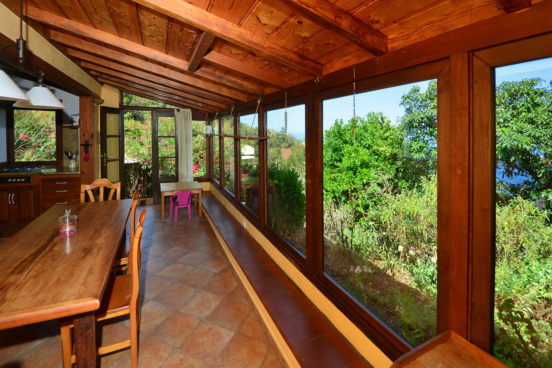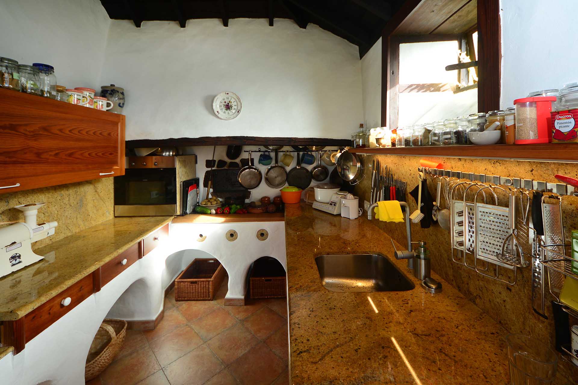Das Haupthaus (ca. 153 m² Grundfläche) betreten Sie durch einen langgestreckten, wintergartenähnlichen Raum der konsequent auf den herrlichen Blick ausgerichtet wurde. Er geht in eine halboffene Küche über, die mit Holzbackofen und tiefergelegtem Herd in kanarischem Ambiente zur kreativen Tätigkeit einlädt. Das separate Wohnzimmer mit kanarischem Dachstuhl aus Teaholz strahlt nicht nur kanarische Gemütlichkeit aus, sondern wurde durch ein Dachfenster zusätzlich belichtet, um auch nordeuropäischen Ansprüchen Stand zu halten, ebenso wie das Schlafzimmer und das luxuriös ausgestattete Badezimmer. Da der sehr große Wintergarten ähnliche Raum in erster Linie auch als Wohnzimmer genutzt wird, kann das eigentliche Wohnzimmer auch sehr gut als sehr großes, zweites Schlaf- oder Kinderzimmer genutzt werden. In allen Räumen wurde nicht nur respektvoll mit historischer Bausubstanz umgegangen, sondern durch besonders hochwertige Massivholz- und Natursteinarbeiten ein geschmackvolles und wertiges Ambiente geschaffen. Der Wintergarten geht in eine überdachte Terrasse über, weitere Terrassen wurden rund um das Haus angelegt, teilweise mit sehr aufwändigen Natursteinmauern, um einen spektakulären Blick über die Schlucht, den Ort und das Meer zu ermöglichen.