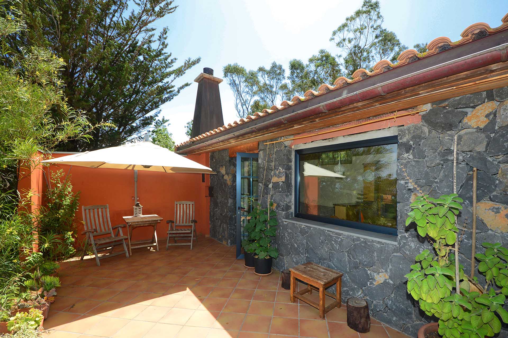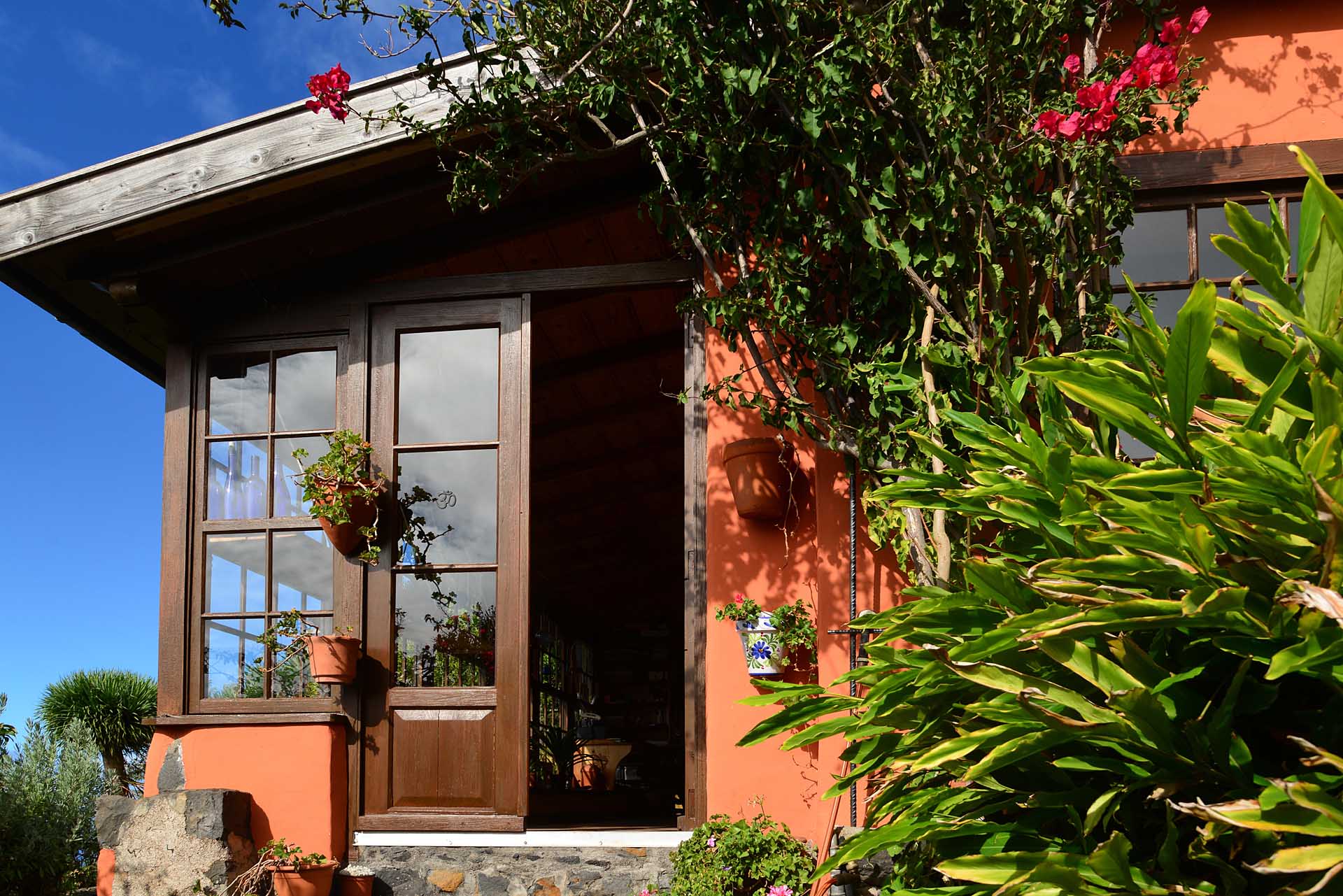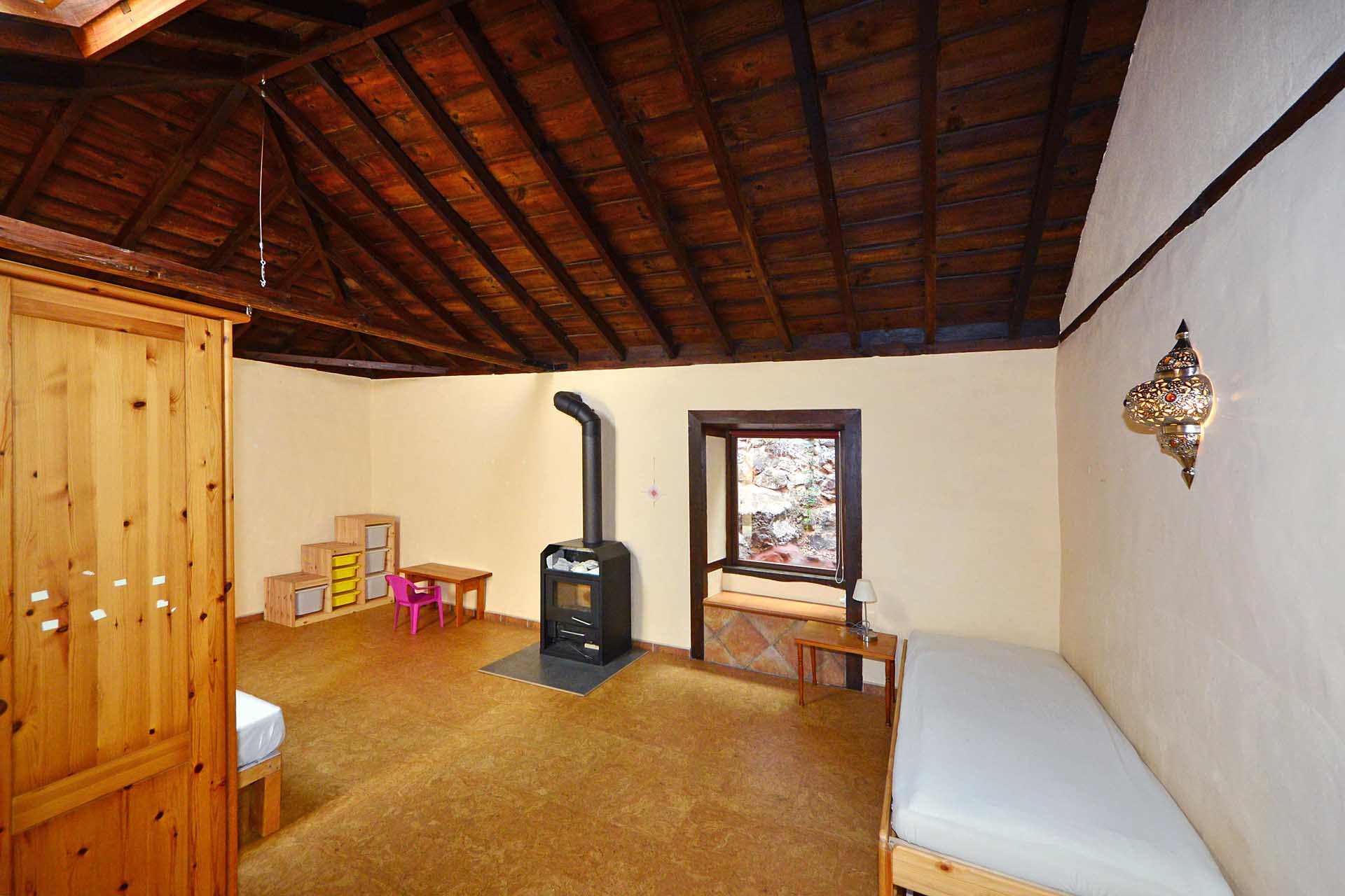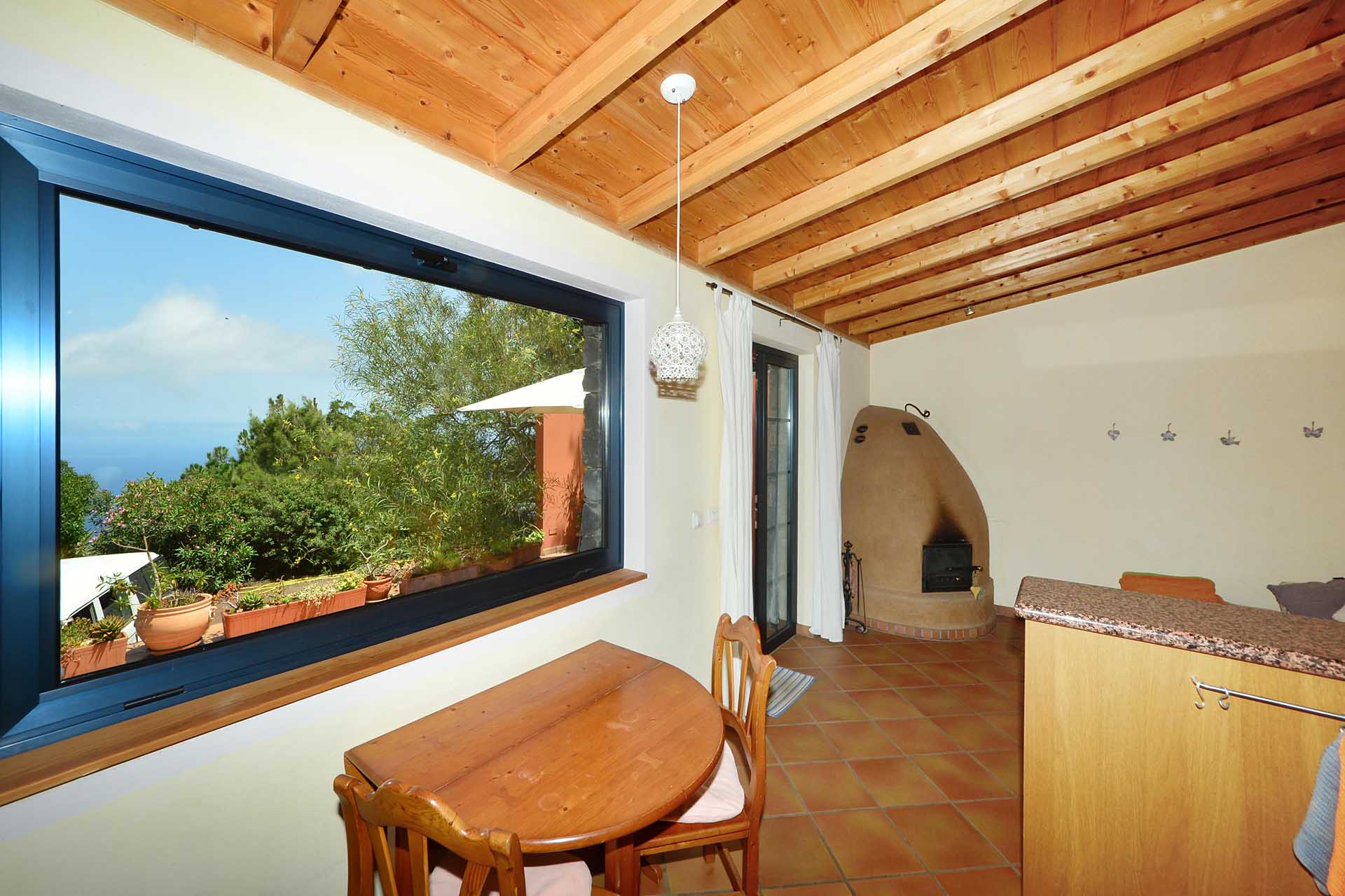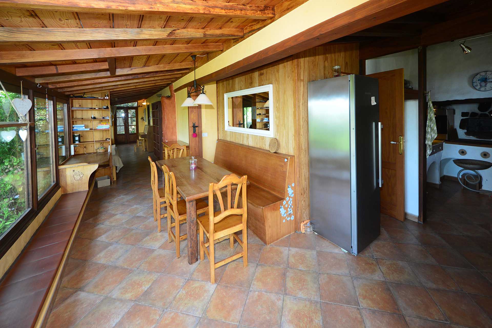 Das Haupthaus (ca. 153 m² Grundfläche) betreten Sie durch einen langgestreckten, wintergartenähnlichen Raum der konsequent auf den herrlichen Blick ausgerichtet wurde. Er geht in eine halboffene Küche über, die mit Holzbackofen und tiefergelegtem Herd in kanarischem Ambiente zur kreativen Tätigkeit einlädt. Das separate Wohnzimmer mit kanarischem Dachstuhl aus Teaholz strahlt nicht nur kanarische Gemütlichkeit aus, sondern wurde durch ein Dachfenster zusätzlich belichtet, um auch nordeuropäischen Ansprüchen Stand zu halten, ebenso wie das Schlafzimmer und das luxuriös ausgestattete Badezimmer. Da der sehr große Wintergarten ähnliche Raum in erster Linie auch als Wohnzimmer genutzt wird, kann das eigentliche Wohnzimmer auch sehr gut als sehr großes, zweites Schlaf- oder Kinderzimmer genutzt werden. In allen Räumen wurde nicht nur respektvoll mit historischer Bausubstanz umgegangen, sondern durch besonders hochwertige Massivholz- und Natursteinarbeiten ein geschmackvolles und wertiges Ambiente geschaffen. Der Wintergarten geht in eine überdachte Terrasse über, weitere Terrassen wurden rund um das Haus angelegt, teilweise mit sehr aufwändigen Natursteinmauern, um einen spektakulären Blick über die Schlucht, den Ort und das Meer zu ermöglichen.