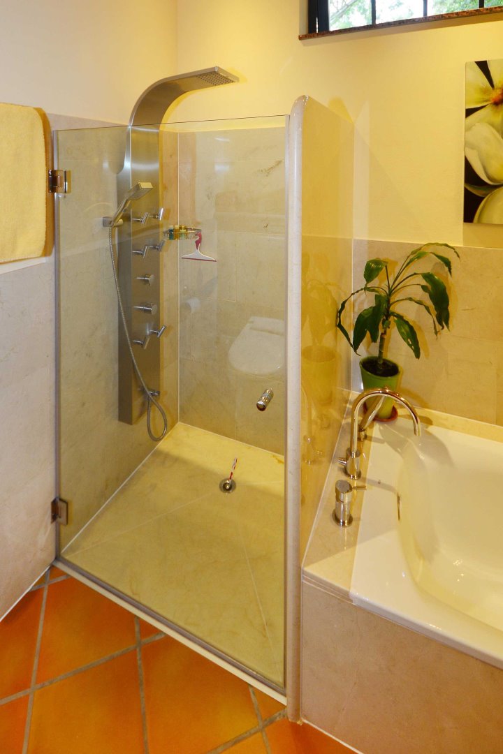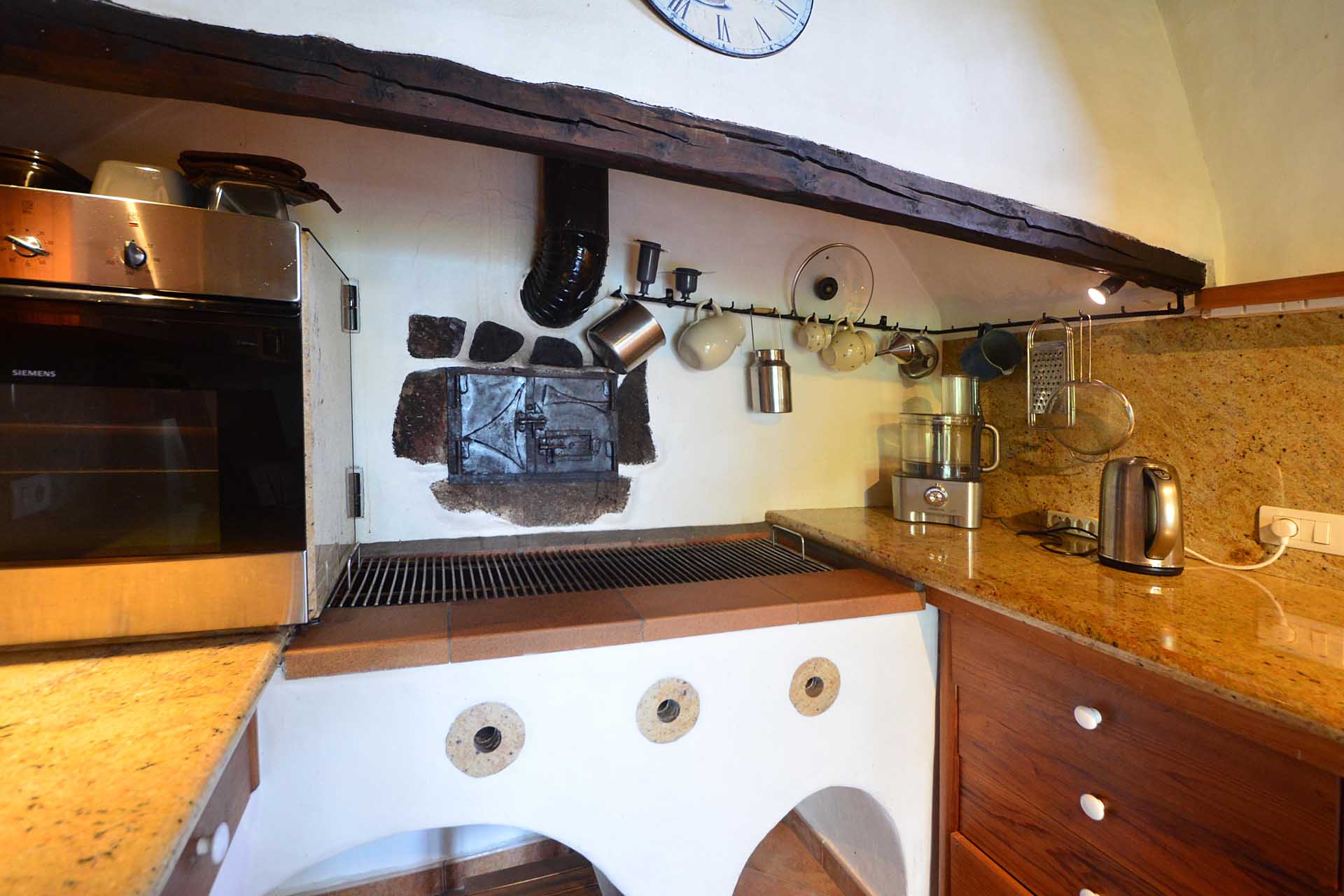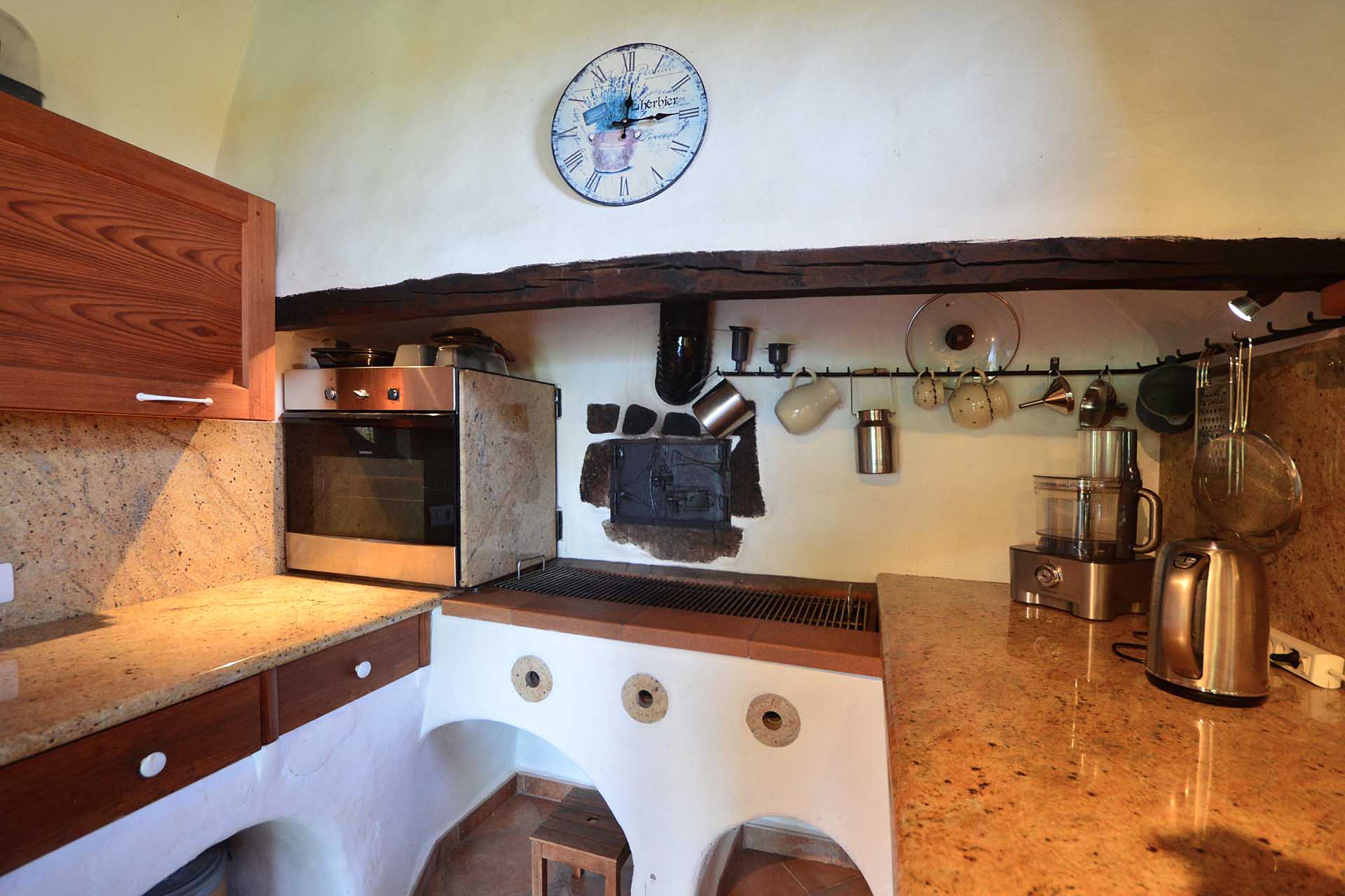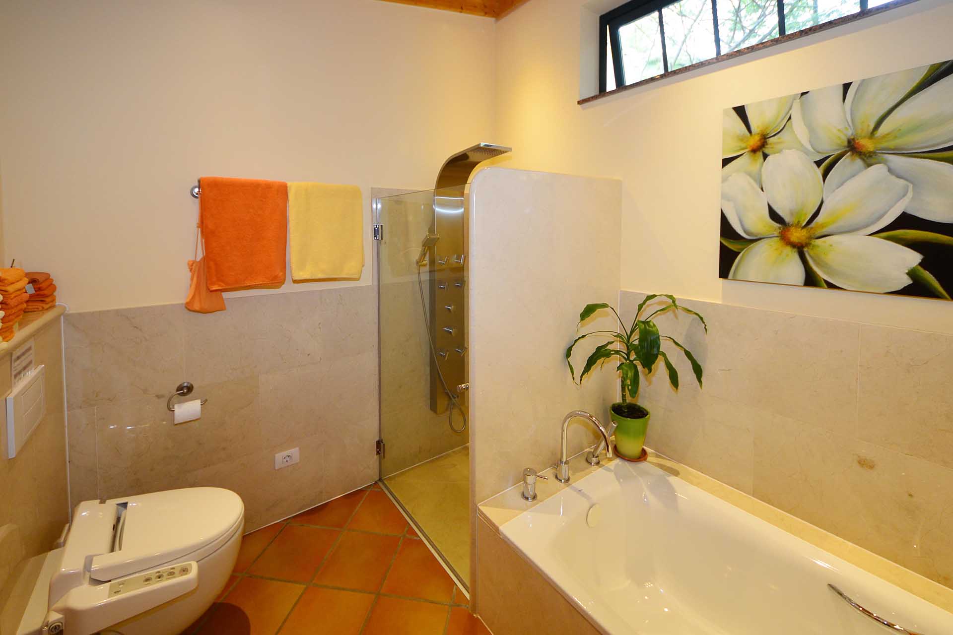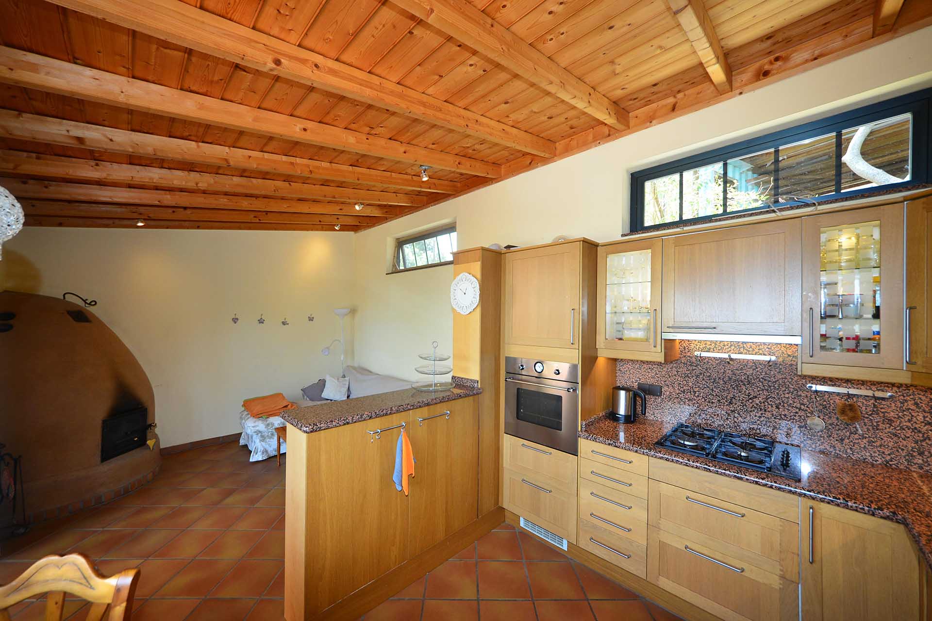 Etwas abseits eingebettet in sein eigenes, privates Ambiente befindet sich das Gästehaus (64 m² Grundfläche), das auch hohen Ansprüchen gerecht wird. In der geräumigen, sehr gut ausgestatteten Wohnküche bildet der rund gemauerte Holzofen den Blickfang, das große, hochwertig möblierte Schlafzimmer, das überaus komfortabel ausgestattete Naturstein-Luxusbad und die große Terrasse sowie ein kleiner Hauswirtschaftsraum mit Gäste-WC und Dusche runden das Angebot für die Gäste ab.