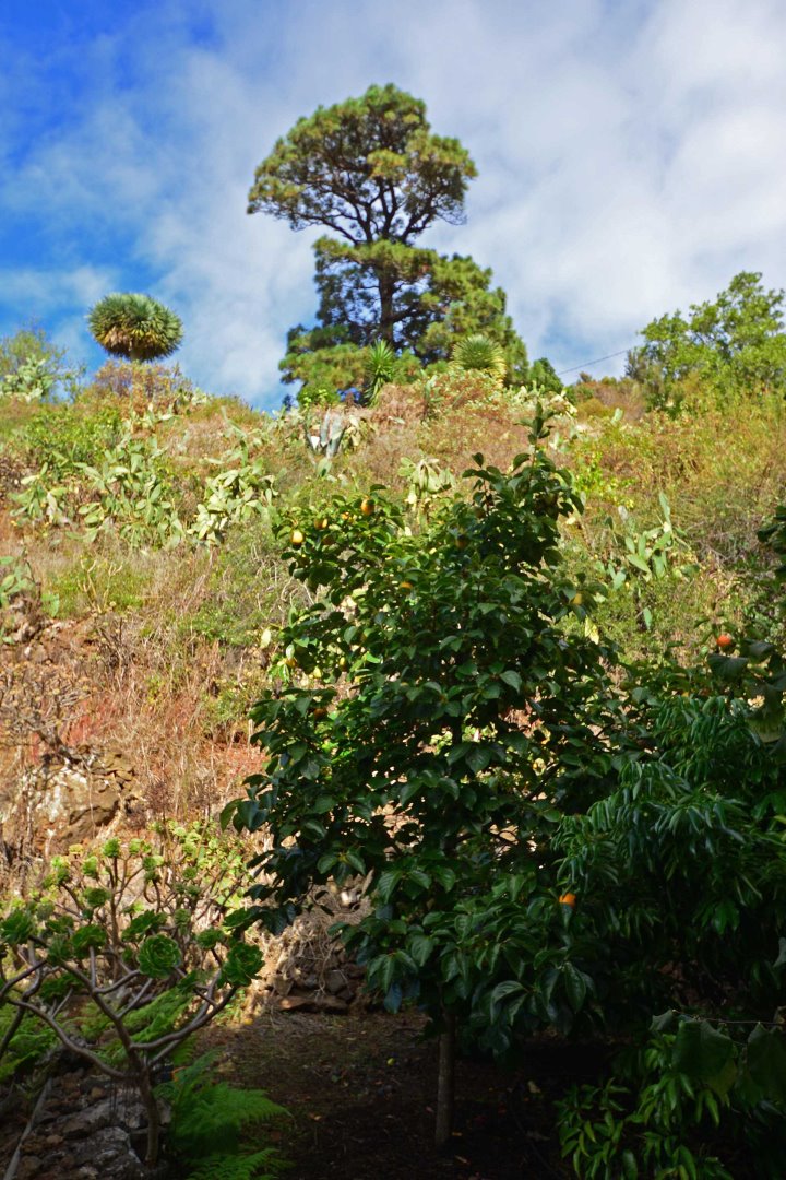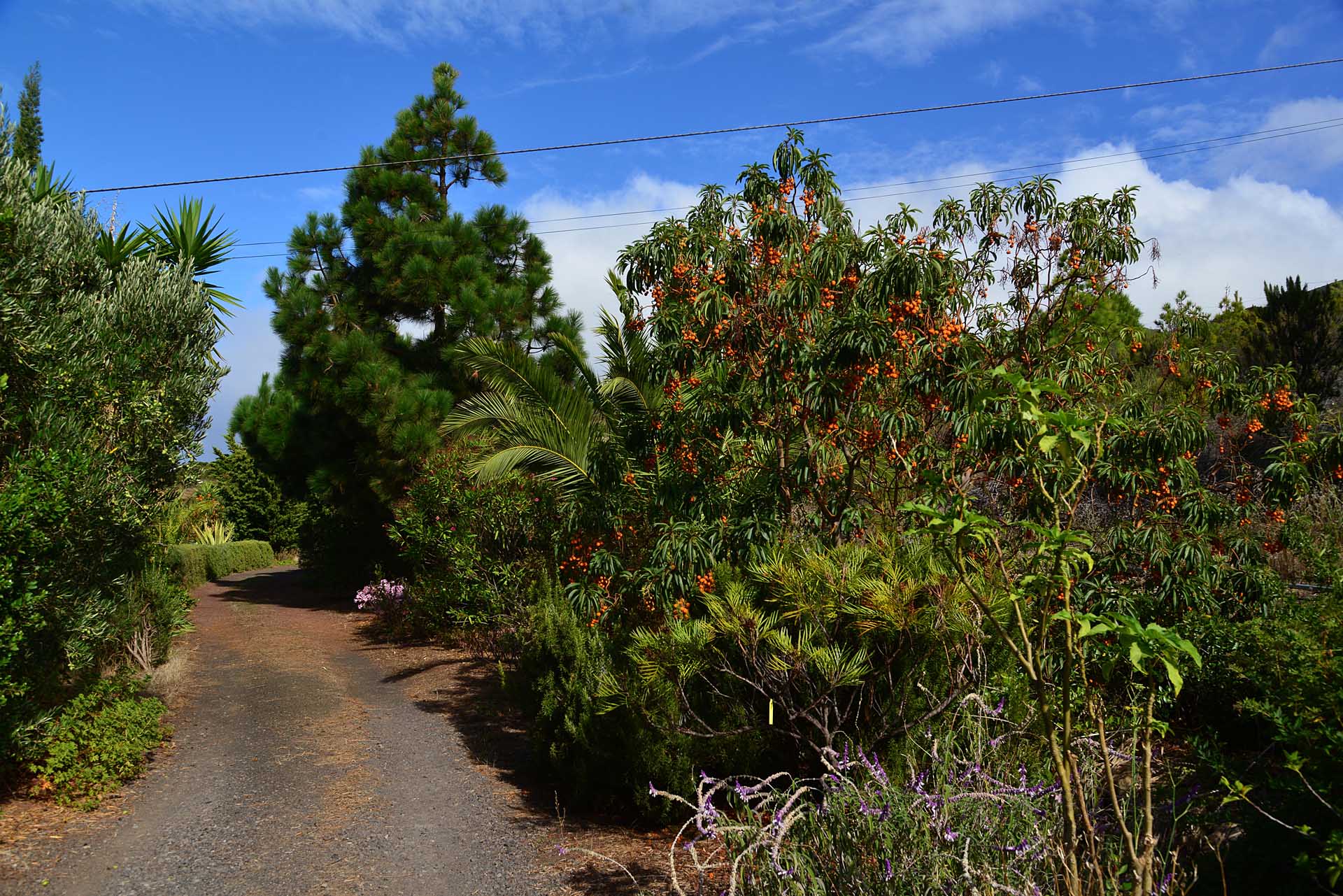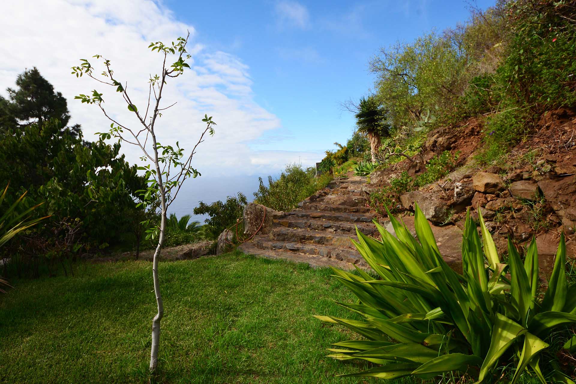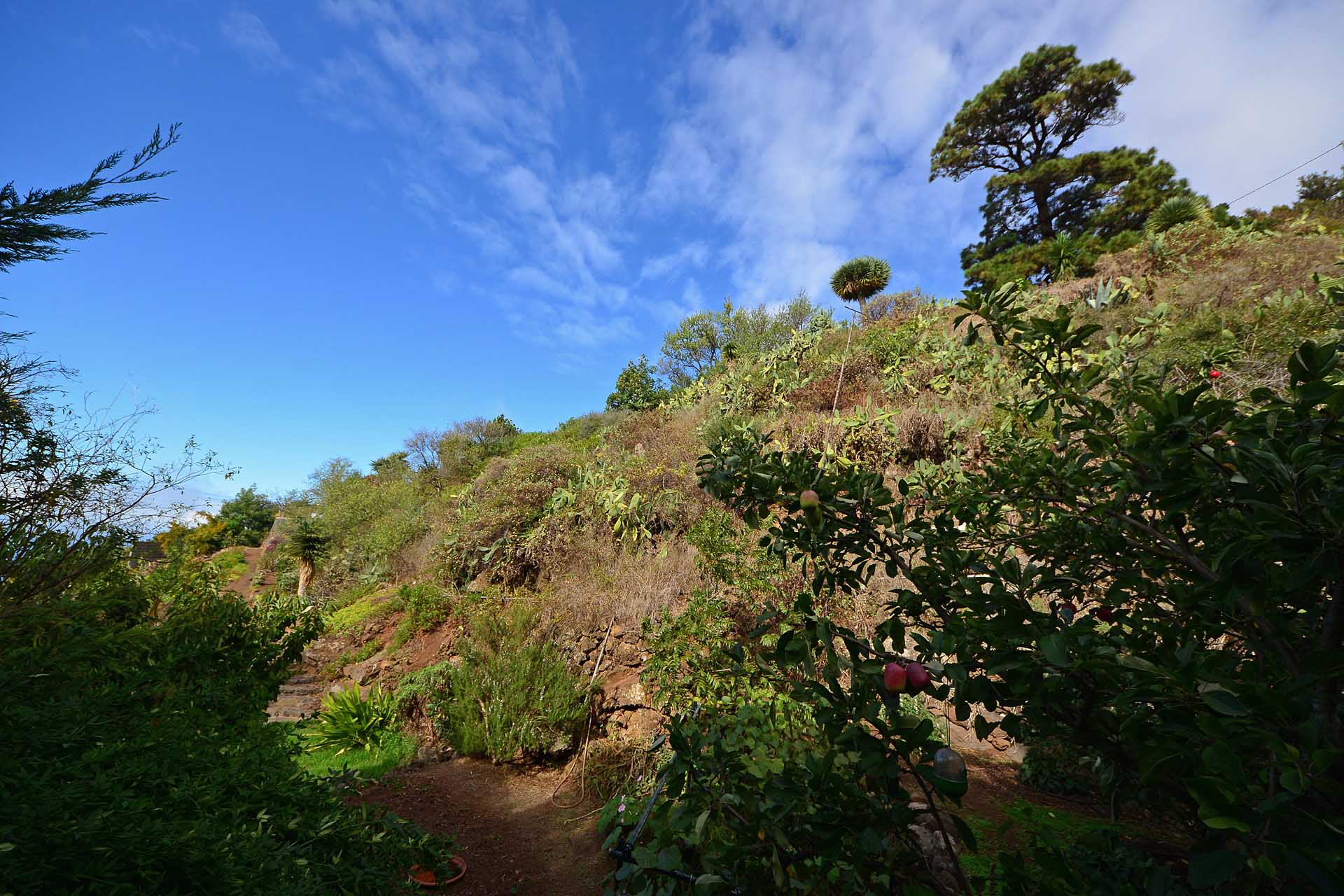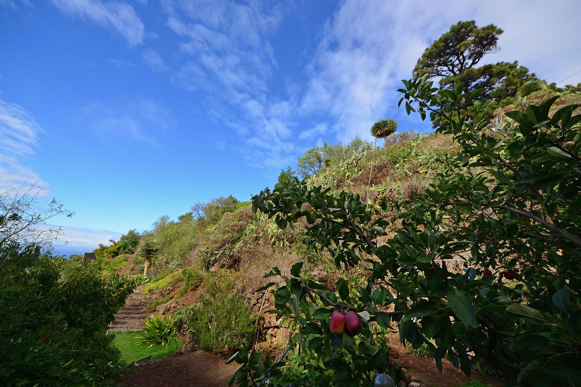 Wenn Sie absolute Ruhe suchen und naturverbunden sind wird Sie diese Finca etwas oberhalb von Santo Domingo begeistern. Schon die Zufahrt vom historischen Ortskern entlang einer großen Schlucht durch die wildromantische Landschaft des Nordwestens ist ein Naturerlebnis. Das parkähnlich angelegte Grundstück (ca. 5.500 m²) mit vielen heimischen und exotischen Bäumen (unter anderen Mandel, Avocado, Orangen, Pink Grapefruit, Zitrone, Mango, Papaya, Mandarine, Apfel (verschiedene Sorten), Birne, Kirsche, Kanarische Kirschbaum, Feigen (Weiß & Rot), Mispeln, Cherimoya, Feijoa, Granatapfel, Trauben, Pepin (Birnenmelone), Maulbeere, Holunder, Haselnuss, Kiwi, Pfirsich, Nektarinen, Physalis, Scharon (Kaki), Pecannuss, Sapote lucuma, Spote Blanco, Karob, Macadamia, Echte Guave, Erdbeerguave, Kapuzinerkresse, Kaktusfeige, Banane, Quitten, Pfefferbaum, Moringa, Tamarillo, Philodendron, Baumaloe, Aloe Vera, Zuckerrohr...), Terrassen, Aussichtspunkten und Rasenflächen erinnert an einen botanischen Garten mit hohem Freizeitwert. Am Fuße eines Südhangs finden sich eine Vielzahl gut tragender Fruchtbäume, die die Reflektionswärme der Felswand in süße Fruchtträume umsetzen.