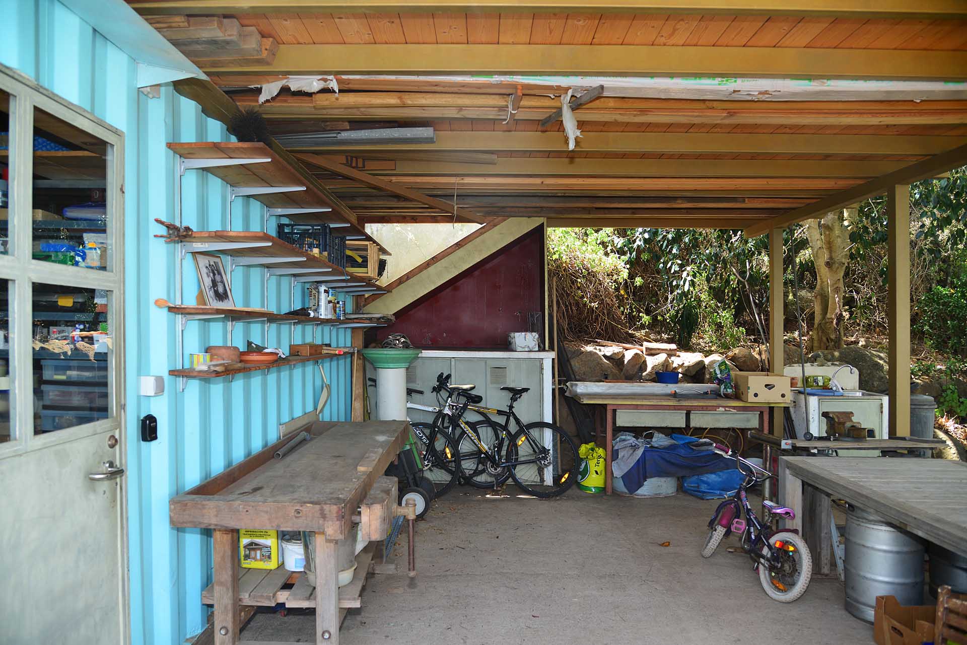 Auf dem weitläufigen Gelände finden sich noch ein Hühnerstall sowie ein weiterer, großer Lagerraum der mit einem überdachten Außenbereich als gut ausgestattete Werkstatt dient.
