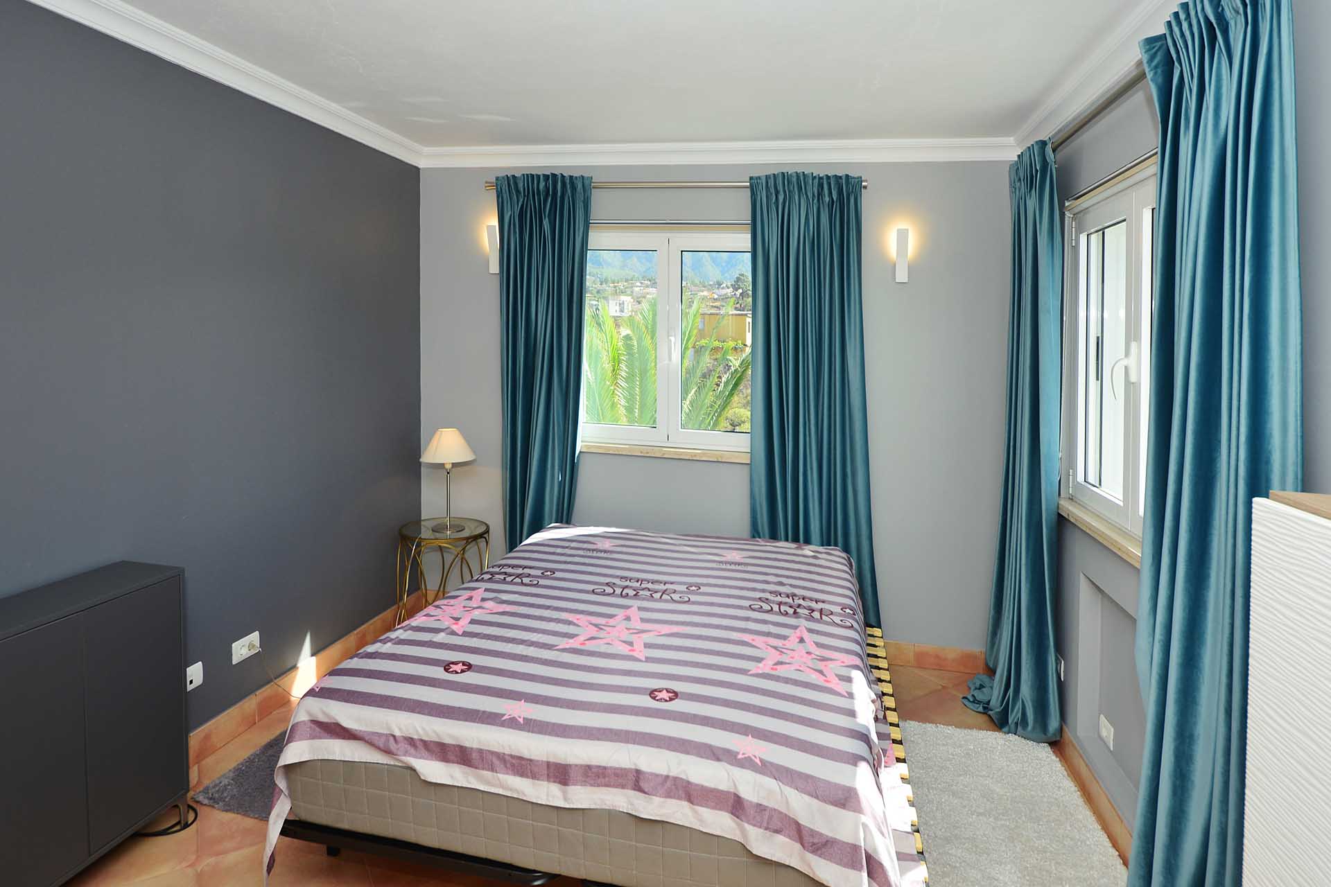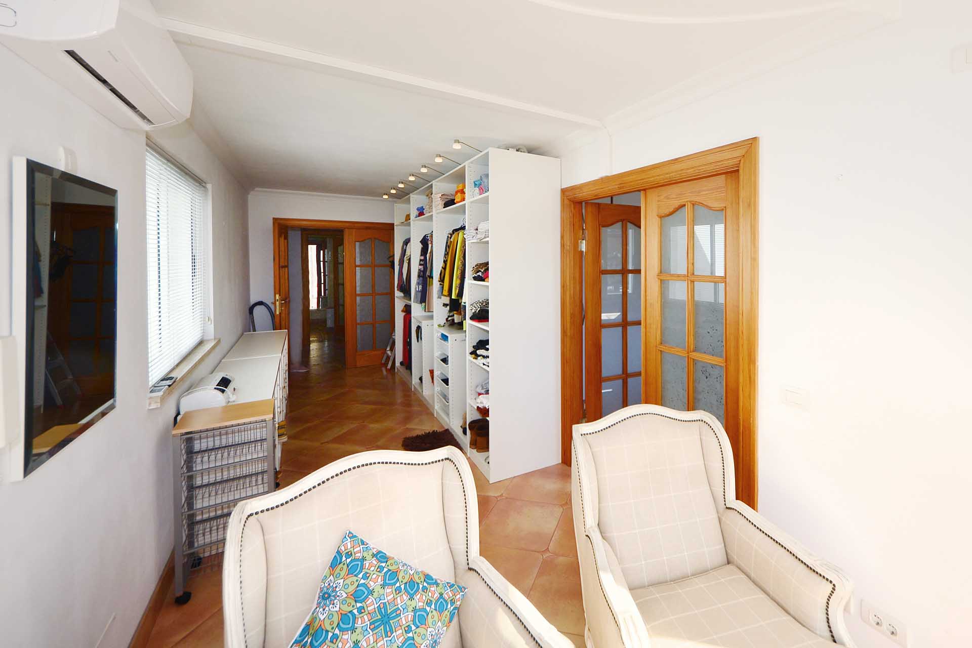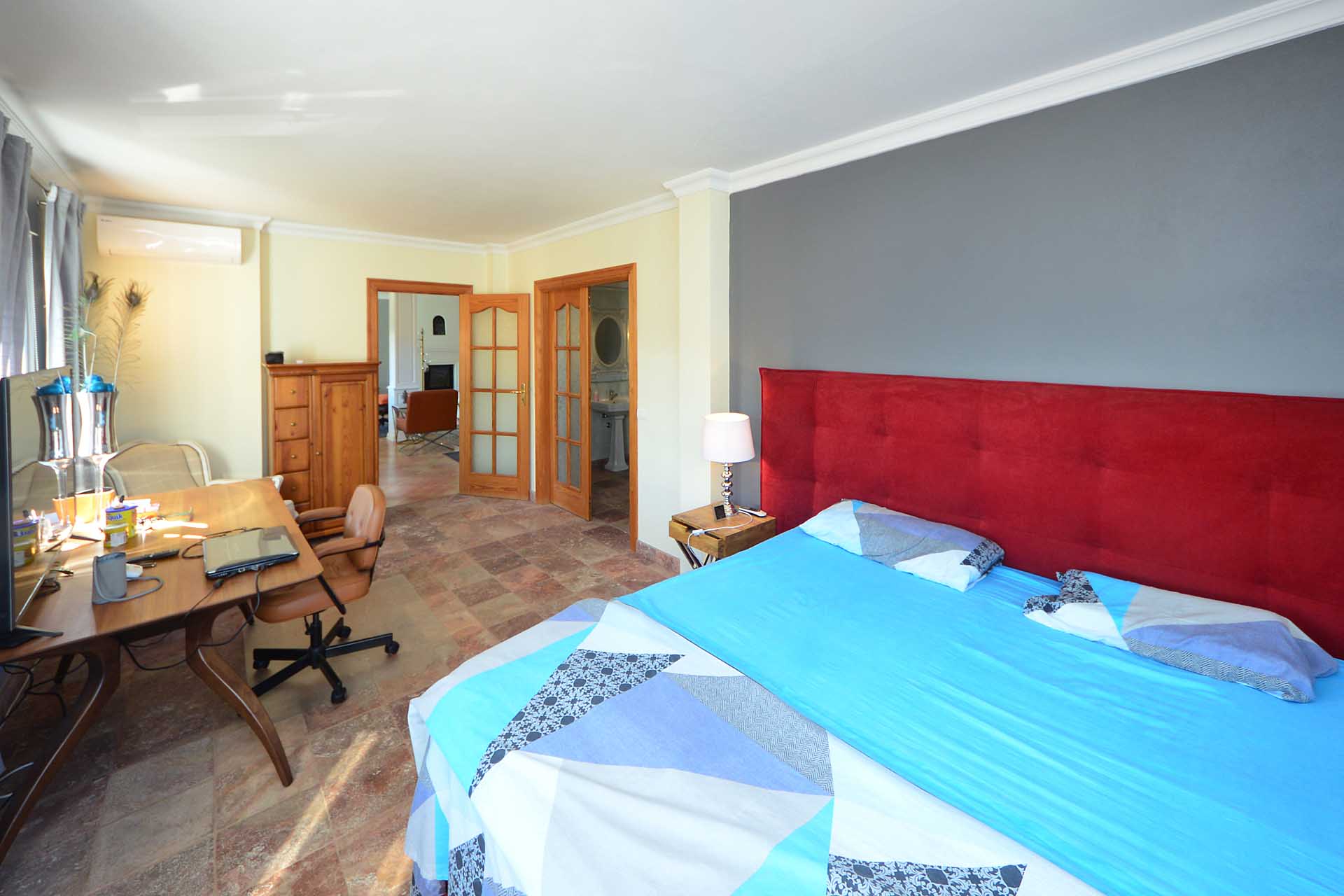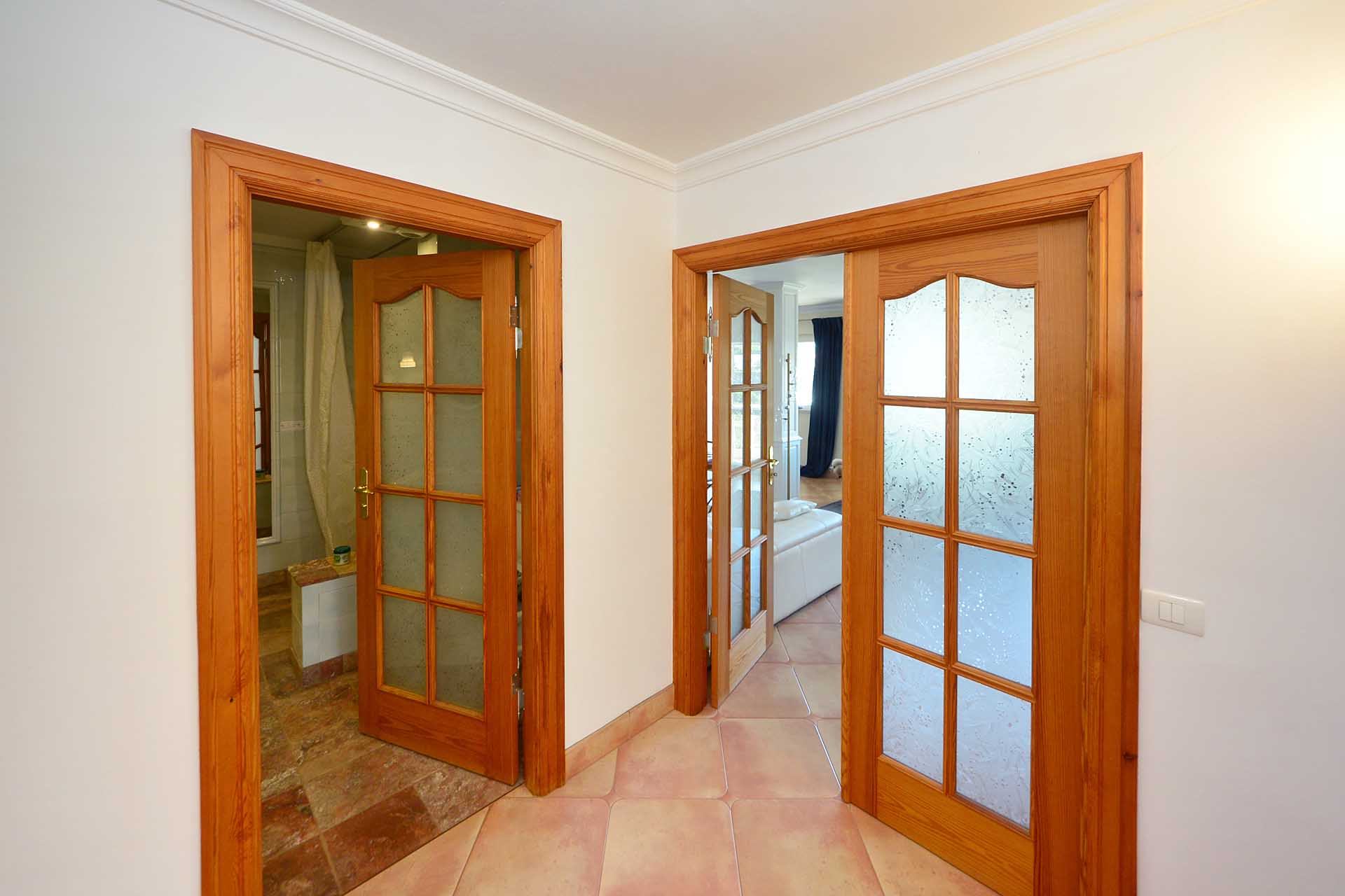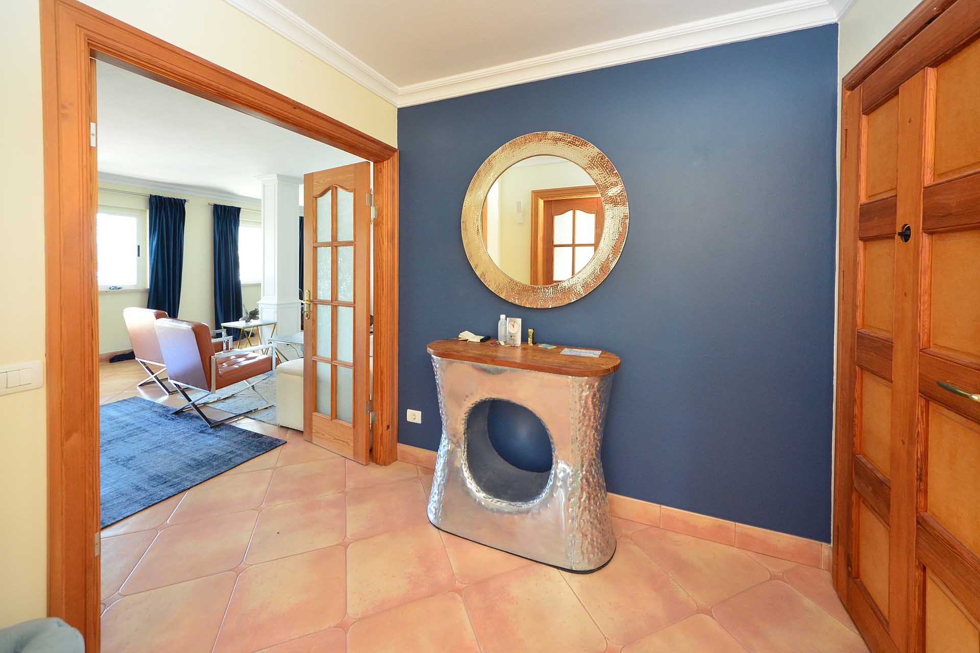 Man sieht der Wohnung an, dass sie nach den Wünschen eines deutschen Handwerkers errichtet und ihr Grundriss nach nordeuropäischen Bedürfnissen konzipiert wurde. Eigentlich waren in diesem Stockwerk zwei Wohnungen vorgesehen, diese wurden zu einer großen Wohnung umgeplant, dafür die Wände mit doppelschaligem Mauerwerk versehen und doppelverglaste Dreh-Kipp-Fenster eingebaut. Auch wurden sämtliche Zimmer größer ausgeführt, als in Spanien eigentlich üblich und so entstand eine sehr großzügige Wohneinheit, die an nichts zu wünschen übrig lässt: Eine große Küche mit Essplatz, dessen bodentief, durchgängig verglaster Erker den Blick in die Berge und bis zum Meer schweifen lässt, ein sehr großes Wohnzimmer (ca. 40 m²) mit Kamin, ein Lesezimmer, drei Schlafzimmer, zwei Bäder, zwei Dielen, ein Hauswirtschaftsraum, eine Speisekammer, zwei große, überdachte Balkone, ein Ankleide- und/oder Mehrzweckraum bieten auch kreativen Menschen oder Paaren, die häufiger Besuch empfangen ausreichend Platz für alle Bedürfnisse.