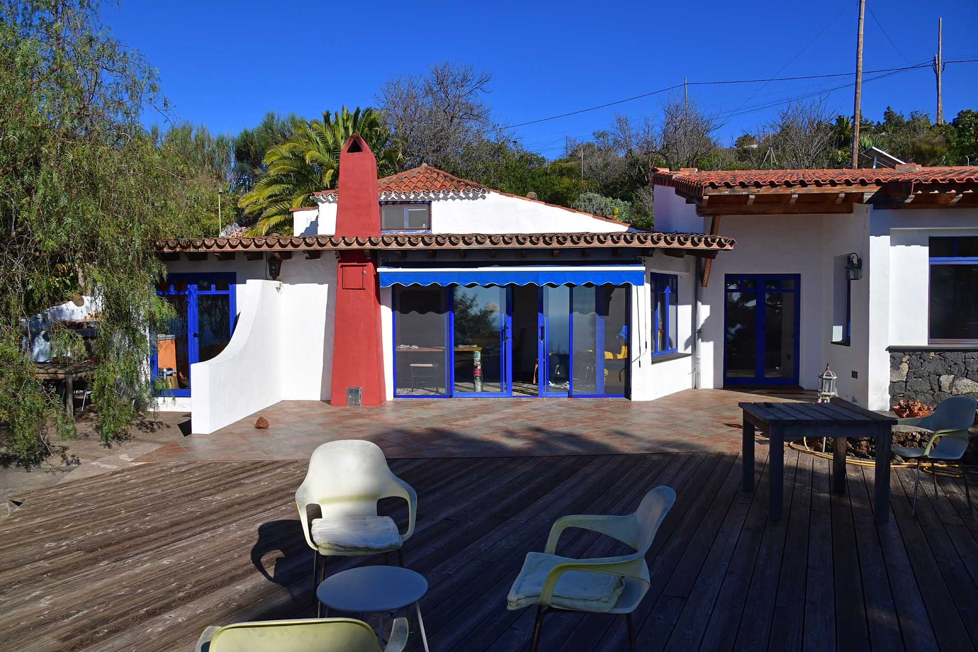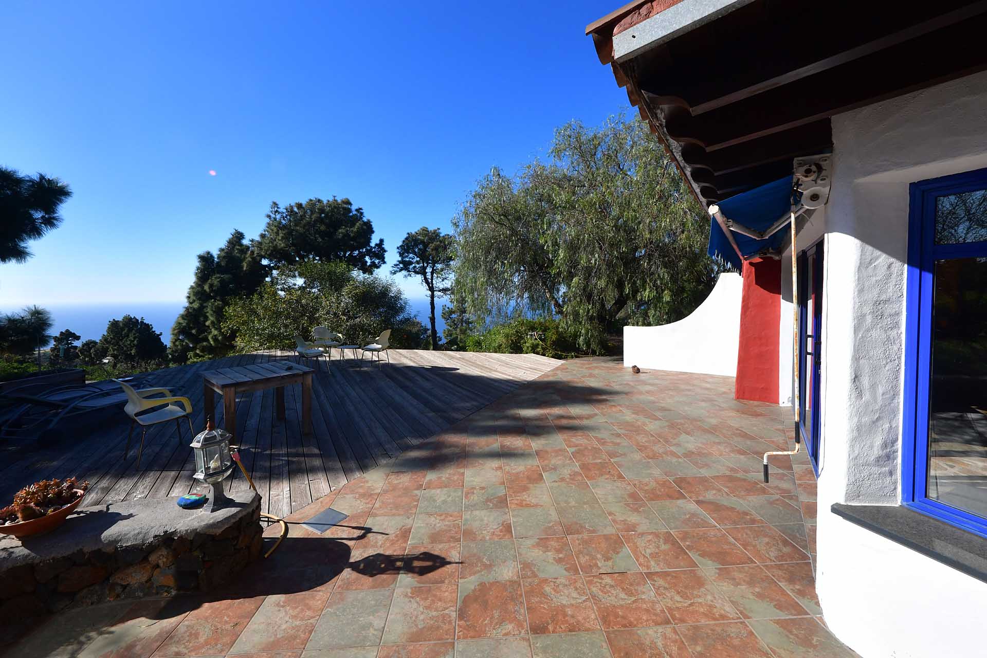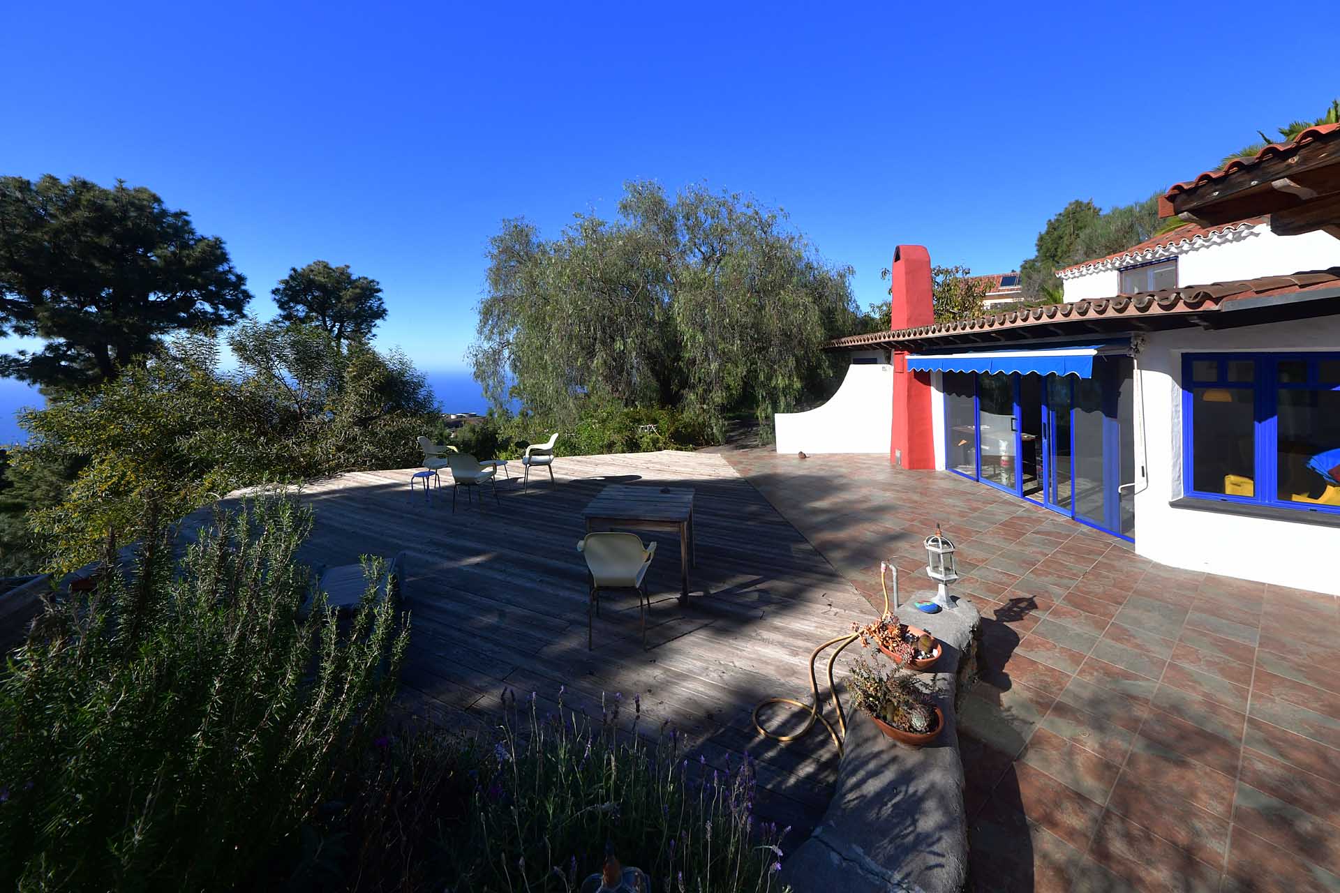 Ein sehr großzügiges Holzdeck vor dem Wohnbereich bietet Platz für Liegen und Tische und einen fantastischen Ausblick auf den Atlantik und den „Mato“ (Hausberg von Puntagorda).
