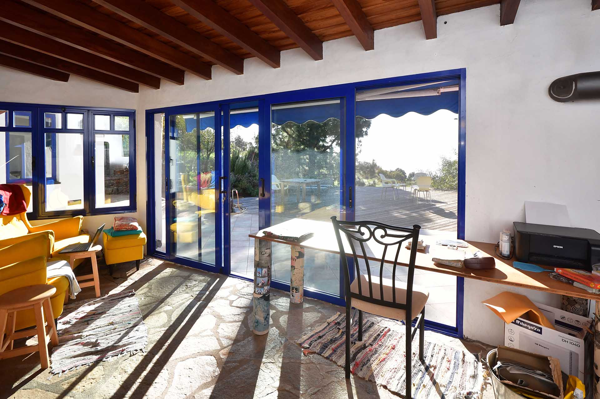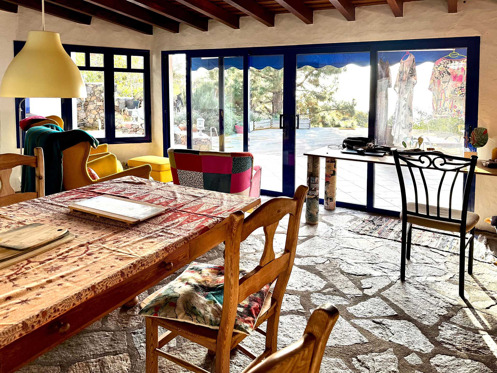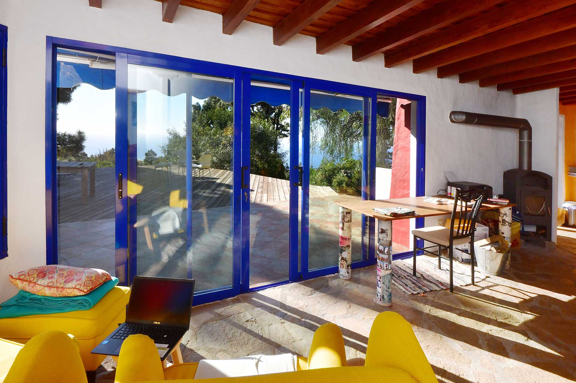 Ein sehr großzügiges Holzdeck vor dem Wohnbereich bietet Platz für Liegen und Tische und einen fantastischen Ausblick auf den Atlantik und den „Mato“ (Hausberg von Puntagorda).